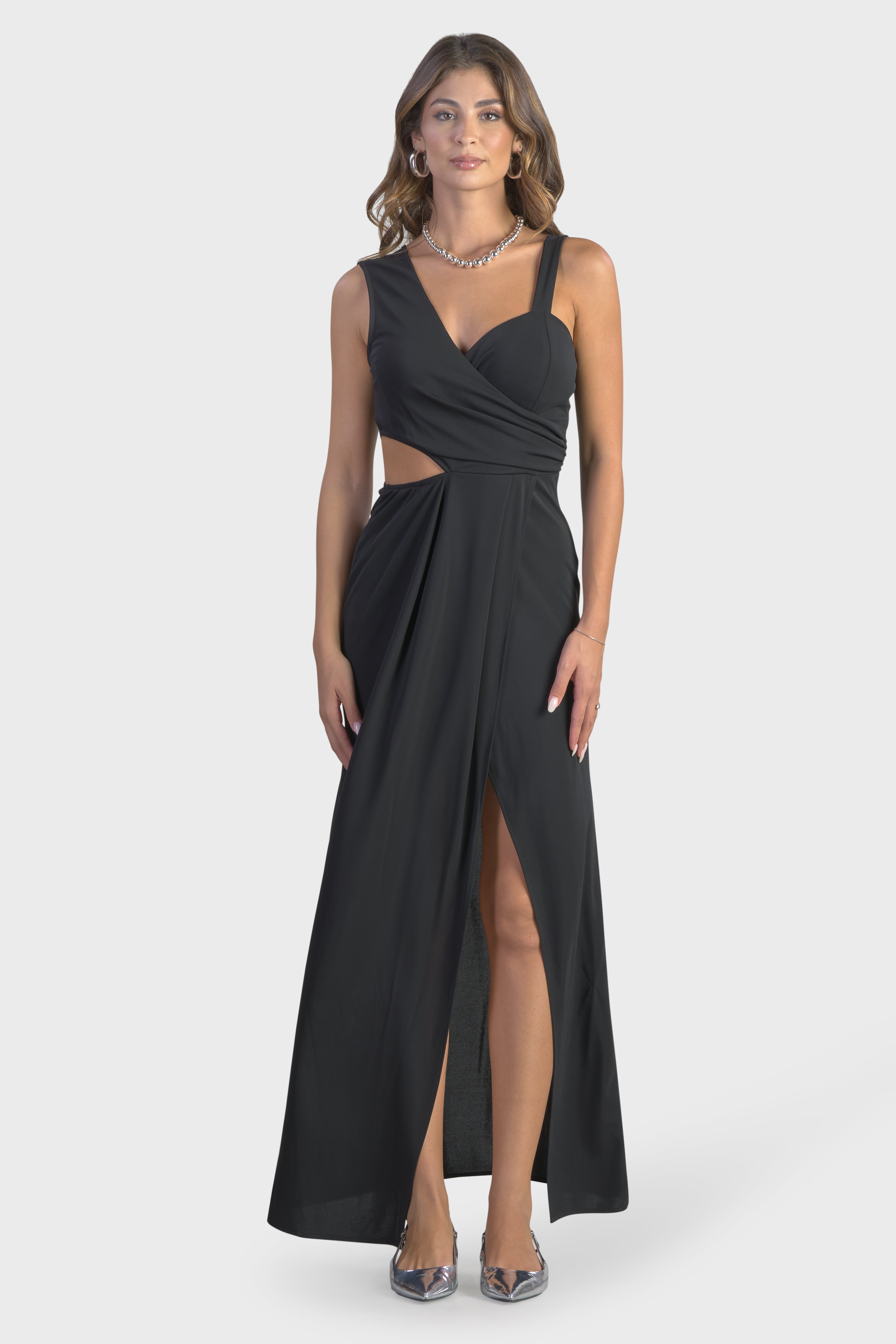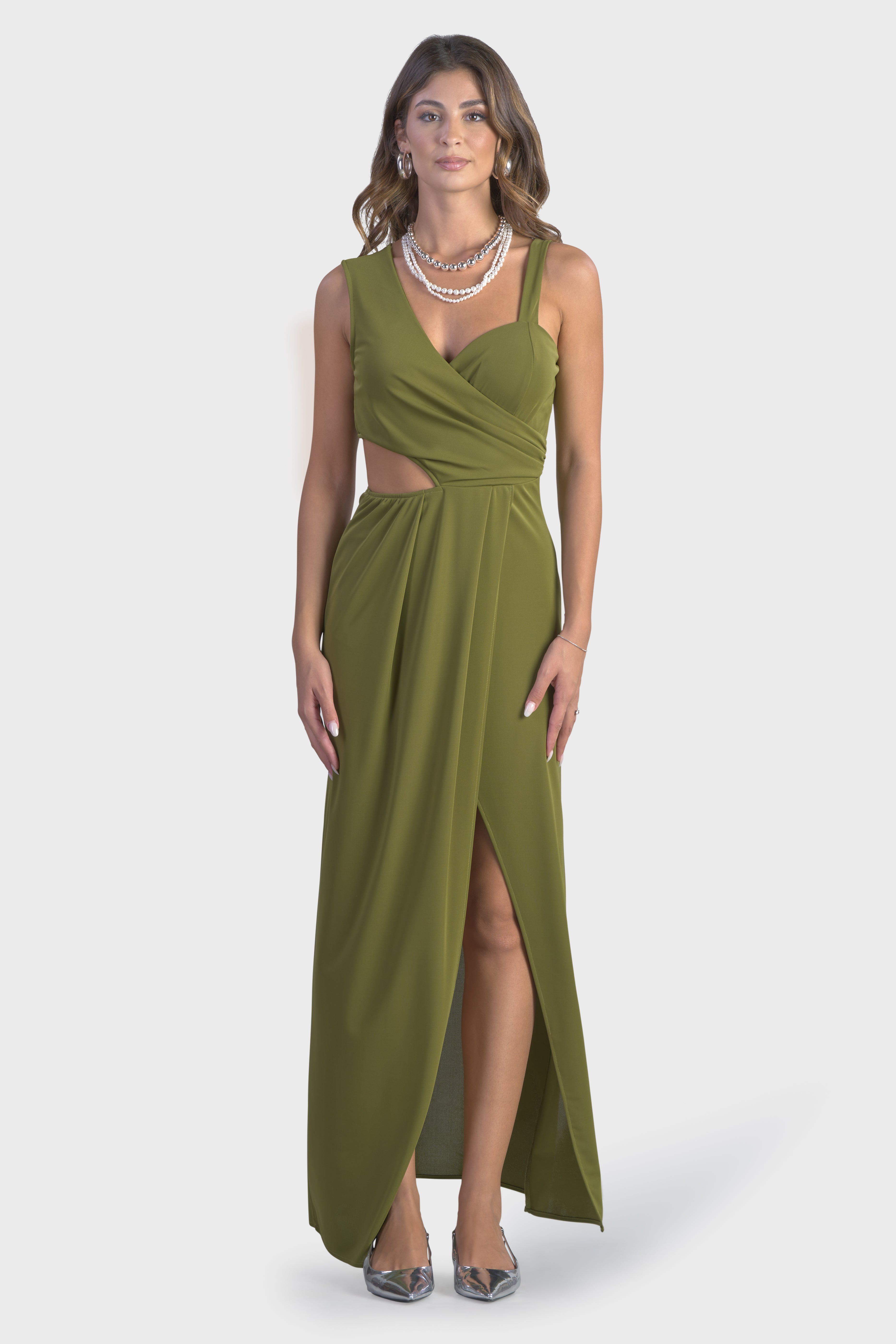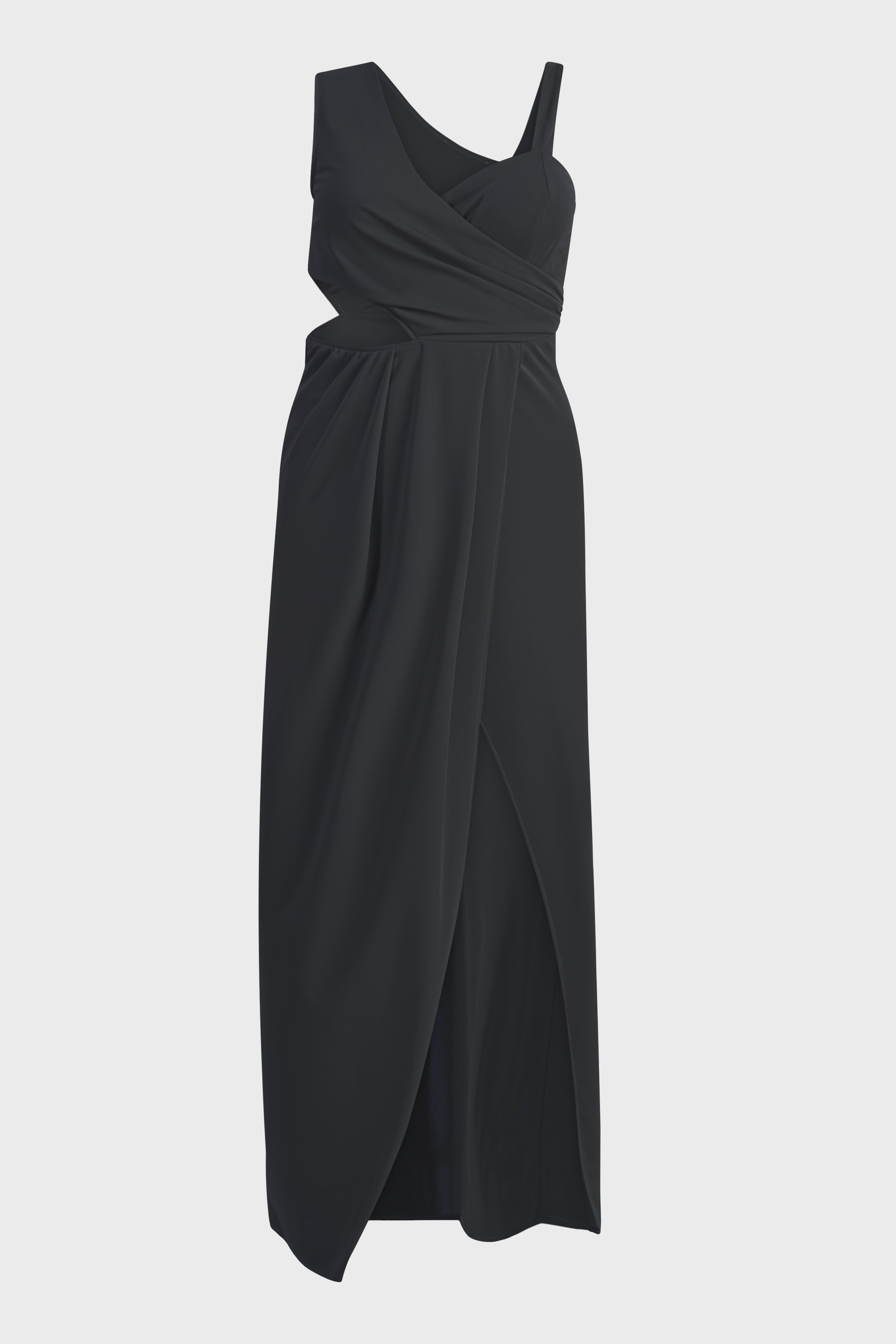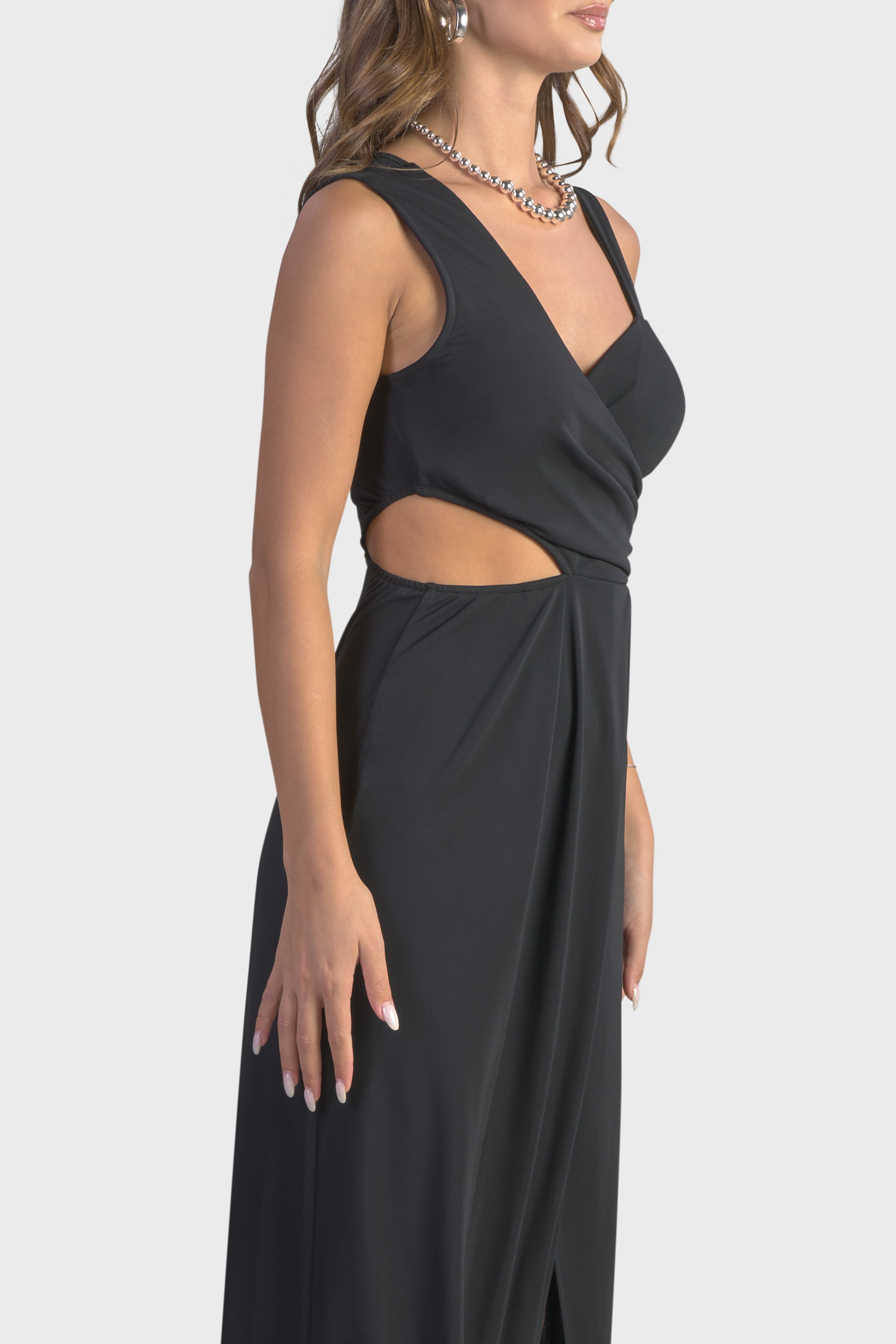 Le linee asimmetriche di questo abito lungo senza maniche mettono in risalto il punto vita. Realizzato in maglia, tessuto cadente ed elasticizzato in grado di conferire una vestibilità comoda ma allo stesso tempo aderente, adatta a tutte le tipologie di corpo. Il modello dai numerosi drappeggi è caratterizzato dallo scollo a V, ma ad evidenziare il design, è il cut out sul fianco. La gonna incrociata, scende svasata aggiungendo un tocco di leggerezza e movimento. Infine presenta uno spacco al centro davanti. Ideale da indossare per un’evento o una serata speciale in cui non si vuole peccare di eleganza.