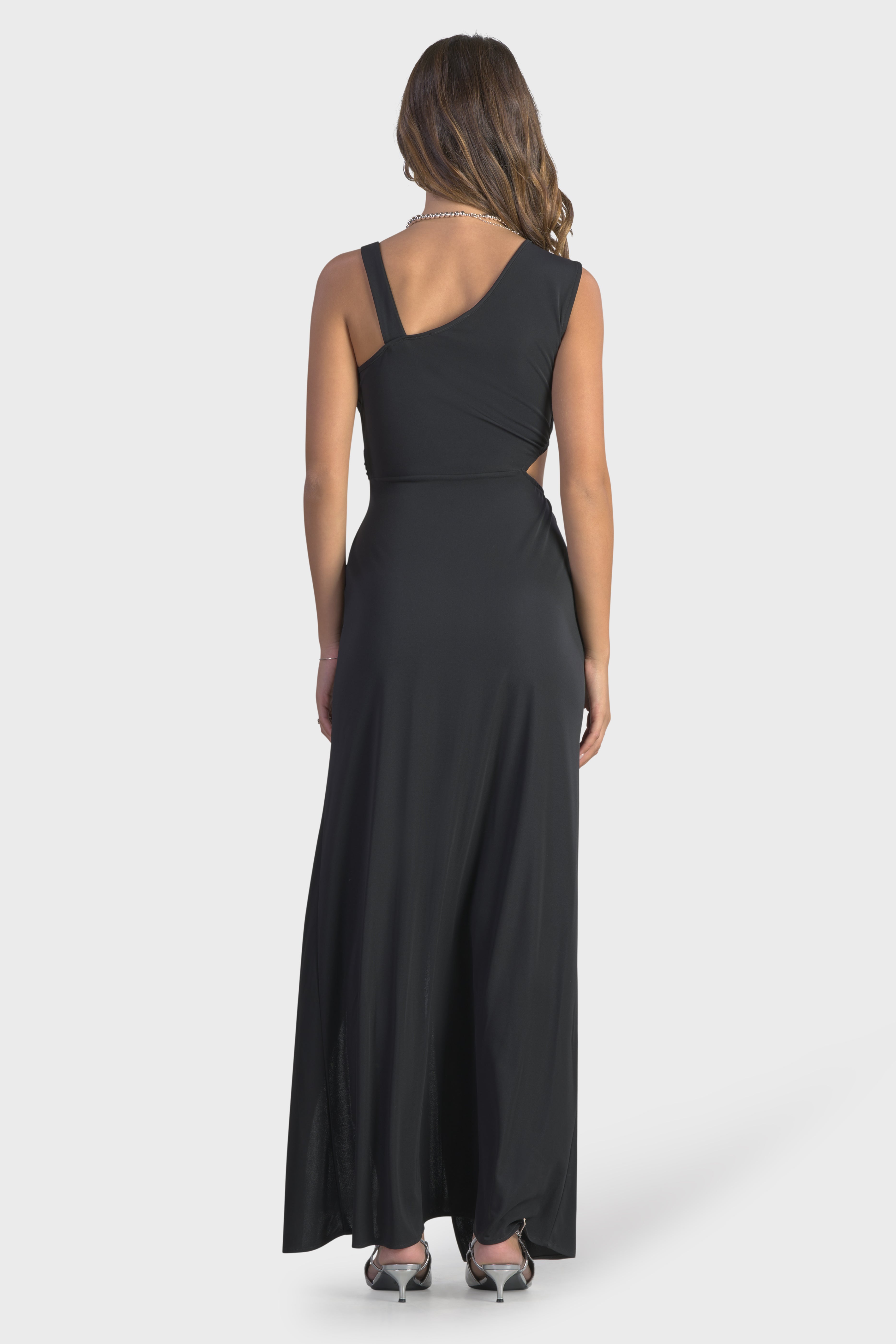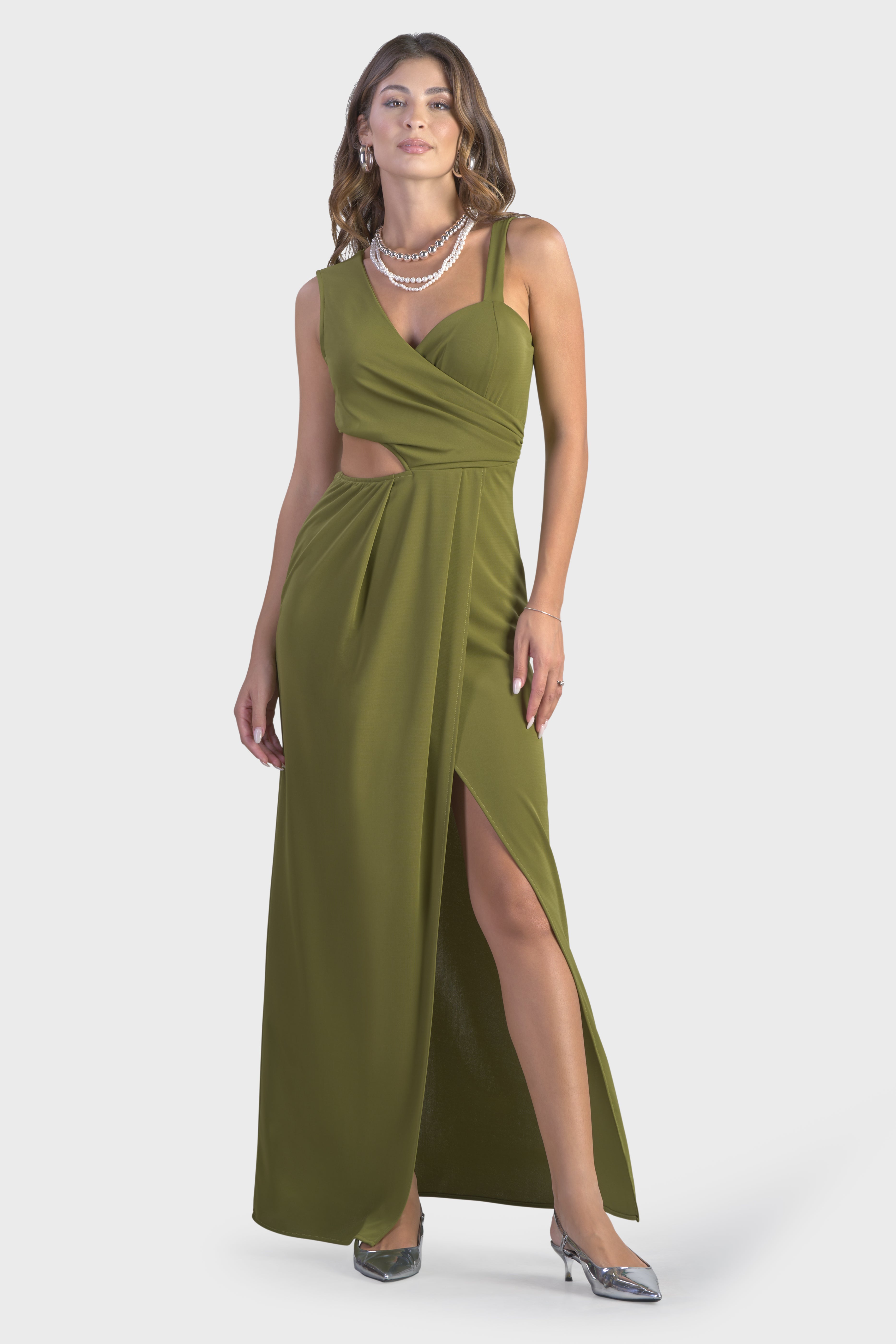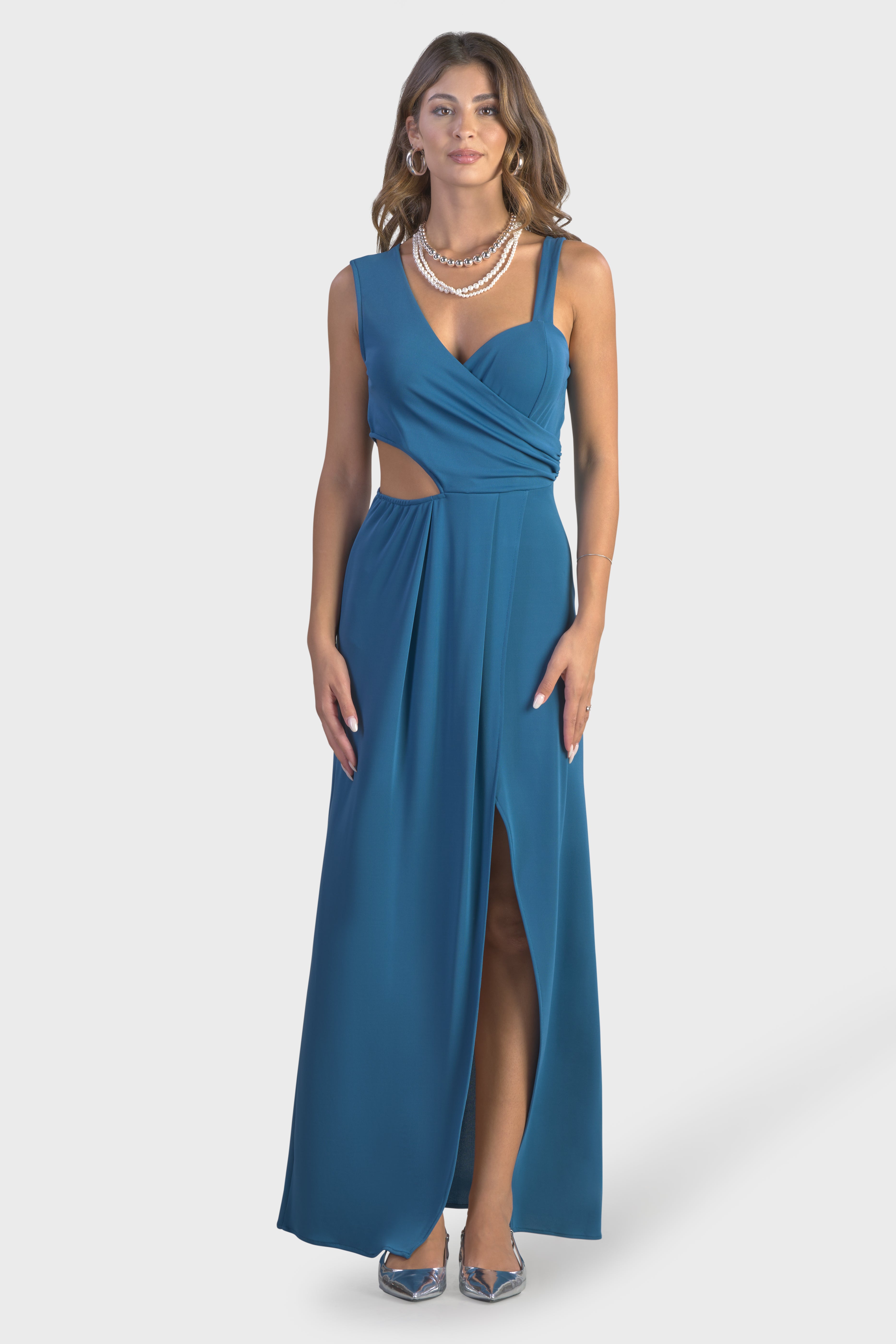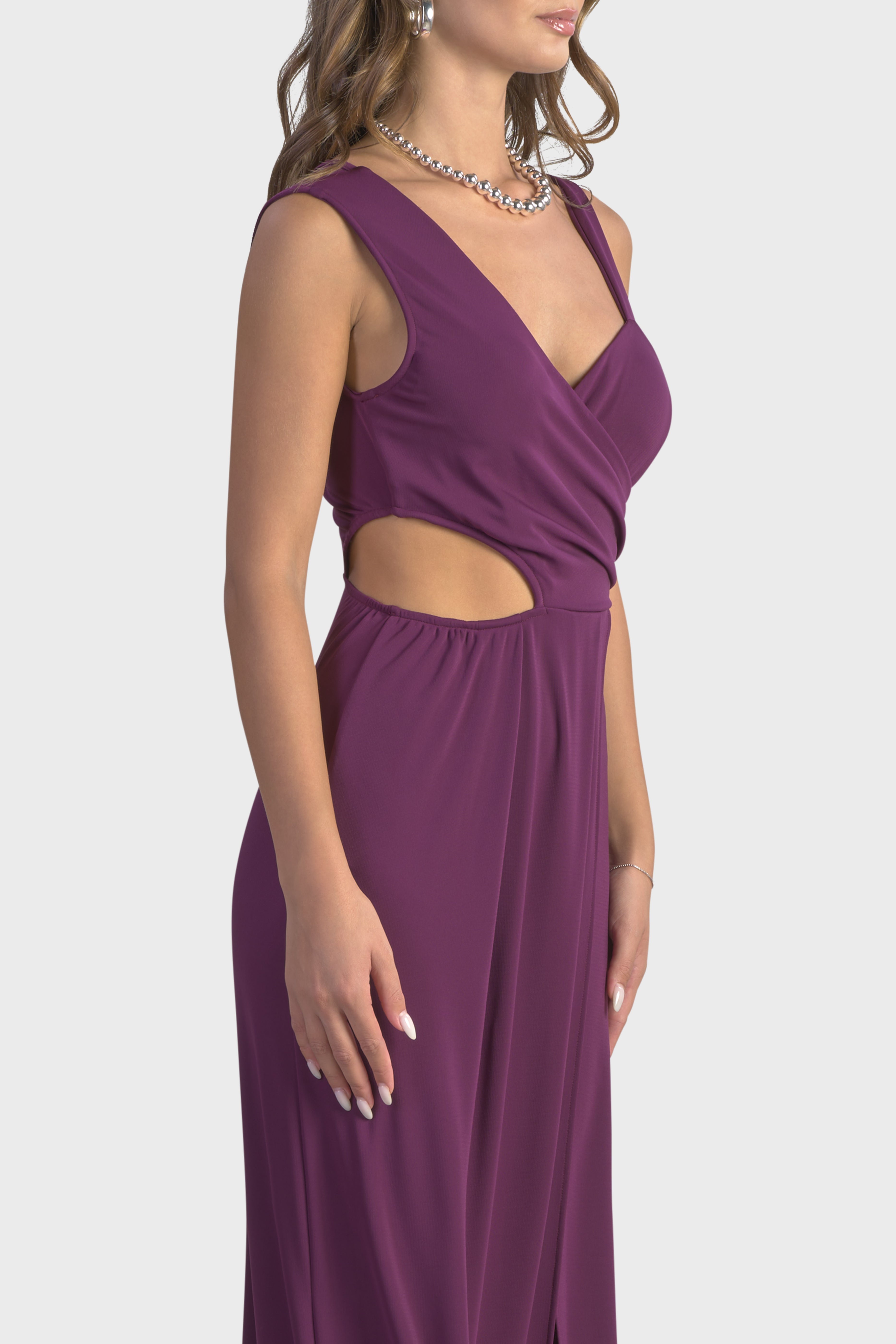 Le linee asimmetriche di questo abito lungo senza maniche mettono in risalto il punto vita. Realizzato in maglia, tessuto cadente ed elasticizzato in grado di conferire una vestibilità comoda ma allo stesso tempo aderente, adatta a tutte le tipologie di corpo. Il modello dai numerosi drappeggi è caratterizzato dallo scollo a V, ma ad evidenziare il design, è il cut out sul fianco. La gonna incrociata, scende svasata aggiungendo un tocco di leggerezza e movimento. Infine presenta uno spacco al centro davanti. Ideale da indossare per un’evento o una serata speciale in cui non si vuole peccare di eleganza.