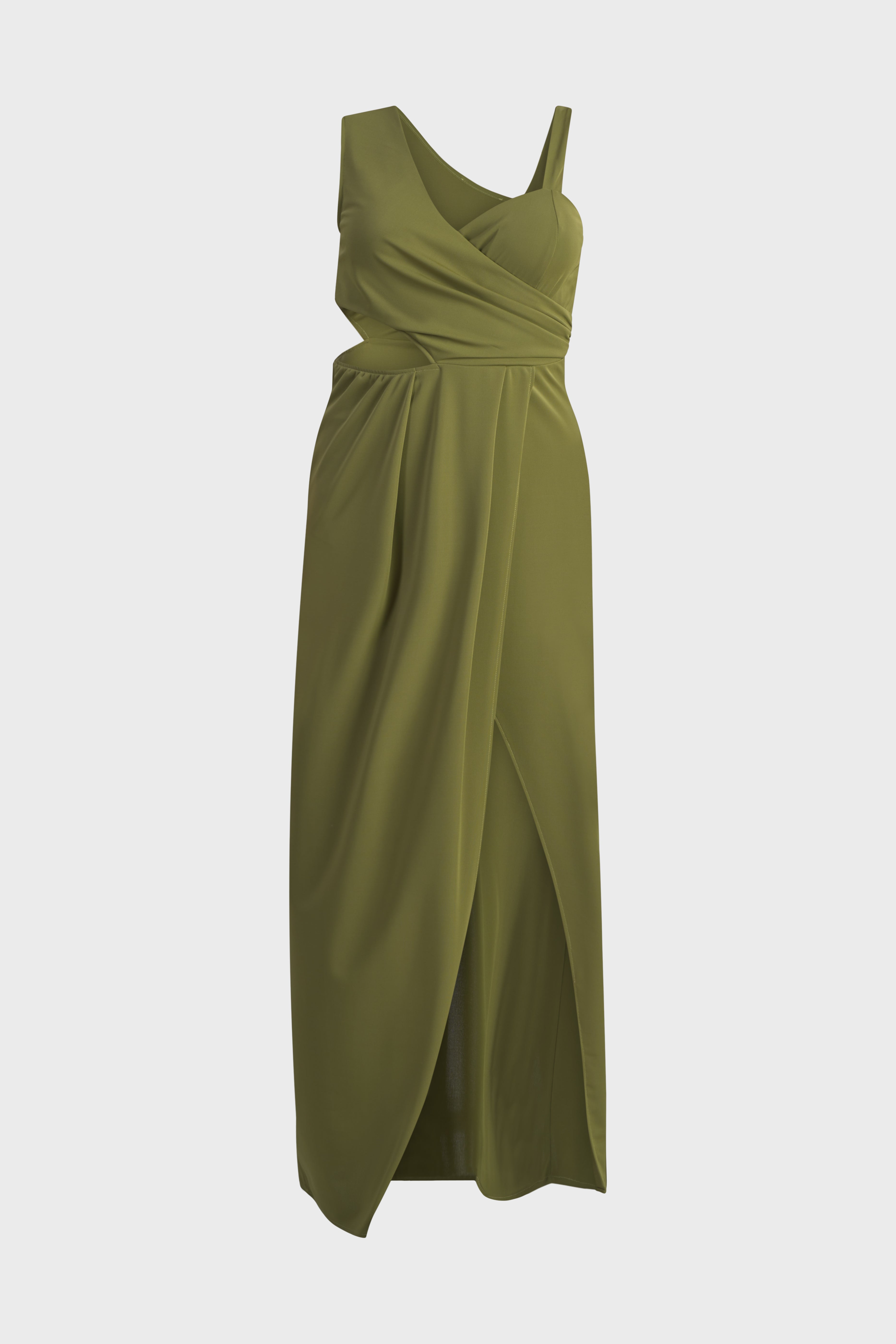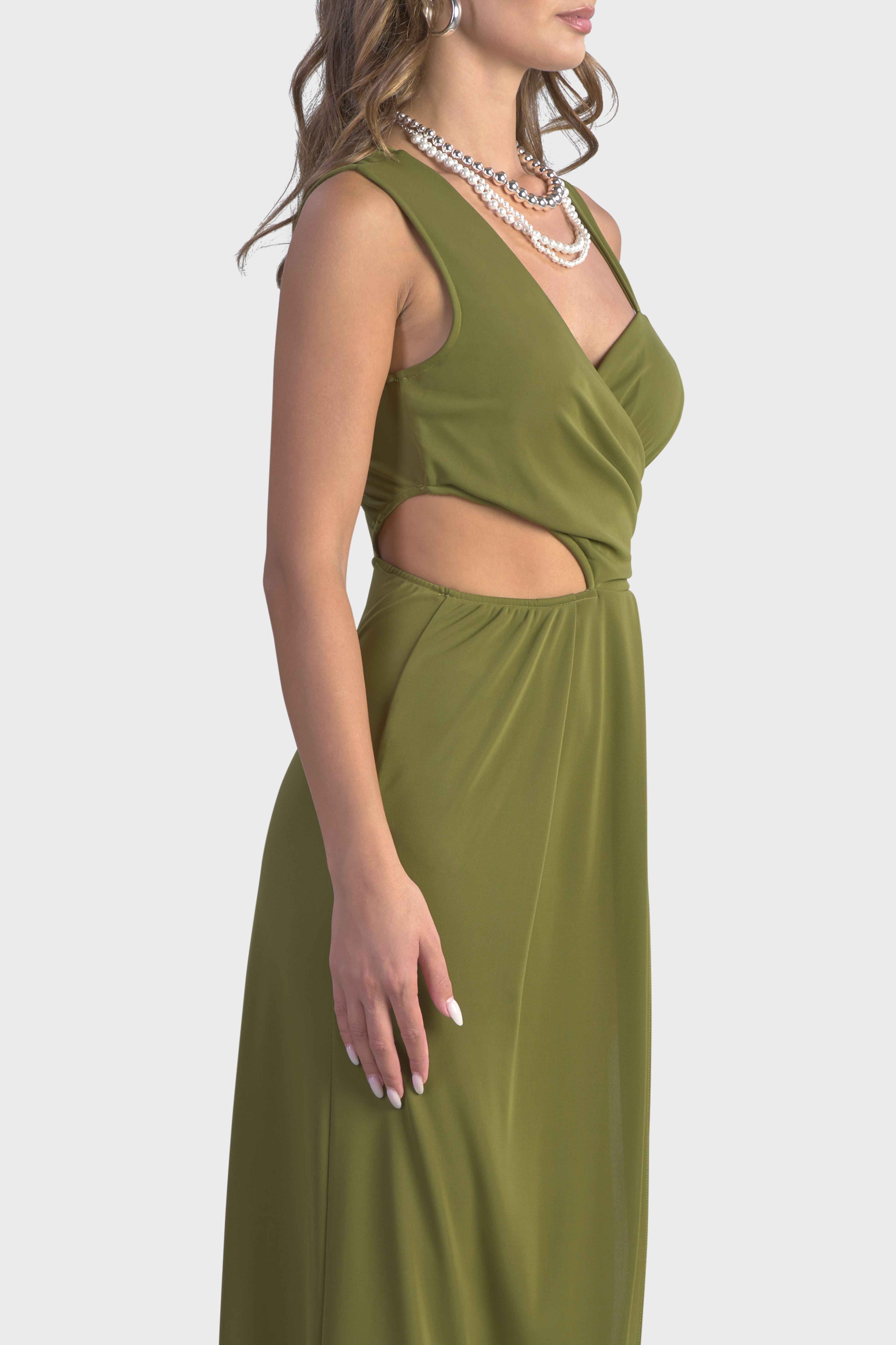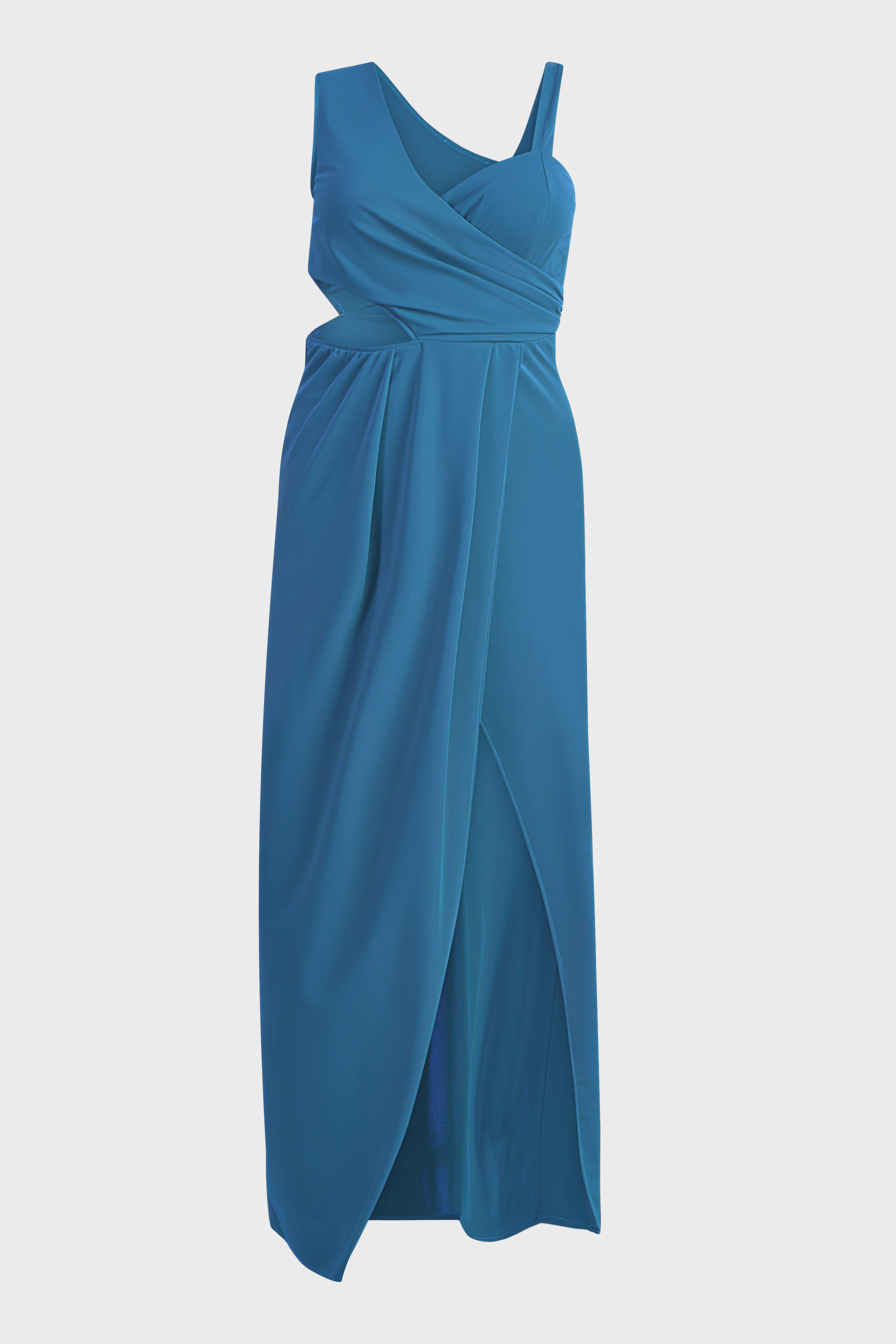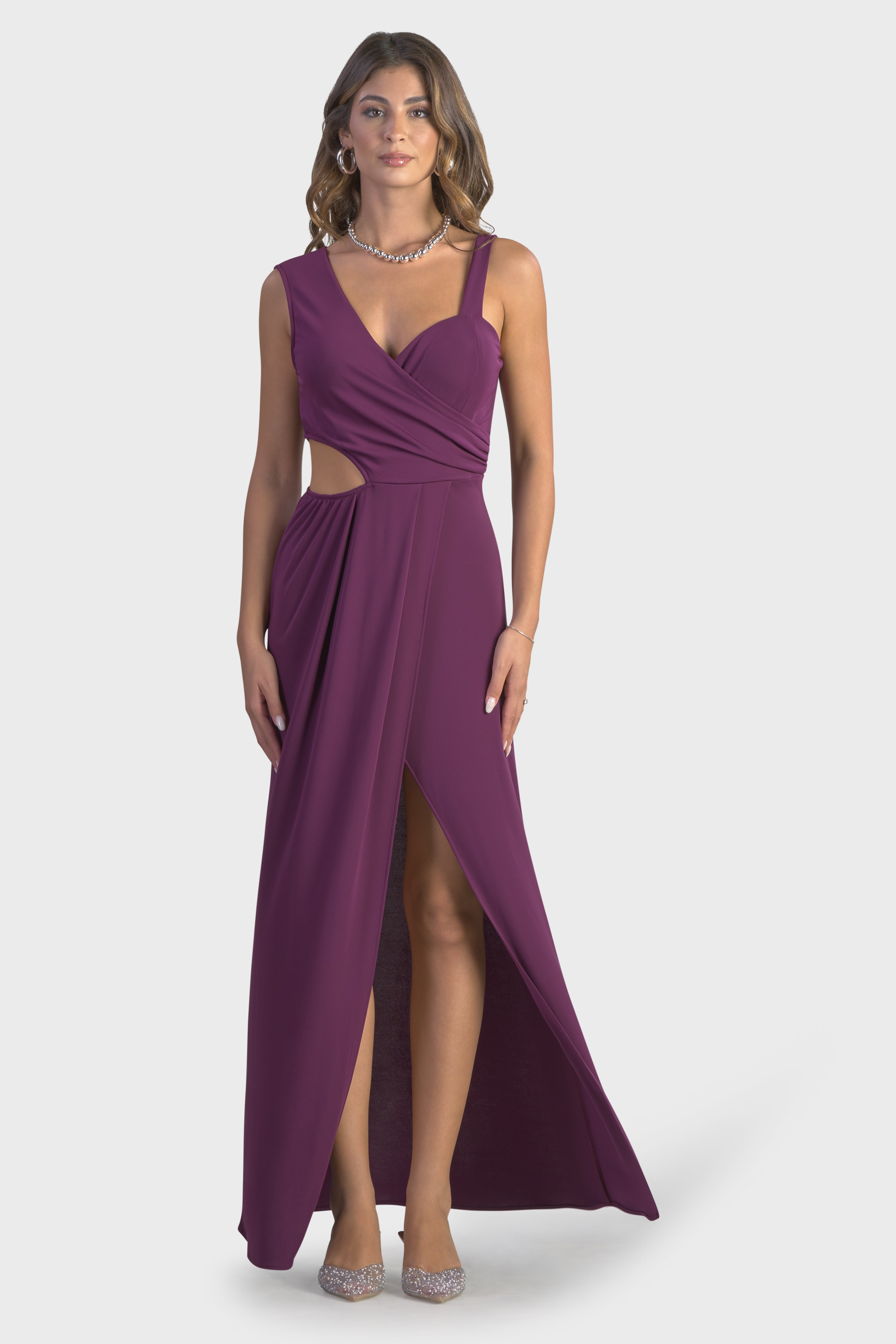 Le linee asimmetriche di questo abito lungo senza maniche mettono in risalto il punto vita. Realizzato in maglia, tessuto cadente ed elasticizzato in grado di conferire una vestibilità comoda ma allo stesso tempo aderente, adatta a tutte le tipologie di corpo. Il modello dai numerosi drappeggi è caratterizzato dallo scollo a V, ma ad evidenziare il design, è il cut out sul fianco. La gonna incrociata, scende svasata aggiungendo un tocco di leggerezza e movimento. Infine presenta uno spacco al centro davanti. Ideale da indossare per un’evento o una serata speciale in cui non si vuole peccare di eleganza.