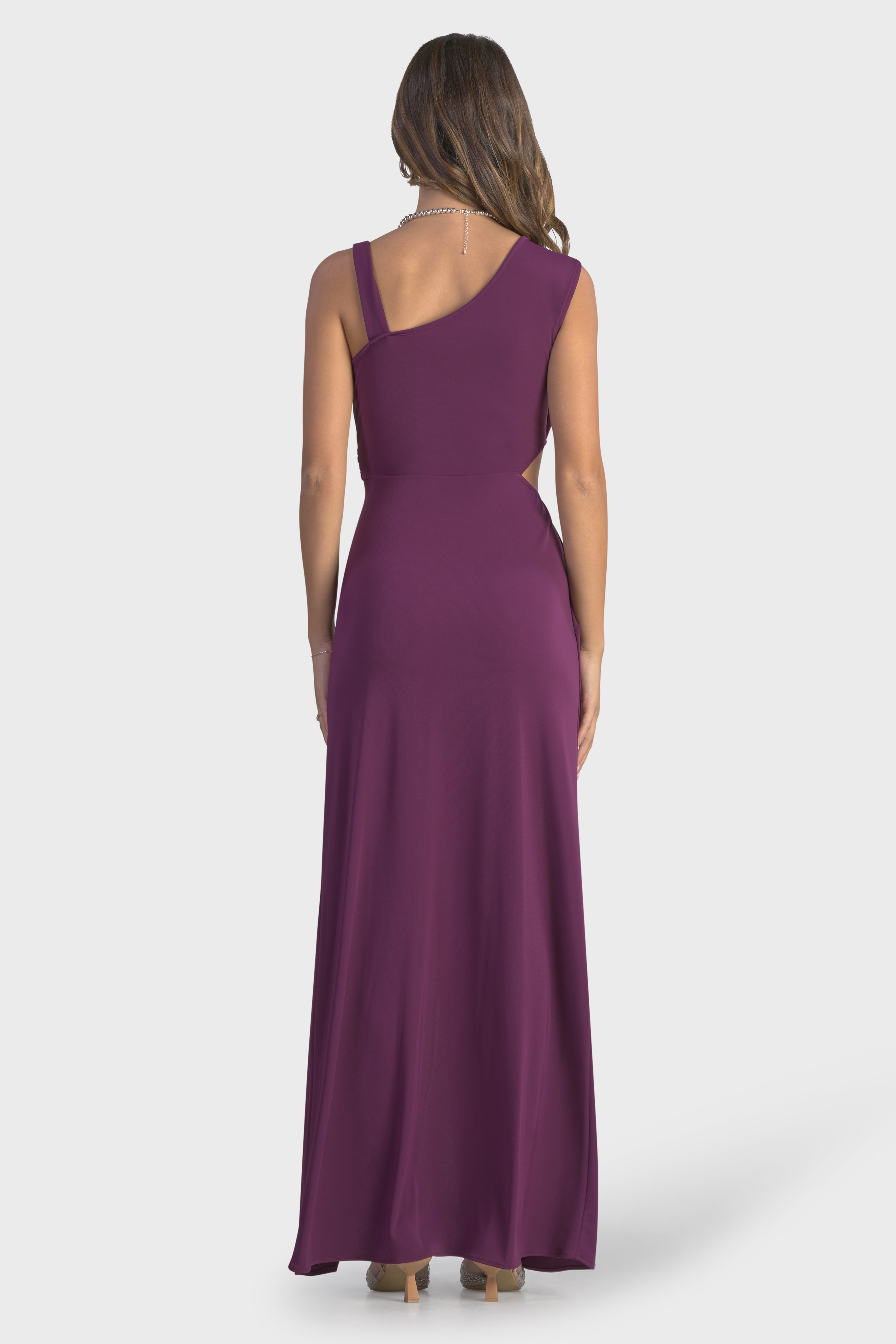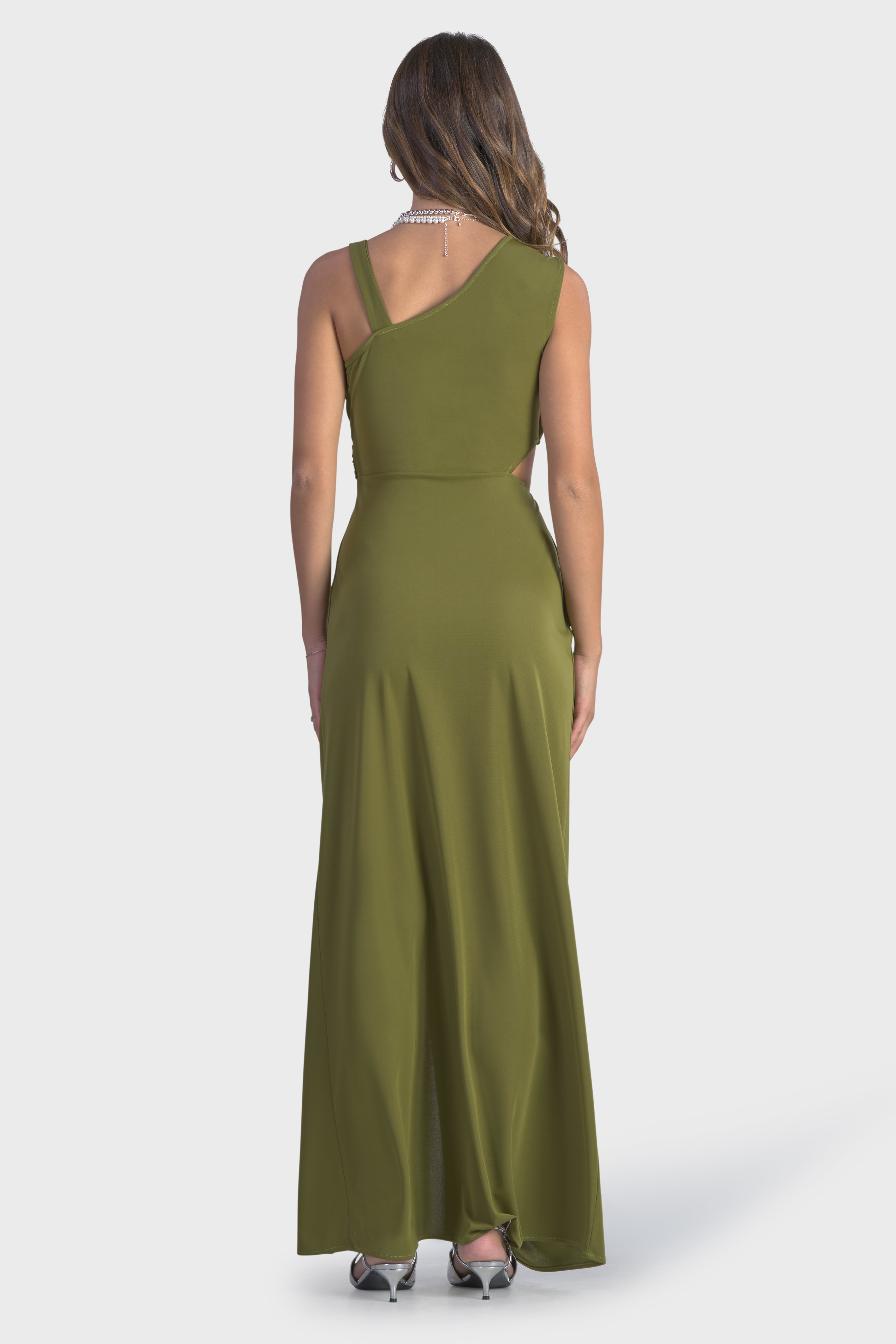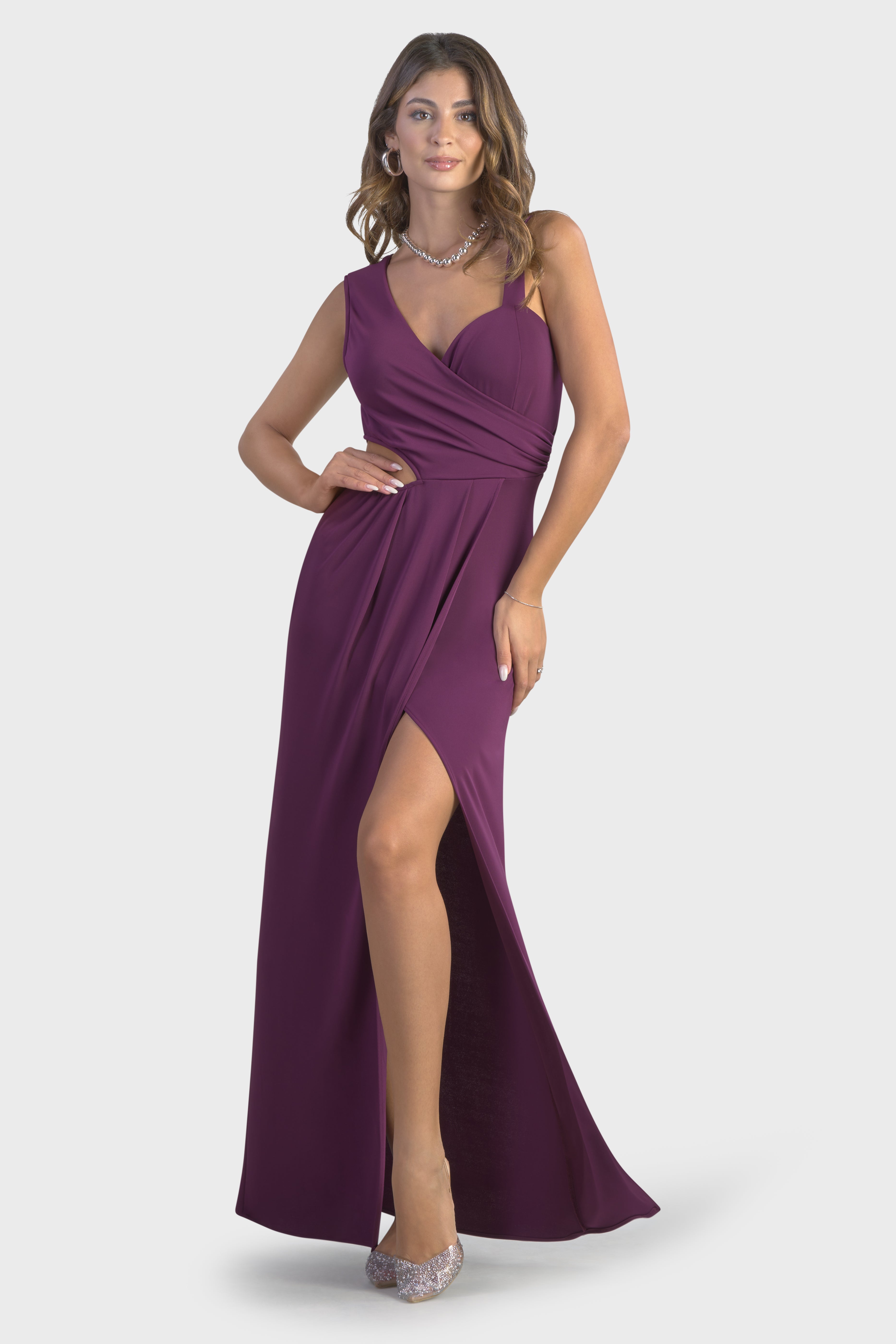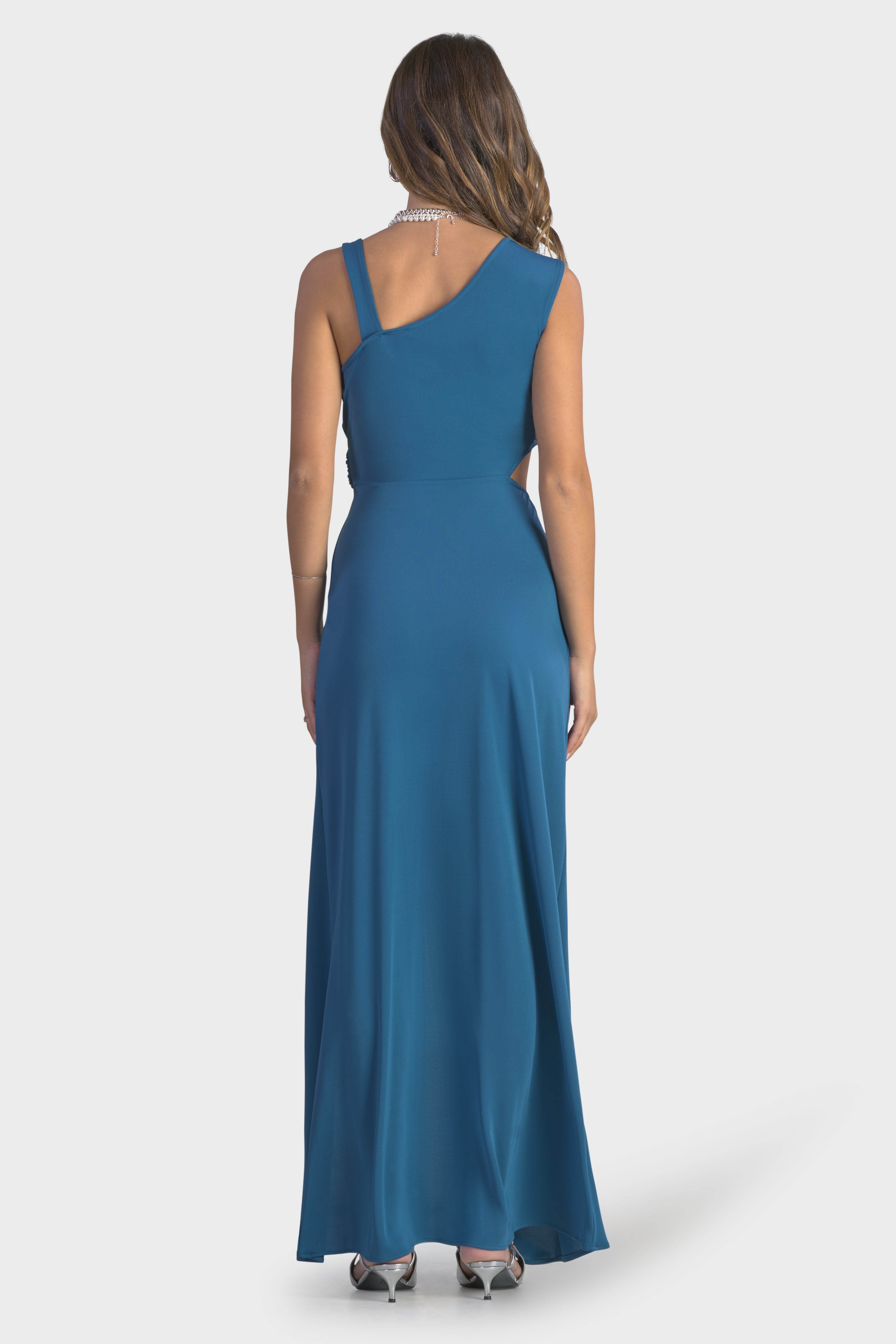 Le linee asimmetriche di questo abito lungo senza maniche mettono in risalto il punto vita. Realizzato in maglia, tessuto cadente ed elasticizzato in grado di conferire una vestibilità comoda ma allo stesso tempo aderente, adatta a tutte le tipologie di corpo. Il modello dai numerosi drappeggi è caratterizzato dallo scollo a V, ma ad evidenziare il design, è il cut out sul fianco. La gonna incrociata, scende svasata aggiungendo un tocco di leggerezza e movimento. Infine presenta uno spacco al centro davanti. Ideale da indossare per un’evento o una serata speciale in cui non si vuole peccare di eleganza.