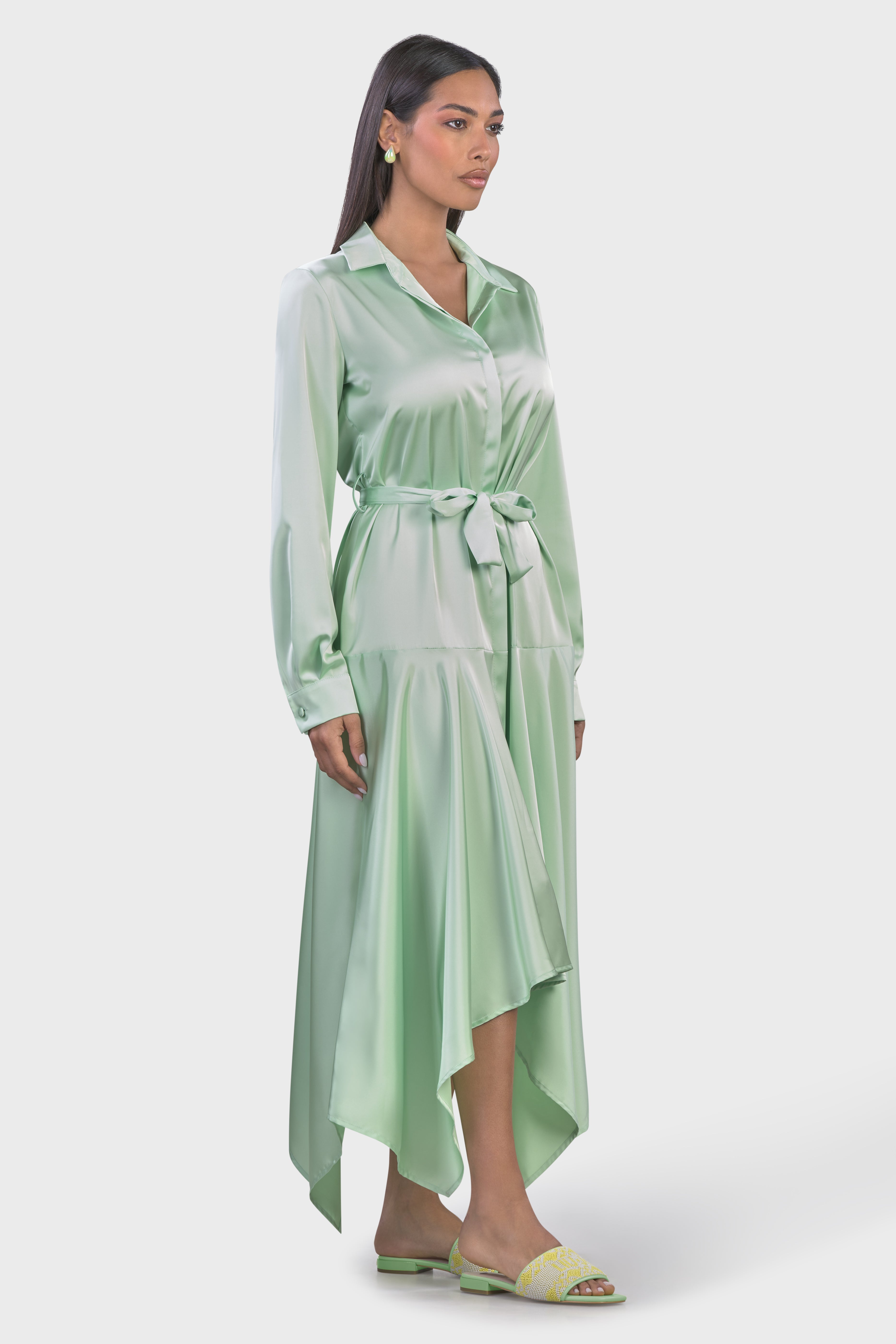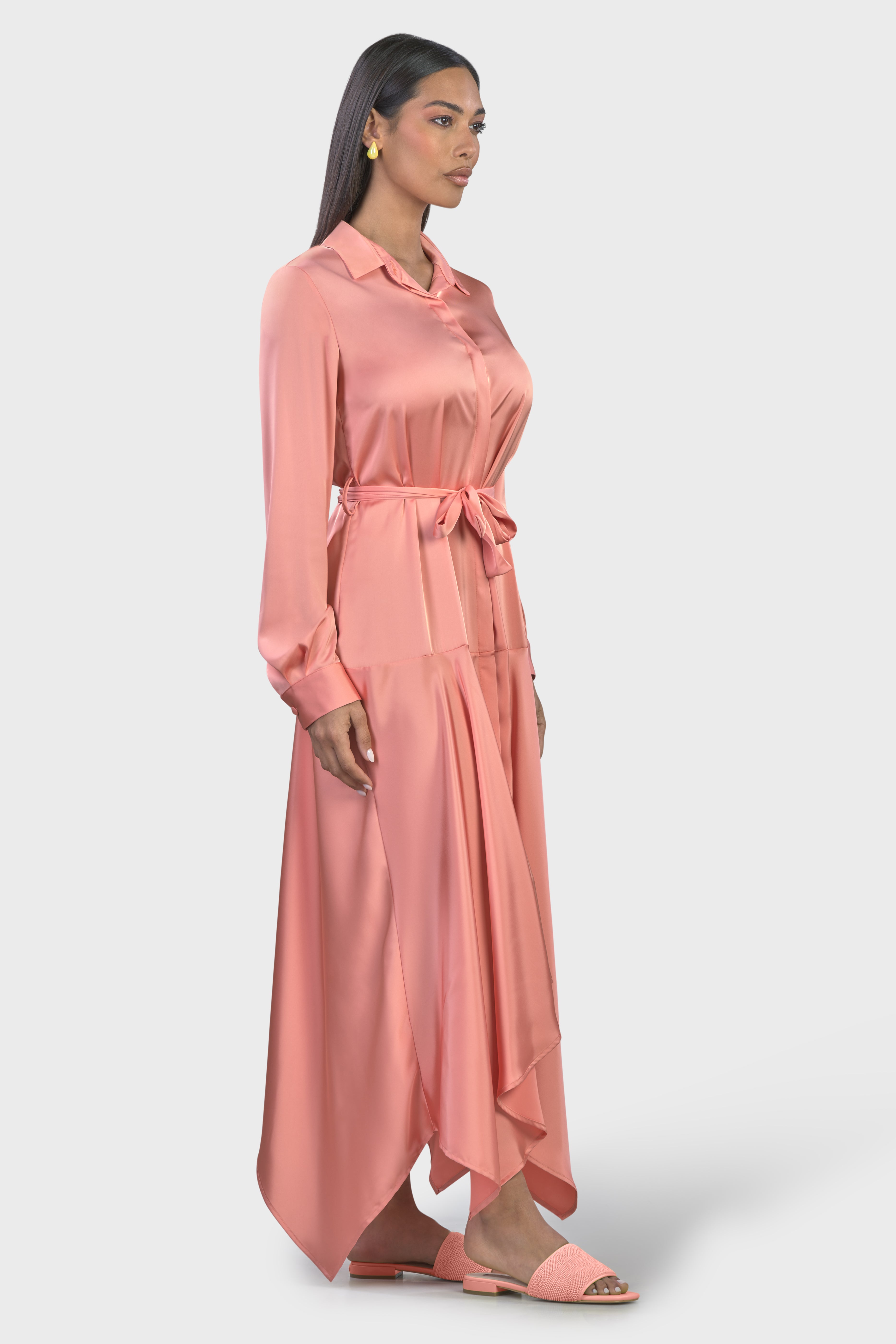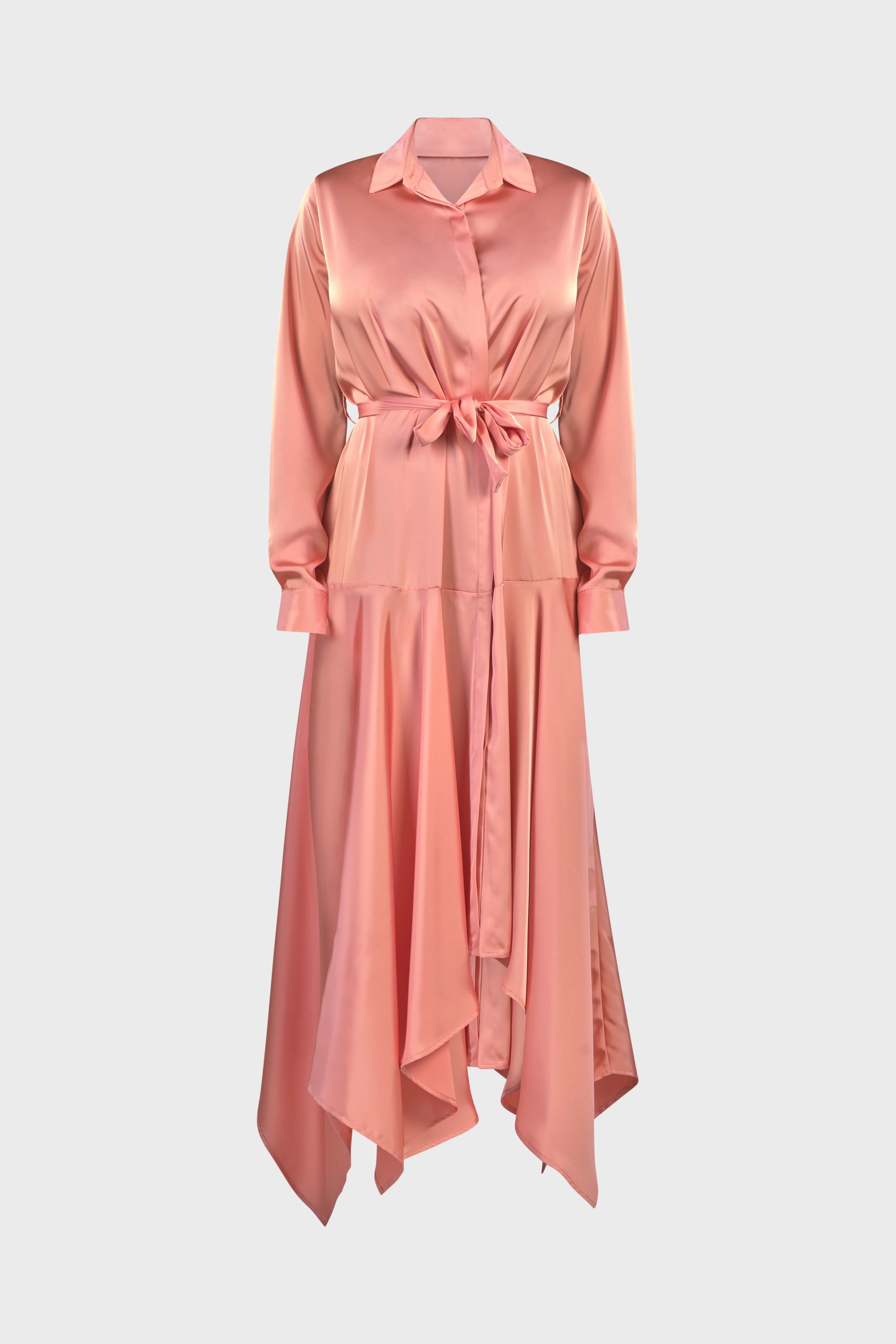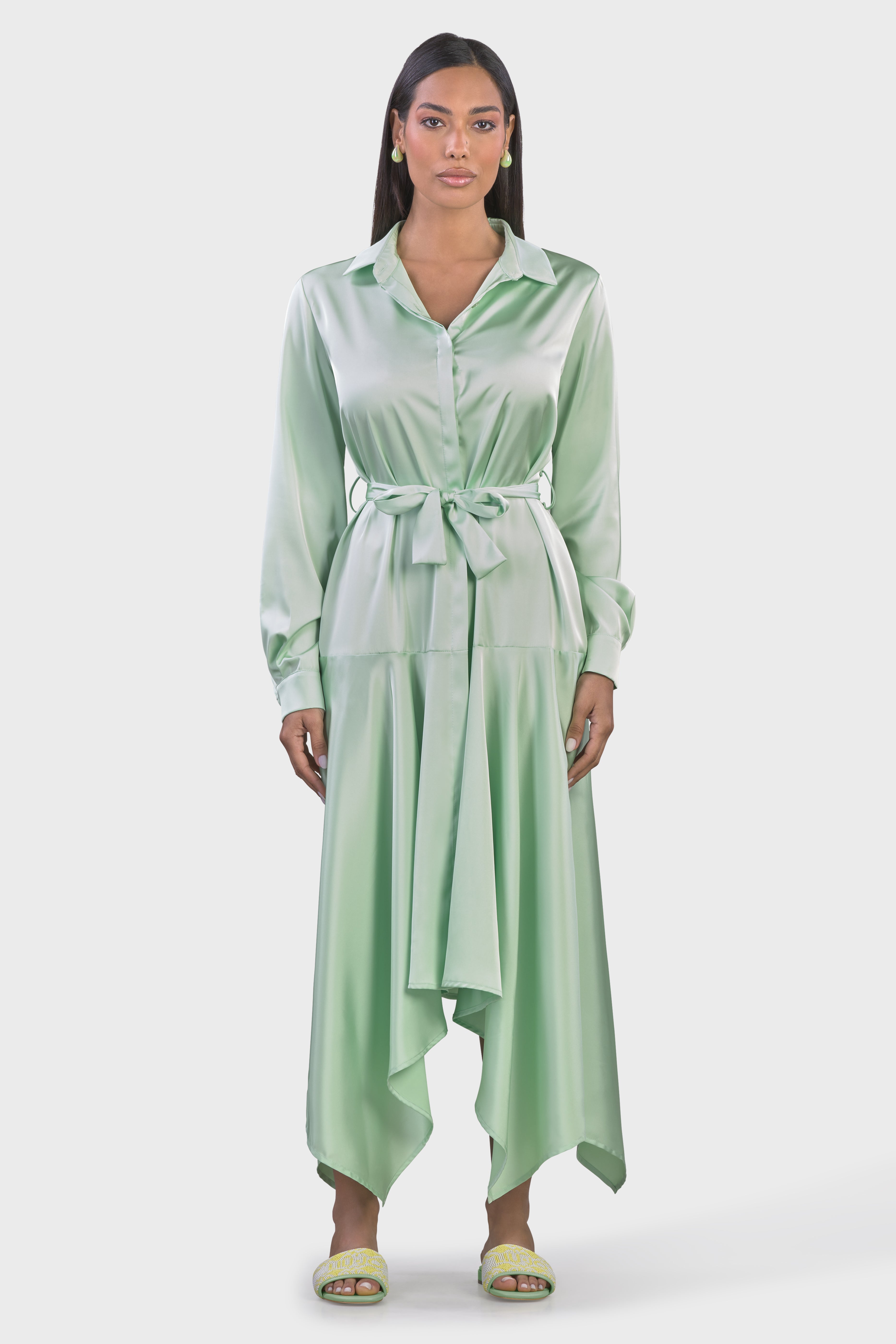 L’ abito chemisier è da sempre tra i preferiti del guardaroba. Le linee ampie di quest‘abito donano una silhouette delineata grazie alla cintura, in grado di personalizzare il fit.Realizzato in raso, tessuto in grado di conferire una consistenza distintiva e resistente. Completano il modello il fondo asimmetrico, il classico colletto a punta, l’abbottonatura nascosta e le maniche lunghe con polsi a camicia, chiusi con bottone. Pensato per combattere i cambiamenti climatici con stile, è perfetto da indossare in ufficio o di sera con paio di décolleté o un paio di sandali.