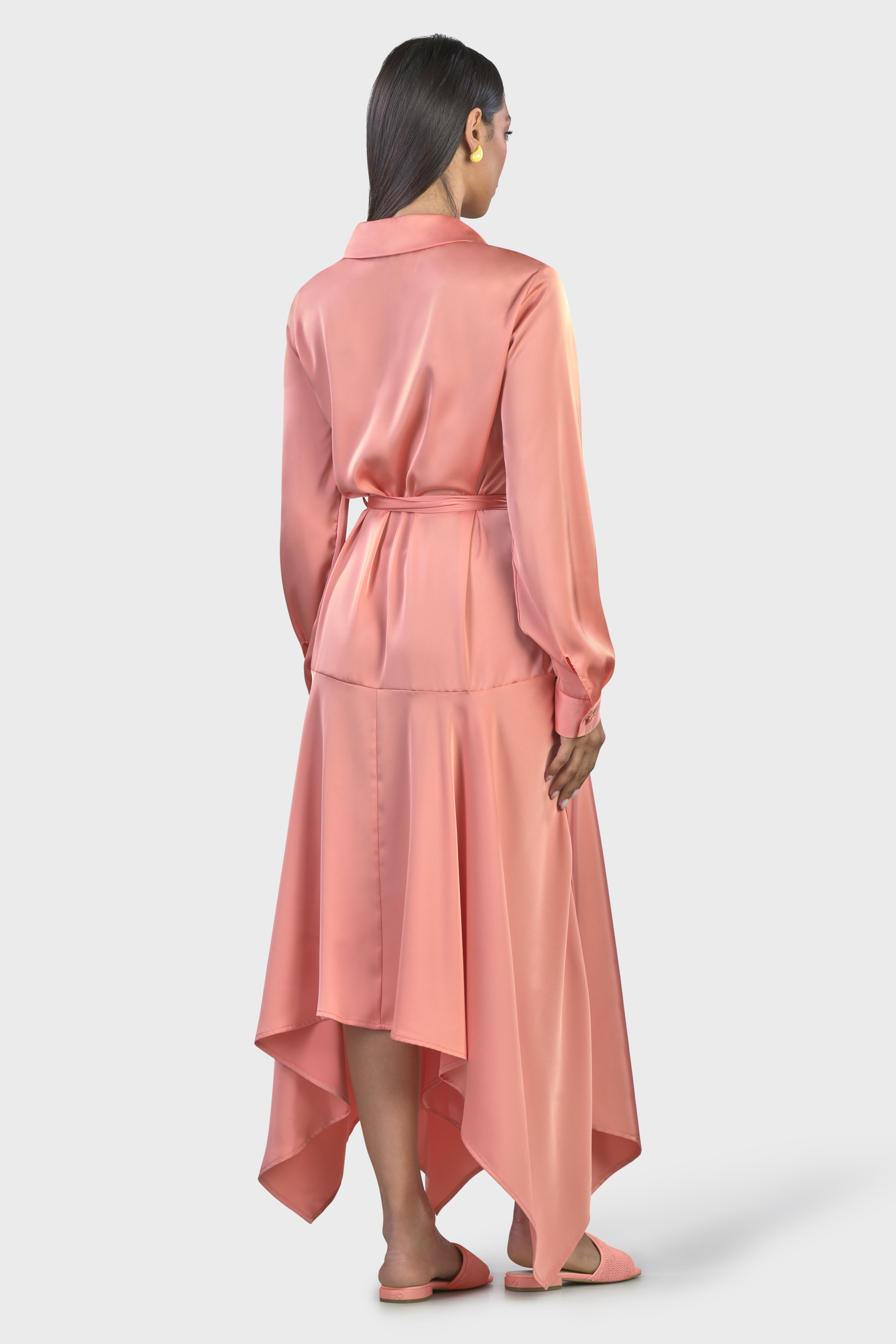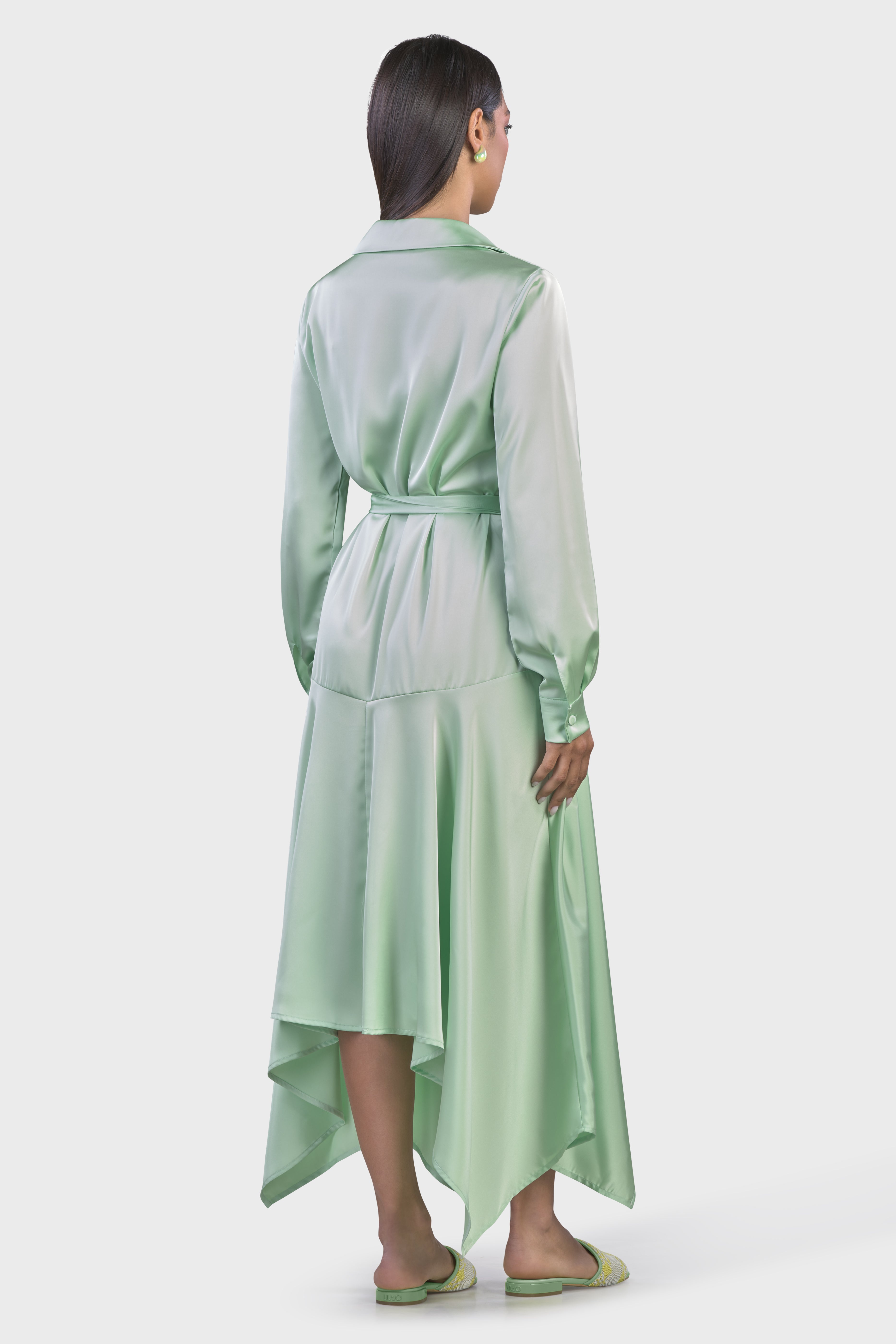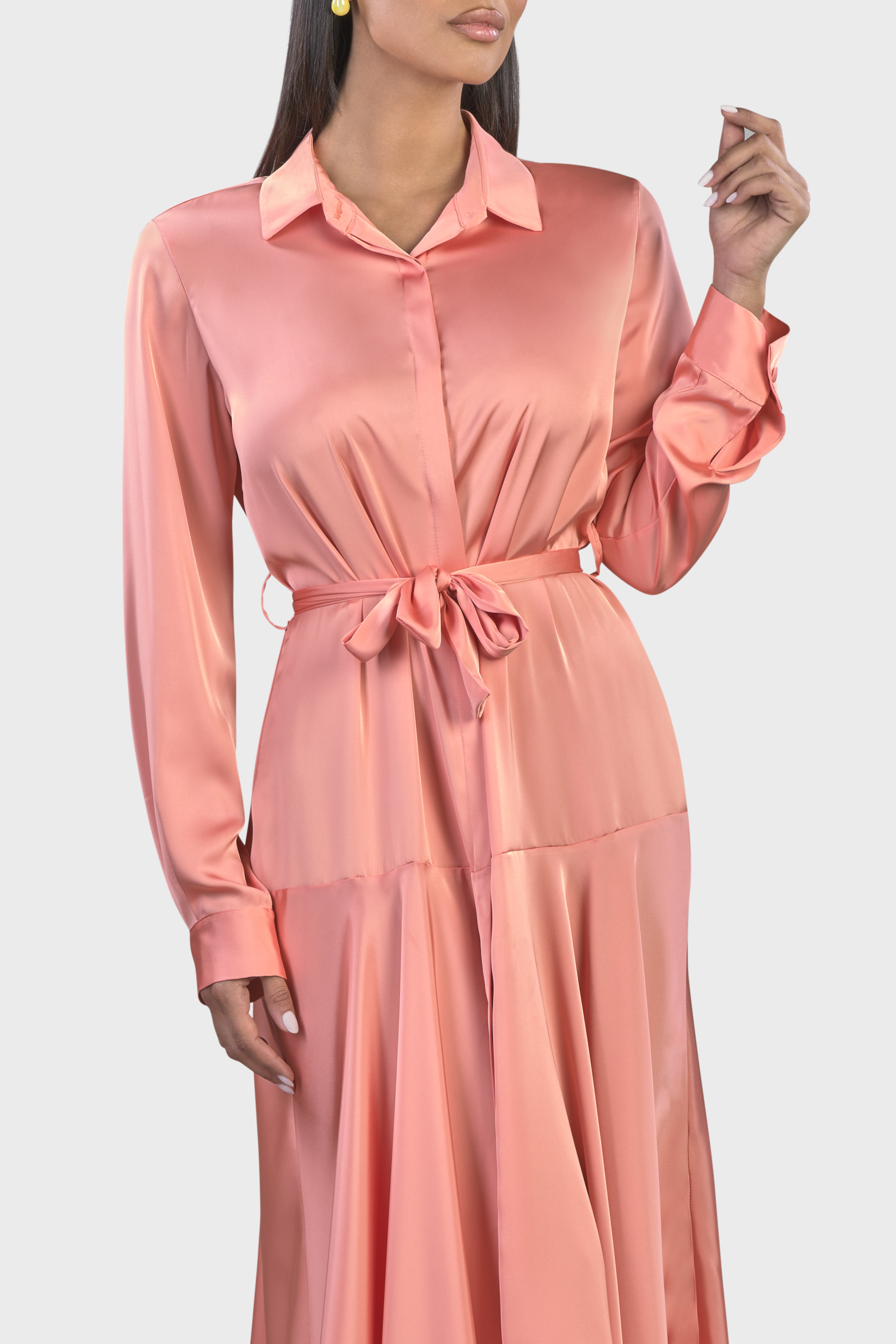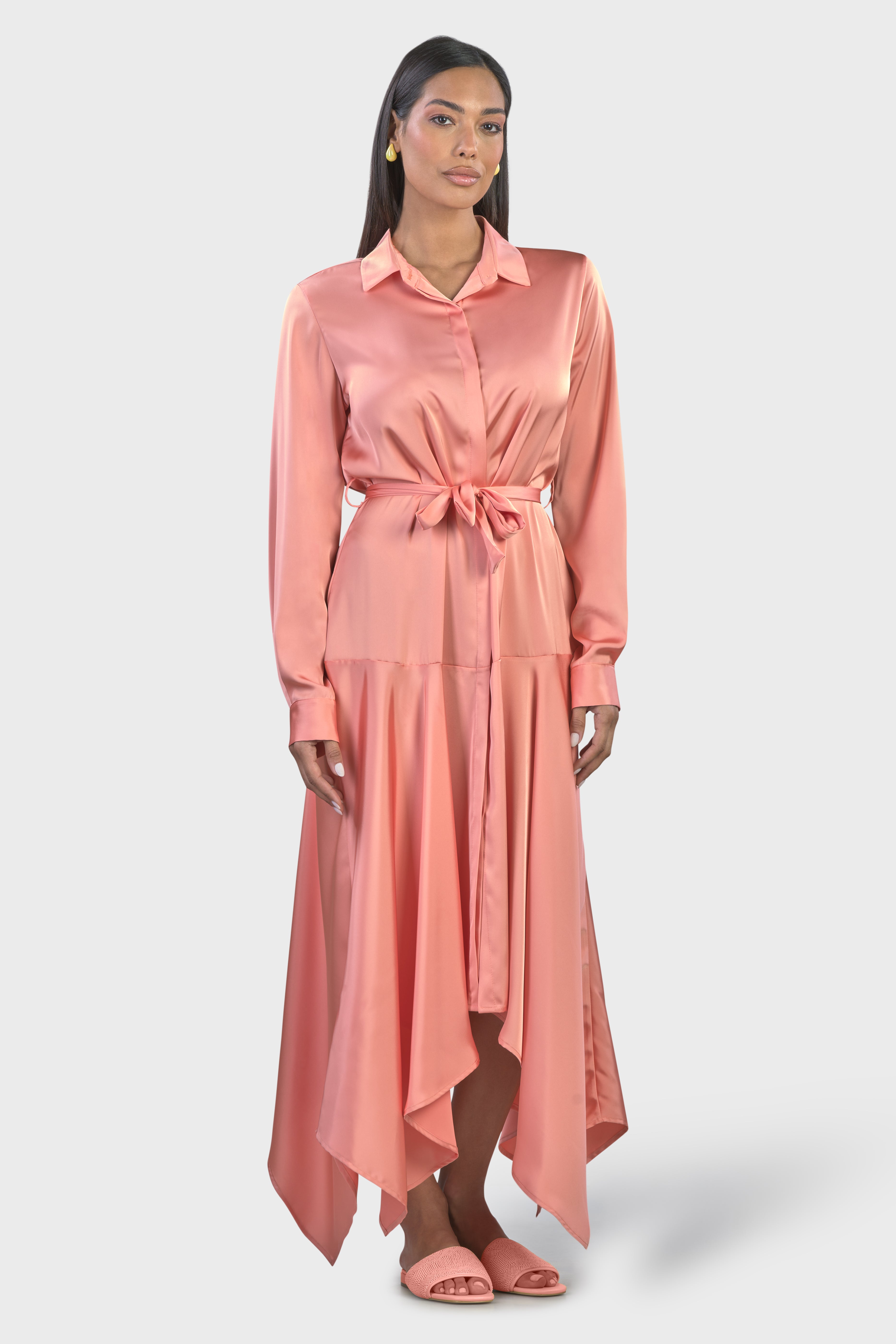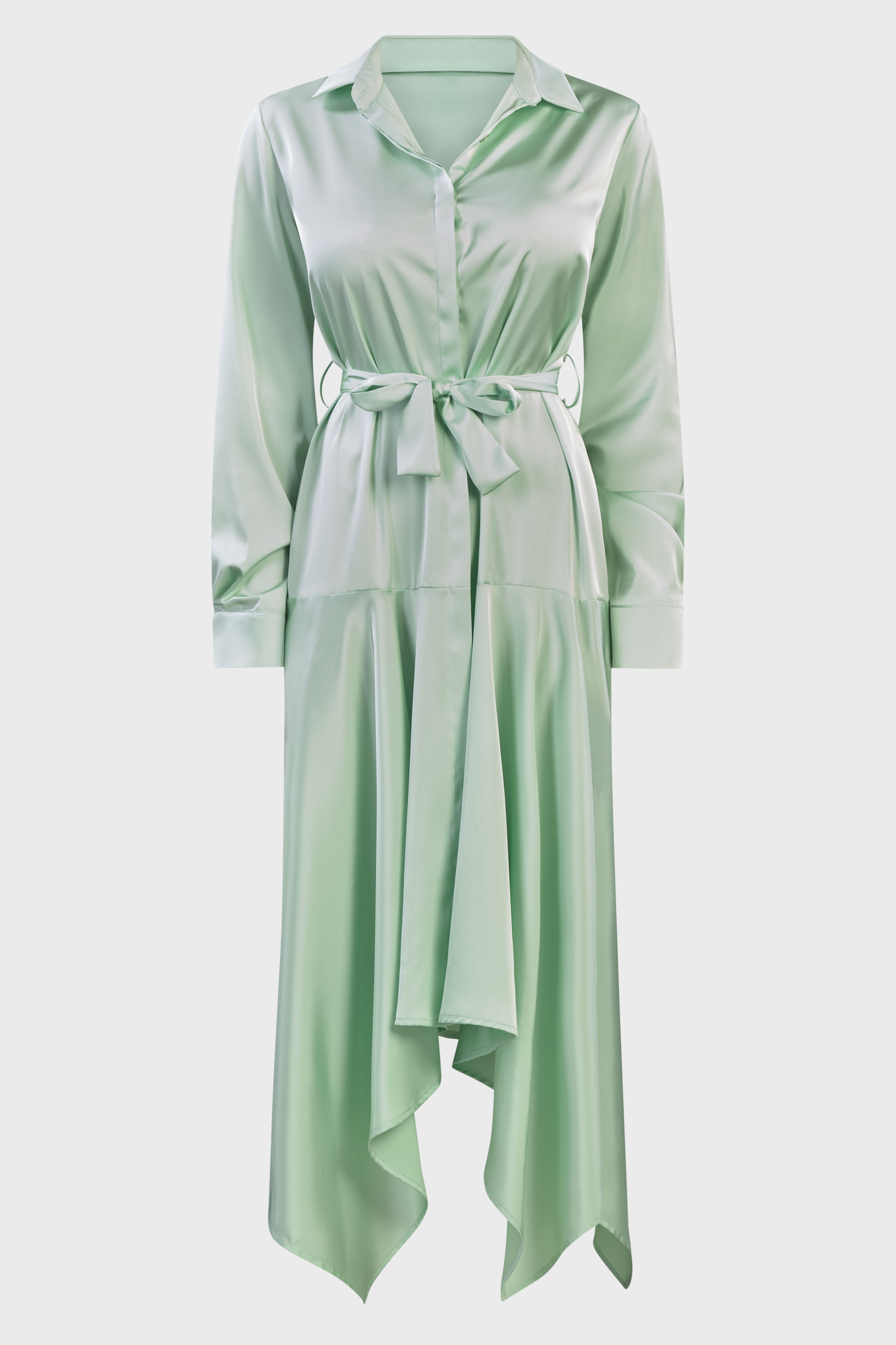 L’ abito chemisier è da sempre tra i preferiti del guardaroba. Le linee ampie di quest‘abito donano una silhouette delineata grazie alla cintura, in grado di personalizzare il fit.Realizzato in raso, tessuto in grado di conferire una consistenza distintiva e resistente. Completano il modello il fondo asimmetrico, il classico colletto a punta, l’abbottonatura nascosta e le maniche lunghe con polsi a camicia, chiusi con bottone. Pensato per combattere i cambiamenti climatici con stile, è perfetto da indossare in ufficio o di sera con paio di décolleté o un paio di sandali.