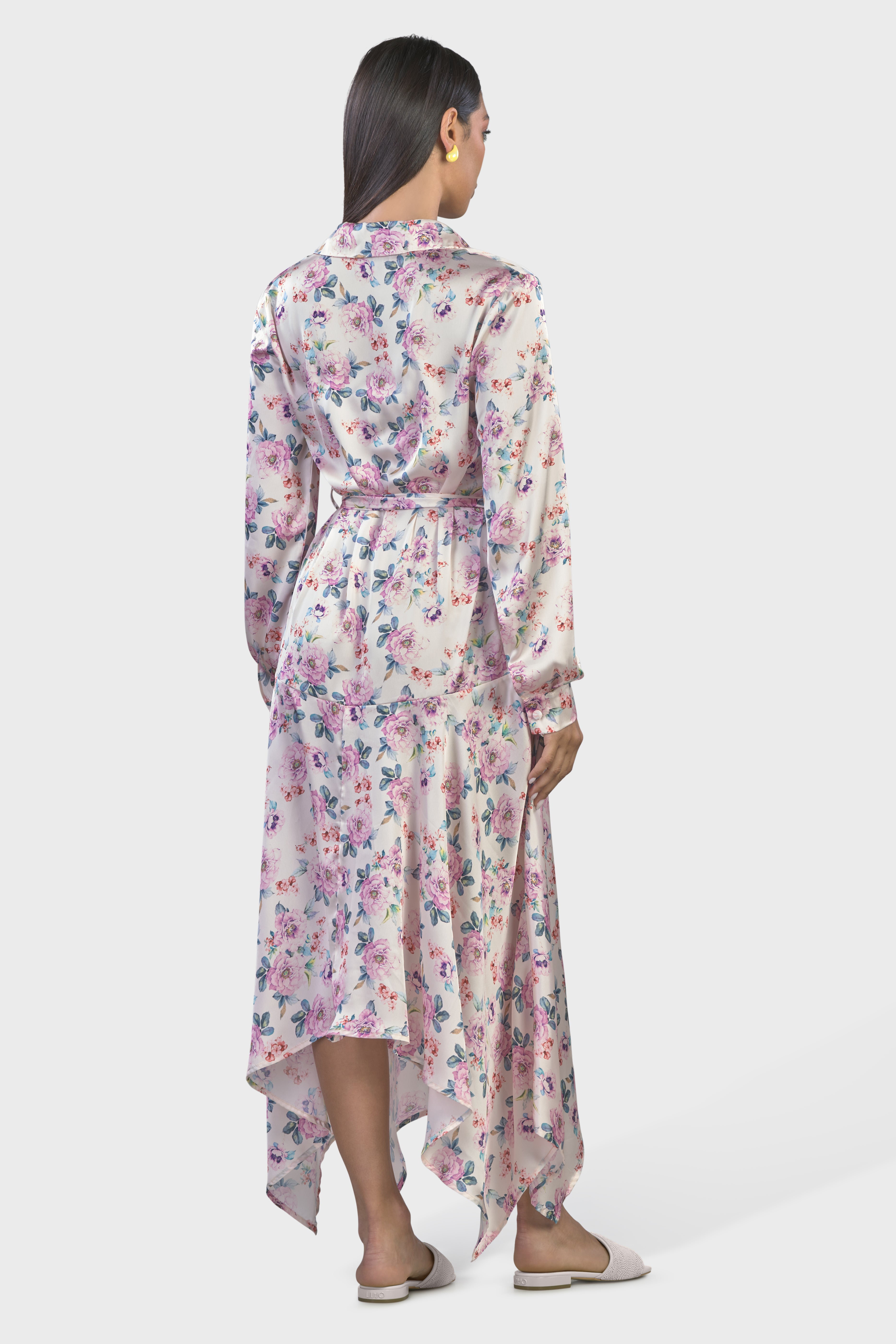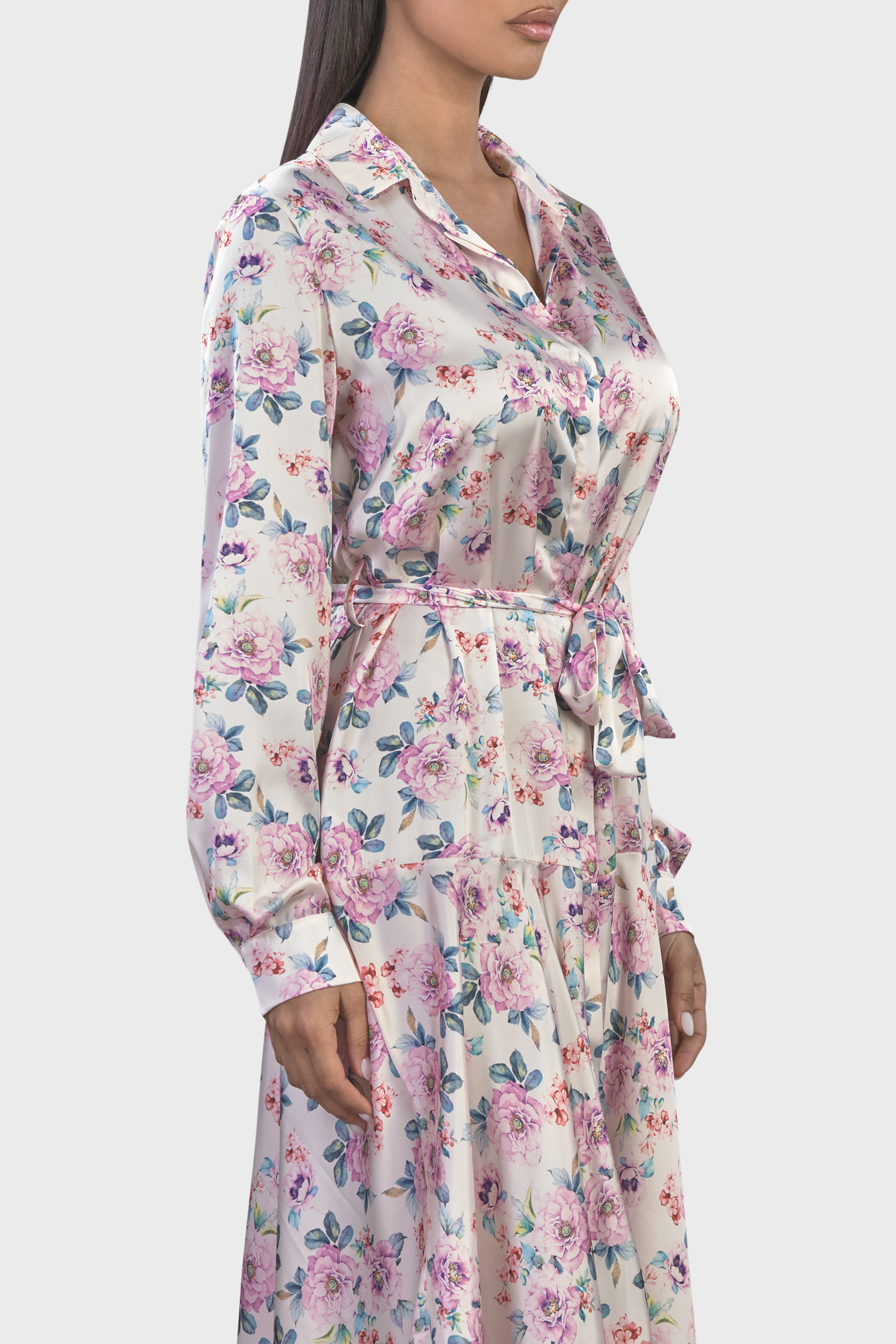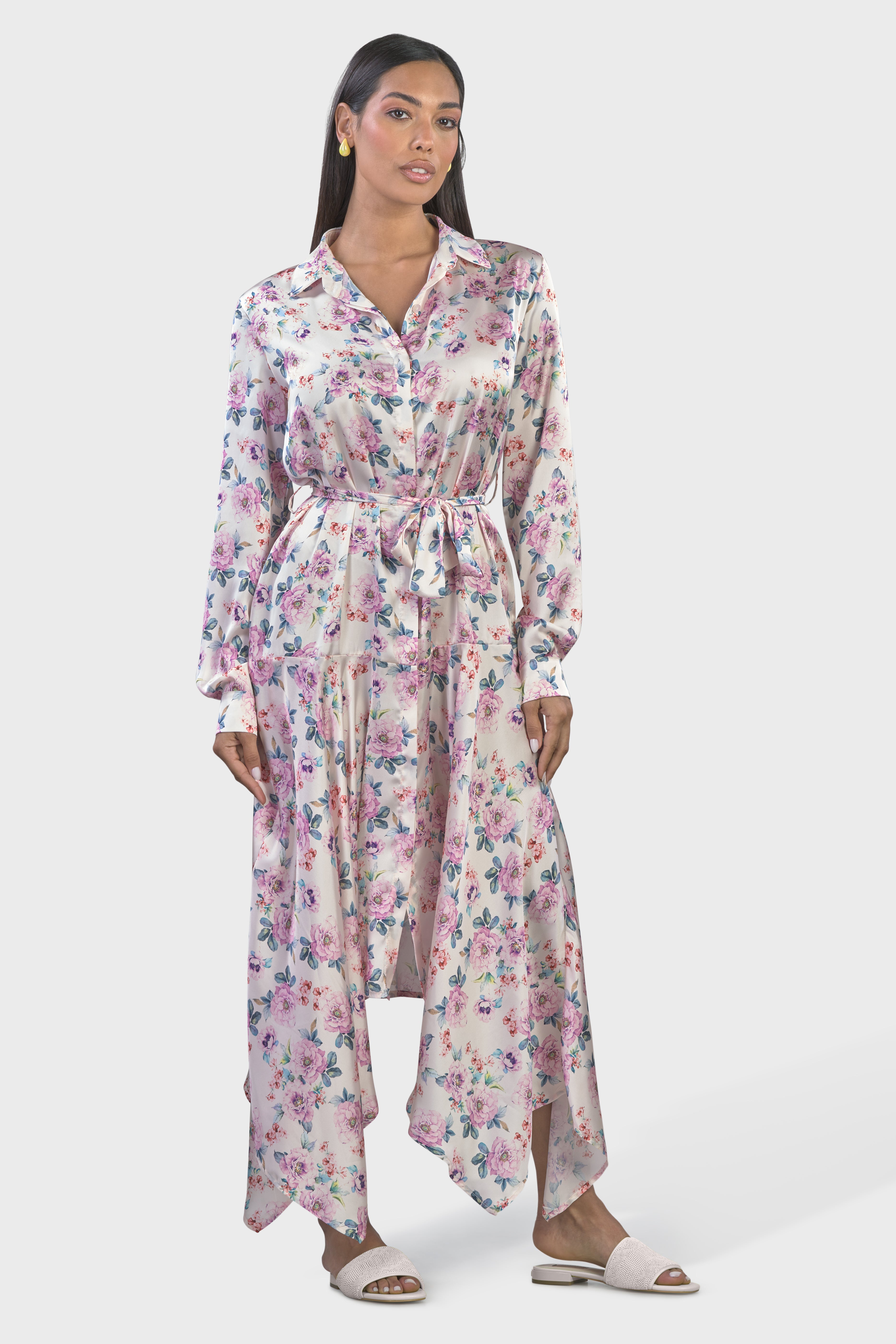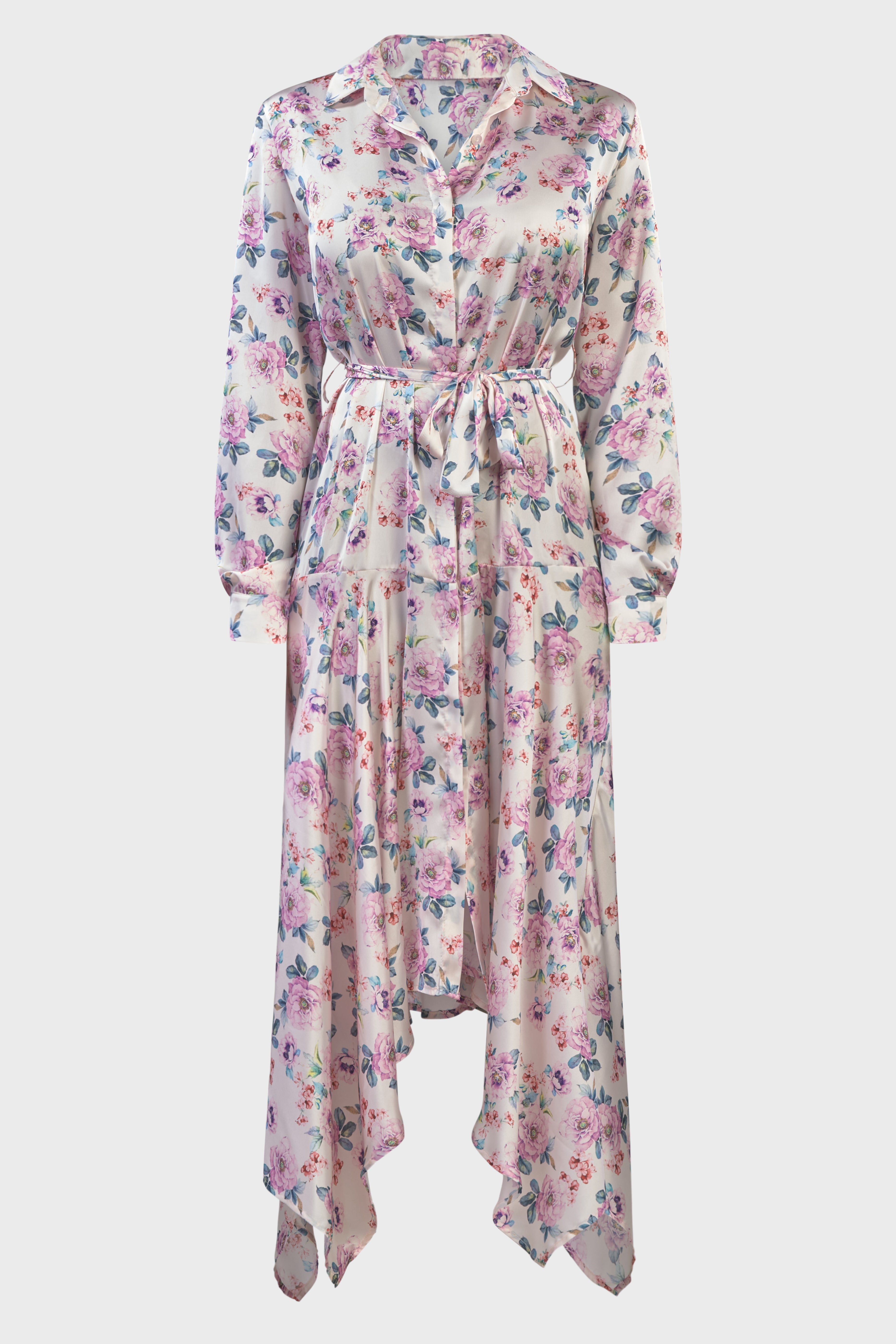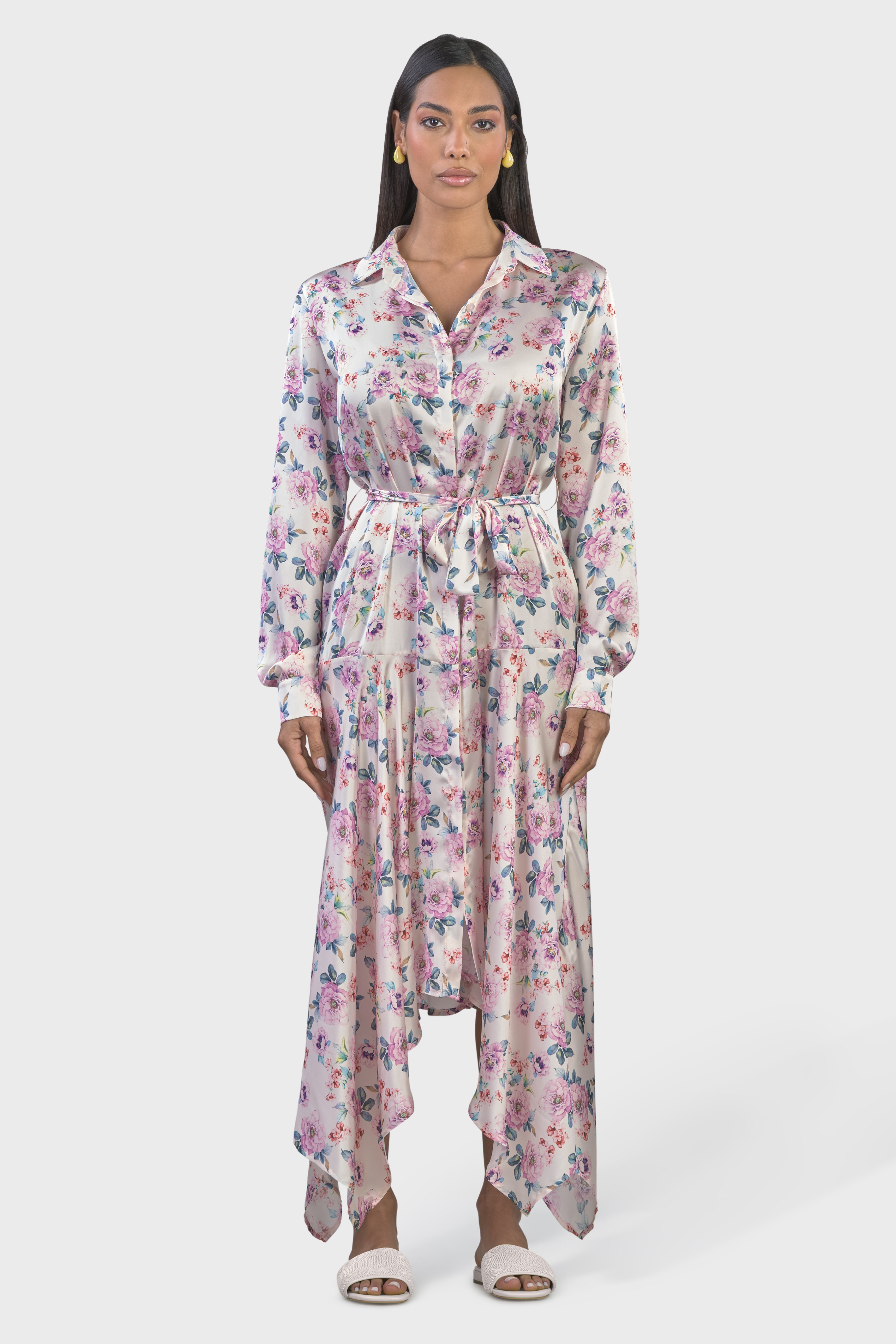 L’ abito chemisier è da sempre tra i preferiti del guardaroba. Le linee ampie di quest‘abito donano una silhouette delineata grazie alla cintura, in grado di personalizzare il fit. Realizzato in raso, tessuto in grado di conferire una consistenza distintiva e resistente. Il modello è caratterizzato dalla romantica stampa floreale, dai toni pastello. Completano il modello il fondo asimmetrico, il classico colletto a punta, l’abbottonatura nascosta e le maniche lunghe con polsi a camicia, chiusi con bottone. Pensato per combattere i cambiamenti climatici con stile, è perfetto da indossare in ufficio o di sera con paio di décolleté o un paio di sandali.