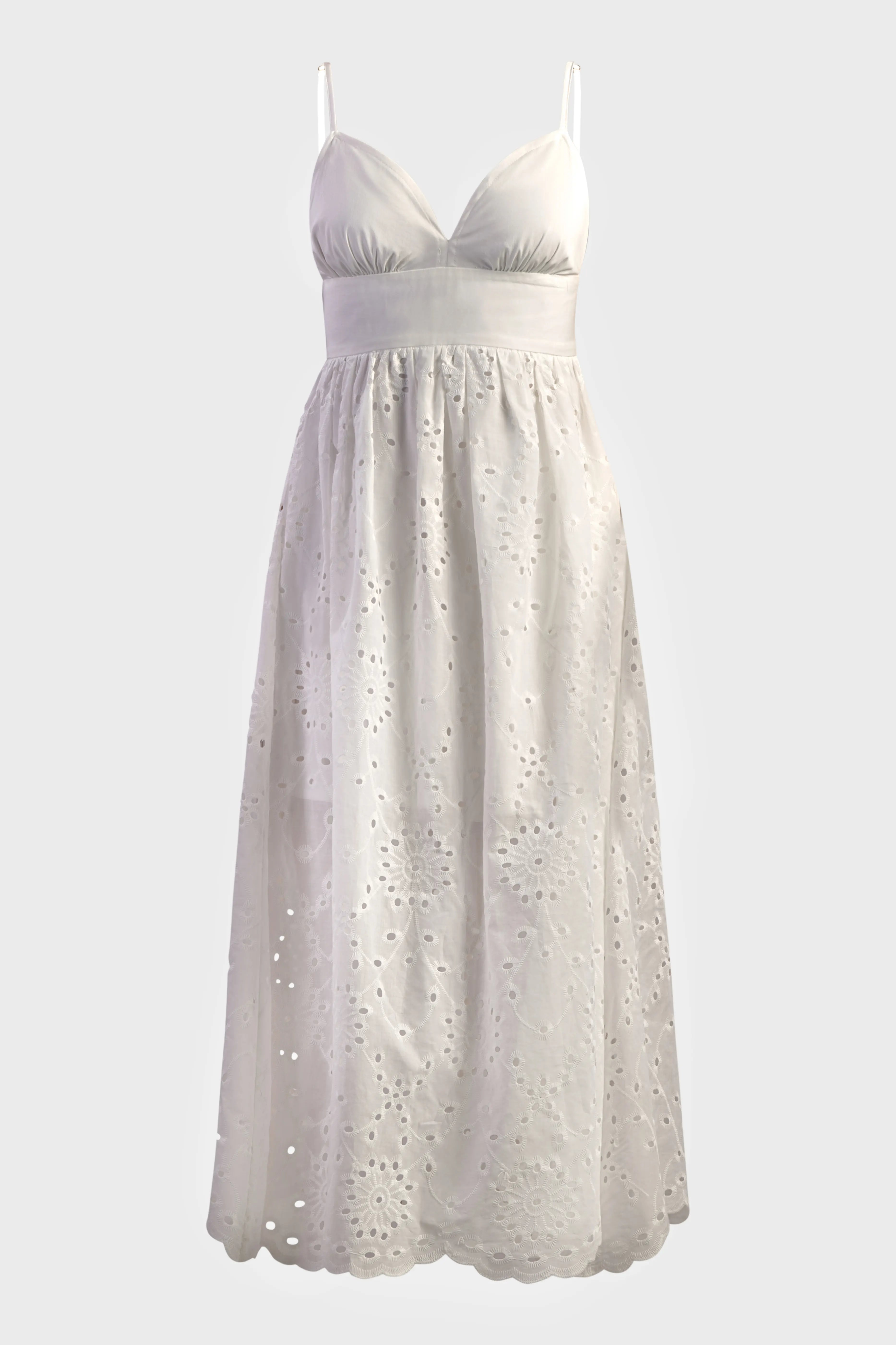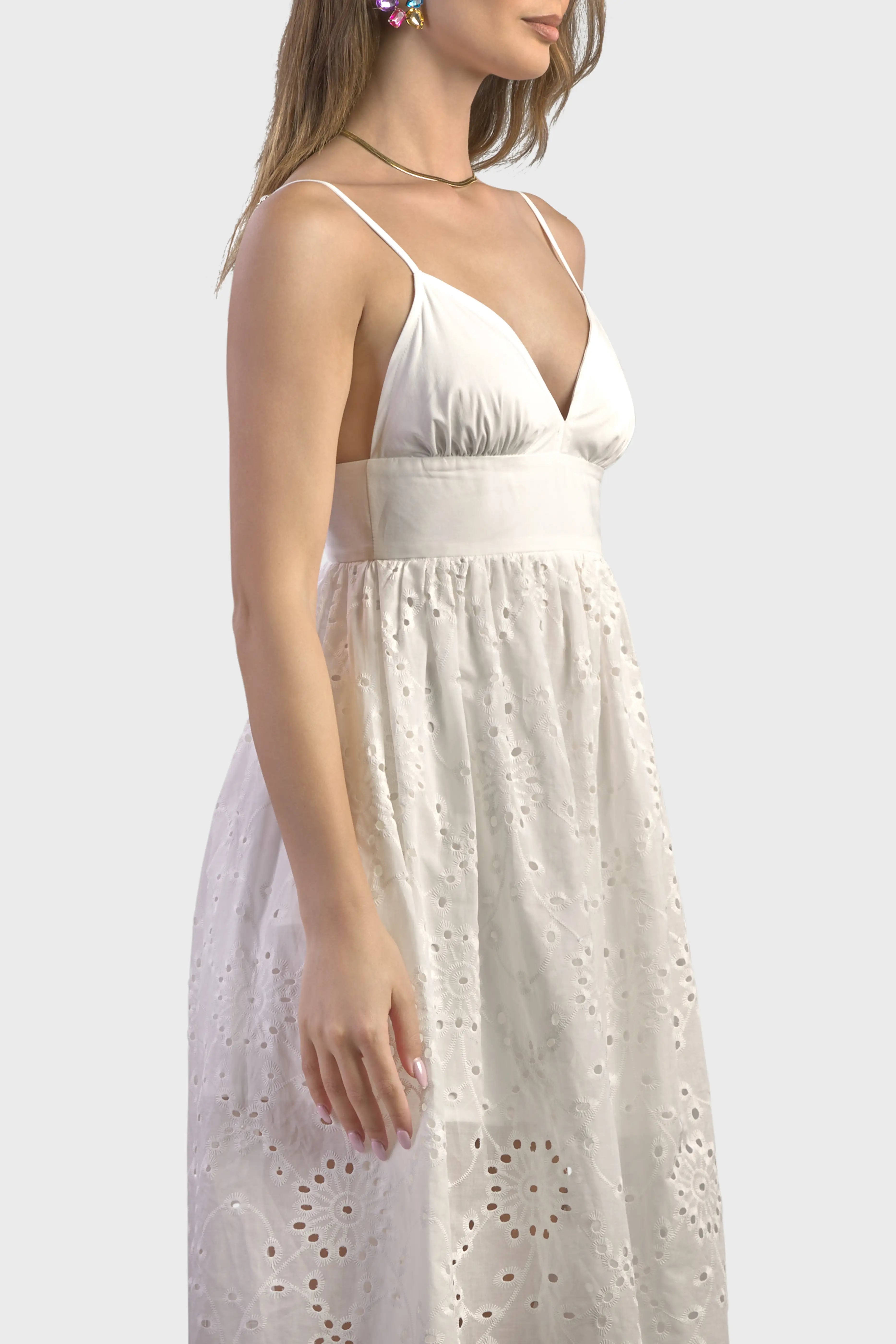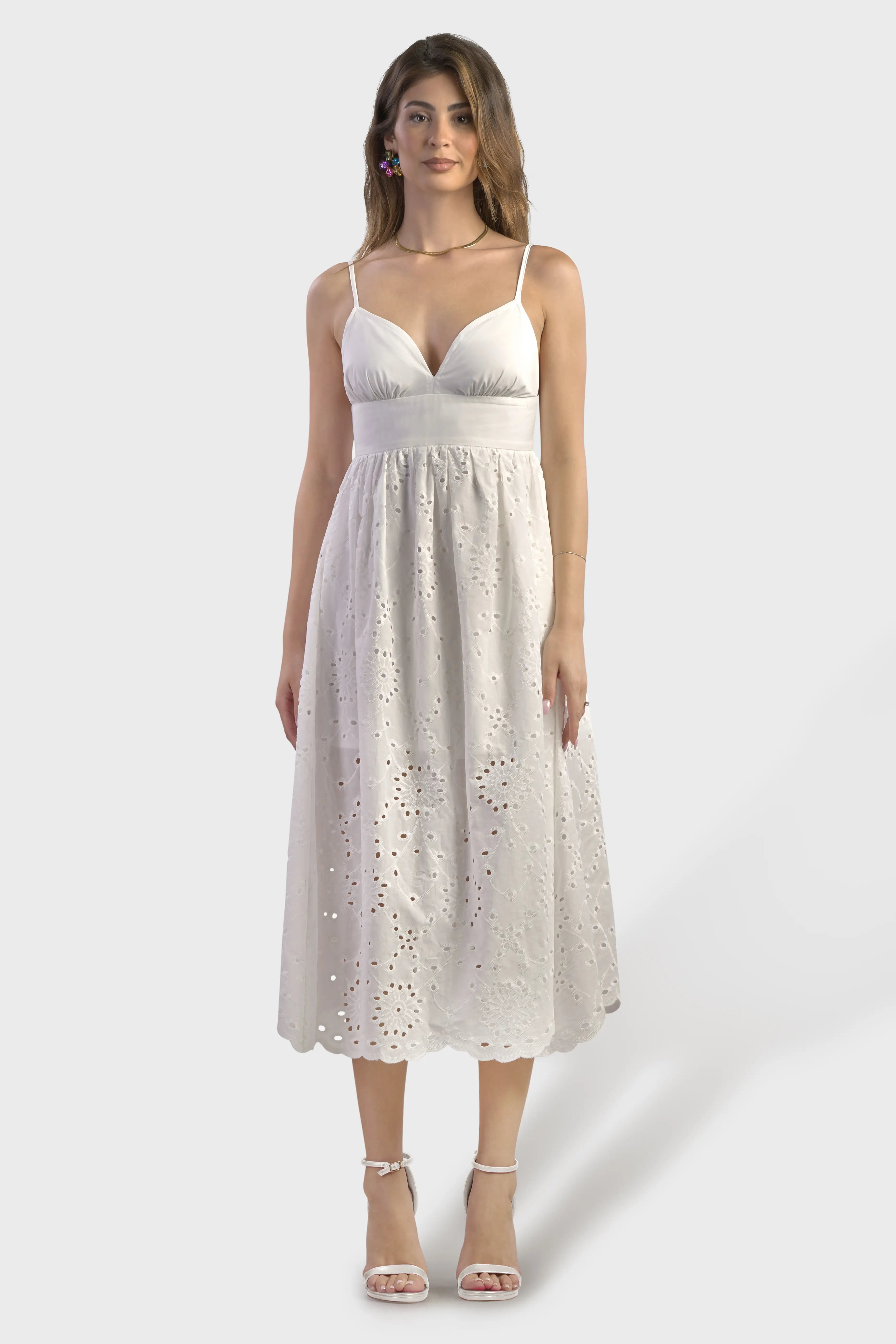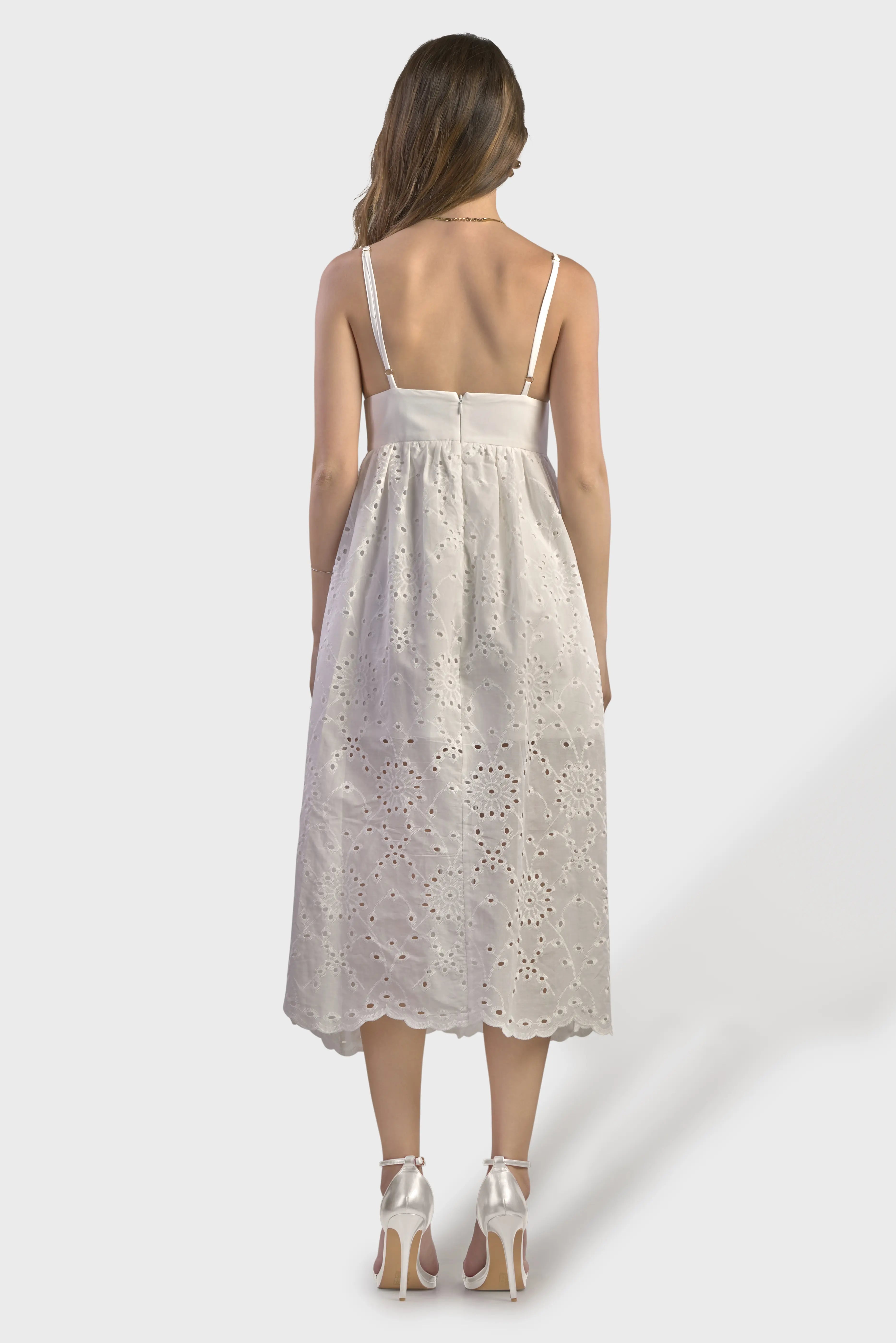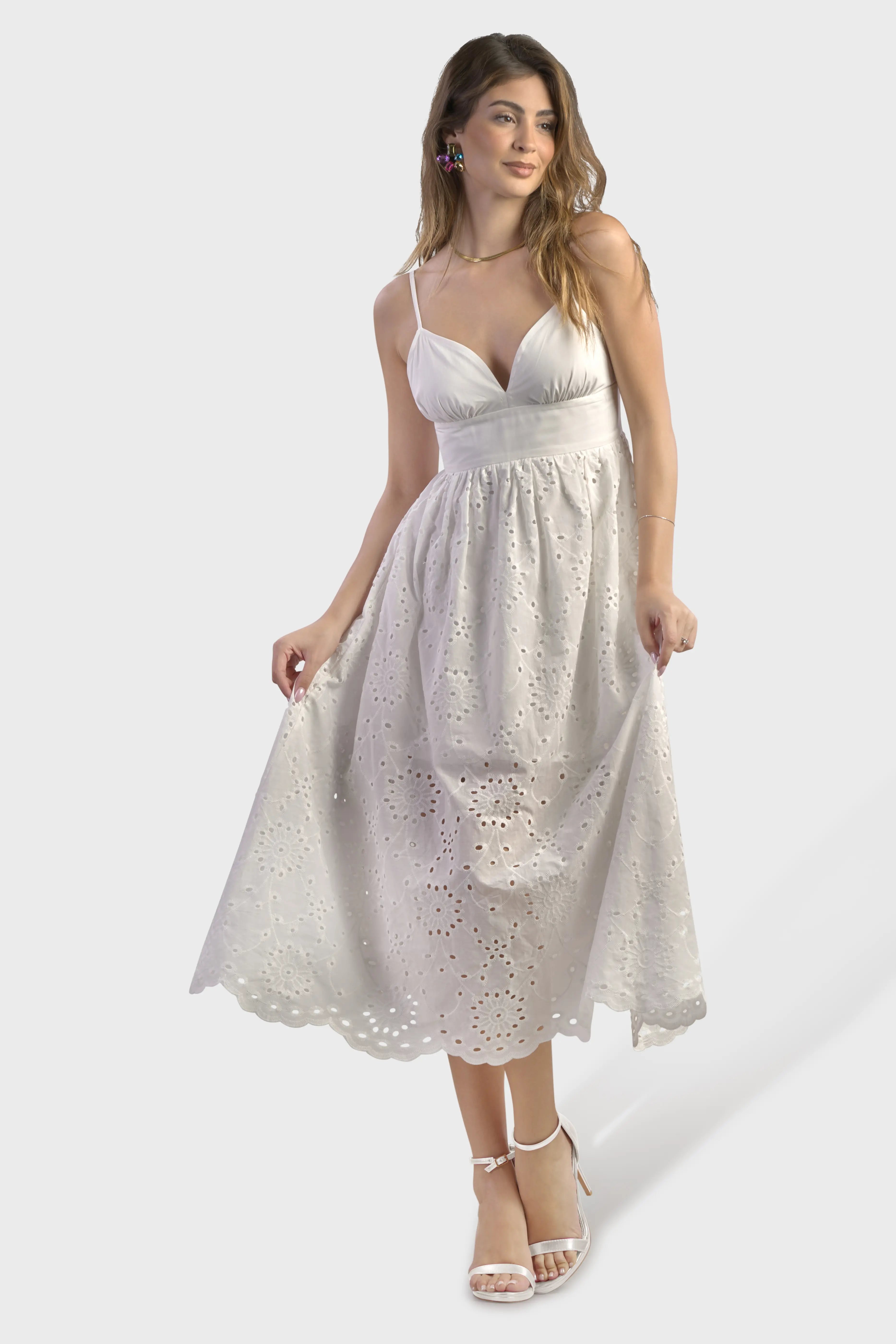 La linea svasata di questo abito dallo stile romantico accentua la silhouette con grazia. Realizzato in pizzo sangallo, tessuto fresco dal design traforato caratterizzato da ricami floreali vuoti e pieni in rilievo, conferendo,così una particolare eleganza al capo. Il modello con spalline sottili è caratterizzato dal corpetto in popeline unito, con scollo a V e un ampia fascia in vita. A completare l’abito è la gonna midi, che rappresenta eleganza e sensualità. Dettagliato dalle tasche inserite nel fianco. Perfetto da indossare per occasioni speciali in cui si desidera lasciare un’impressione indelebile.