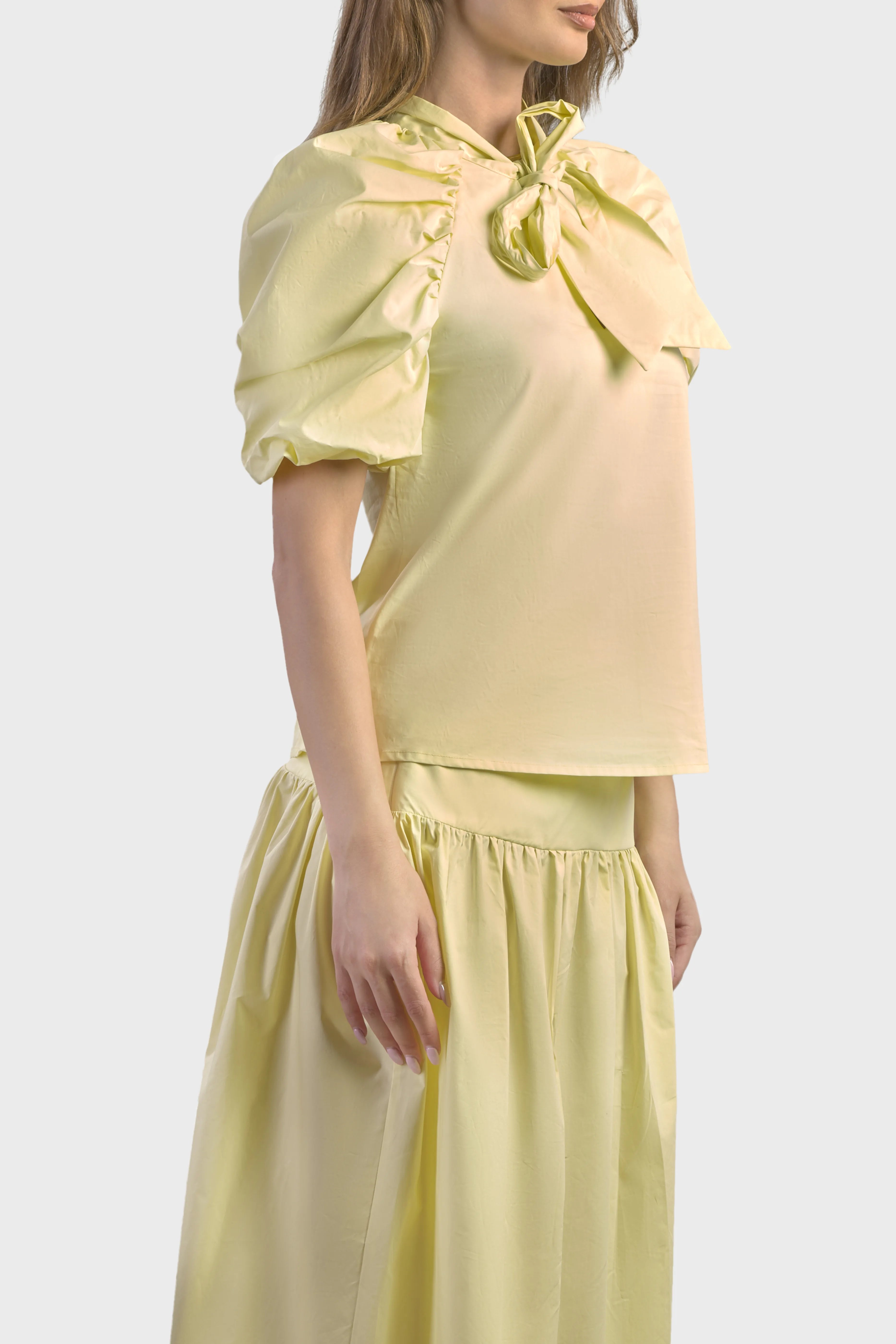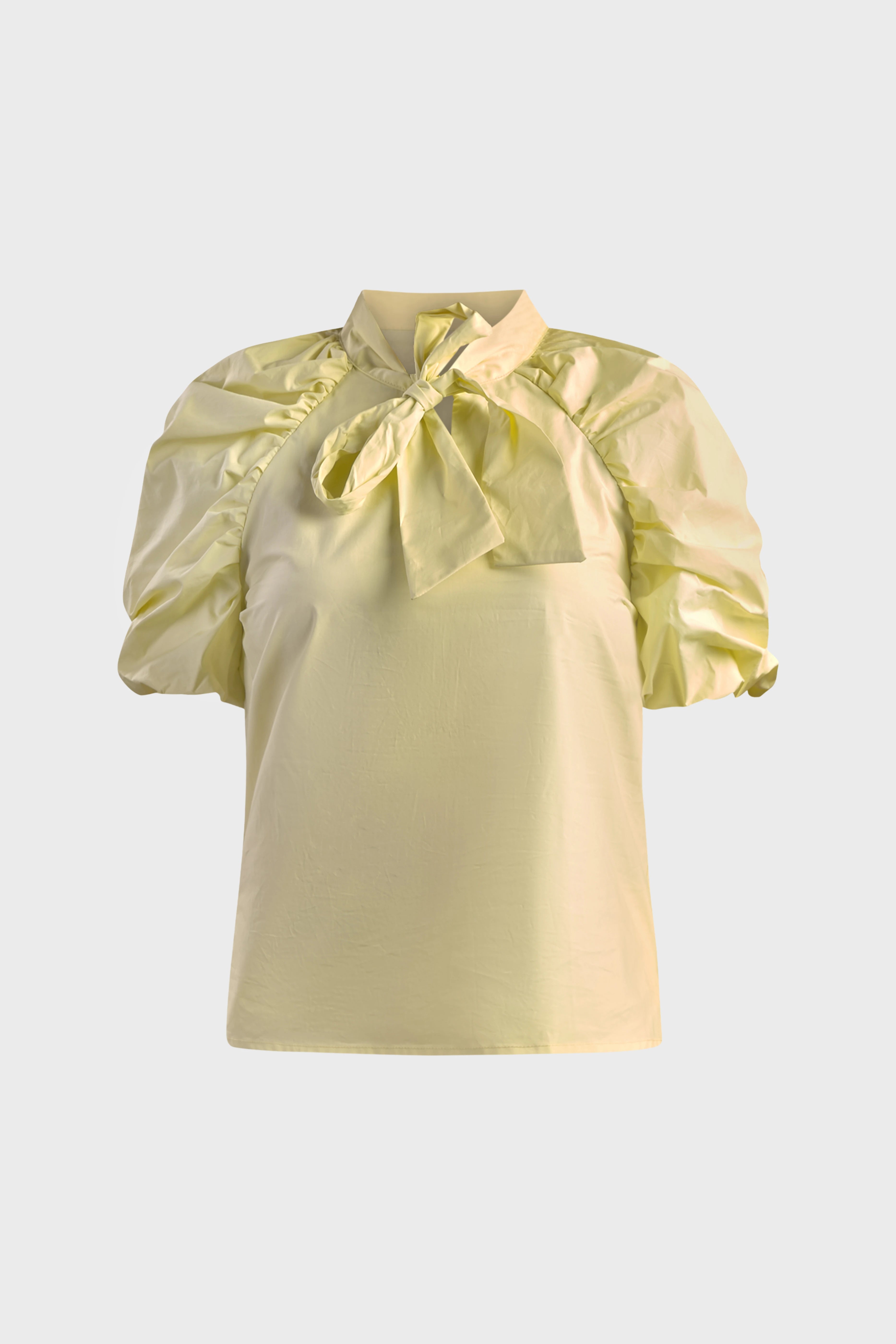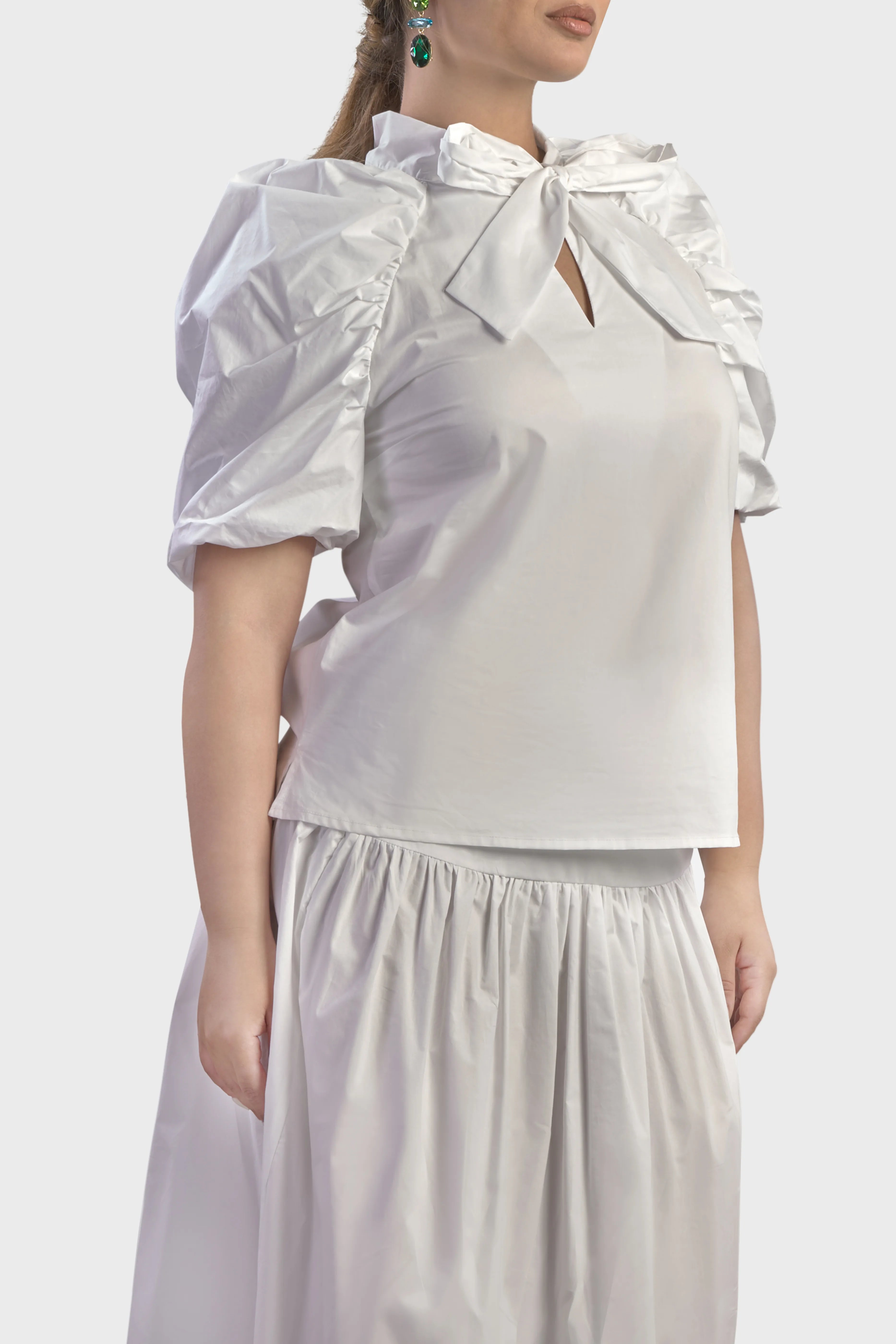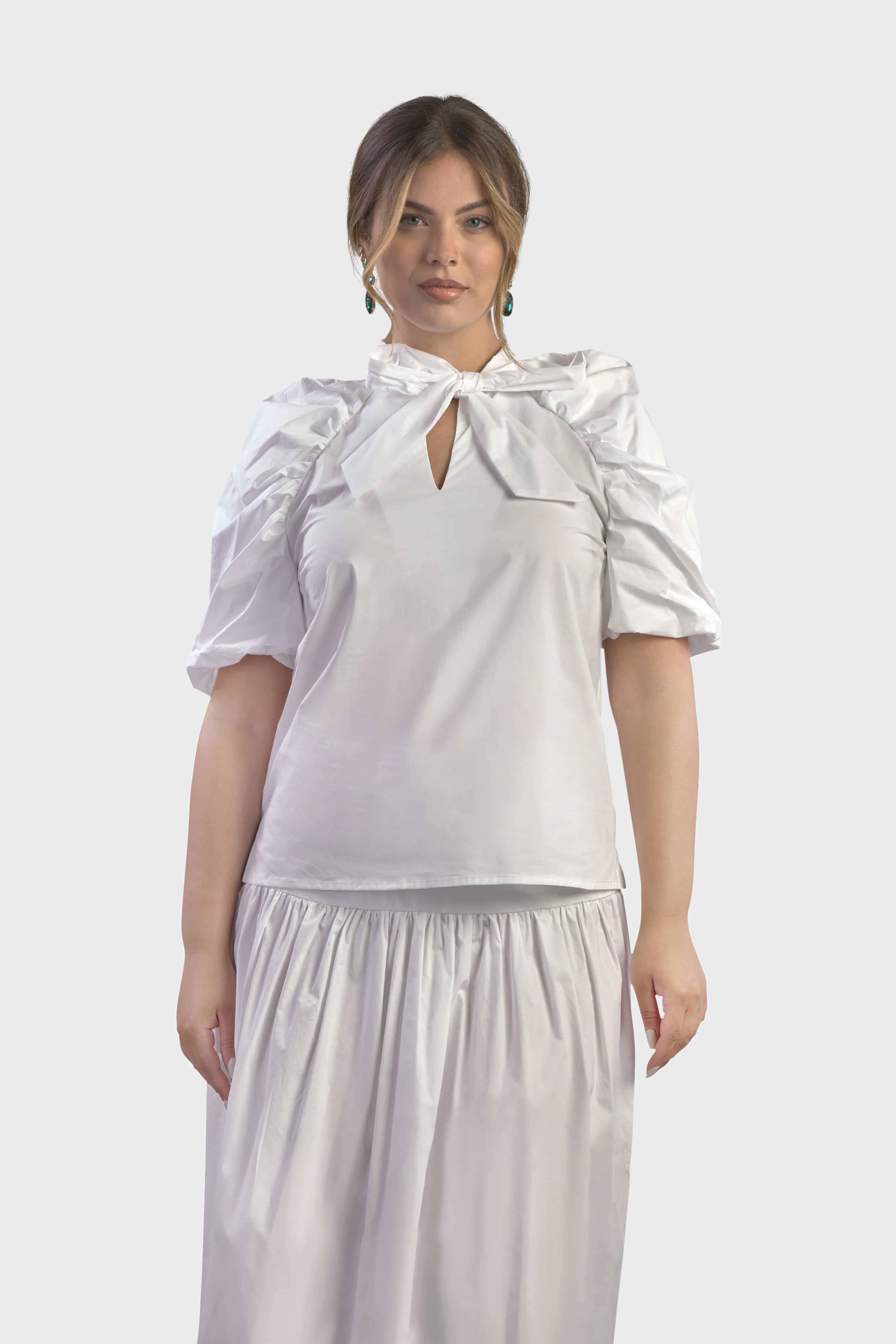 Il design voluminoso di questa blusa ridefinisce la moderna idea di eleganza del brand. Realizzata in popeline di cotone, tessuto fresco e leggero. È caratterizzata da un raffinato colletto con fiocco e dalla manica a sbuffo dal taglio raglan. Il dettaglio accurato dell’arriccio percorre le cuciture della manica creando un motivo sofisticato e sempre di tendenza. Ideale da indossare in vista della stagione estiva per una cerimonia o anche per completare un look da giorno insieme alla gonna della collezione.