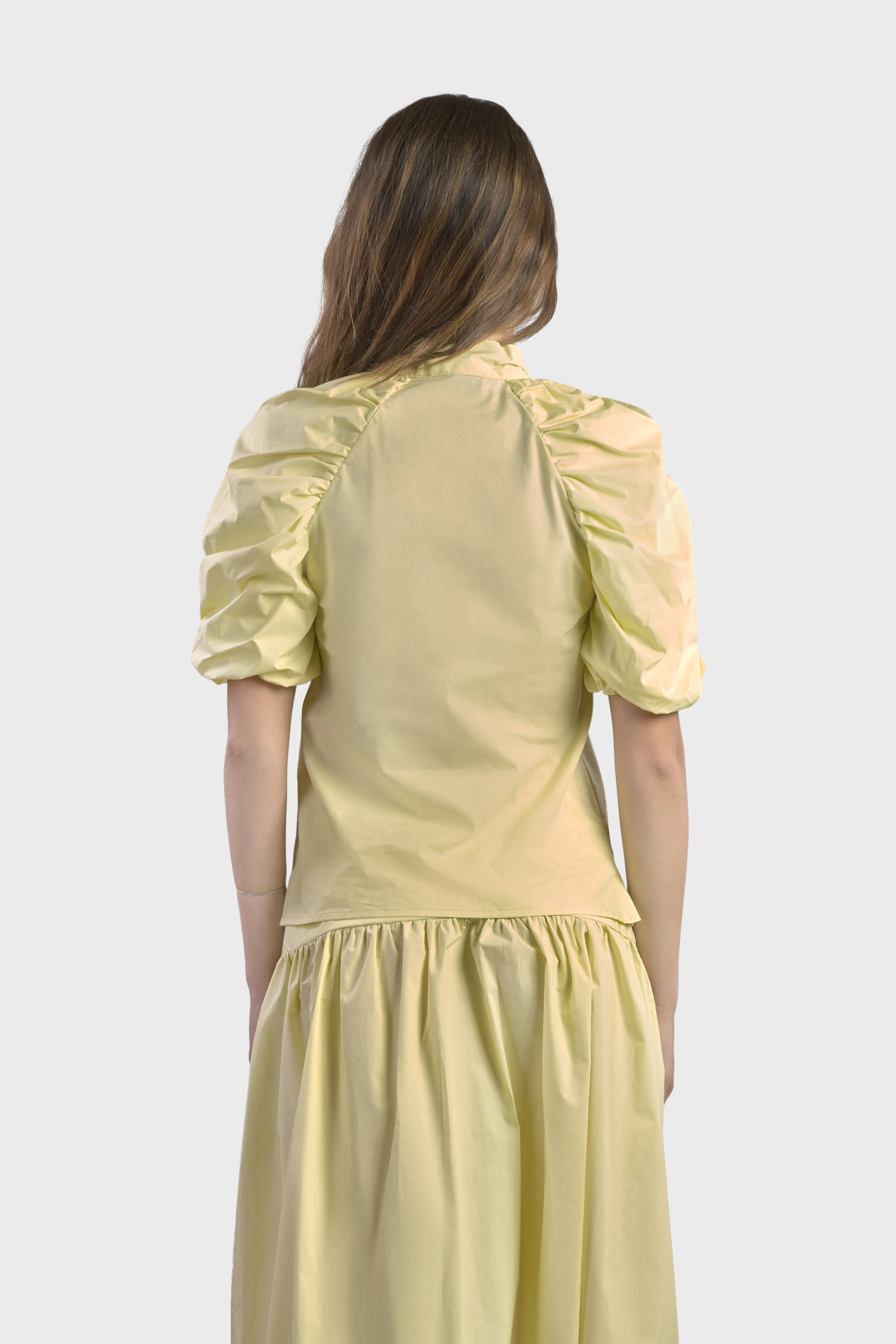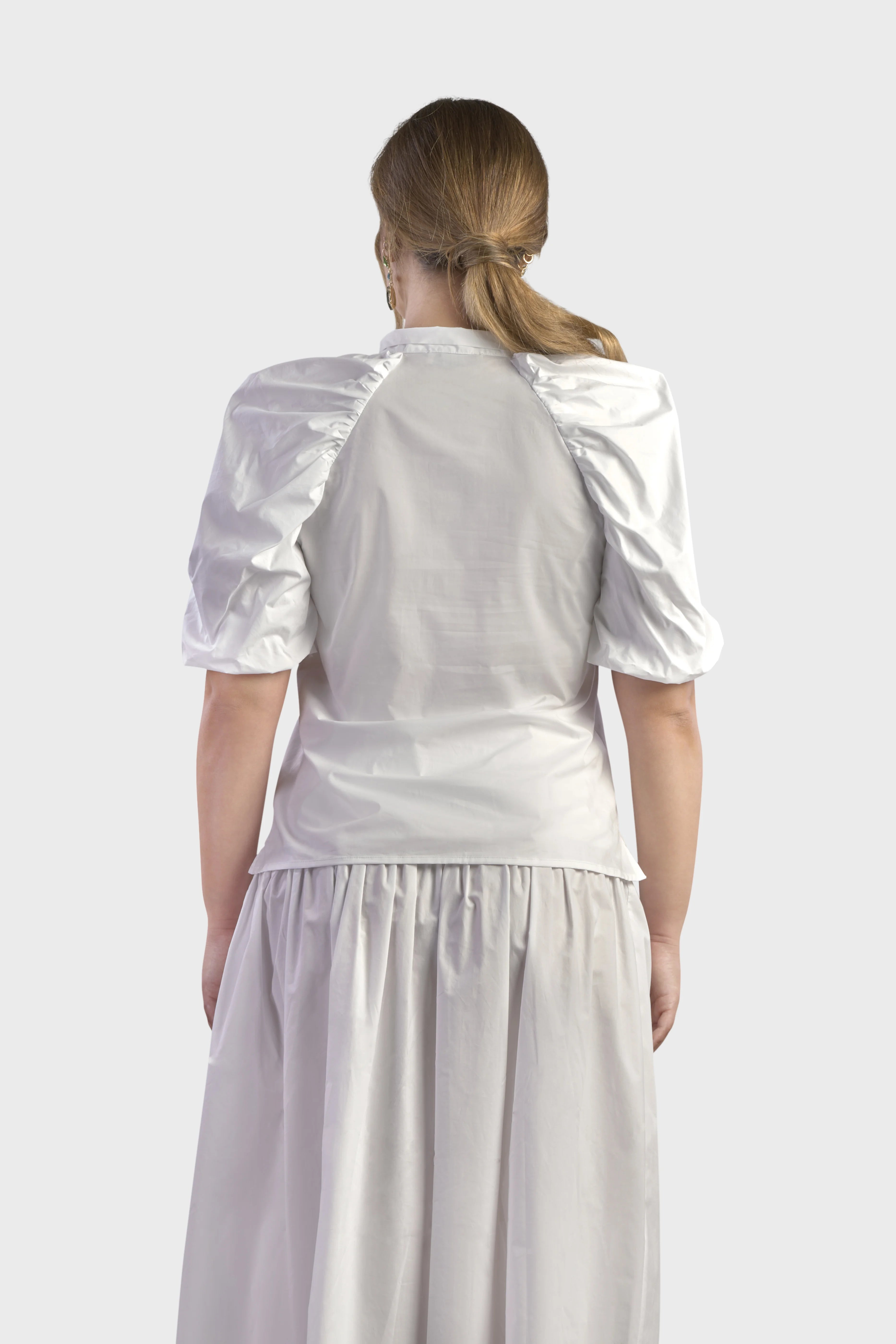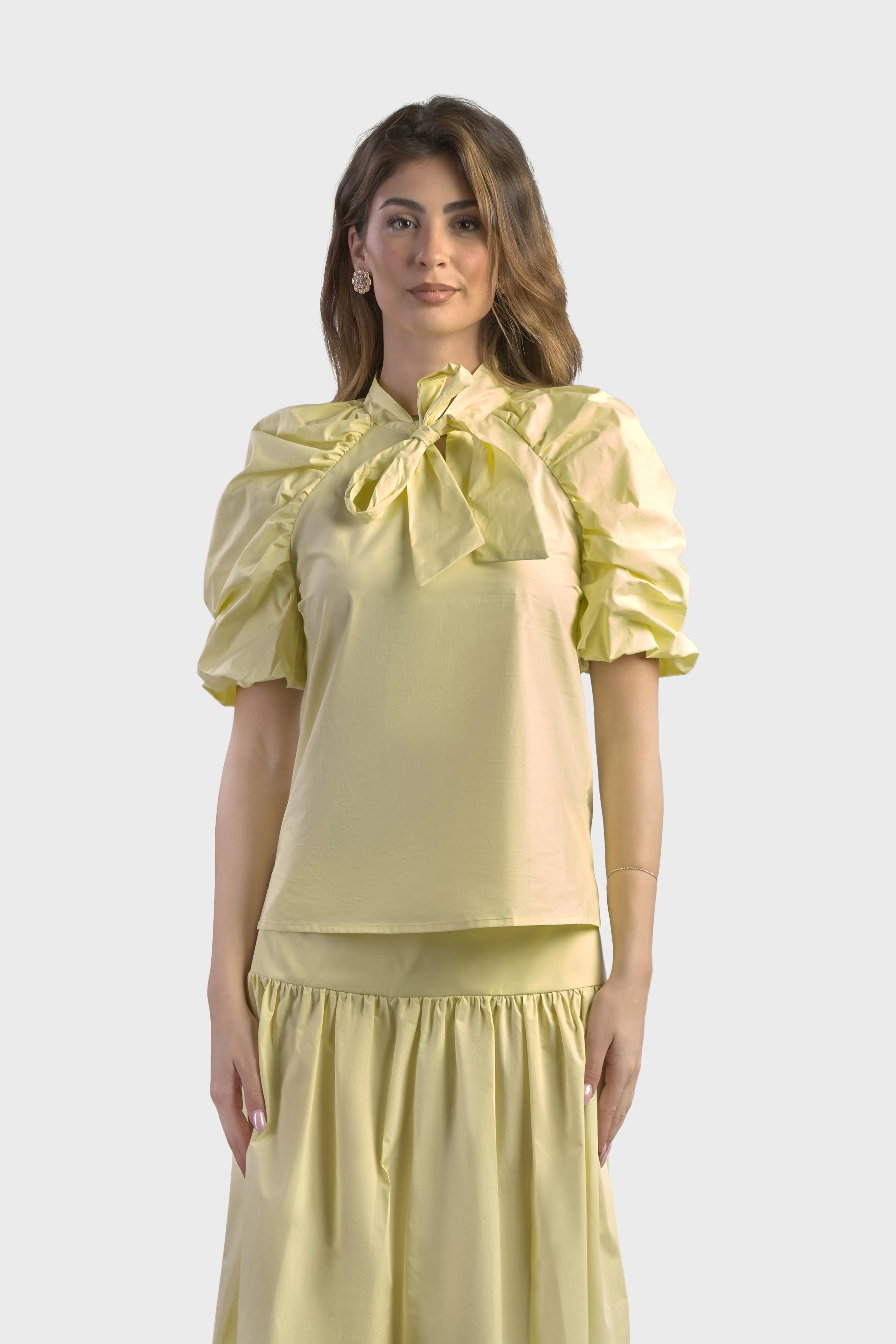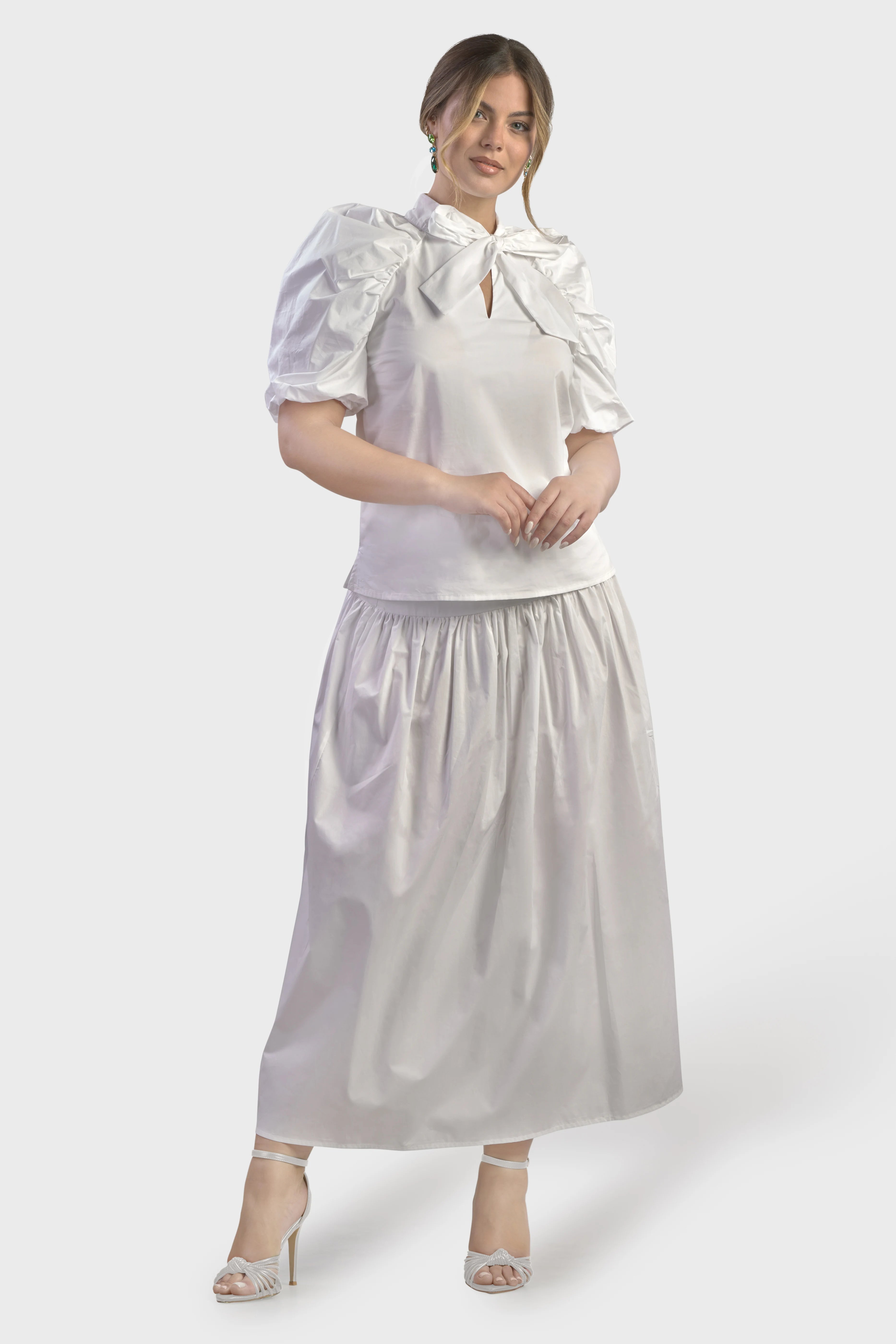Il design voluminoso di questa blusa ridefinisce la moderna idea di eleganza del brand. Realizzata in popeline di cotone, tessuto fresco e leggero. È caratterizzata da un raffinato colletto con fiocco e dalla manica a sbuffo dal taglio raglan. Il dettaglio accurato dell’arriccio percorre le cuciture della manica creando un motivo sofisticato e sempre di tendenza. Ideale da indossare in vista della stagione estiva per una cerimonia o anche per completare un look da giorno insieme alla gonna della collezione.