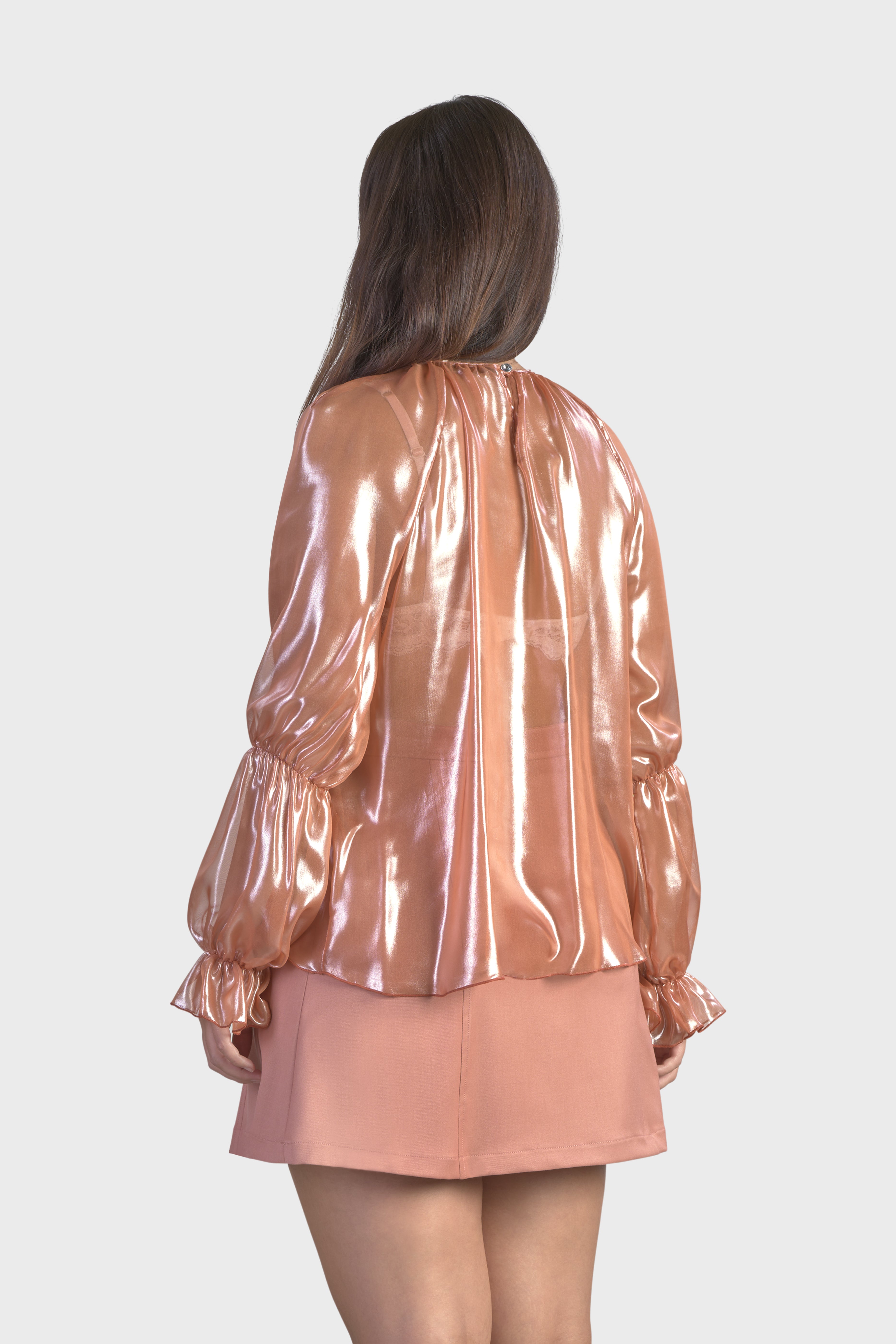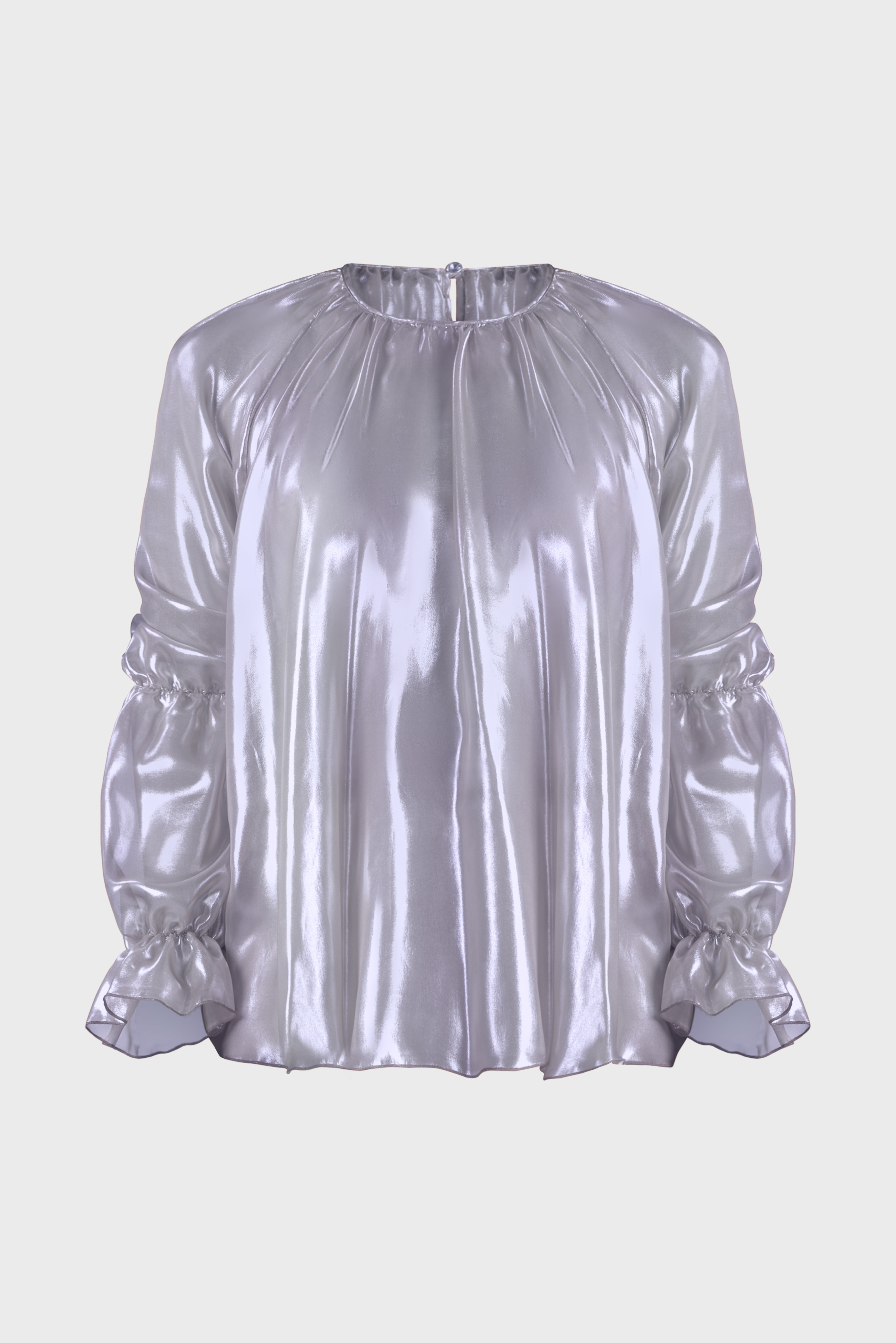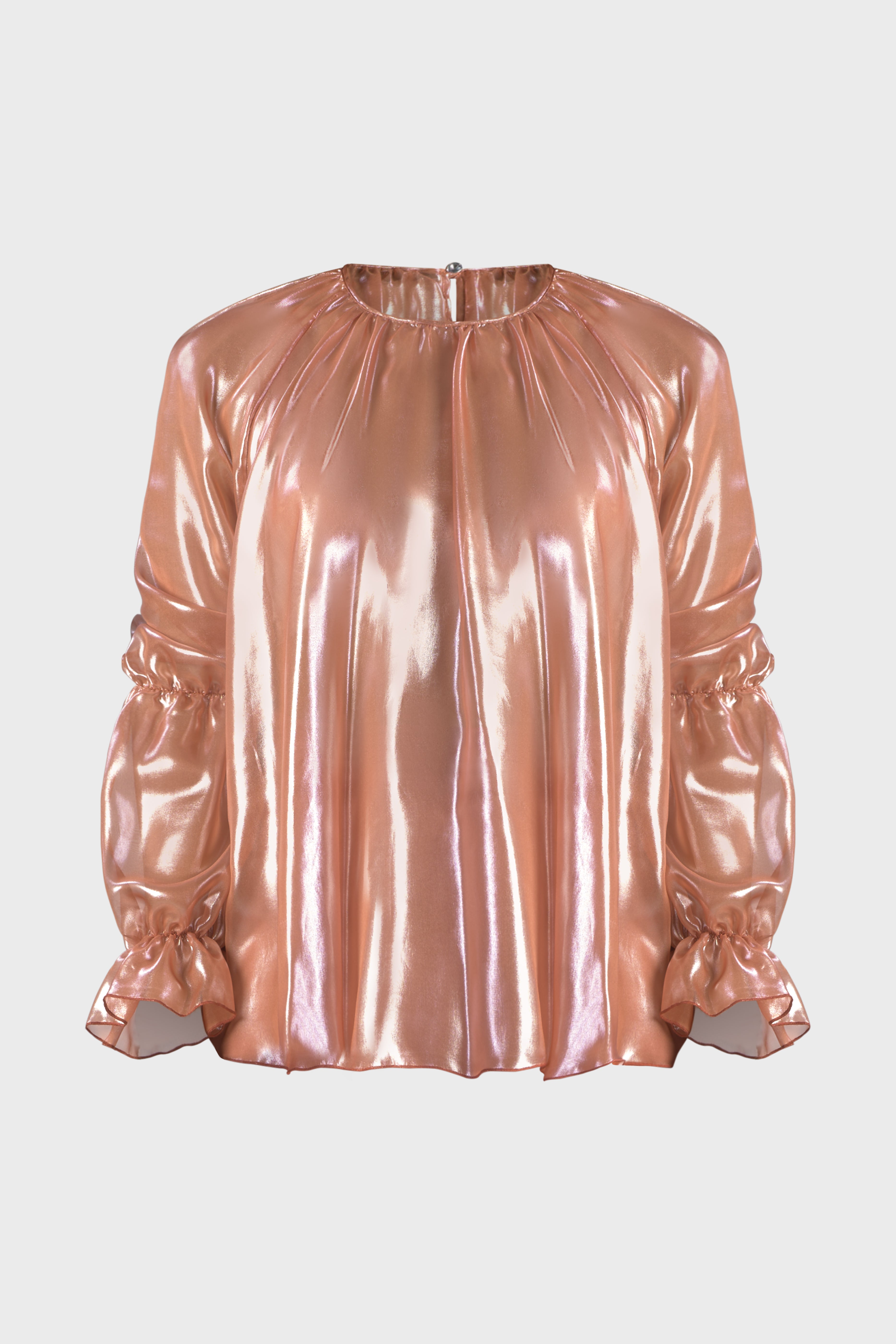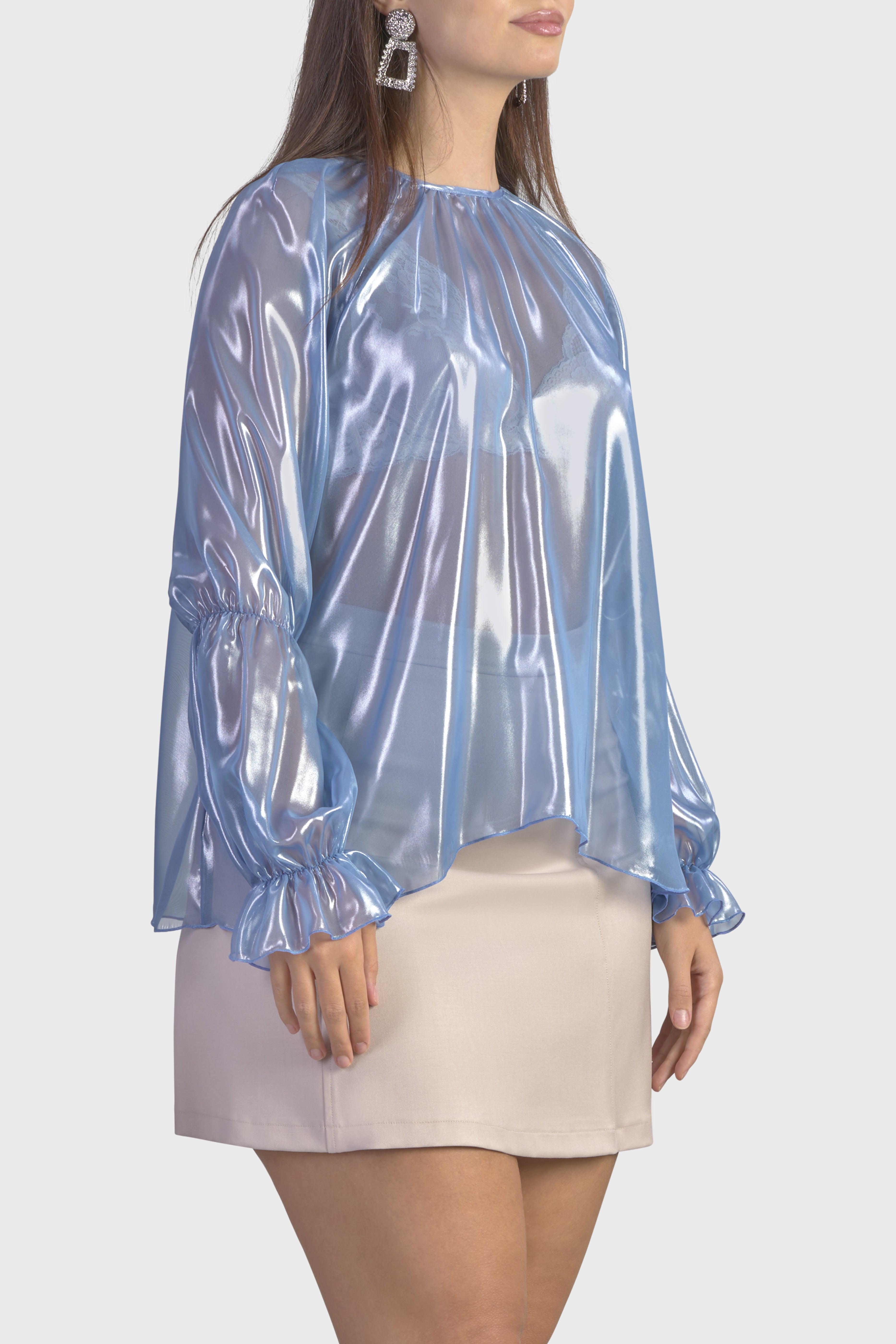 Questa blusa con maniche raglan è un capolavoro di eleganza moderna. Realizzata in luminoso chiffon cangiante, tessuto trasparente molto leggero e al contempo resistente. Il modello girocollo, dalla vestibilità morbida scende fino ai fianchi abbracciando la silhouette con grazia. Le maniche lunghe sono caratterizzate dall’effetto a sbuffo dovuto dall’elastico che percorre il gomito e il polso. Infine, sul retro il capo è dettagliato dalla chiusura a goccia con bottone rivestito nello stesso tessuto. Questa blusa è un tocco raffinato sopra un paio di jeans o estremamente elegante se indossata con un paio di pantaloni neri o una longuette.