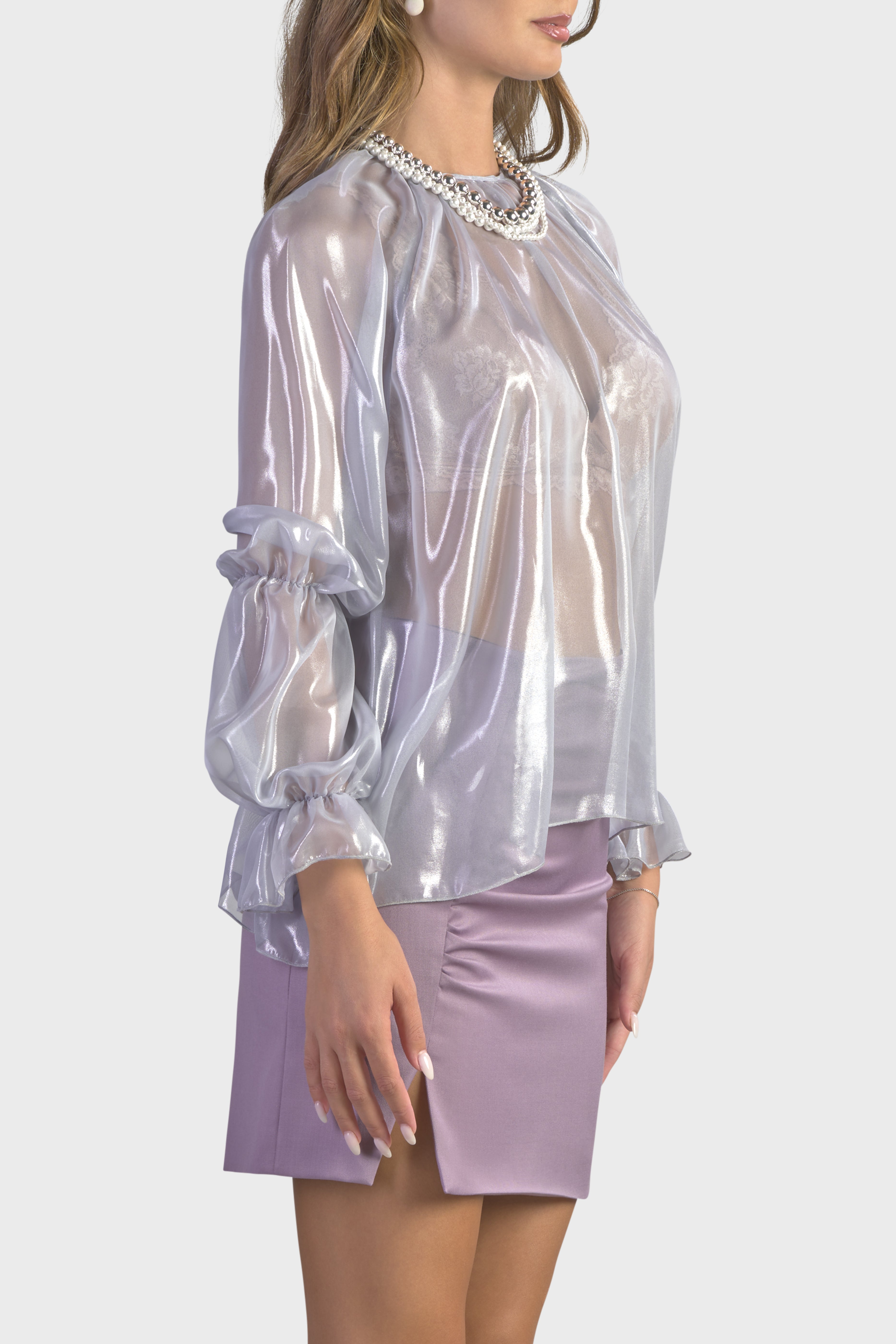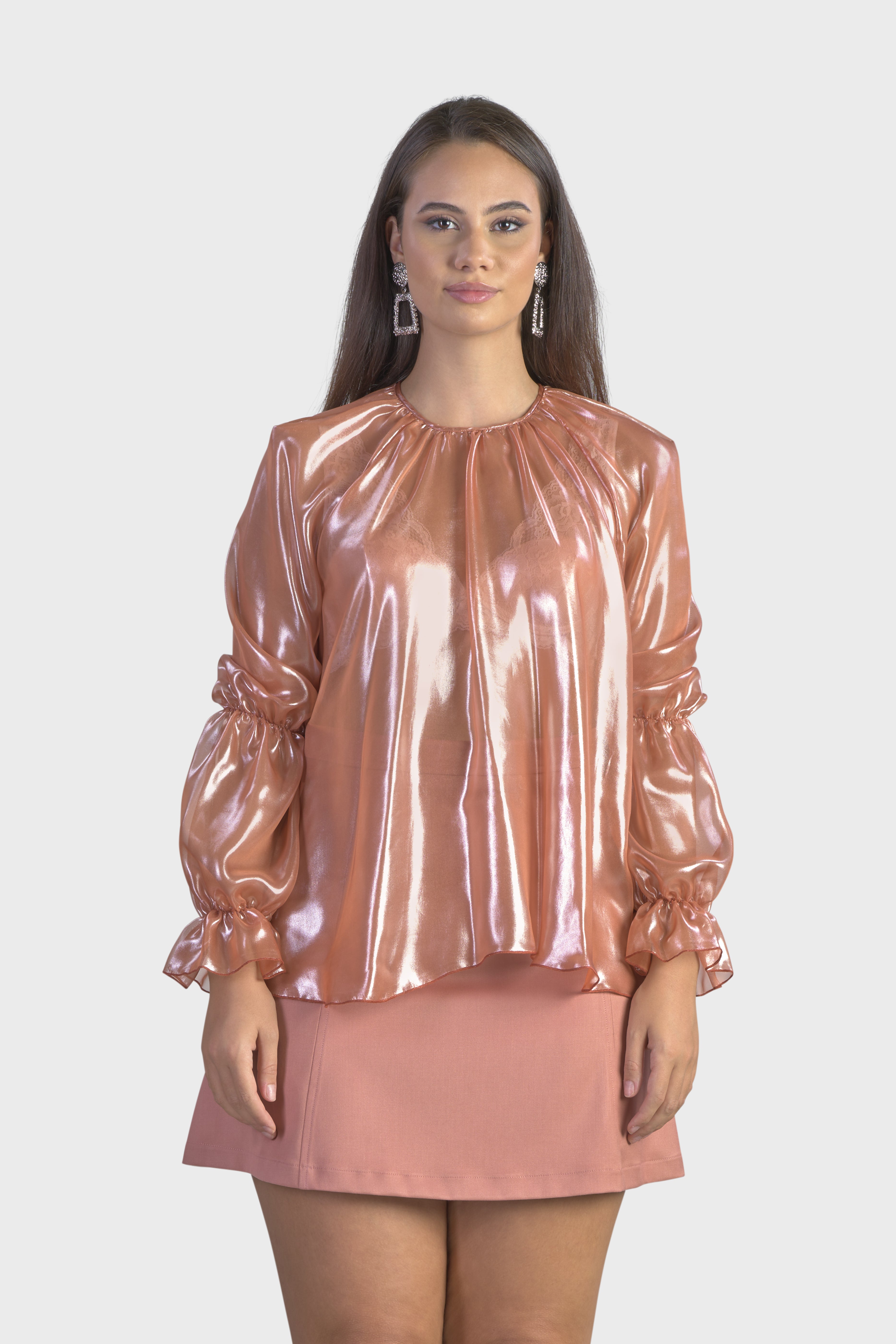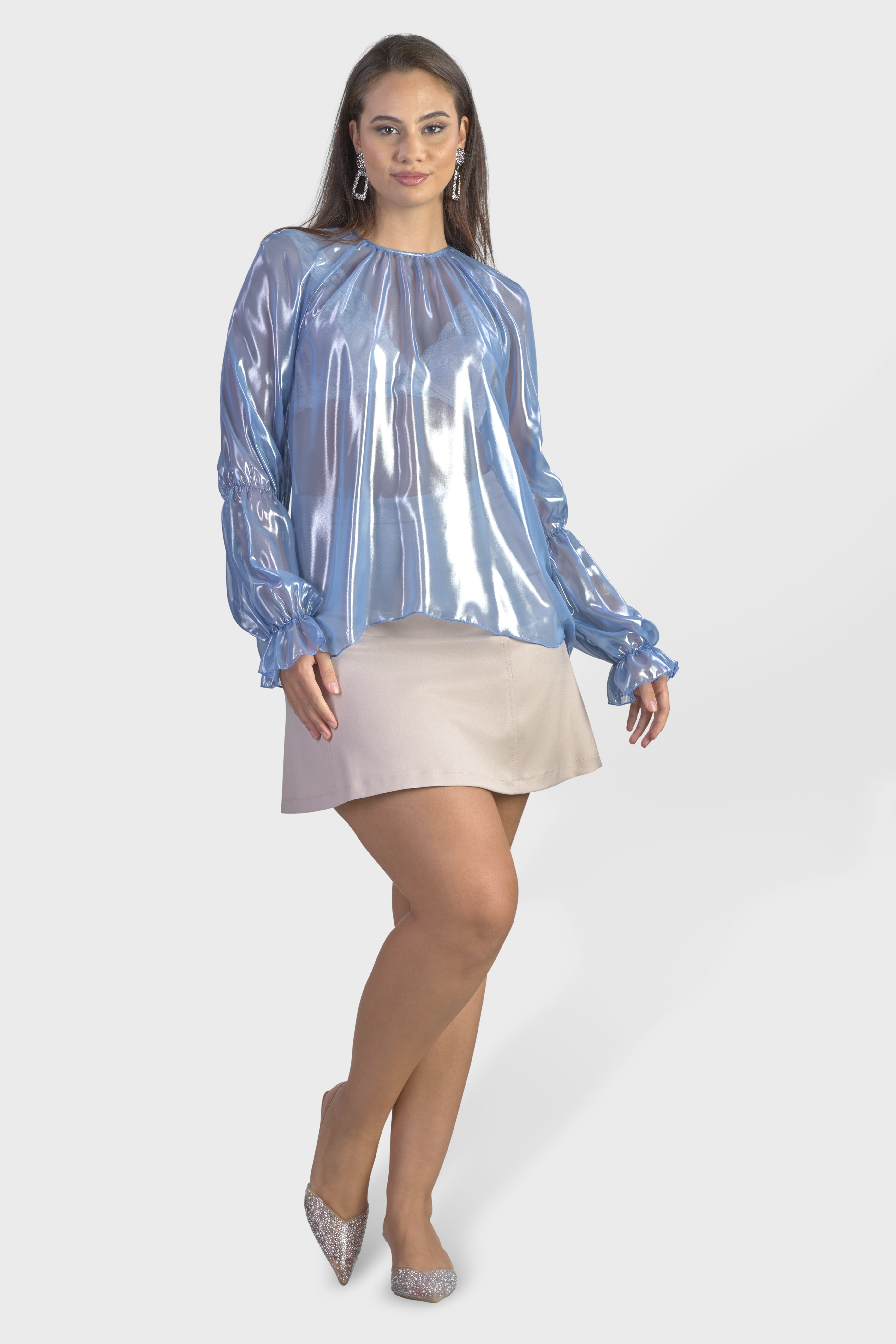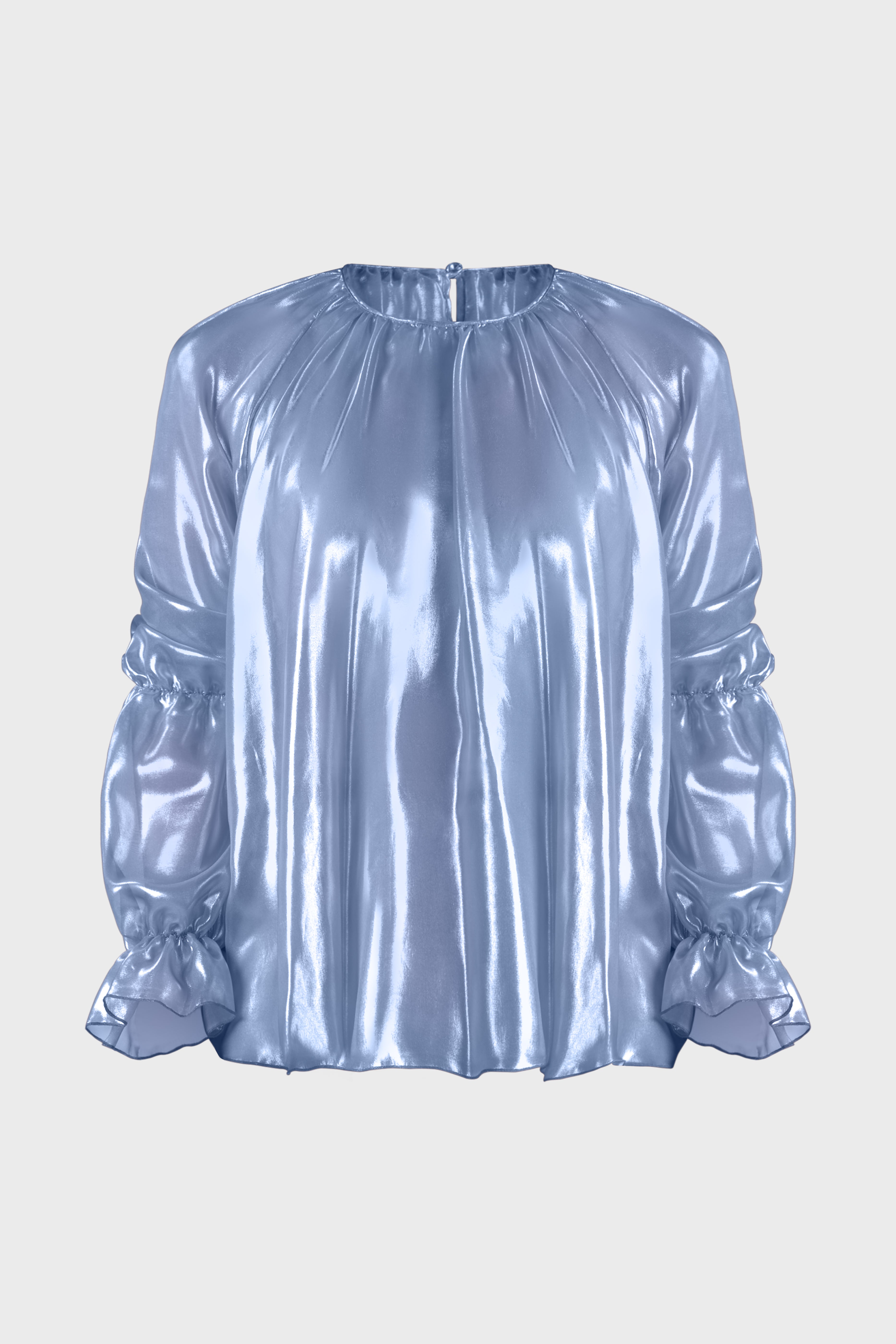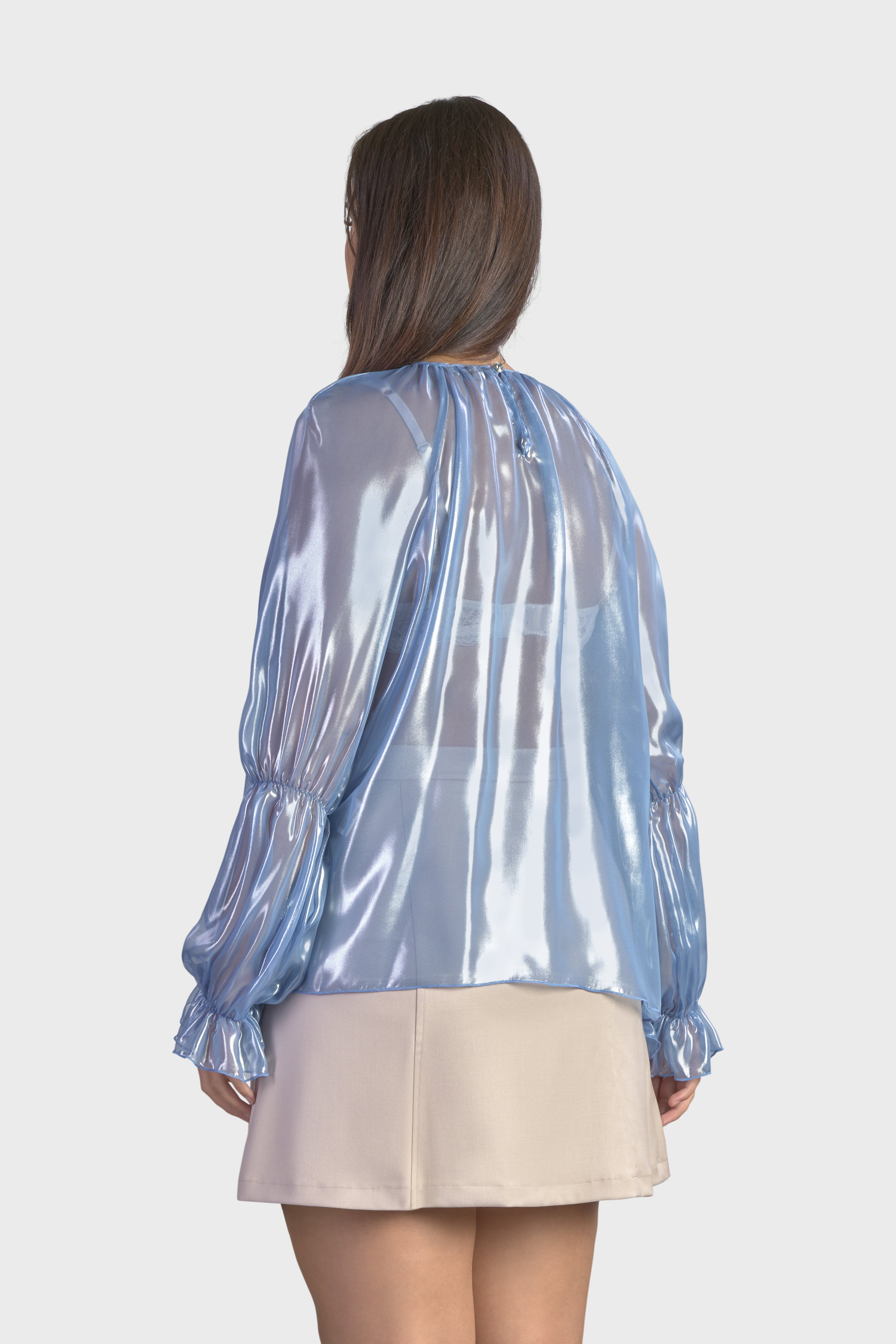 Questa blusa con maniche raglan è un capolavoro di eleganza moderna. Realizzata in luminoso chiffon cangiante, tessuto trasparente molto leggero e al contempo resistente. Il modello girocollo, dalla vestibilità morbida scende fino ai fianchi abbracciando la silhouette con grazia. Le maniche lunghe sono caratterizzate dall’effetto a sbuffo dovuto dall’elastico che percorre il gomito e il polso. Infine, sul retro il capo è dettagliato dalla chiusura a goccia con bottone rivestito nello stesso tessuto. Questa blusa è un tocco raffinato sopra un paio di jeans o estremamente elegante se indossata con un paio di pantaloni neri o una longuette.