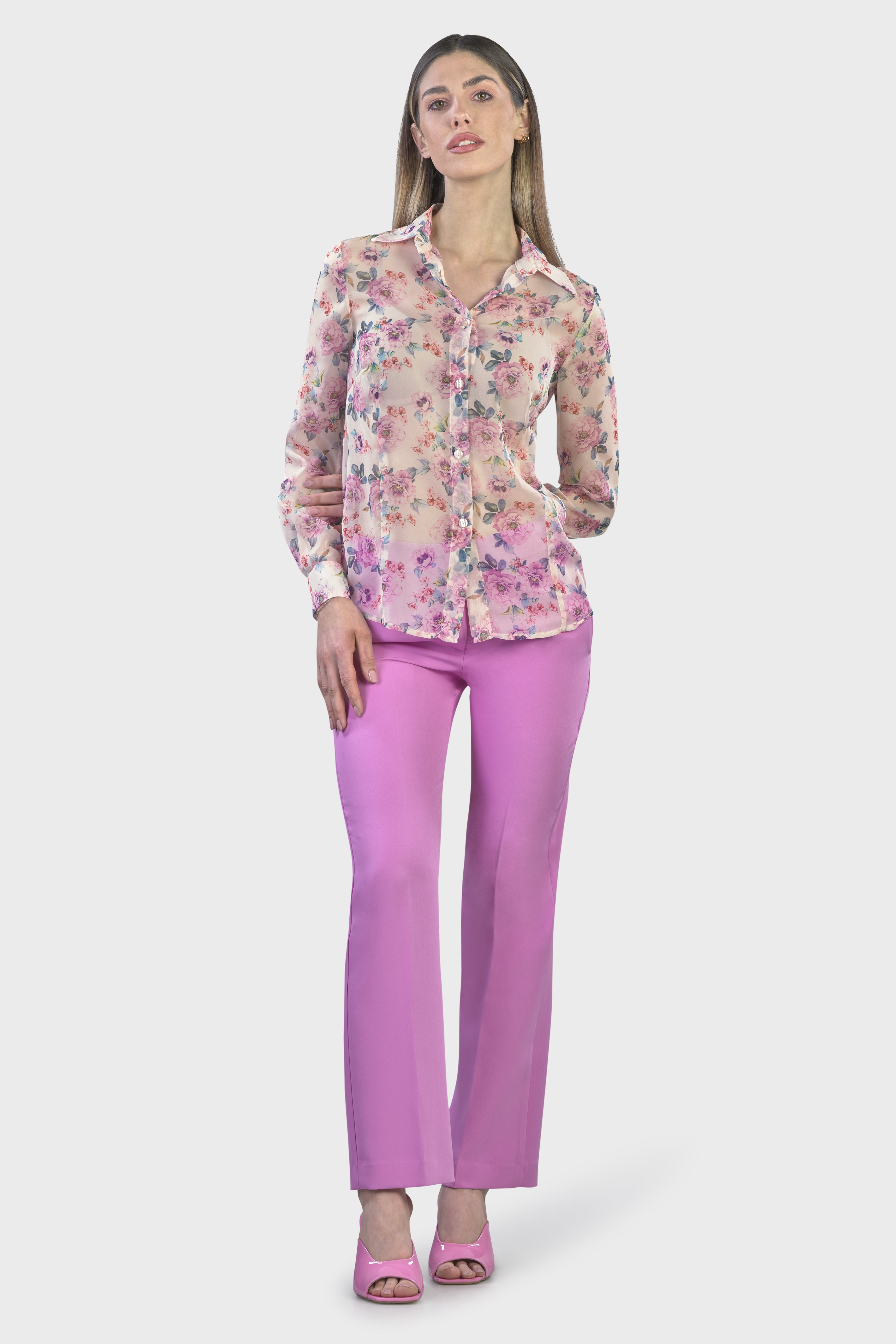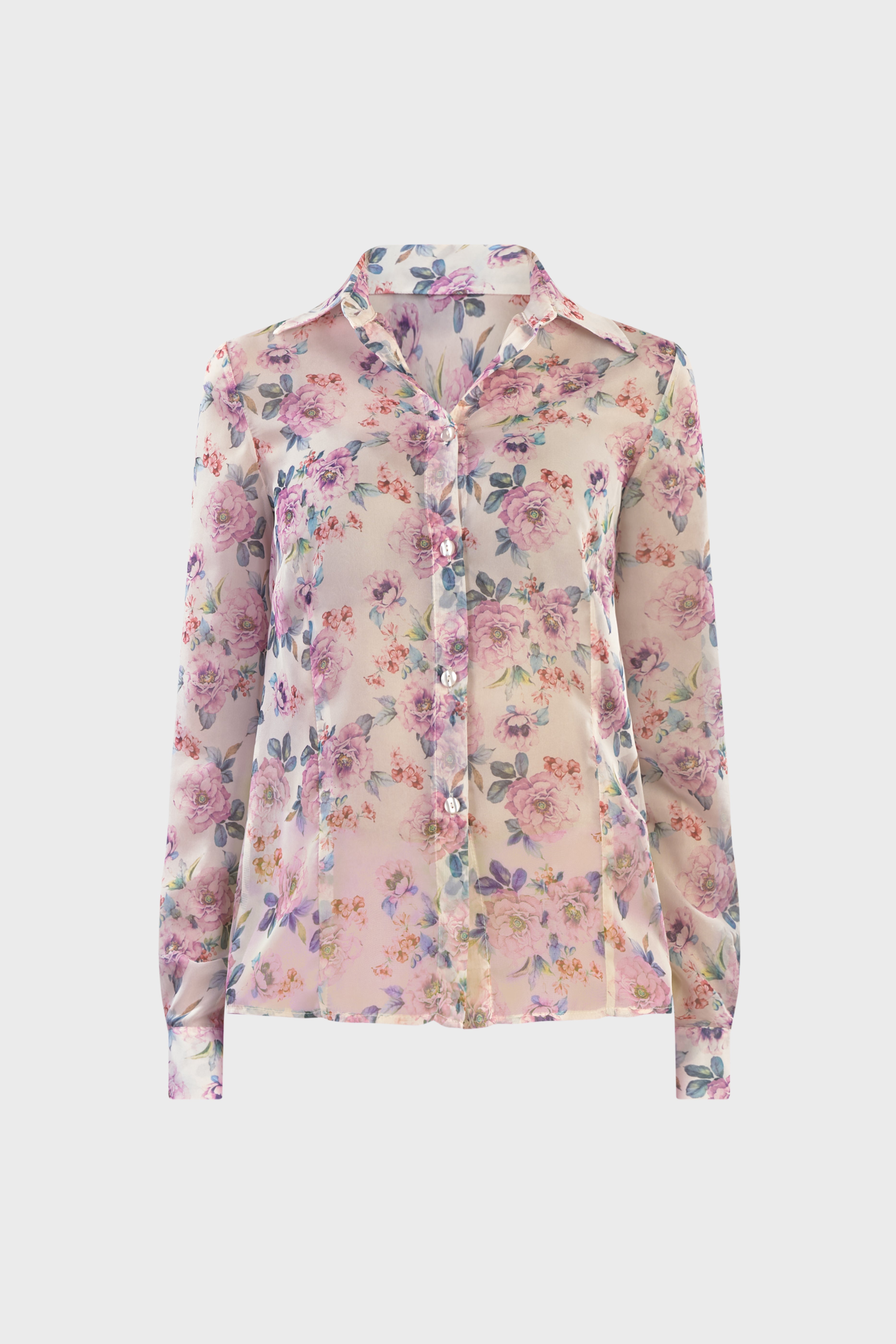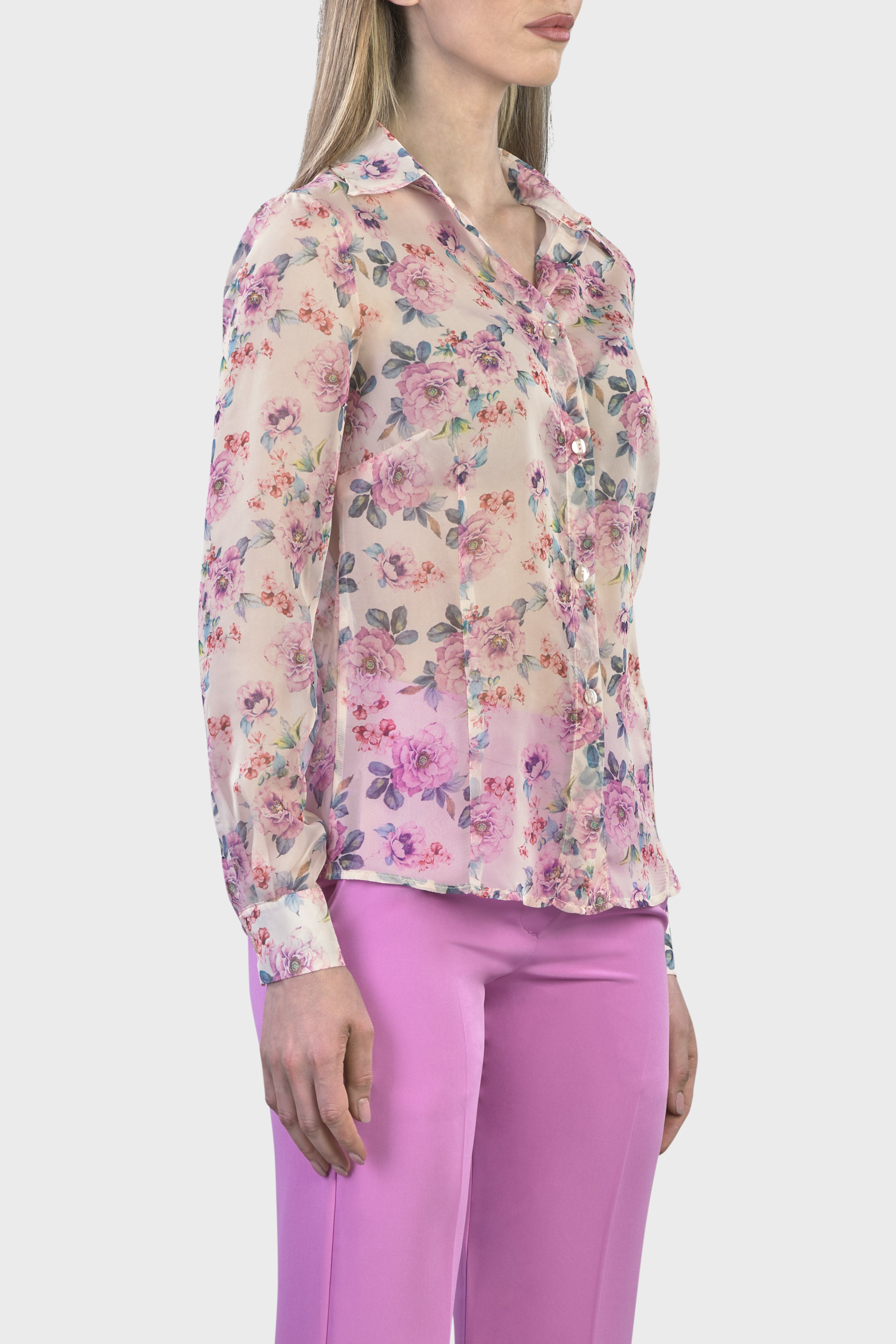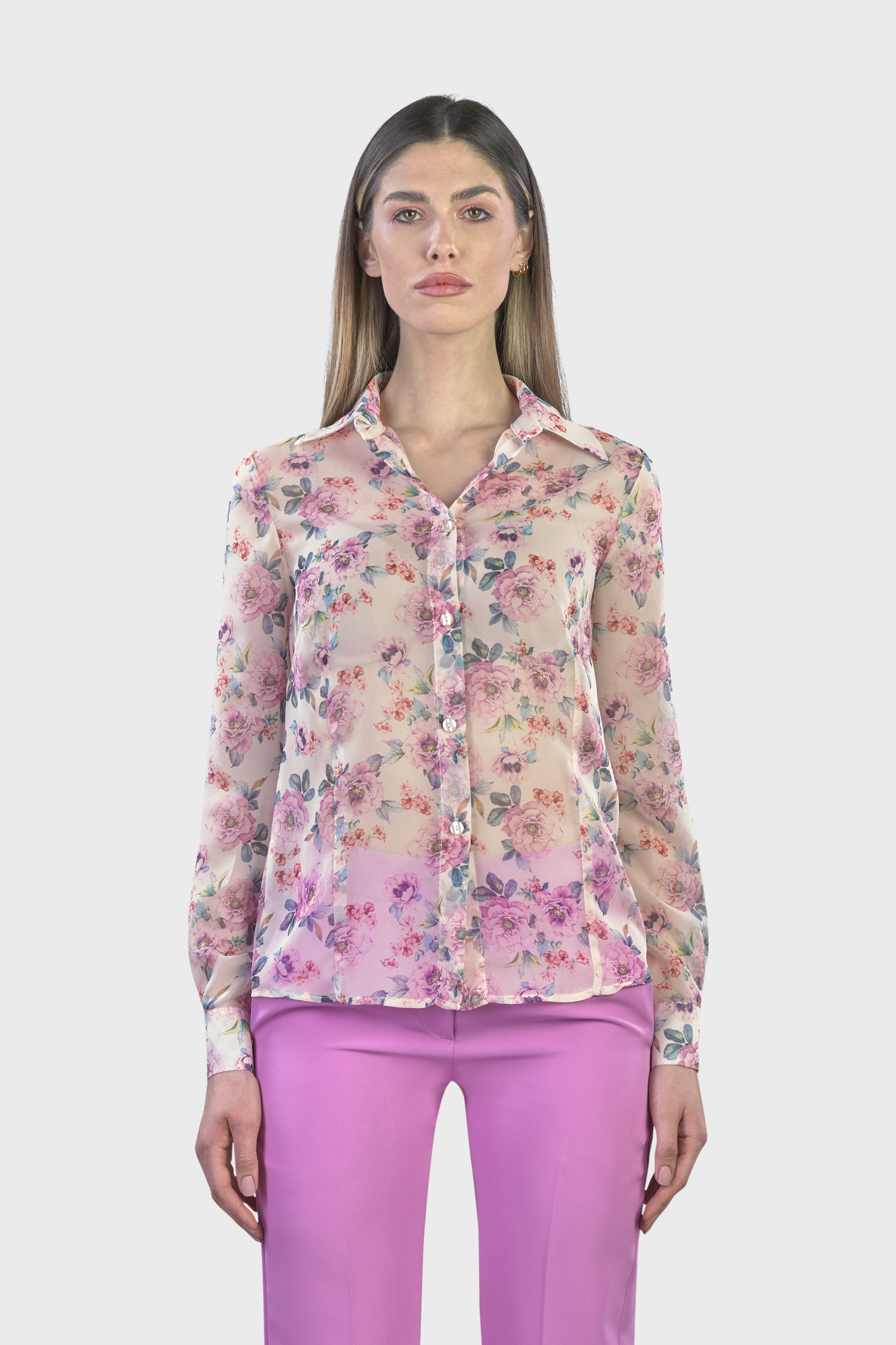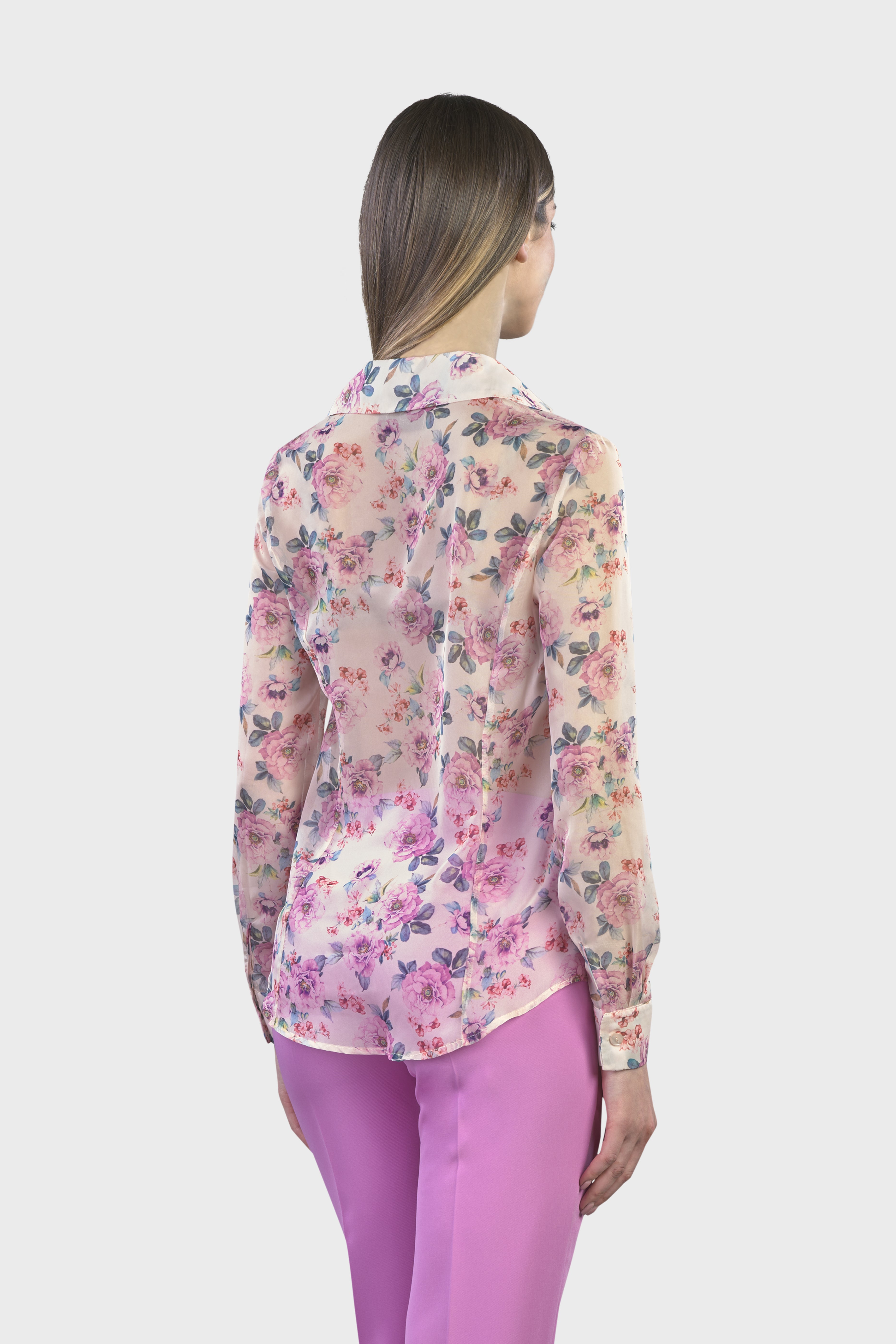 Il design di questa camicia è la rivisitazione di un modello classico e intramontabile. L’elegante silhouette è delineata dalla vestibilità aderente dovuta alle pences sul seno. E’ realizzata organza, tessuto leggero e trasparente.E’ caratterizzata dalla romantica stampa floreale. Completano il modello il colletto a punta, l‘apertura frontale, ornata dai bottoni in madreperla tono su tono e le maniche lunghe con polsi. Perfetta da abbinare a pantaloni eleganti per un look da ufficio sofisticato, o con jeans per un'interpretazione più casual e raffinata.