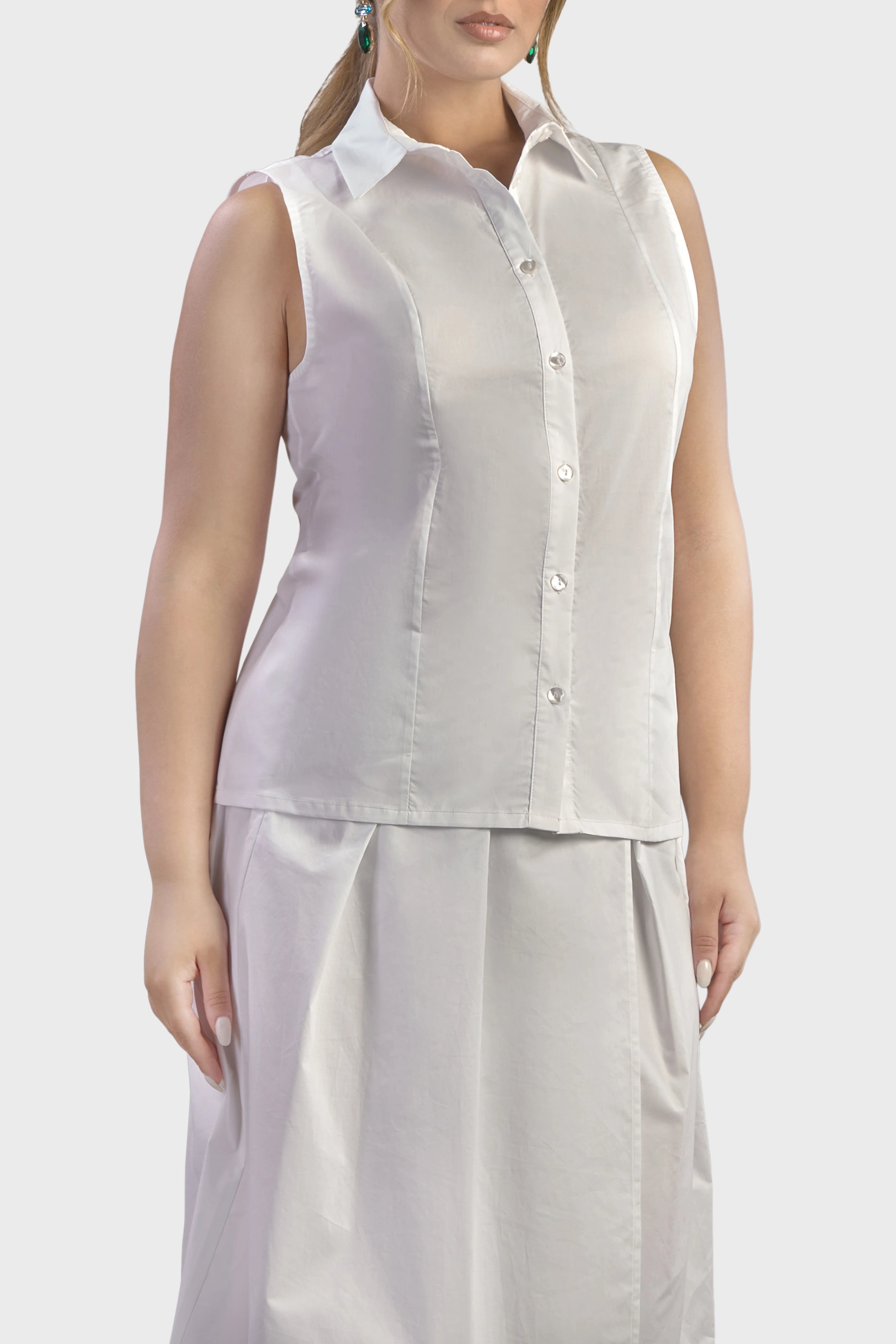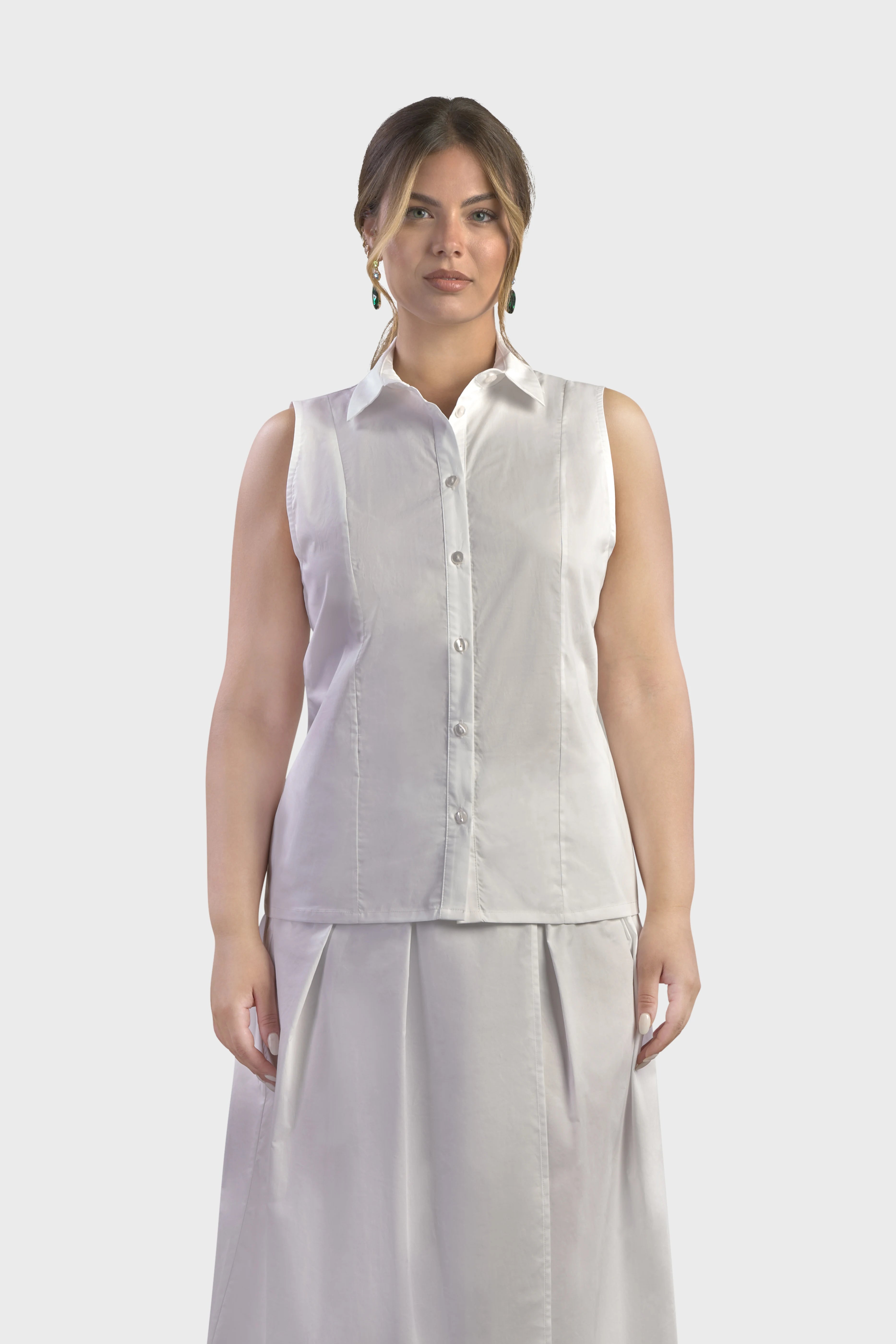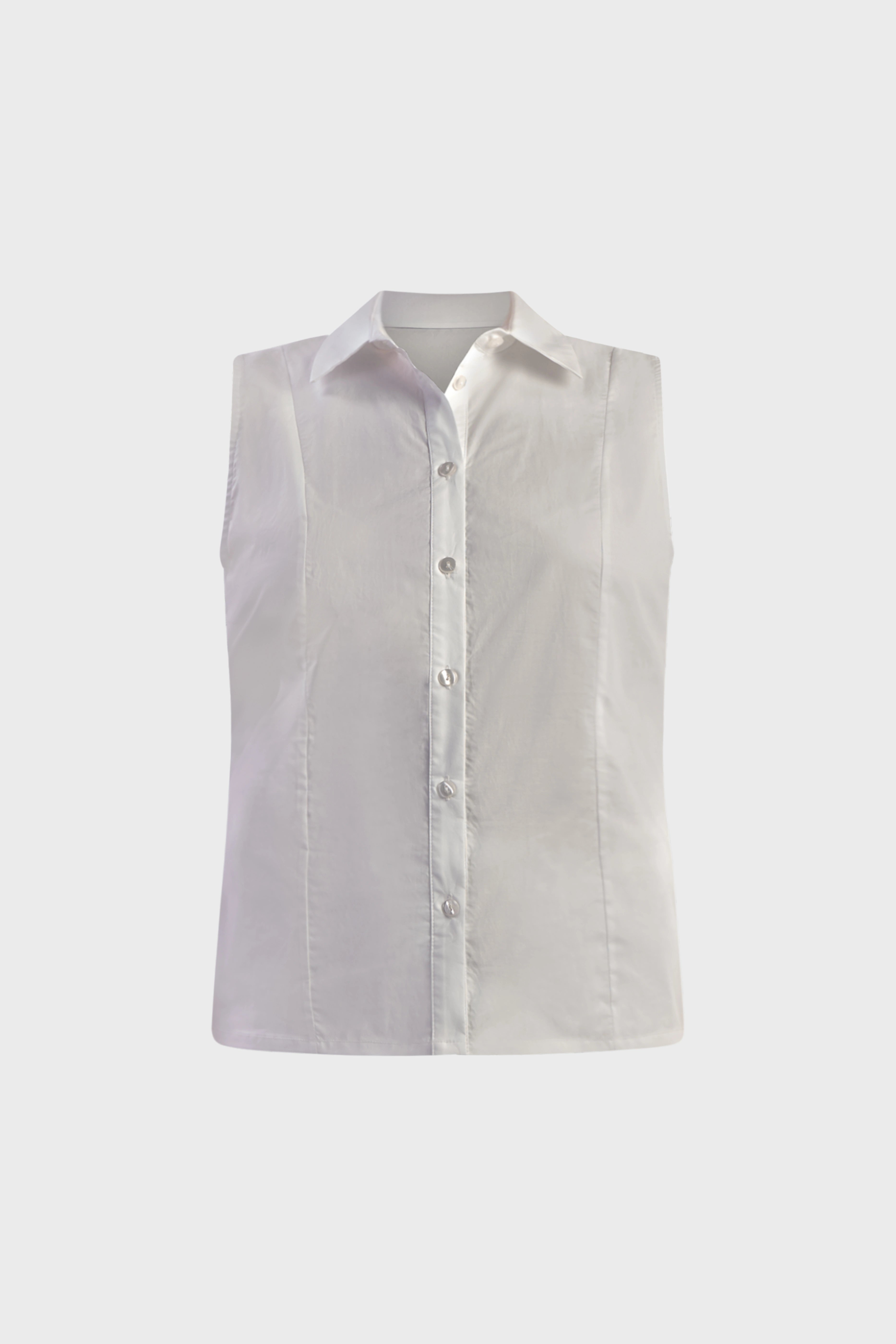 Grazie al colletto a punta e la linea avvitata, questa camicia senza maniche è un originale rivisitazione di un modello intramontabile. È realizzata in popeline di cotone, tessuto fresco e leggero. Il modello è caratterizzato dall’abbottonatura sul davanti impreziosita da bottoni in madreperla tono su tono. A completare il capo sono i tagli perpendicolari in grado di offrire una vestibilità aderente. Questa camicia può prendere infiniti stili adattandosi ad ogni look, con un outfit da giorno più “basic” o per dare un tocco glam ad un look serale.