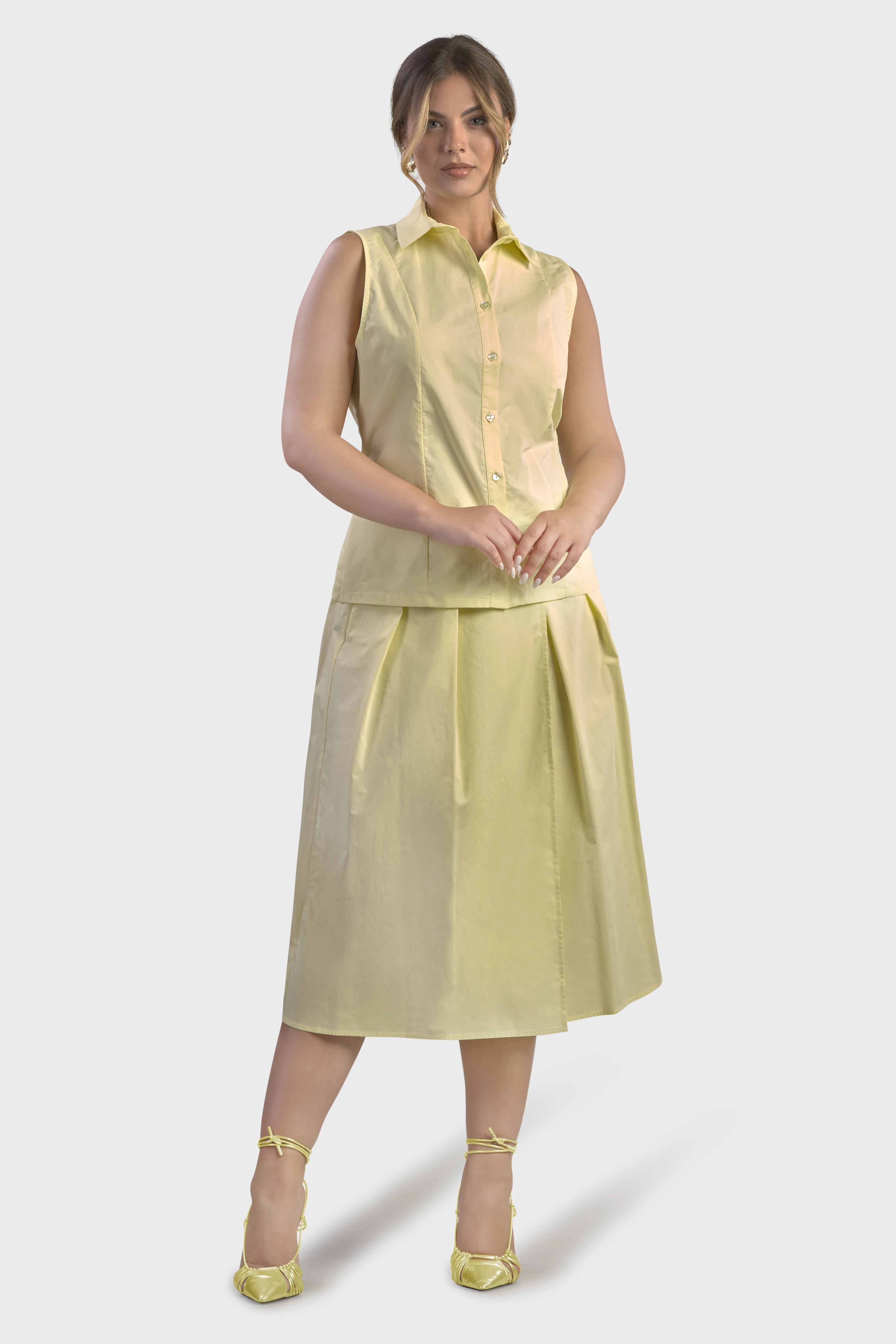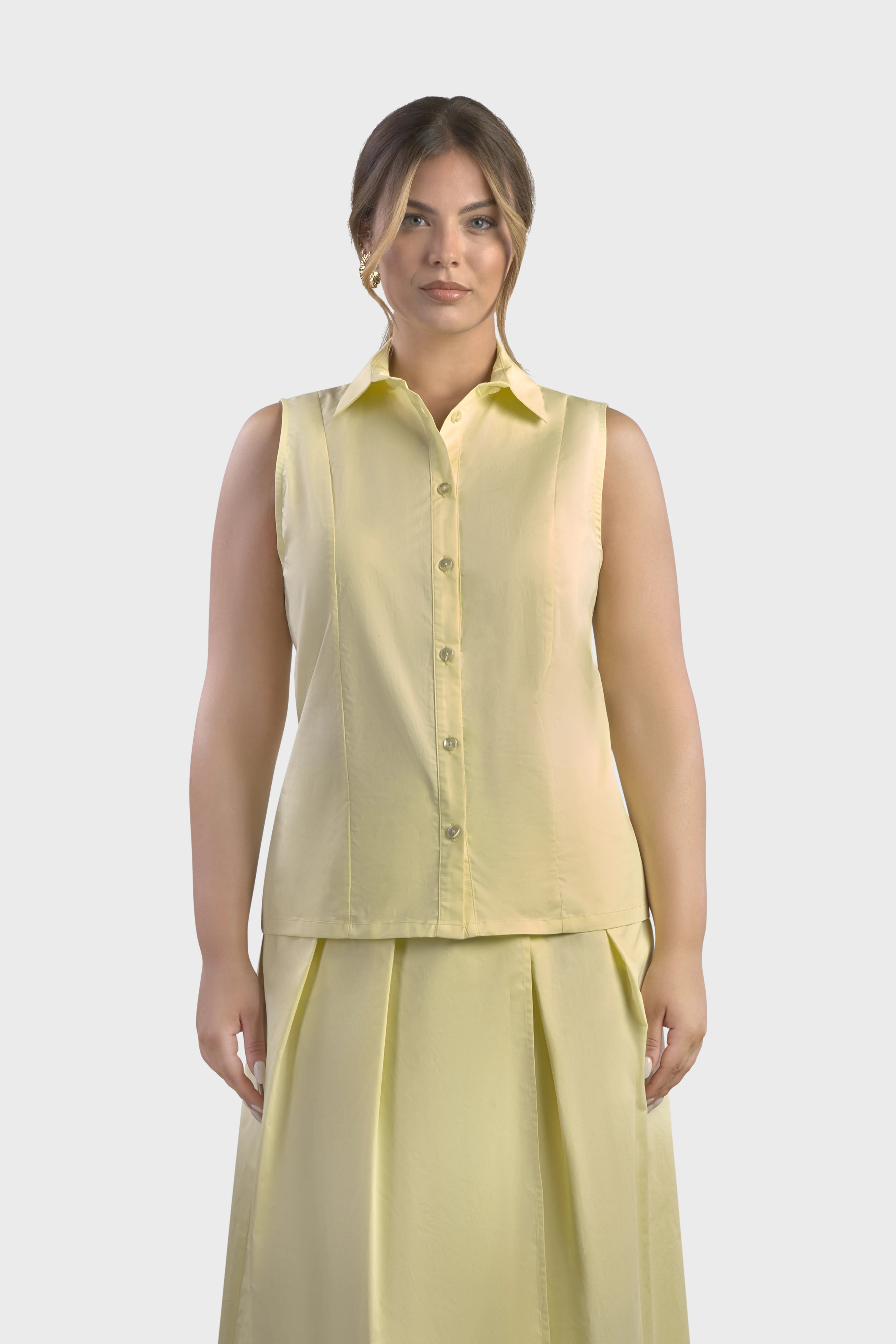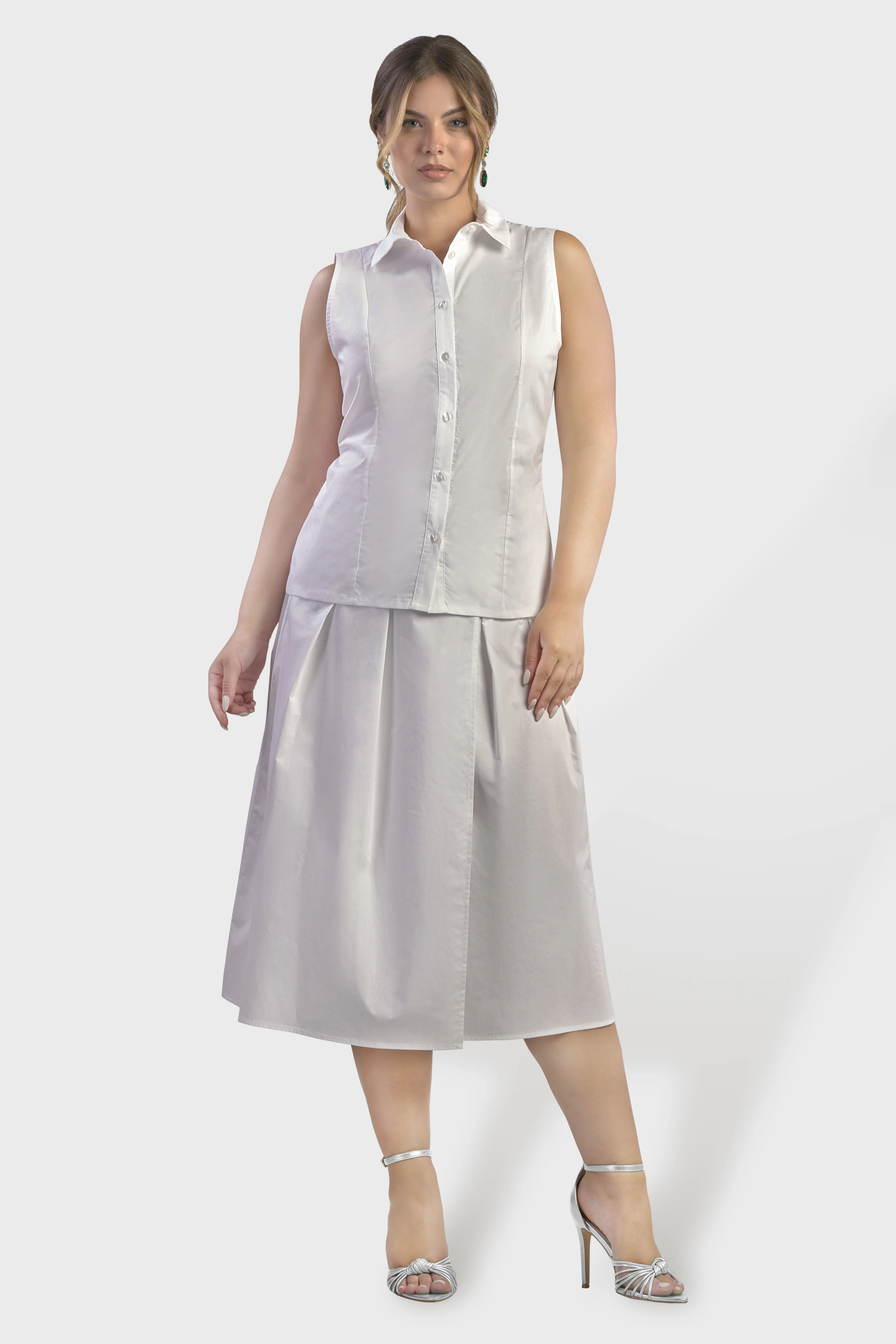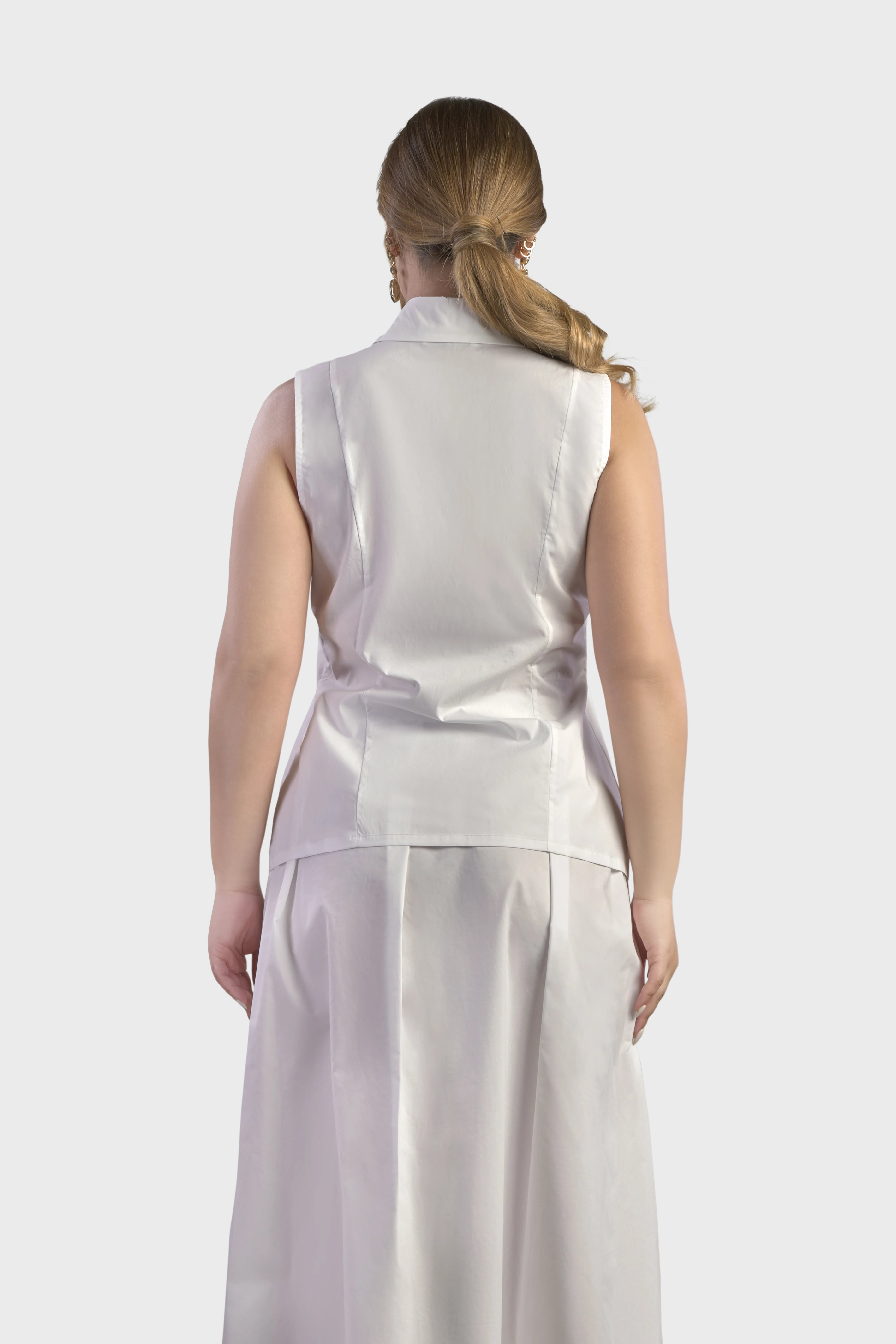 Grazie al colletto a punta e la linea avvitata, questa camicia senza maniche è un originale rivisitazione di un modello intramontabile. È realizzata in popeline di cotone, tessuto fresco e leggero. Il modello è caratterizzato dall’abbottonatura sul davanti impreziosita da bottoni in madreperla tono su tono. A completare il capo sono i tagli perpendicolari in grado di offrire una vestibilità aderente. Questa camicia può prendere infiniti stili adattandosi ad ogni look, con un outfit da giorno più “basic” o per dare un tocco glam ad un look serale.