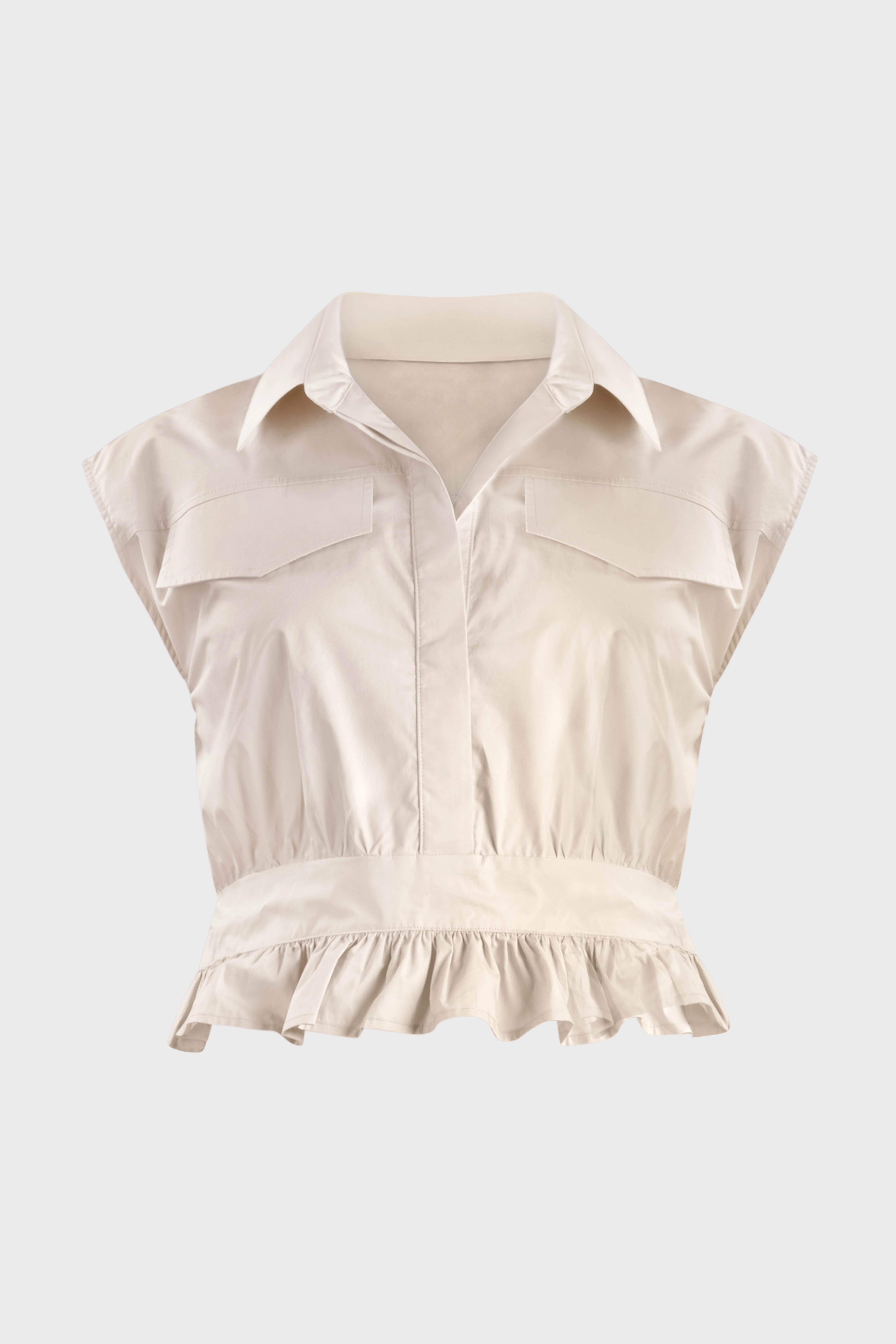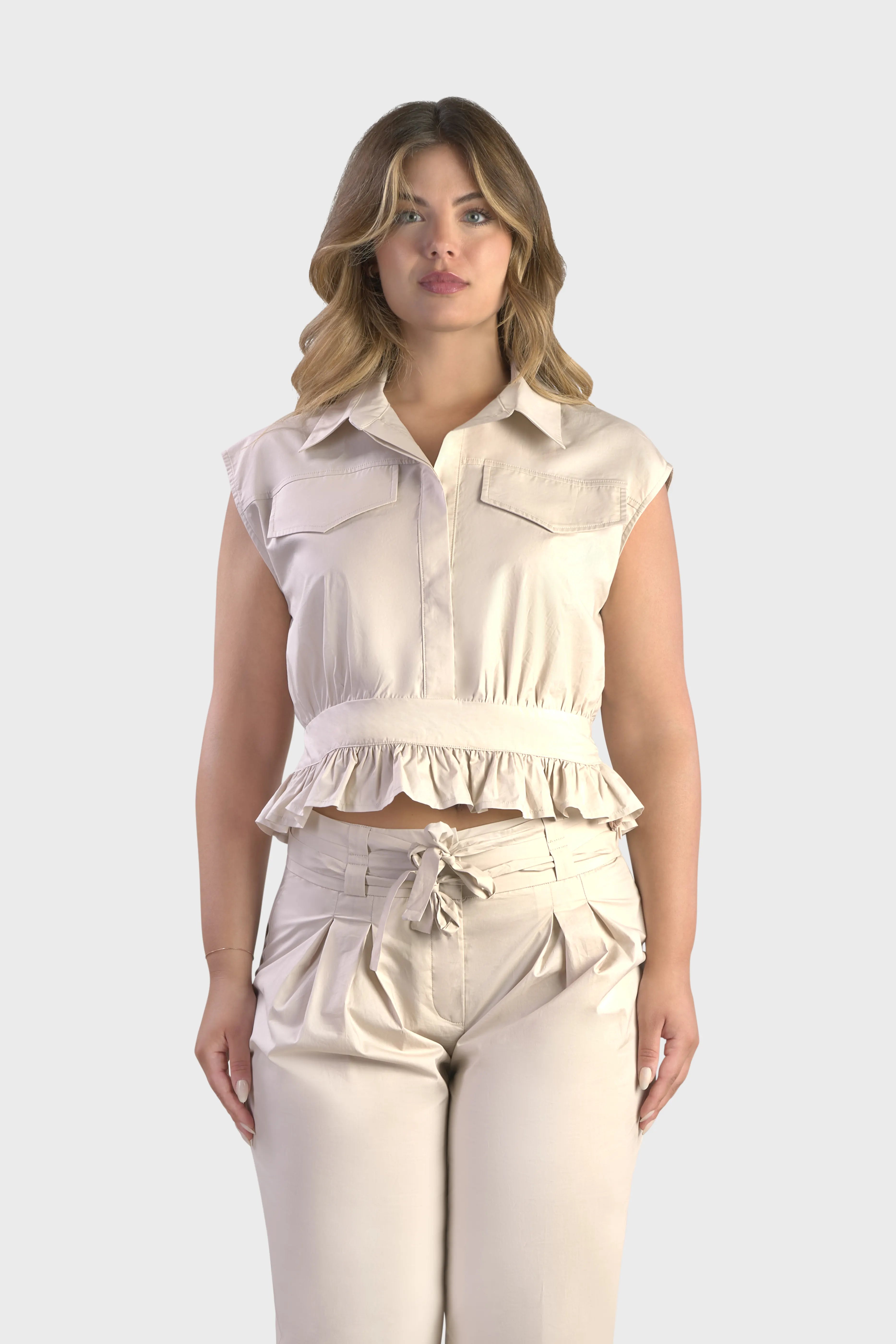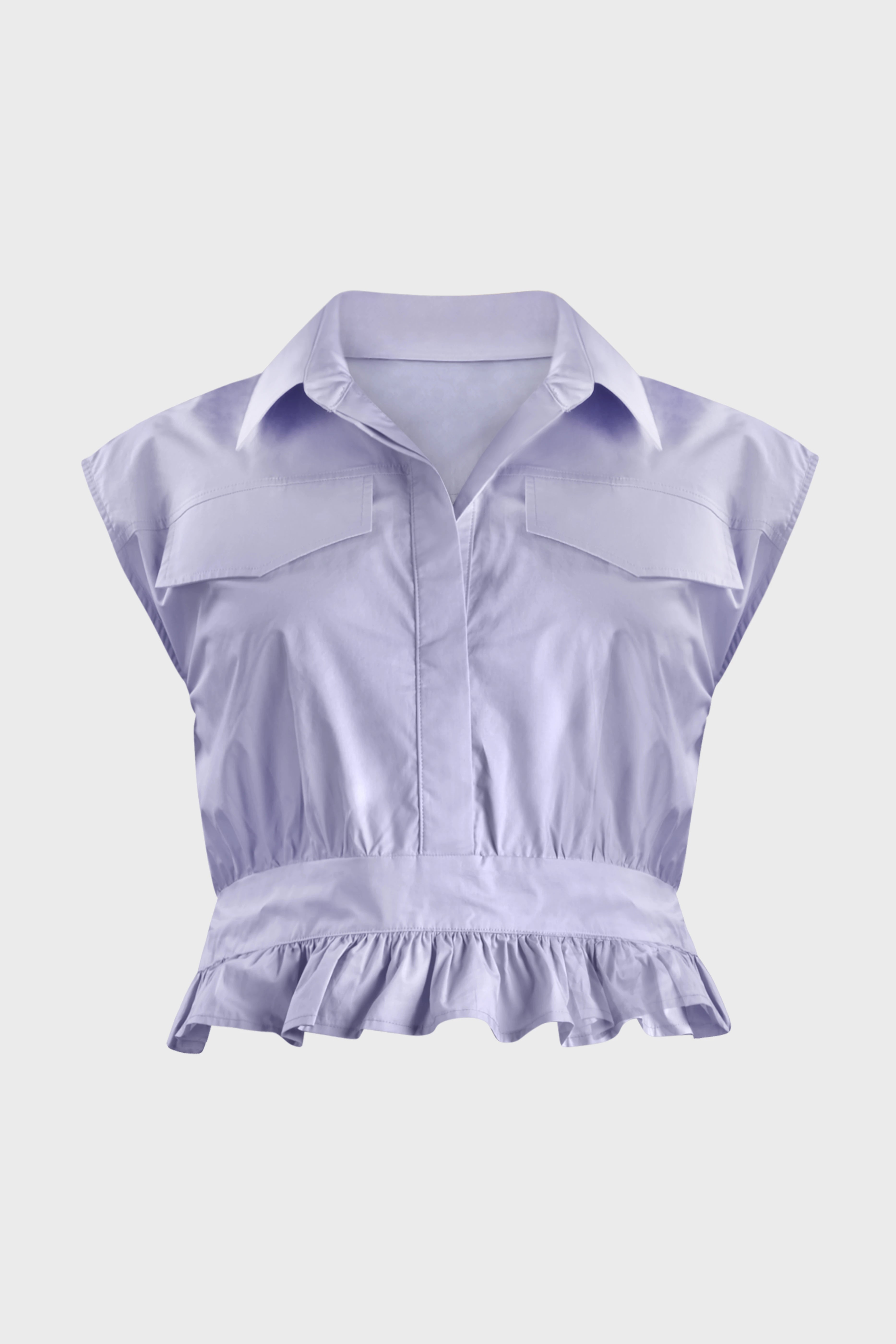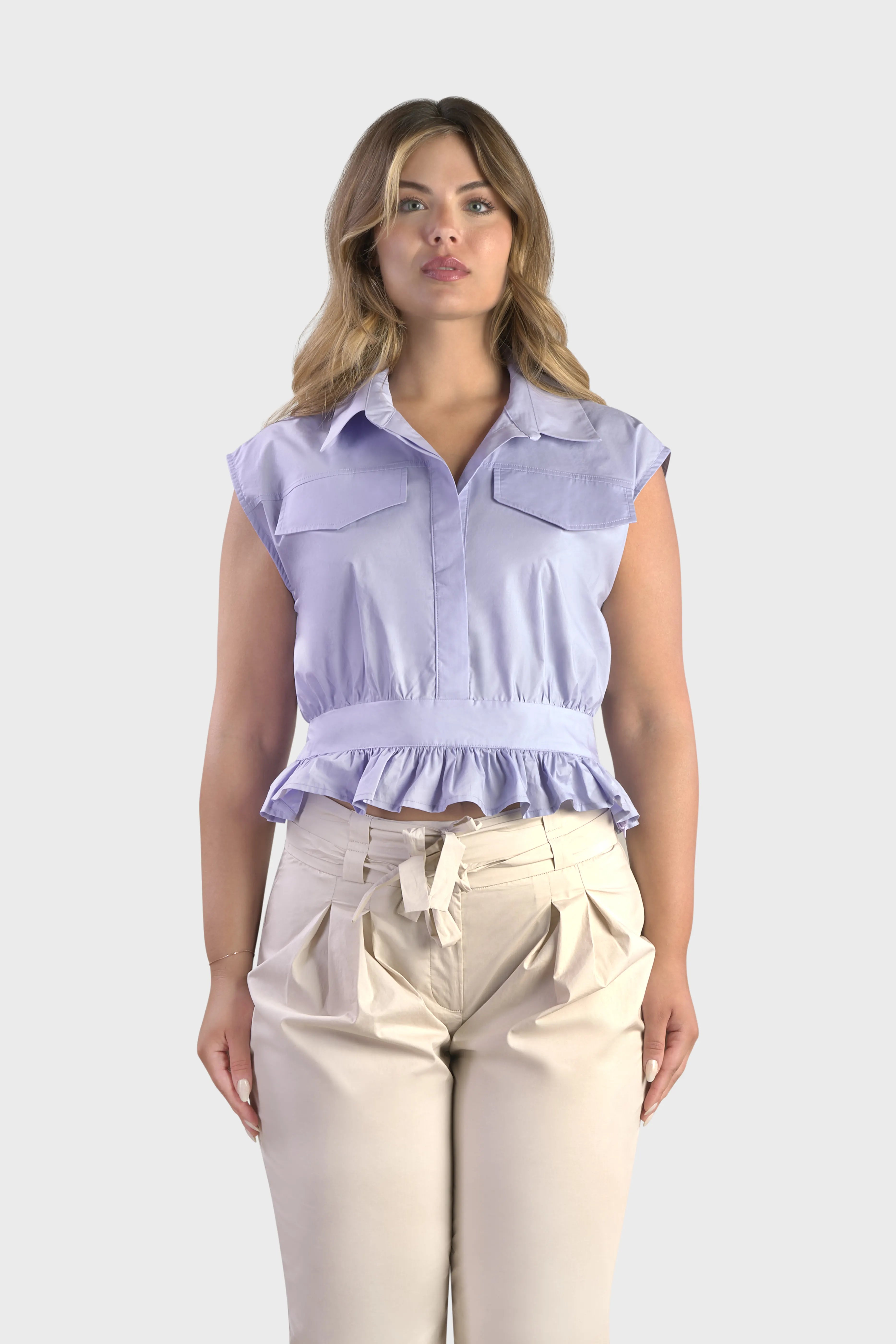 Le linee morbide di questa camicia delineano una silhouette corta. È realizzata in popeline di co-tone, tessuto fresco e leggero. È caratterizzata dal colletto camicia,semi-apertura con bottone sul davanti e finta nascosta. In vita presenta una fascia, in grado di valorizzare il punto vita. Il fondo arricciato è delineato dalla rouches, mentre ad impreziosire il modello sono le due pattine sul petto che donano un look moderno alla camicia. Ideale da indossare per un aperitivo serale in spiaggia insieme ad un pantalone vita alta, per un look casual chic.