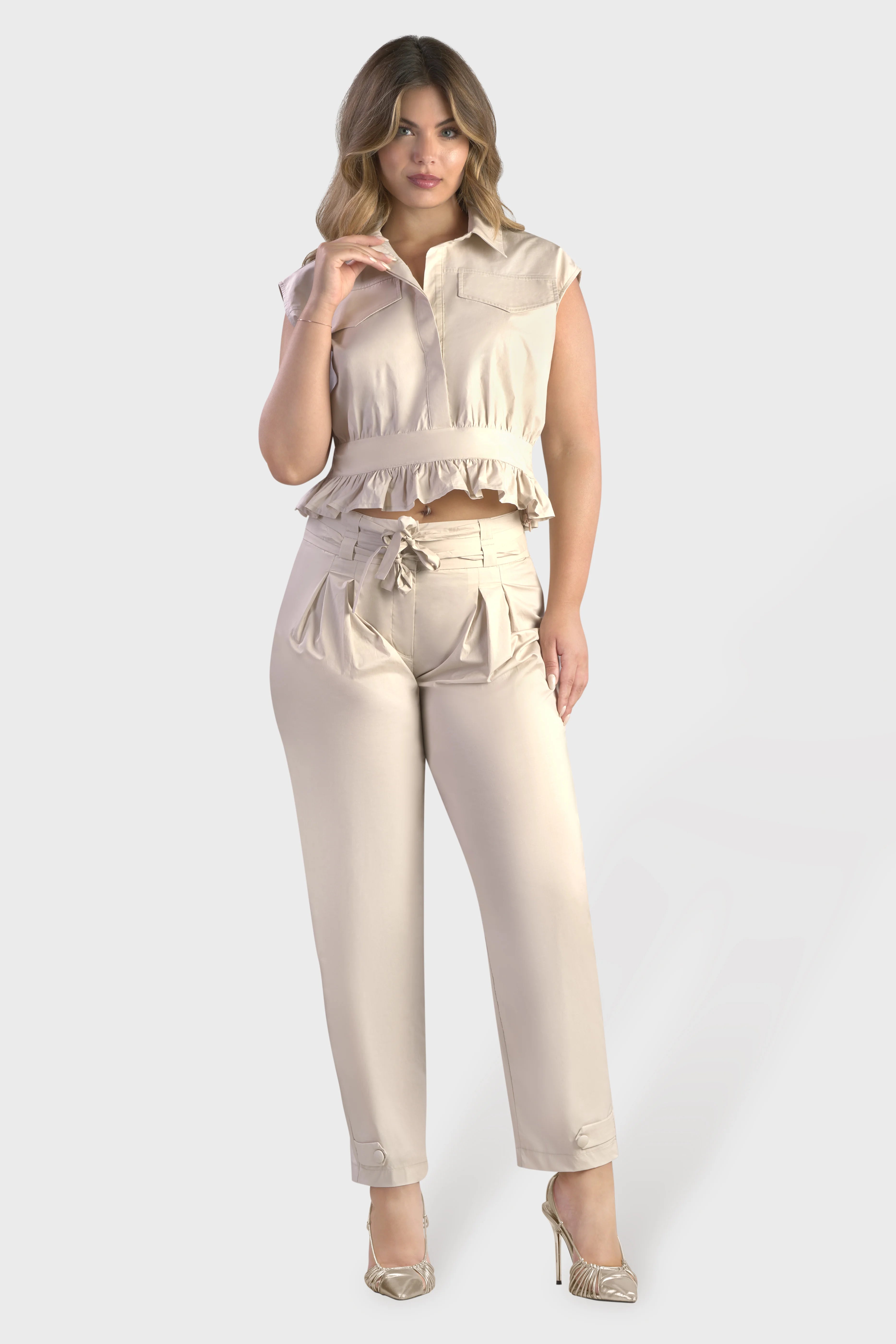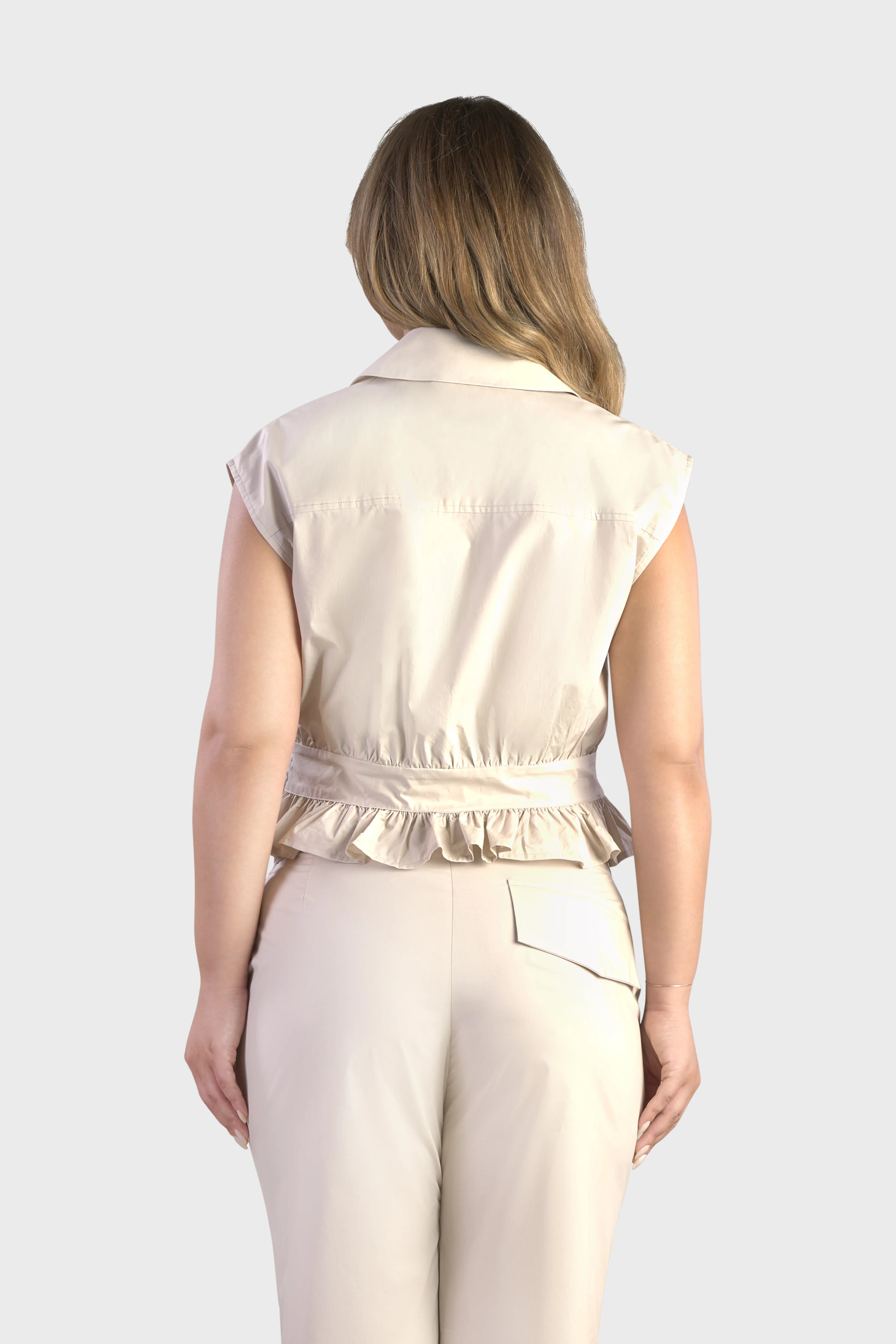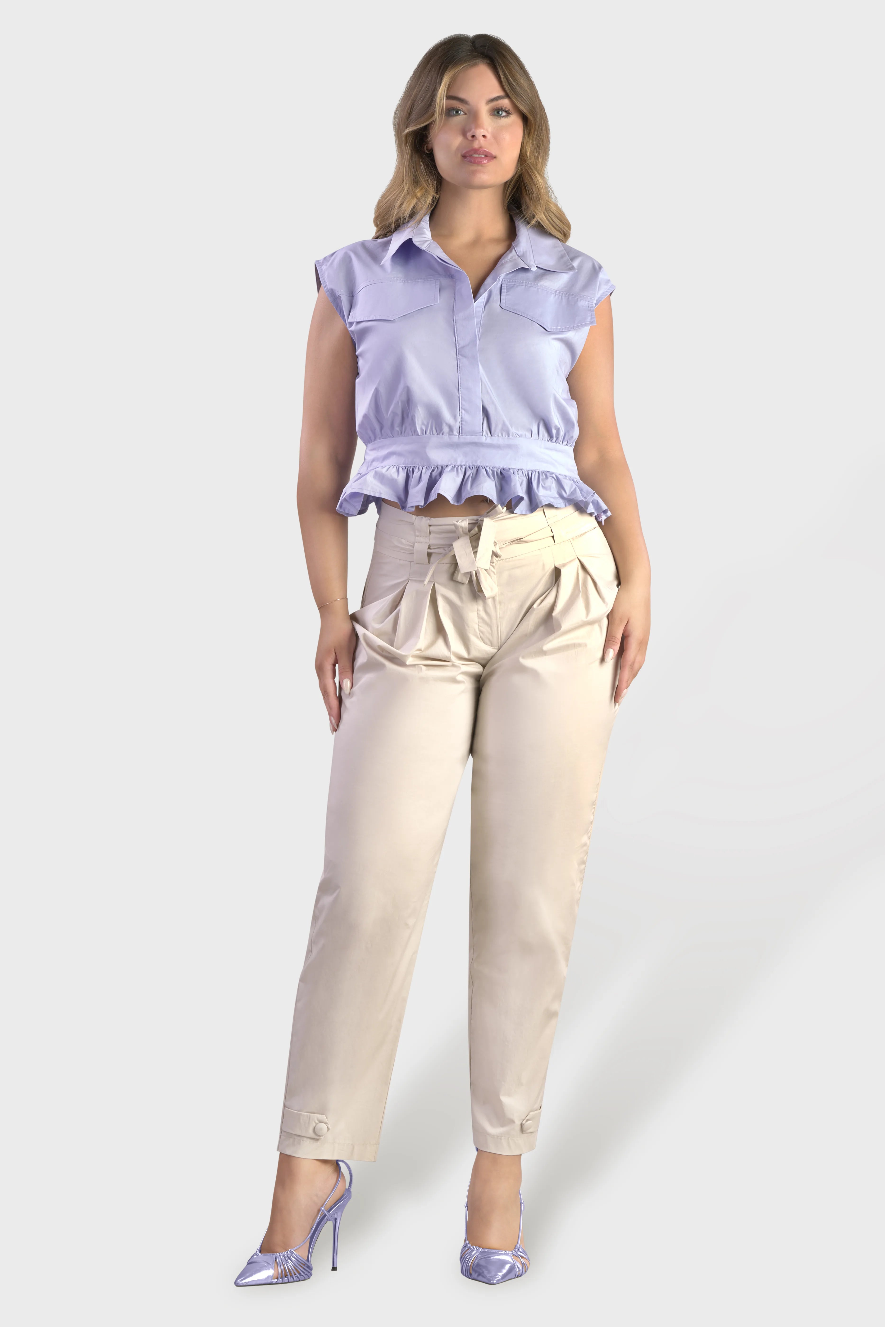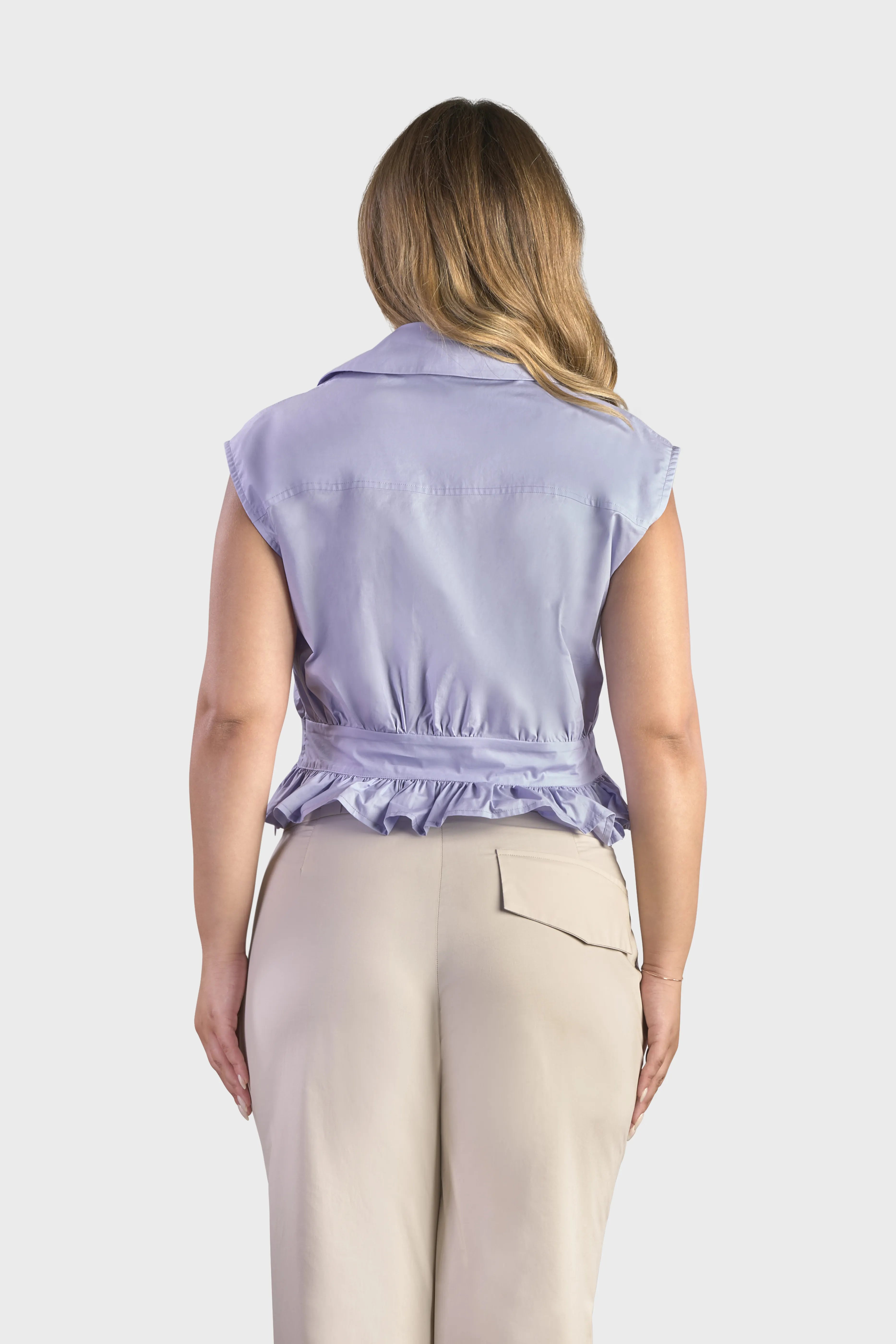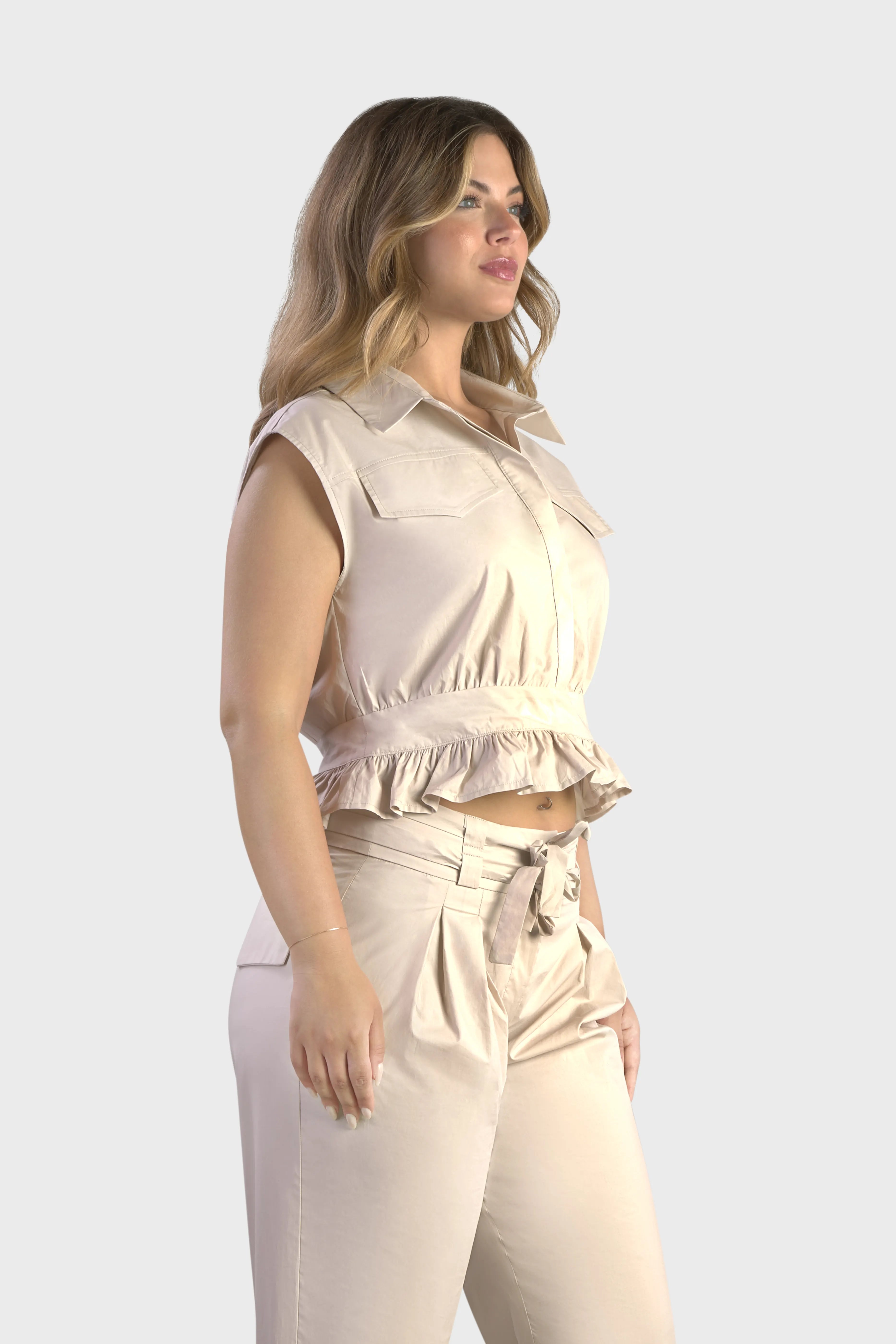 Le linee morbide di questa camicia delineano una silhouette corta. È realizzata in popeline di co-tone, tessuto fresco e leggero. È caratterizzata dal colletto camicia,semi-apertura con bottone sul davanti e finta nascosta. In vita presenta una fascia, in grado di valorizzare il punto vita. Il fondo arricciato è delineato dalla rouches, mentre ad impreziosire il modello sono le due pattine sul petto che donano un look moderno alla camicia. Ideale da indossare per un aperitivo serale in spiaggia insieme ad un pantalone vita alta, per un look casual chic.