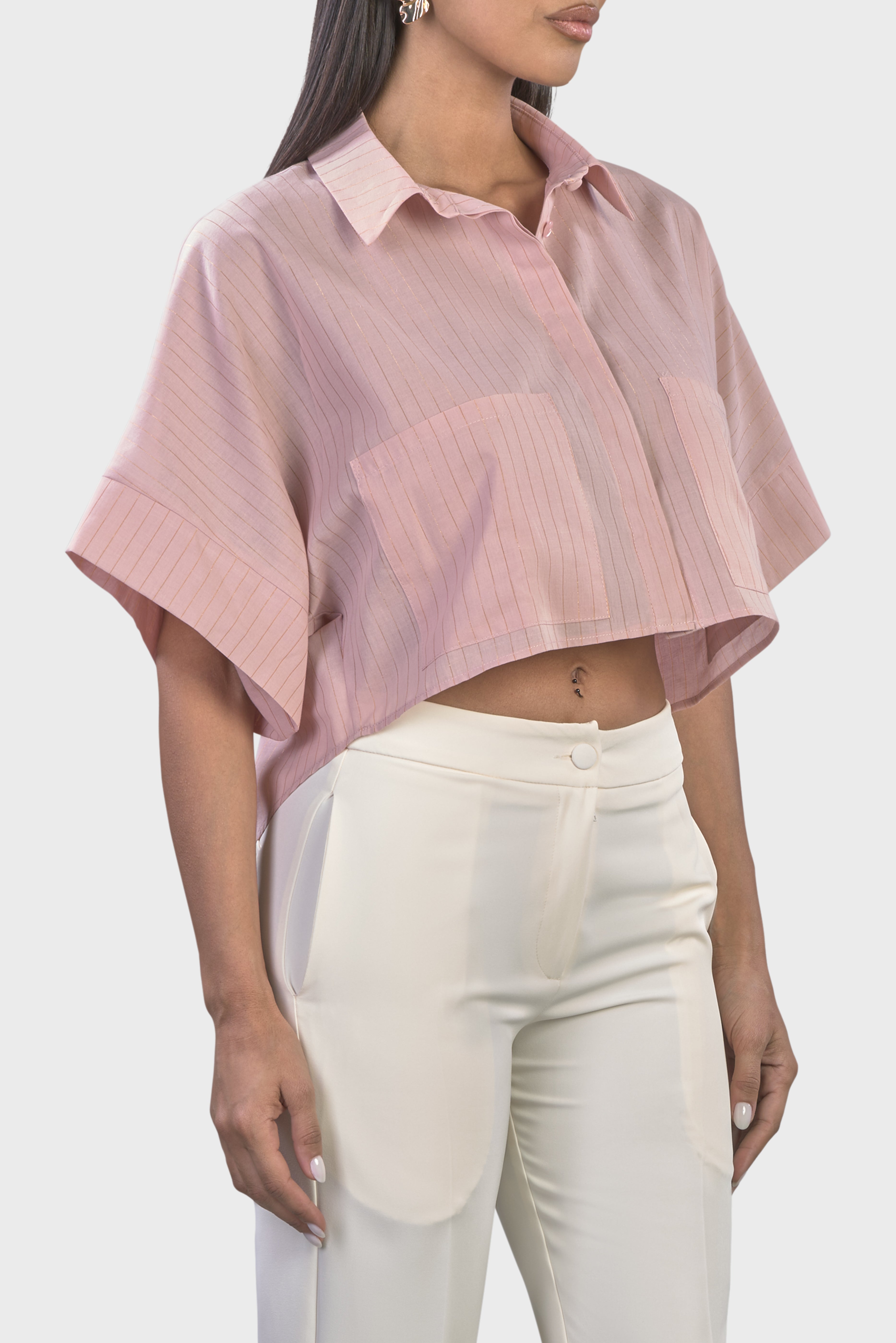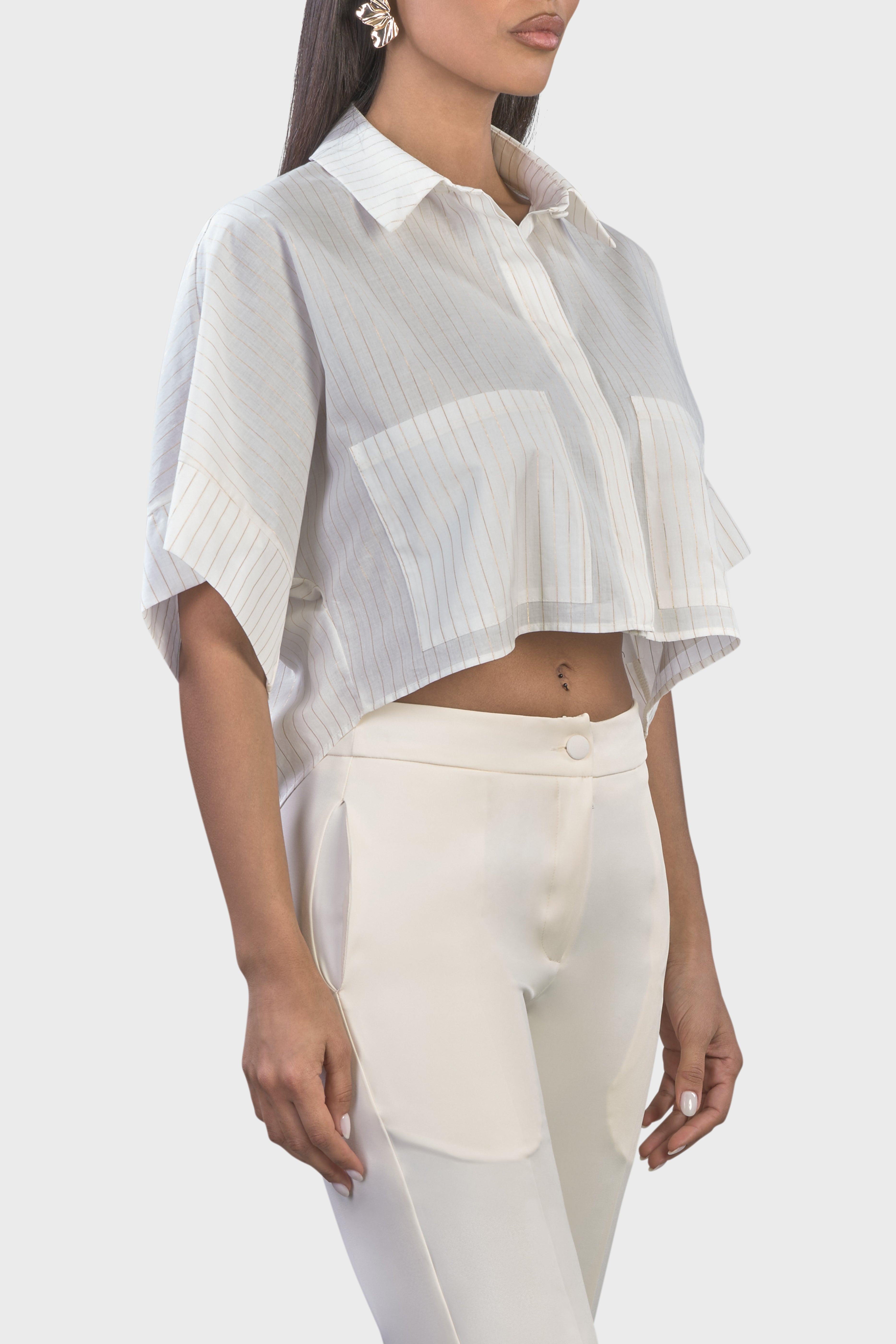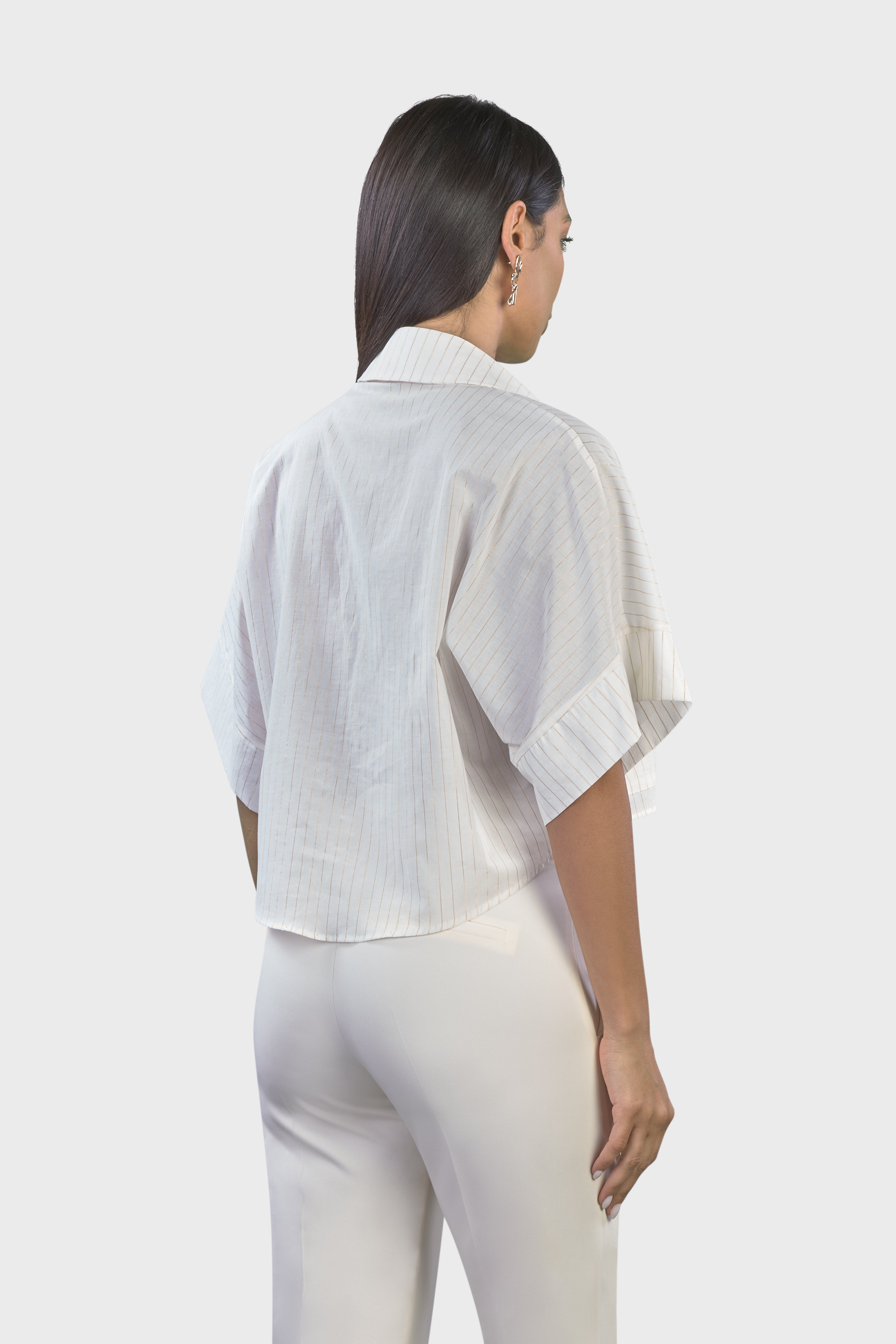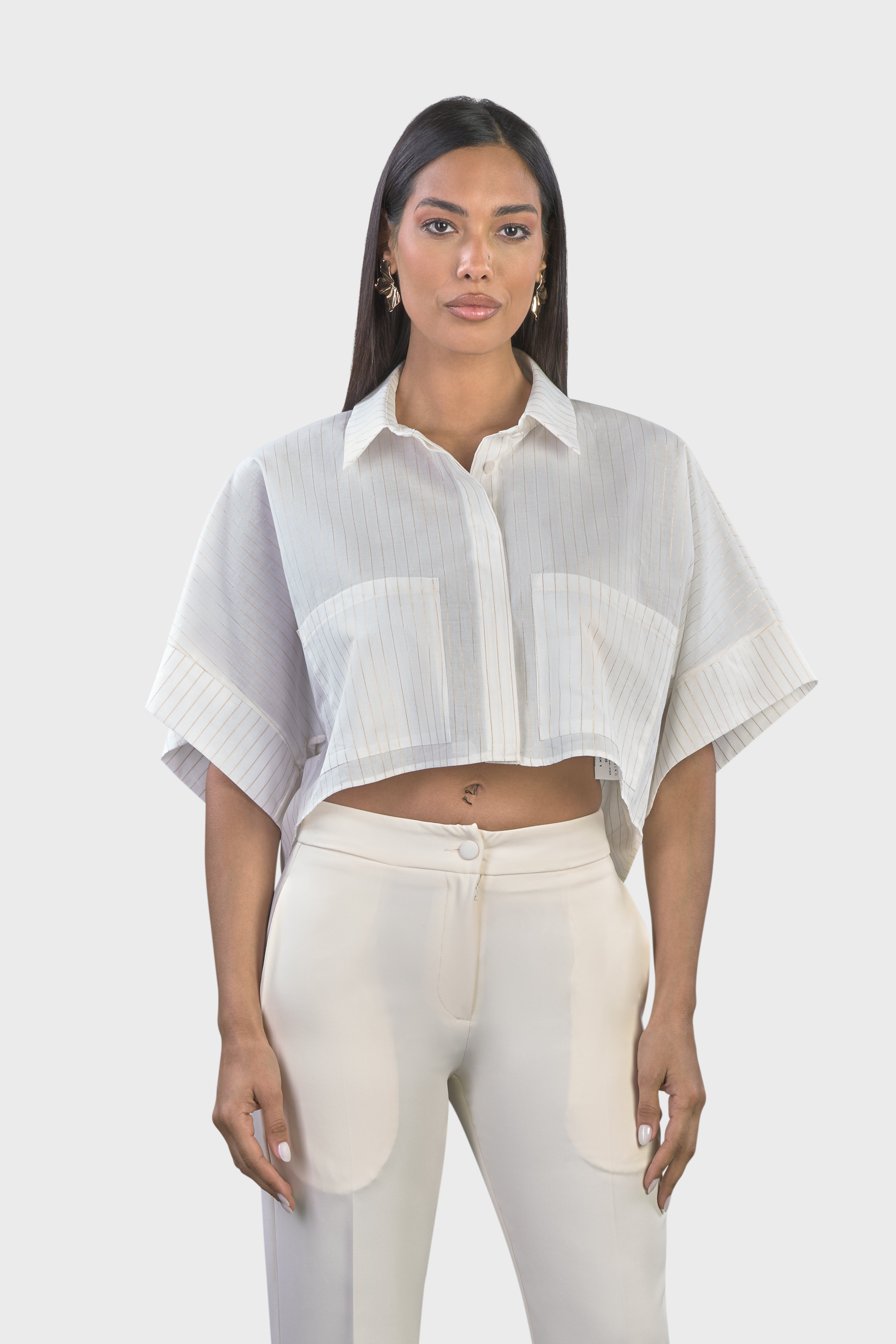 Il design di questa camicia dalla linea over e dallo stile cropped nella parte anteriore, ci rimandano ad una silhouette moderna. Realizzata in un morbido popeline di cotone, impreziosito dal motivo striped lurex. Il modello è caratterizzato dalla manica ampia che cade morbida, e dalle tasche squadrate sul davanti. Completano il capo il colletto a punta e l’abbottonatura nascosta.