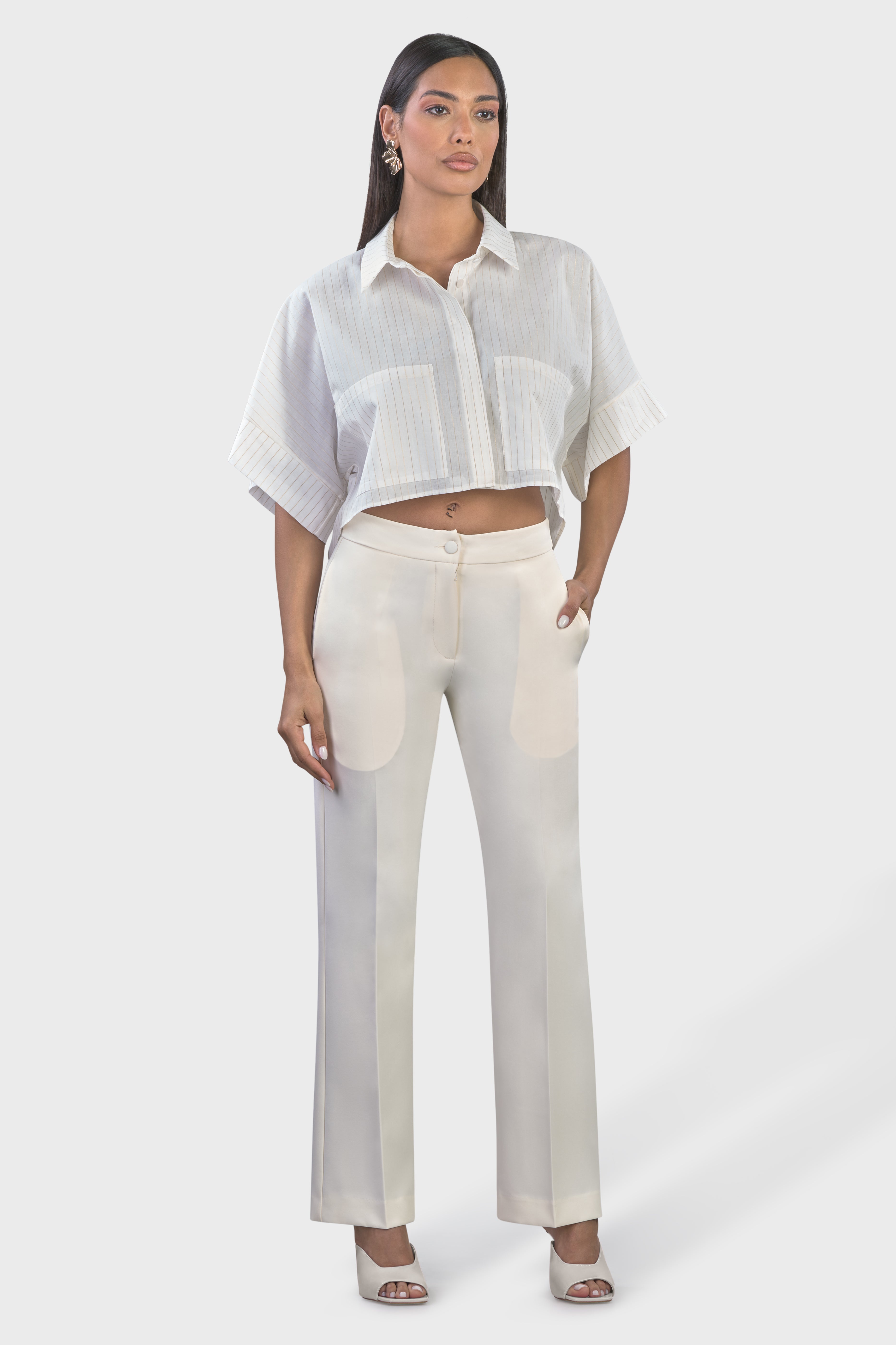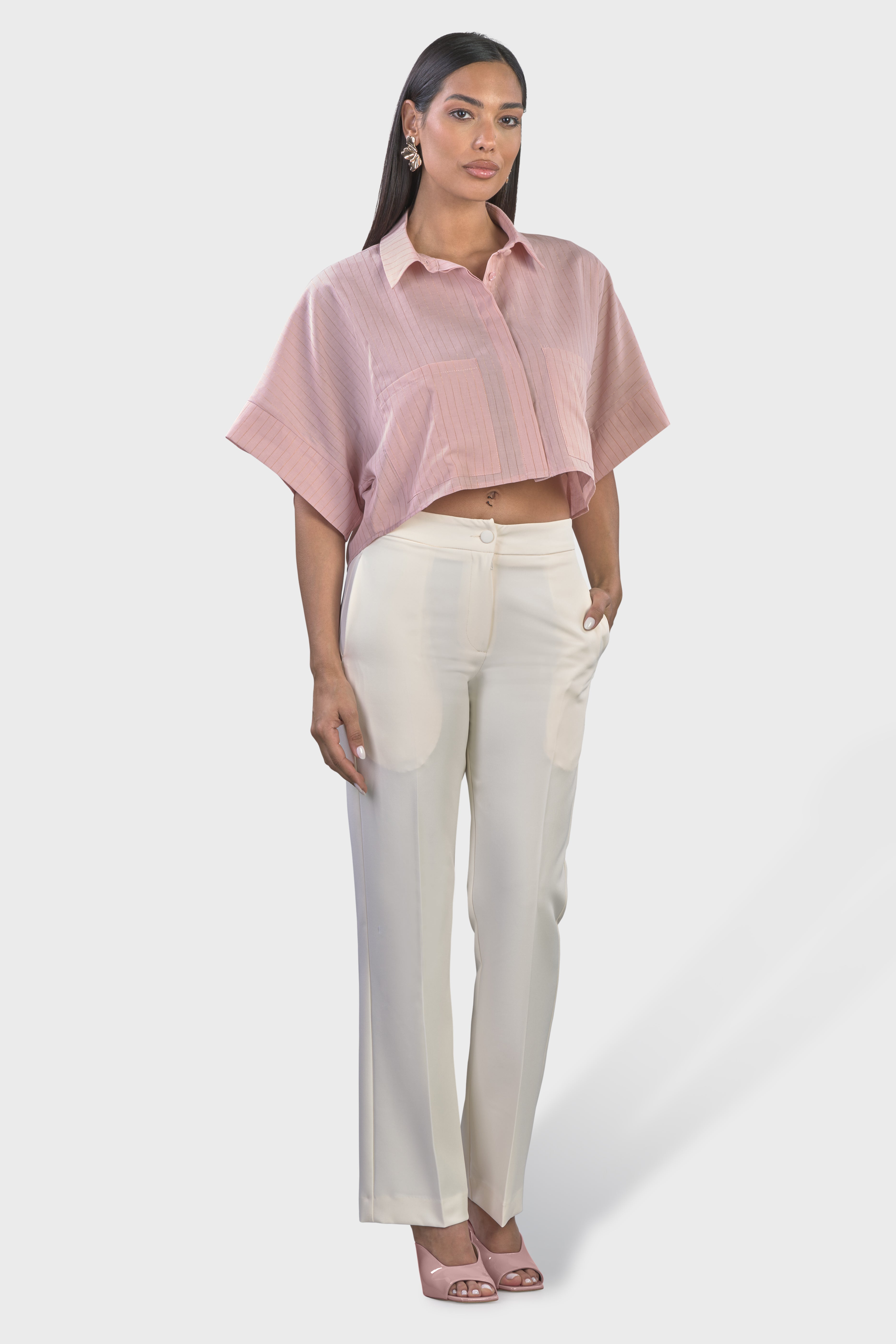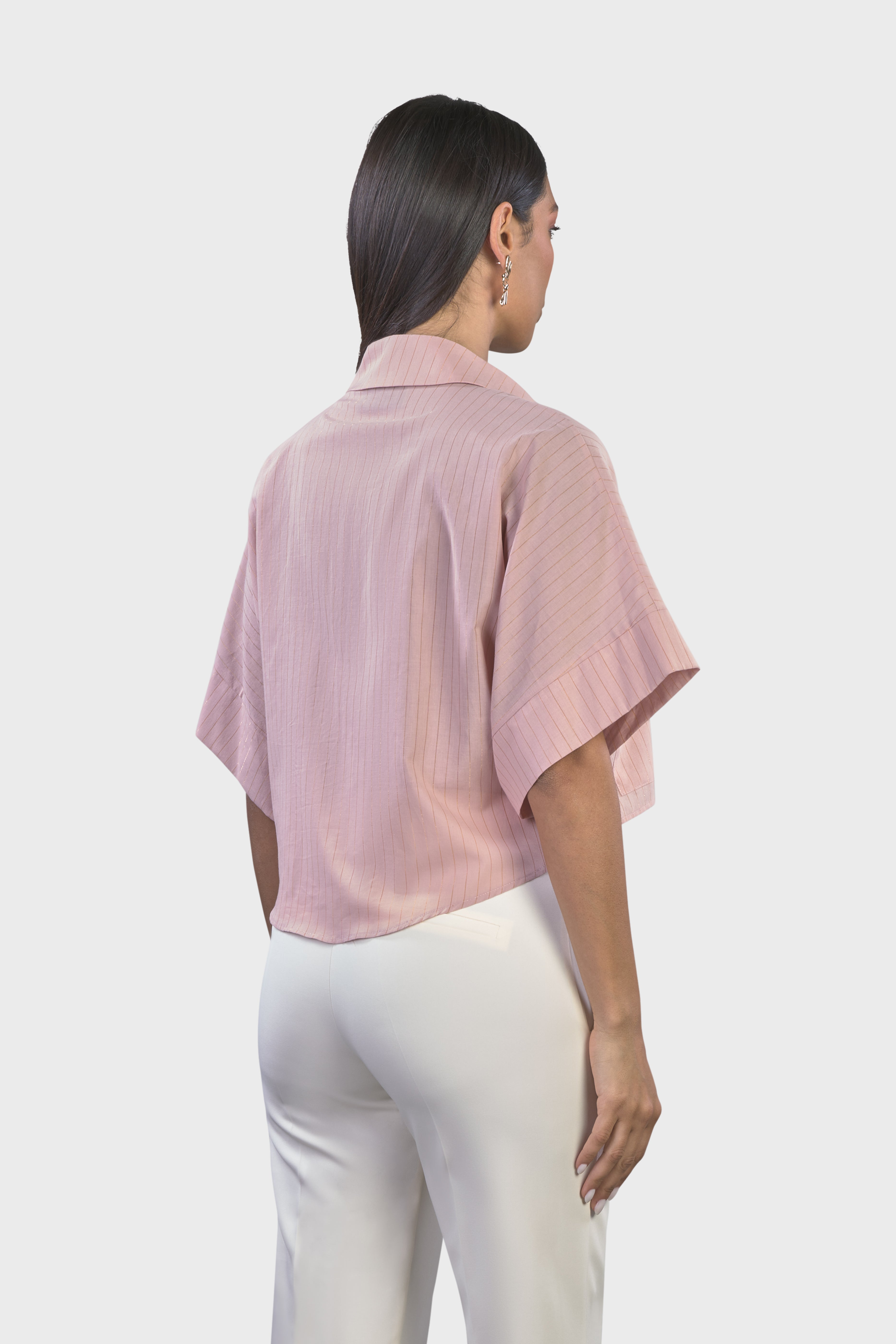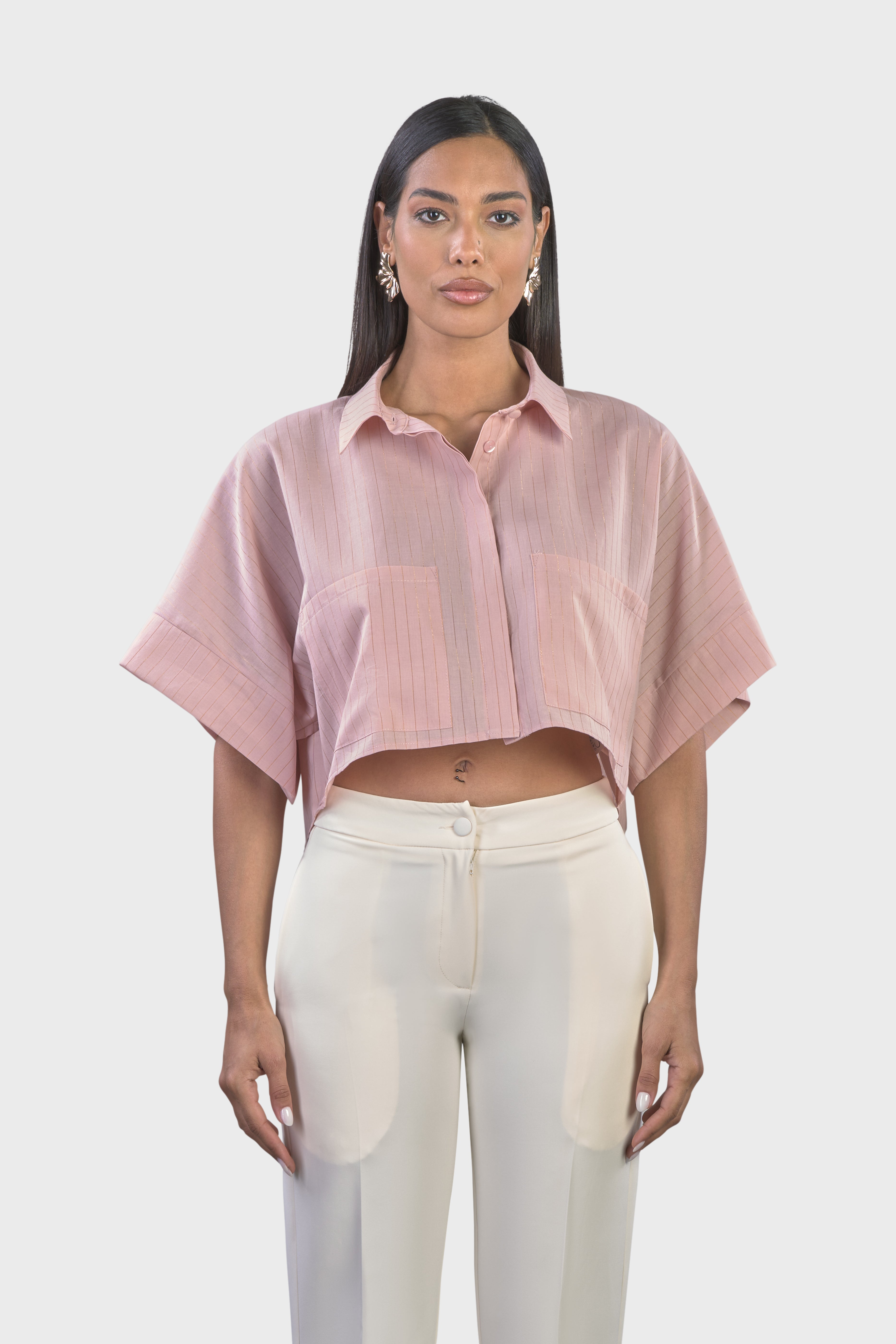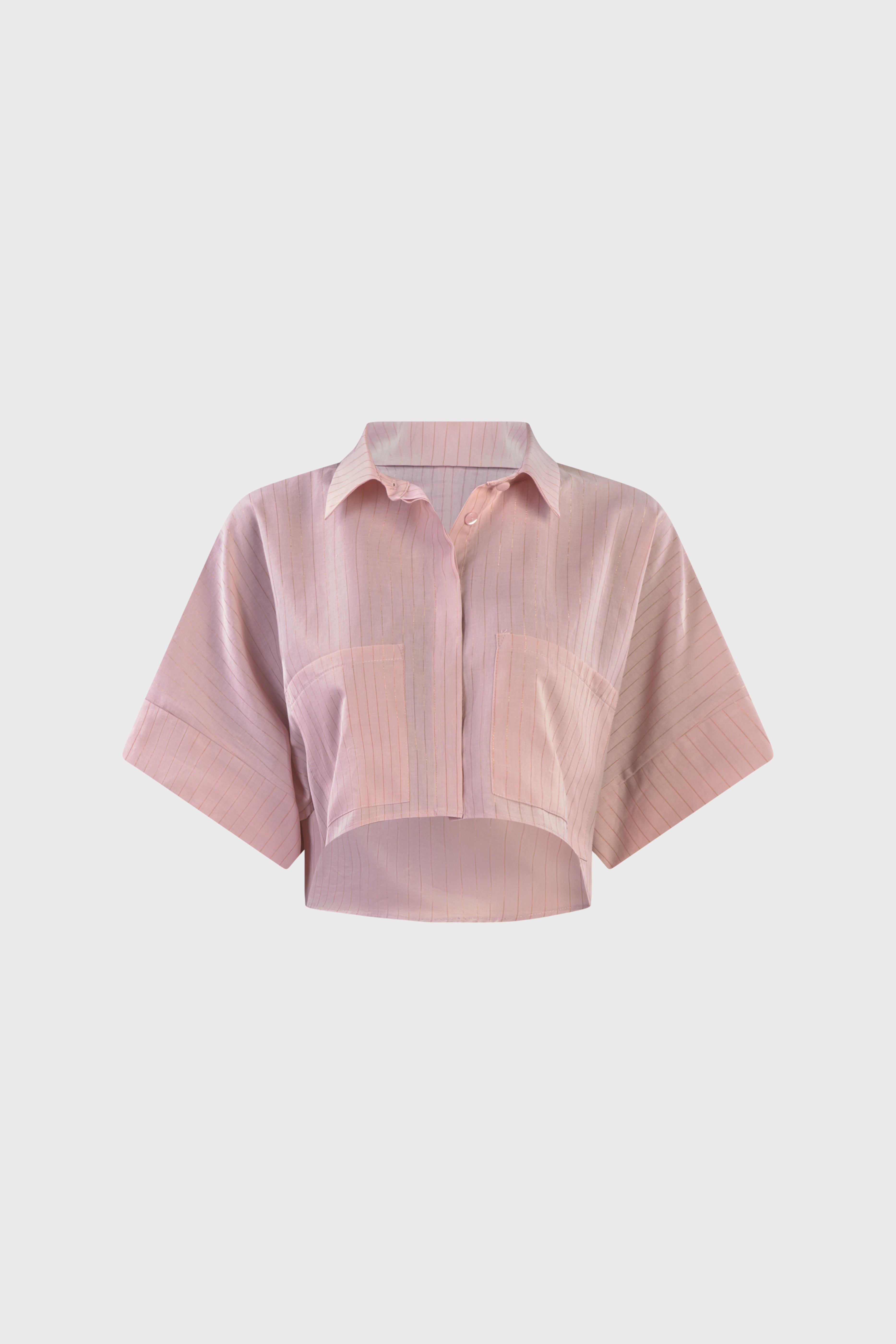 Il design di questa camicia dalla linea over e dallo stile cropped nella parte anteriore, ci rimandano ad una silhouette moderna. Realizzata in un morbido popeline di cotone, impreziosito dal motivo striped lurex. Il modello è caratterizzato dalla manica ampia che cade morbida, e dalle tasche squadrate sul davanti. Completano il capo il colletto a punta e l’abbottonatura nascosta.
