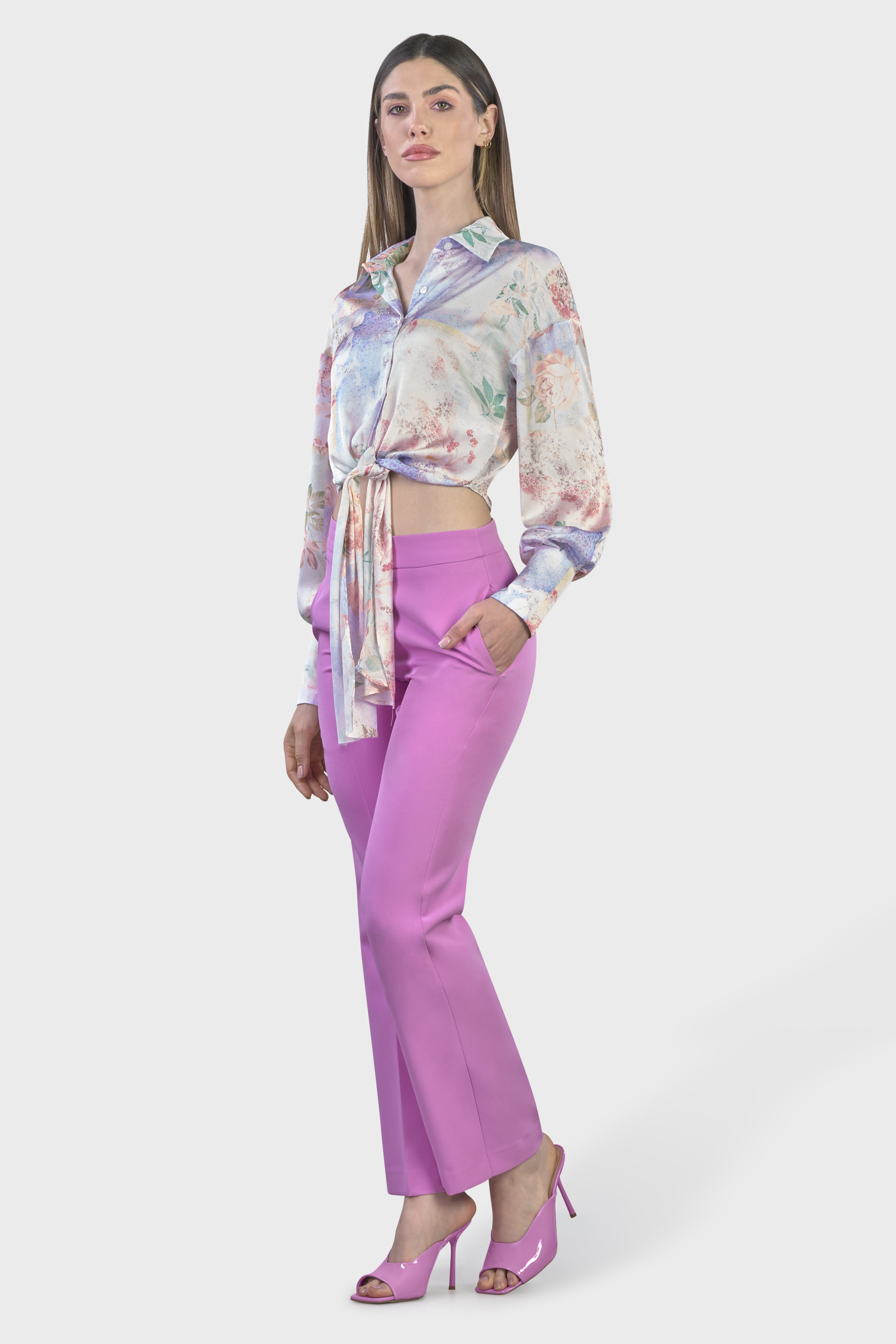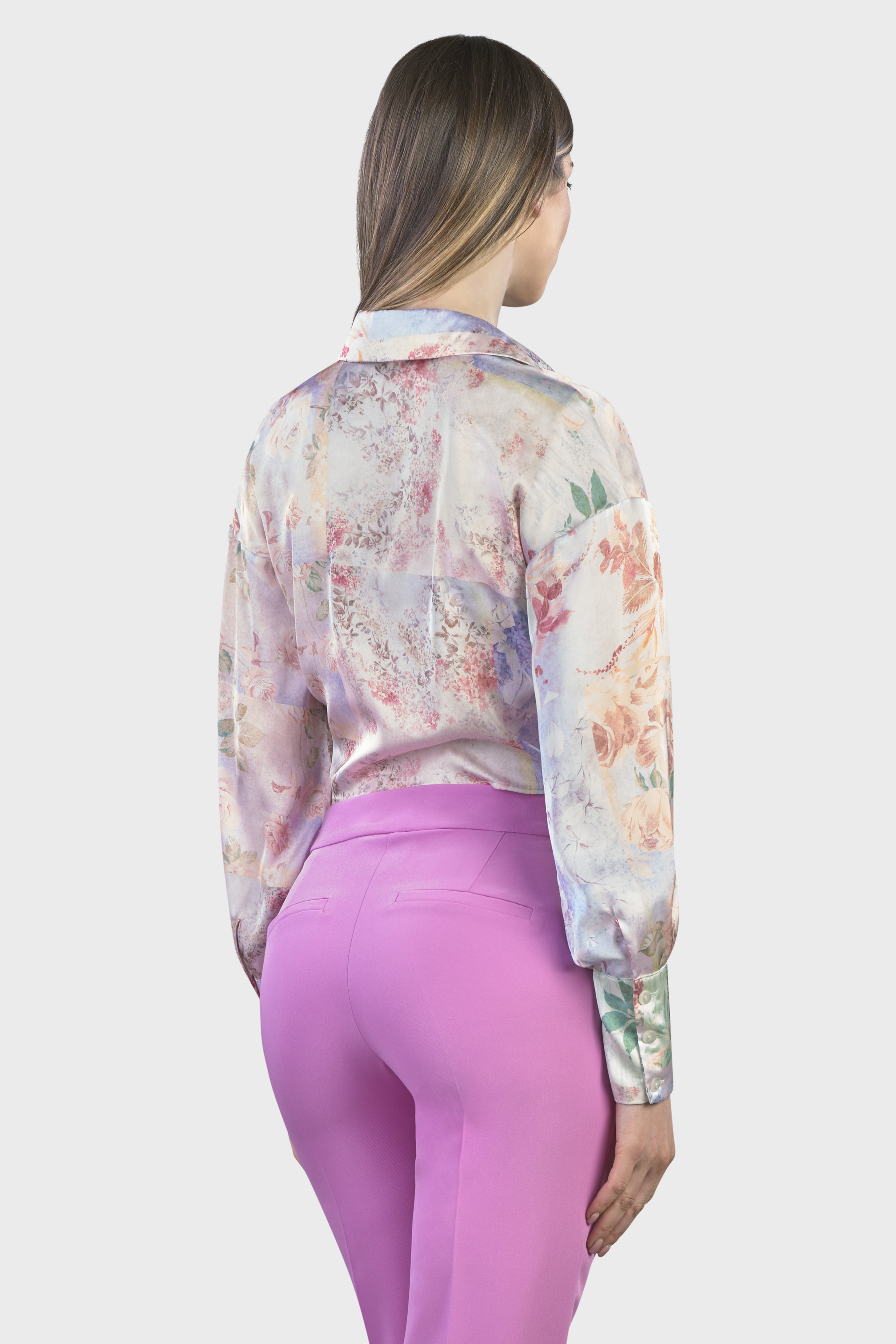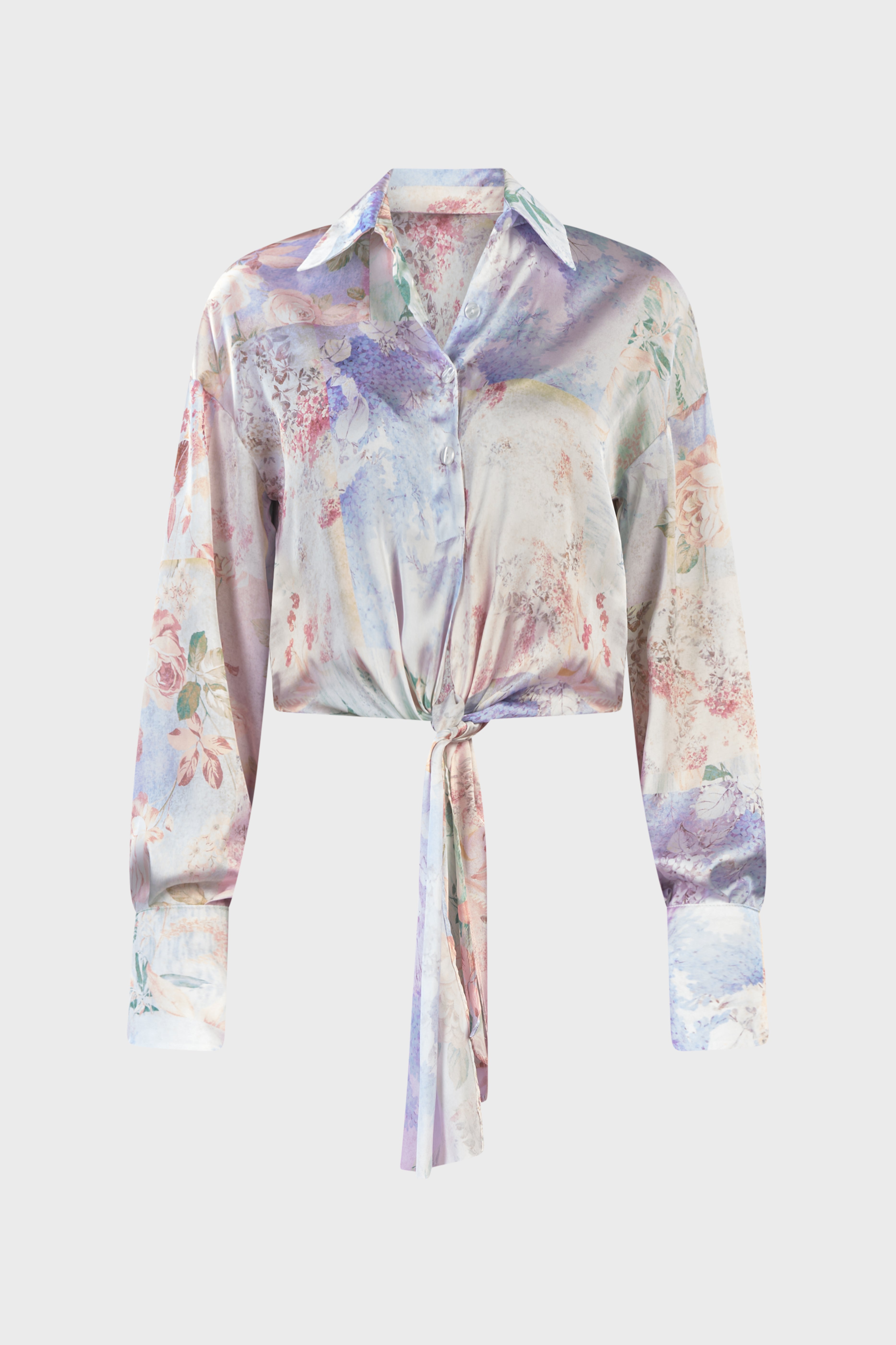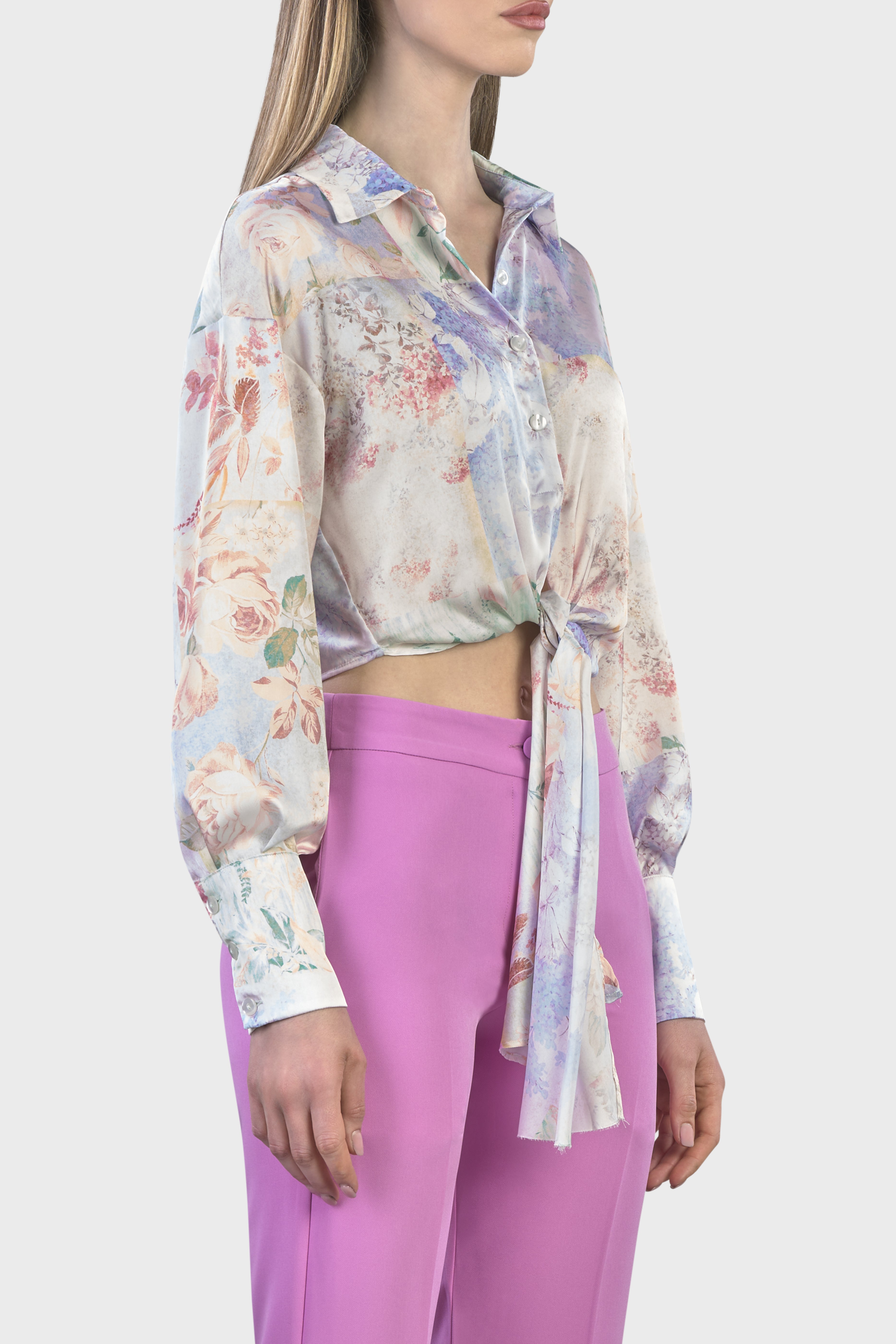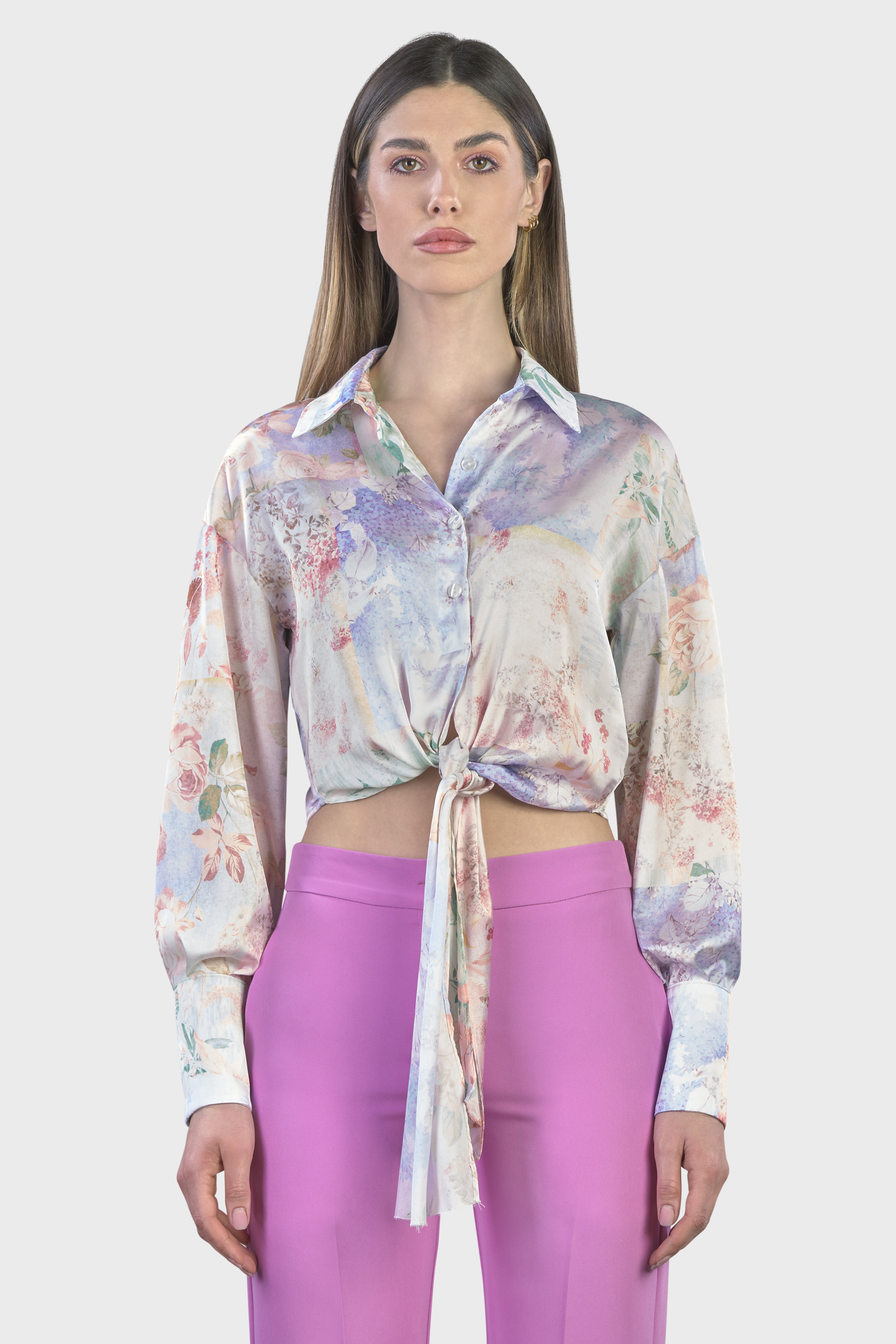 Il design di questa camicia cropped è caratterizzato dal taglio della spalla scesa che culmina in una manica voluminosa. L’elegante silhouette si contraddistingue grazie ai due ampi lembi da annodare in vita, creando varie opzioni di styling. E’ realizzata in una stampa floreale su raso, tessuto in grado di conferire una consistenza distintiva e resistente. Completano il modello il colletto a punta, la semi-apertura frontale, ornata da 4 bottoni in madreperla tono su tono e le maniche lunghe con polsi a doppia altezza. Le camicie crop vanno d’accordo con tutto: possono essere abbinate a pantaloni eleganti per un look da ufficio sofisticato, o con jeans per un'interpretazione più casual e raffinata.