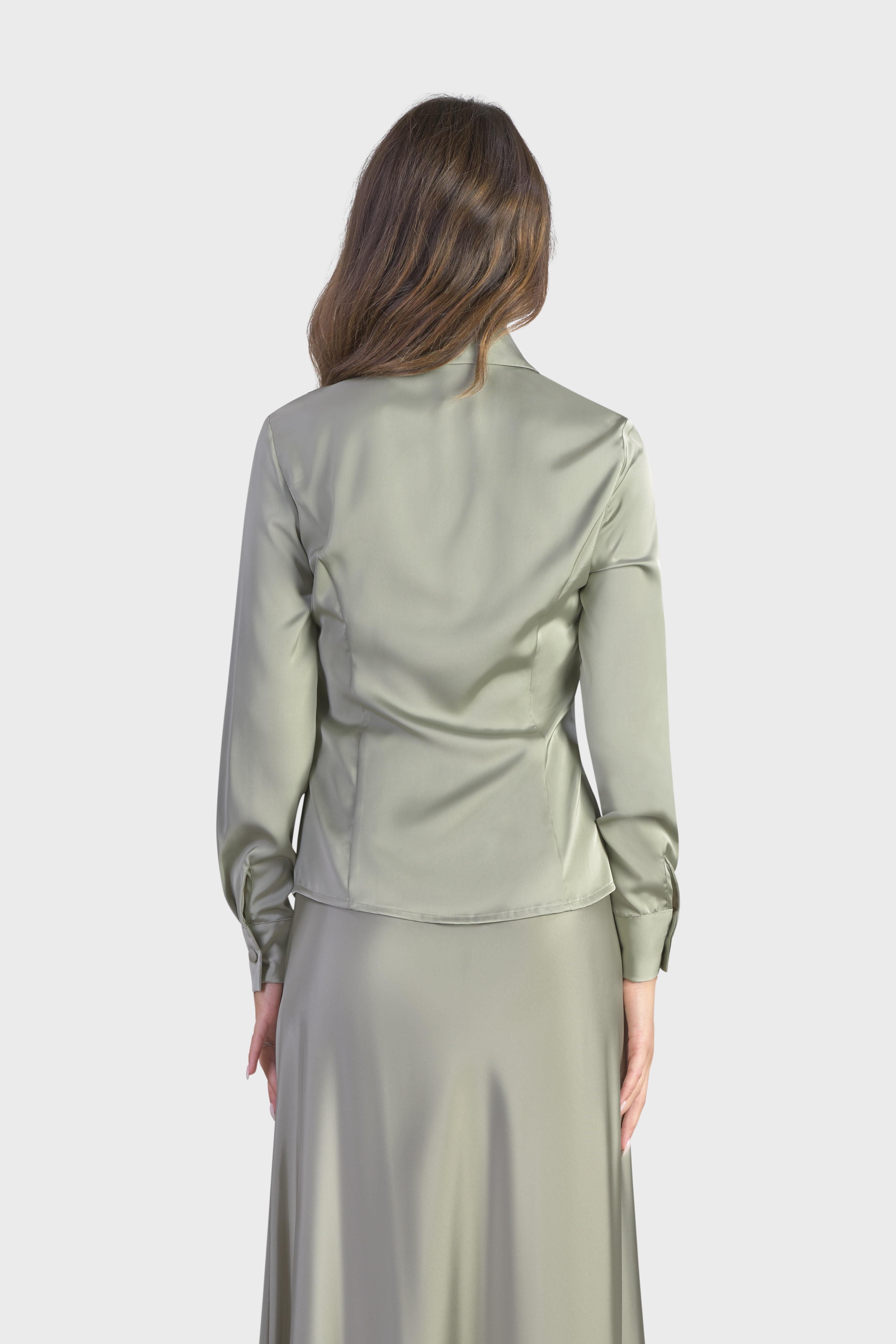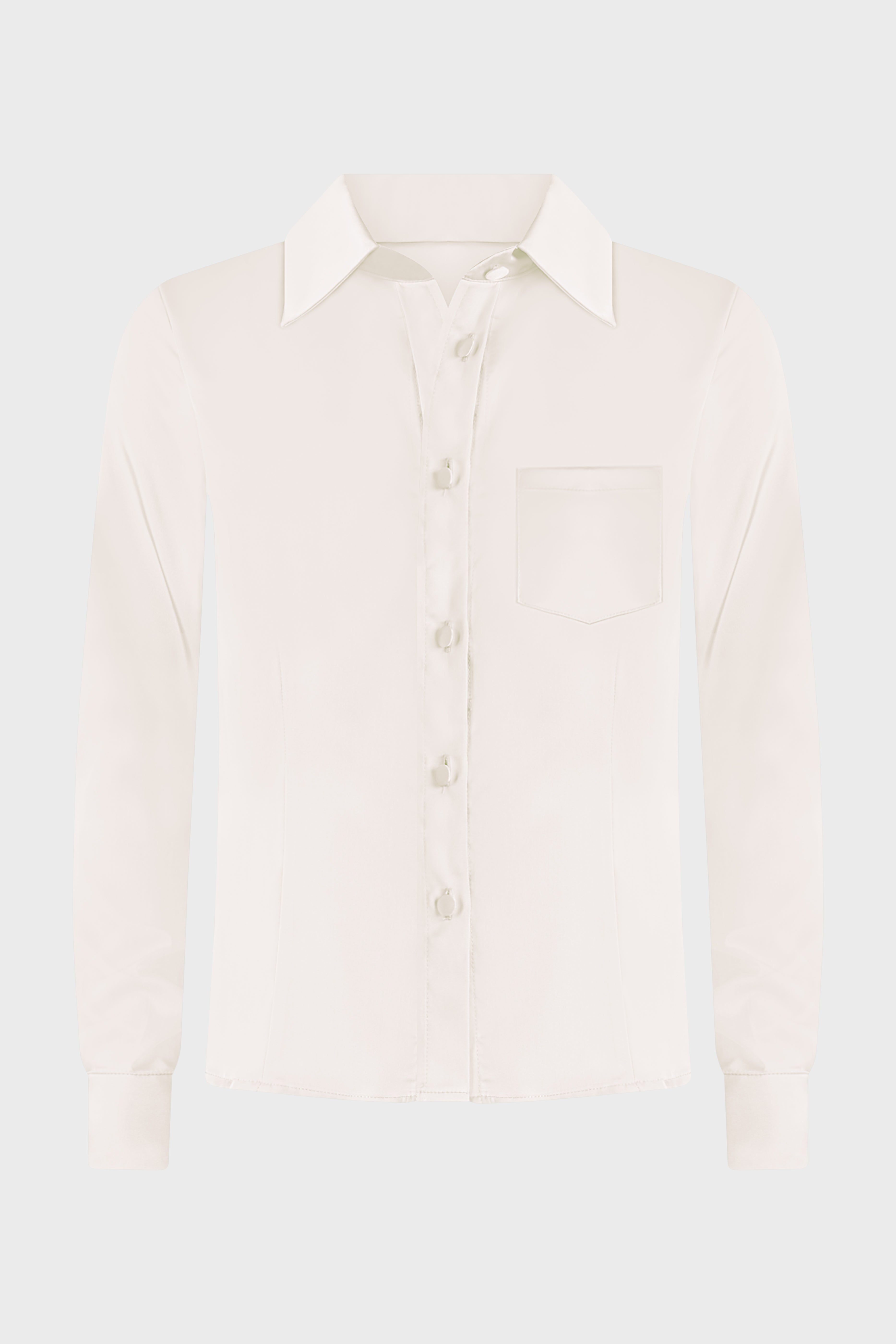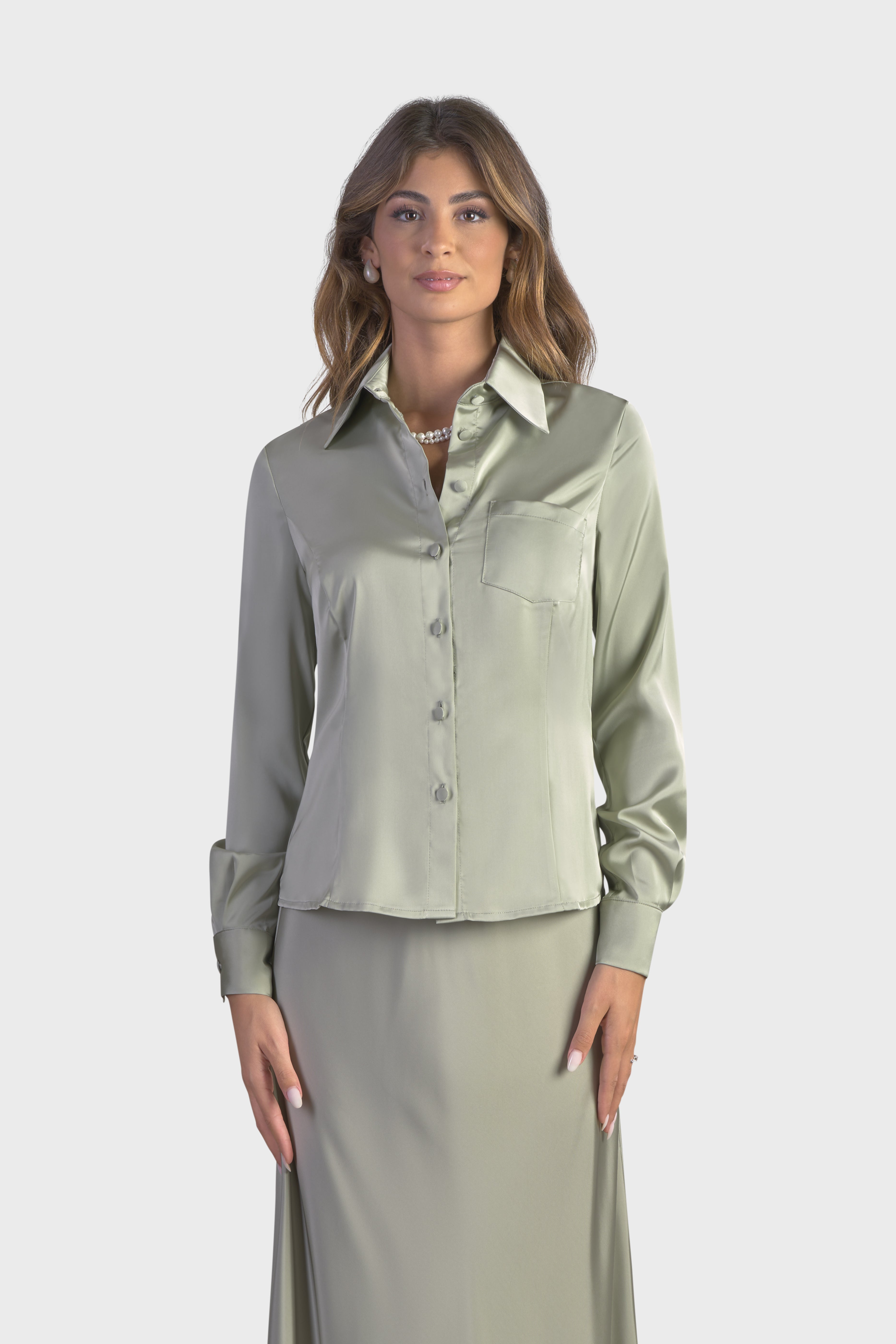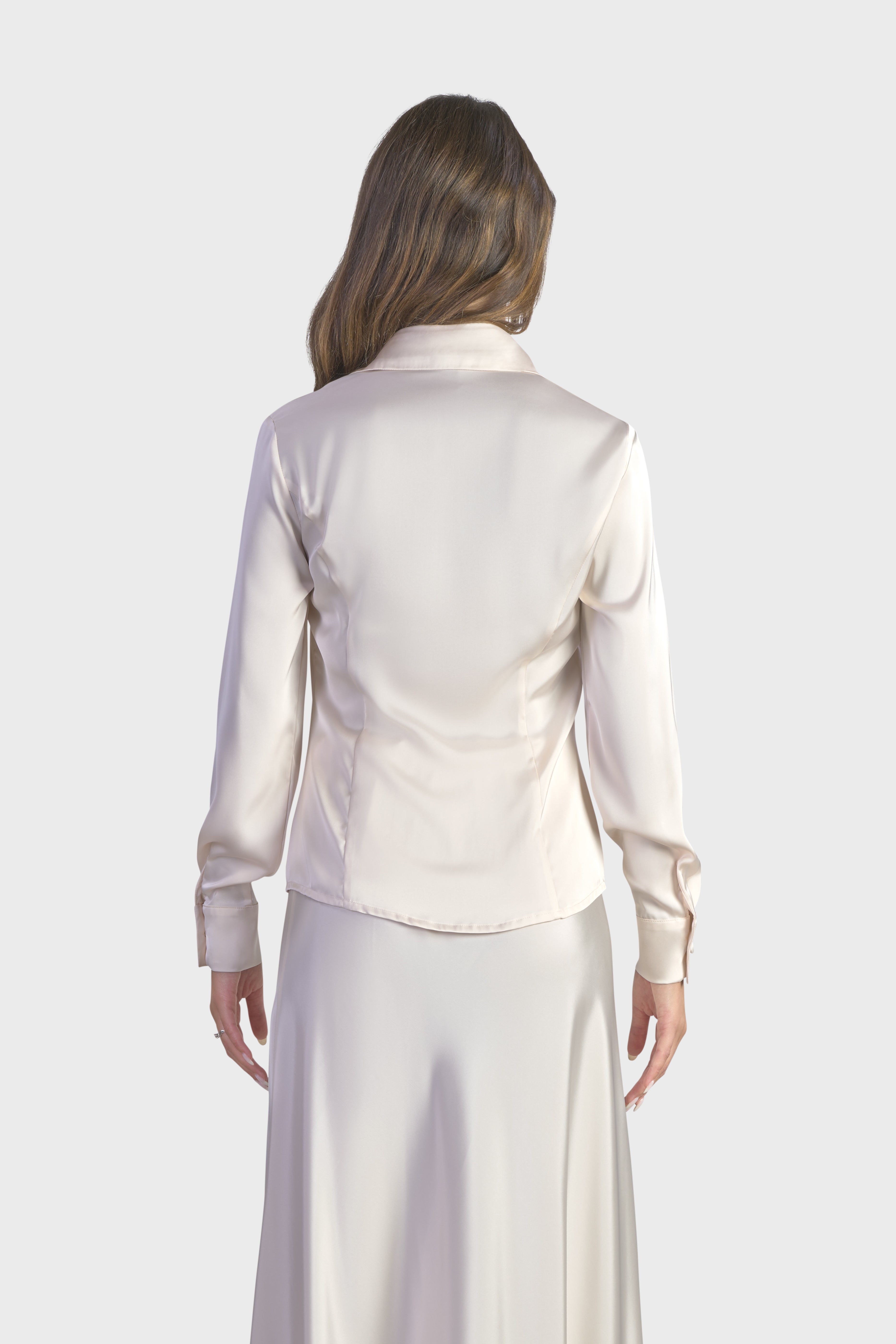Le linee avvitate di questa camicia a maniche lunghe donano sensualità e raffinatezza. Realizzata in raso, tessuto liscio e piacevole al tatto. Il modello è caratterizzato dal colletto a punta e l’abbottonatura sul davanti arricchita dai bottoni rivestiti in tessuto. A completare la camicia è l’elegante taschino sul cuore. Ideale da indossare con facilità insieme alla gonna Iside in coordinato della collezione,per un look chic e senza tempo.