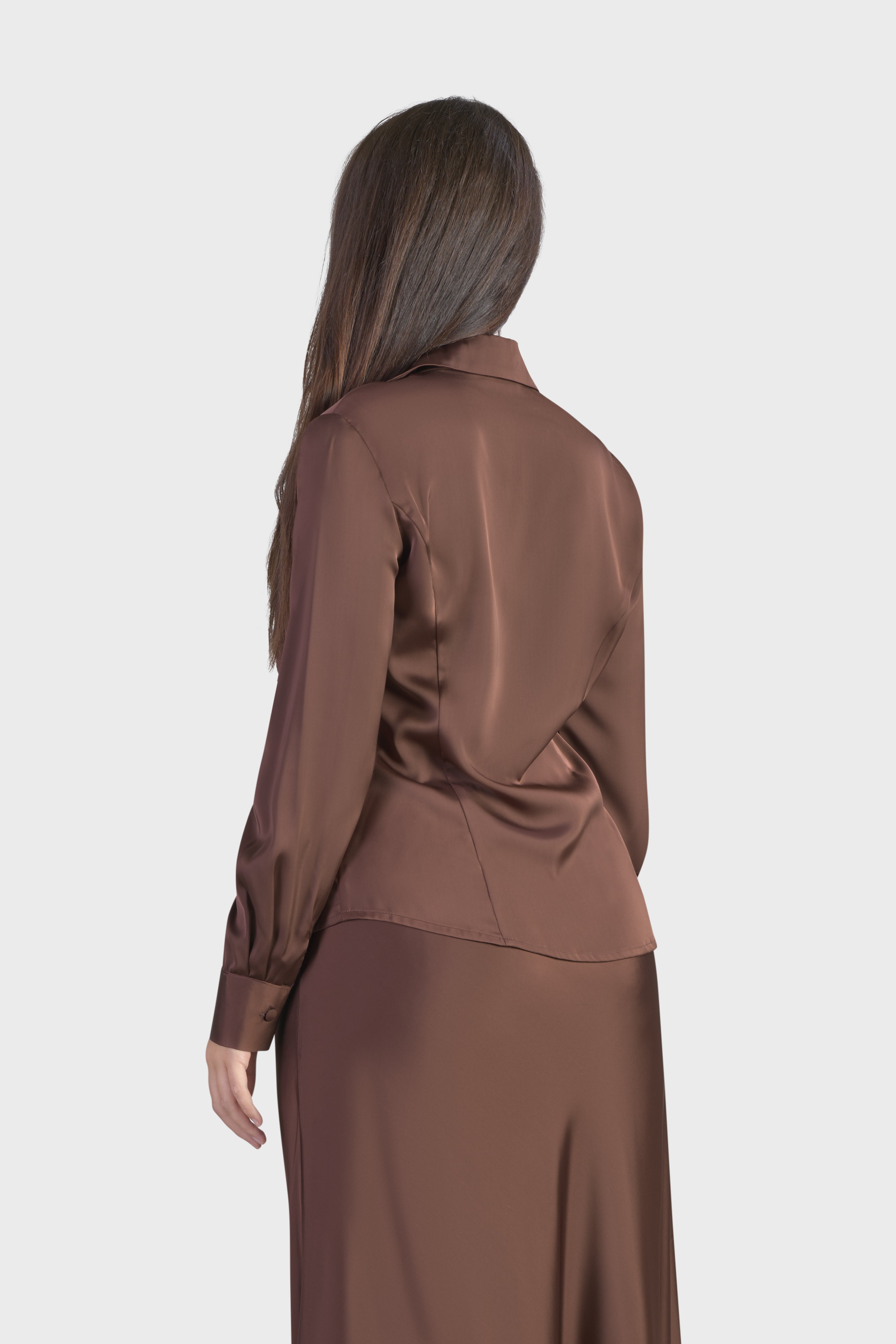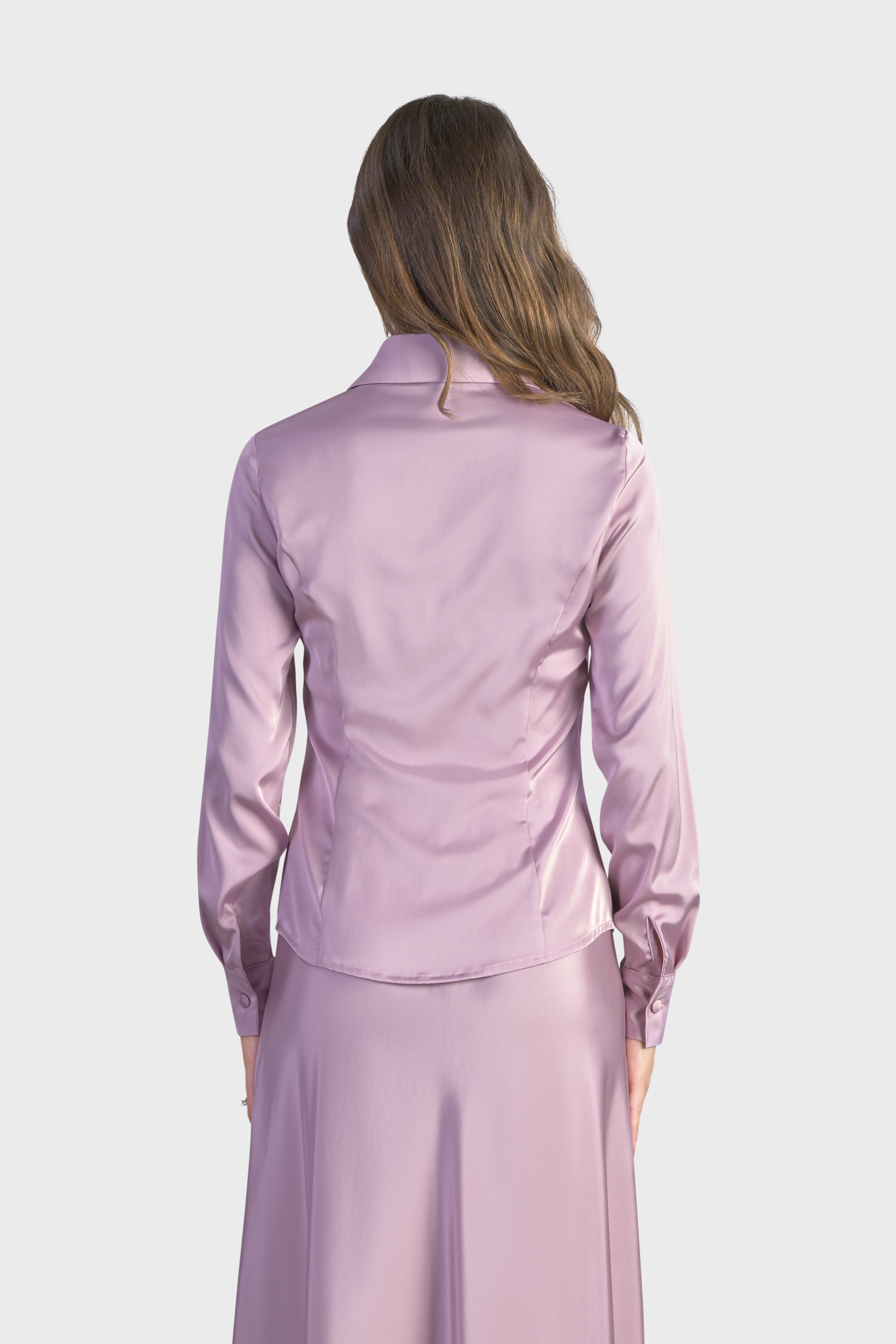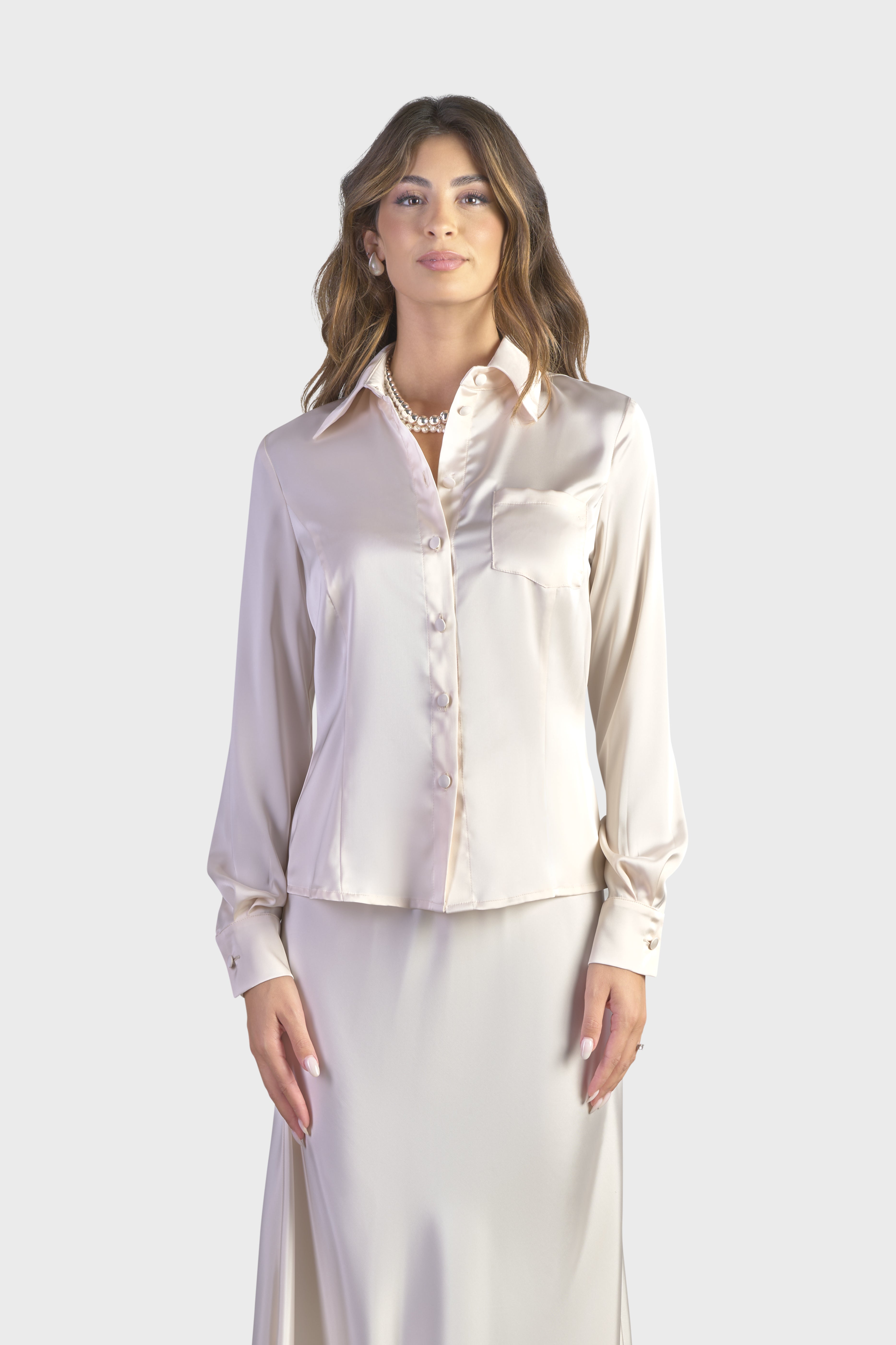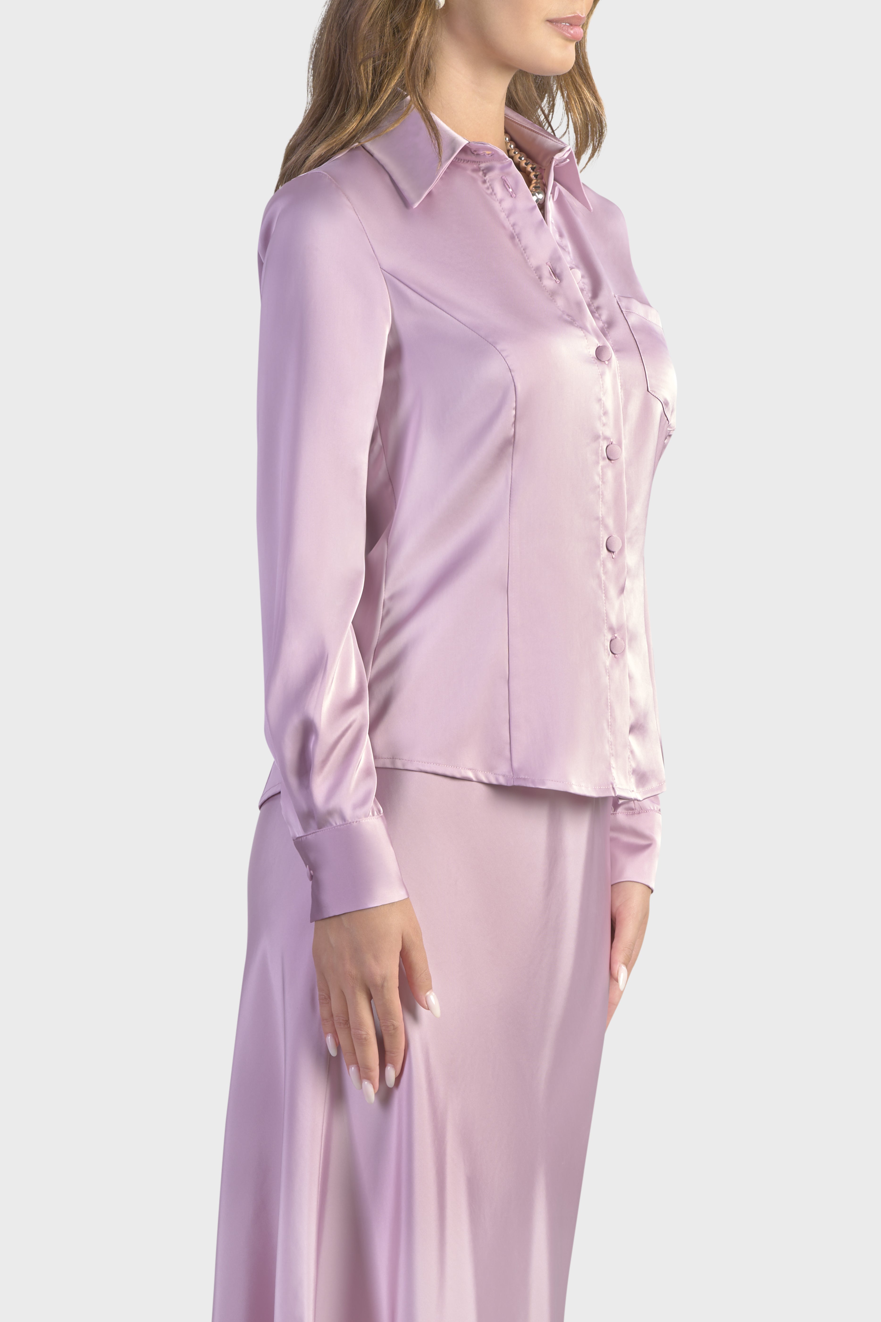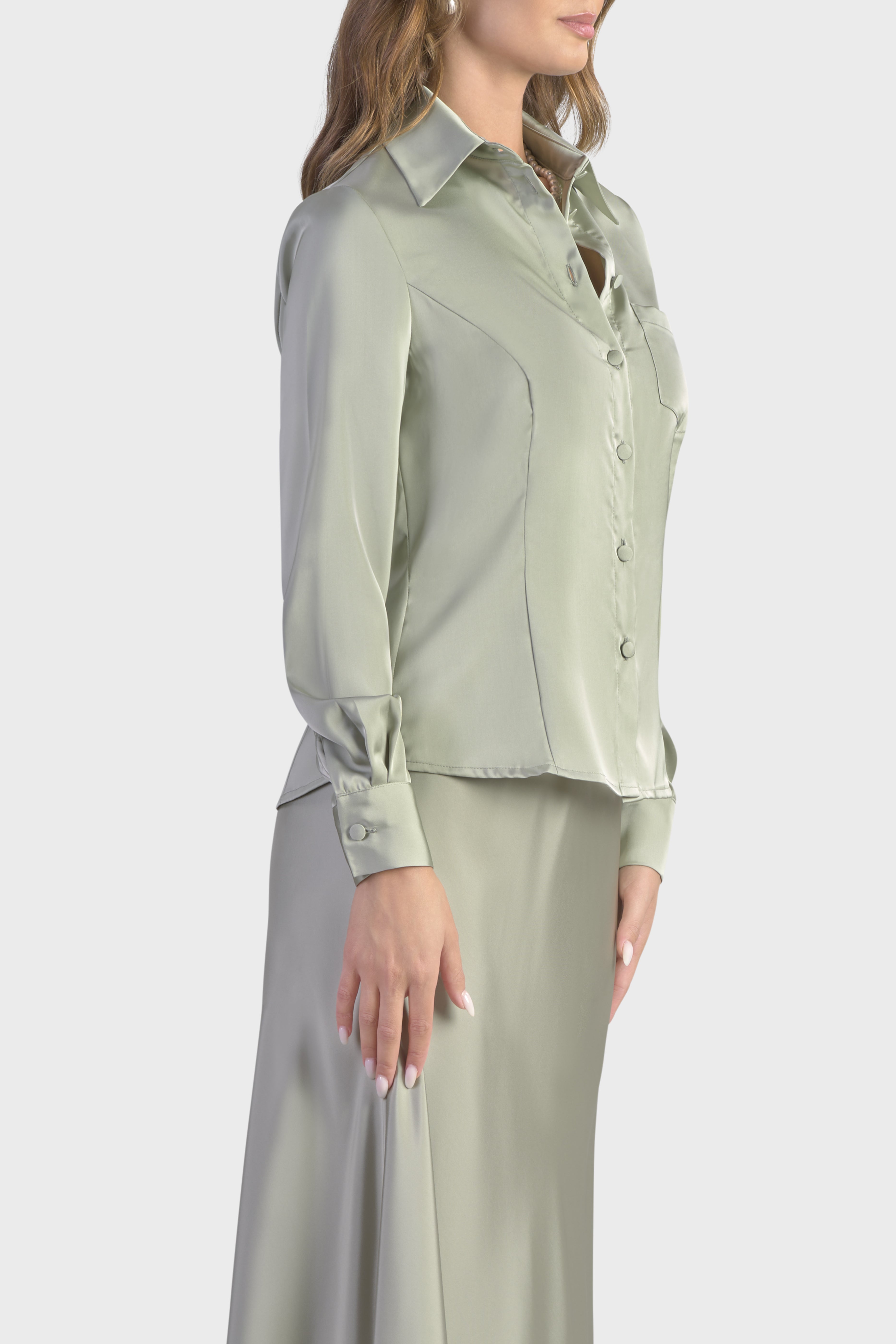 Le linee avvitate di questa camicia a maniche lunghe donano sensualità e raffinatezza. Realizzata in raso, tessuto liscio e piacevole al tatto. Il modello è caratterizzato dal colletto a punta e l’abbottonatura sul davanti arricchita dai bottoni rivestiti in tessuto. A completare la camicia è l’elegante taschino sul cuore. Ideale da indossare con facilità insieme alla gonna Iside in coordinato della collezione,per un look chic e senza tempo.
