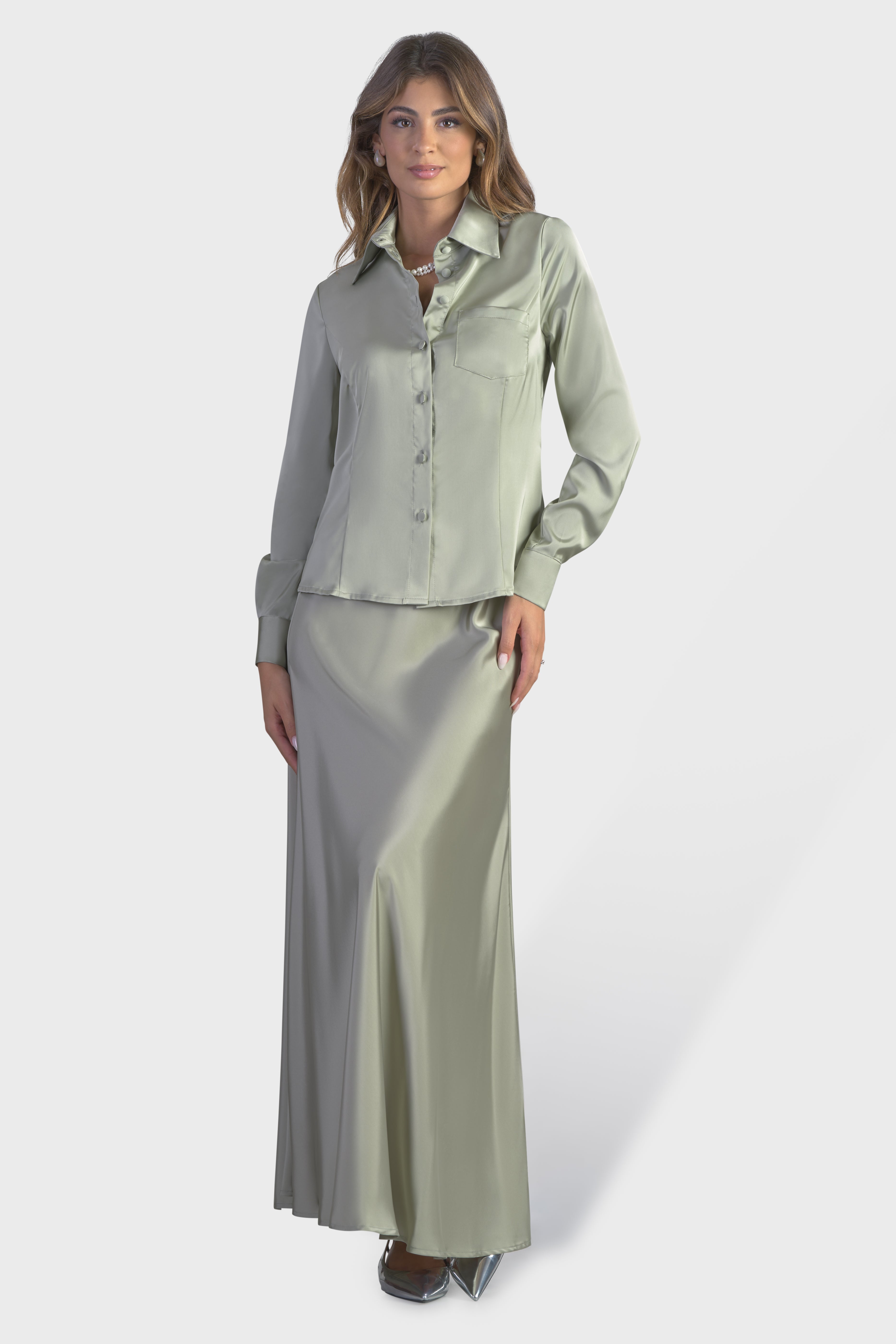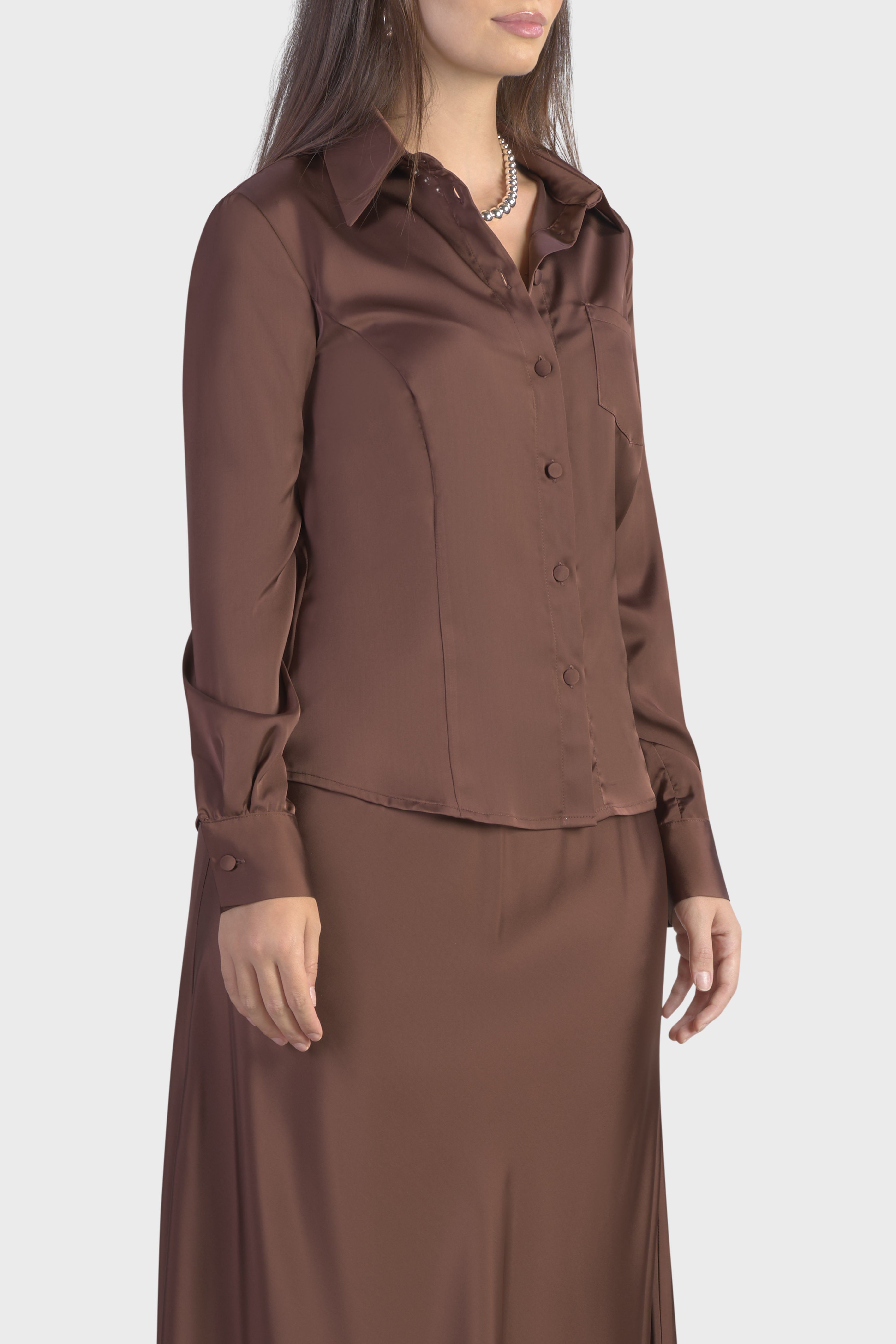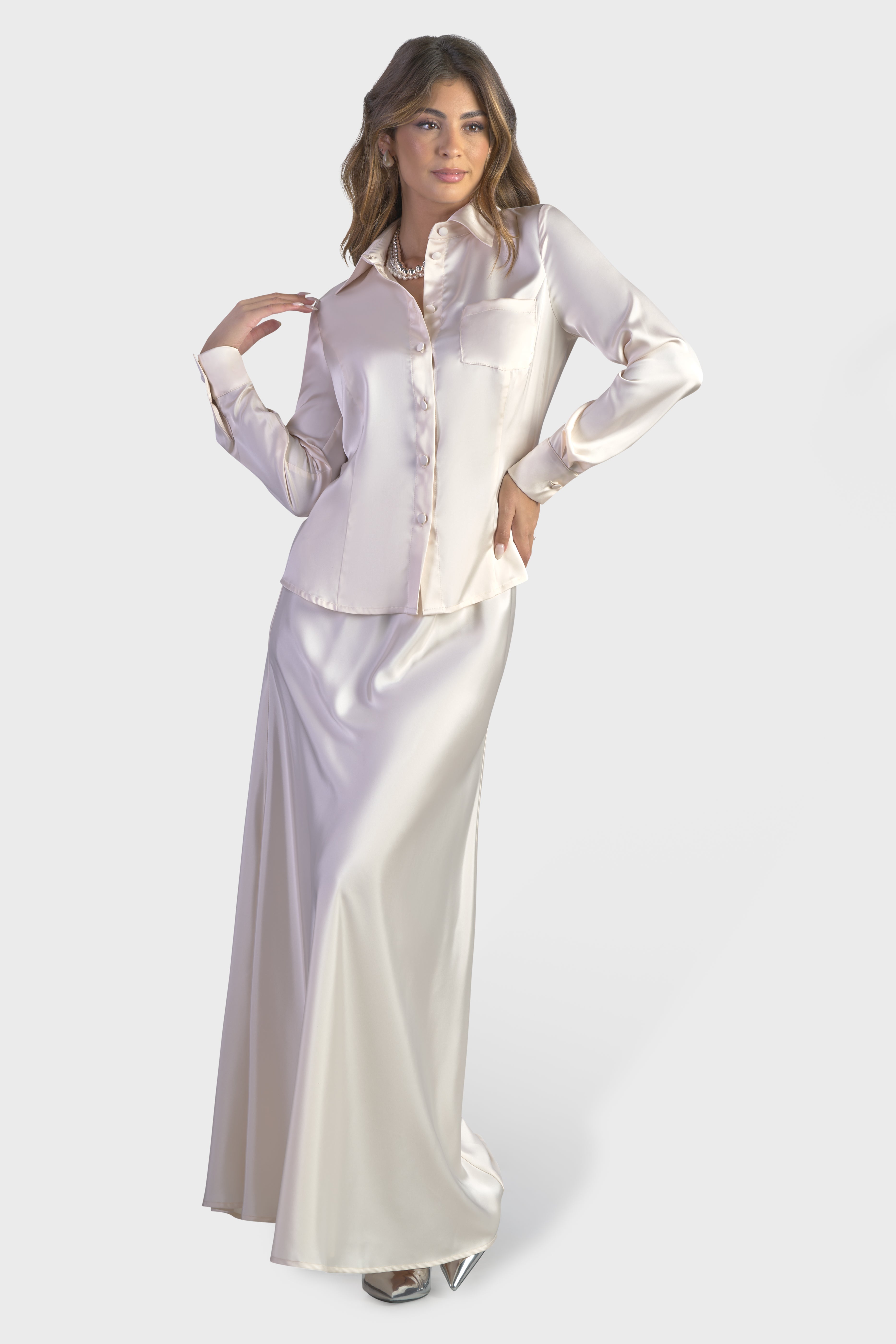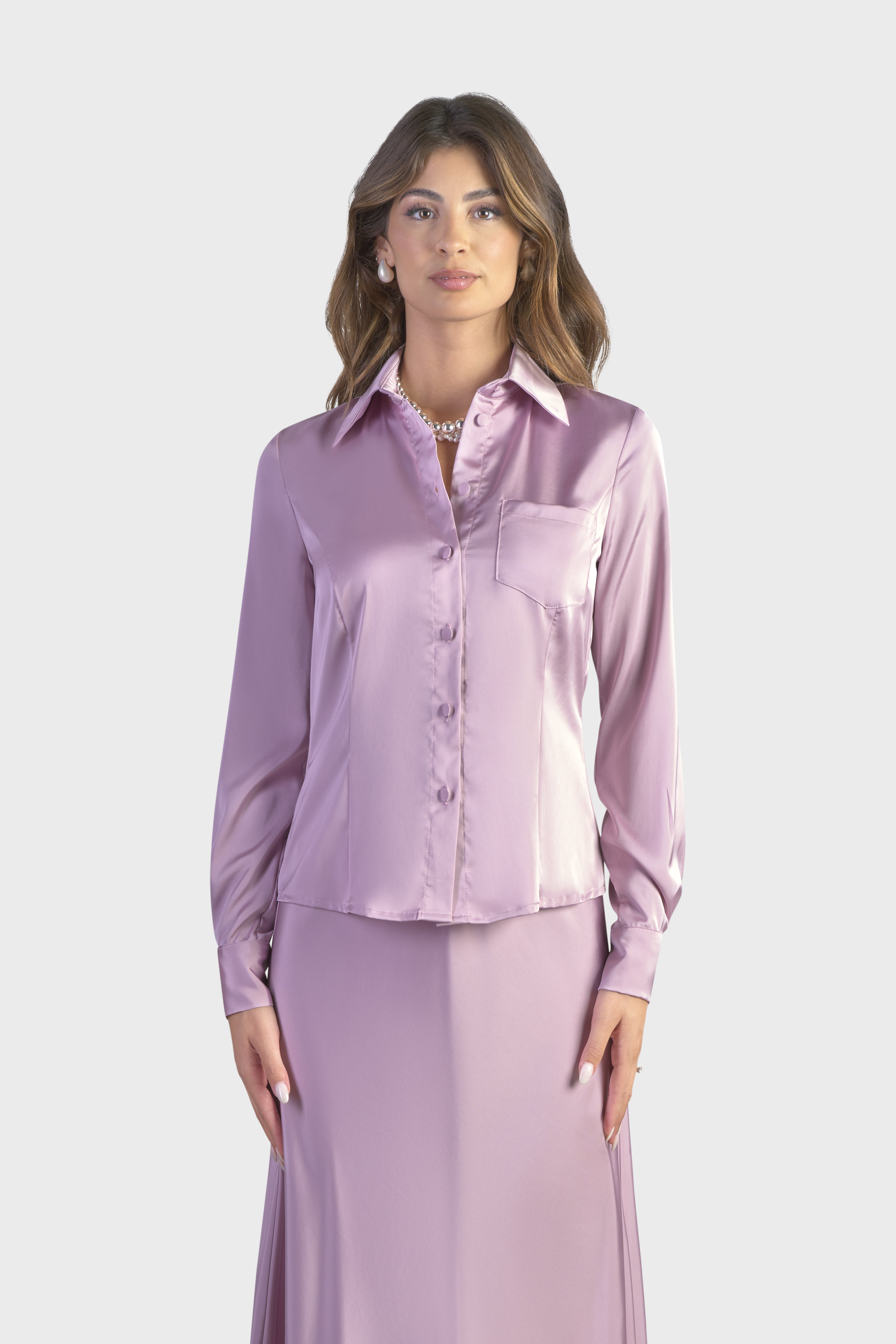 Le linee avvitate di questa camicia a maniche lunghe donano sensualità e raffinatezza. Realizzata in raso, tessuto liscio e piacevole al tatto. Il modello è caratterizzato dal colletto a punta e l’abbottonatura sul davanti arricchita dai bottoni rivestiti in tessuto. A completare la camicia è l’elegante taschino sul cuore. Ideale da indossare con facilità insieme alla gonna Iside in coordinato della collezione,per un look chic e senza tempo.