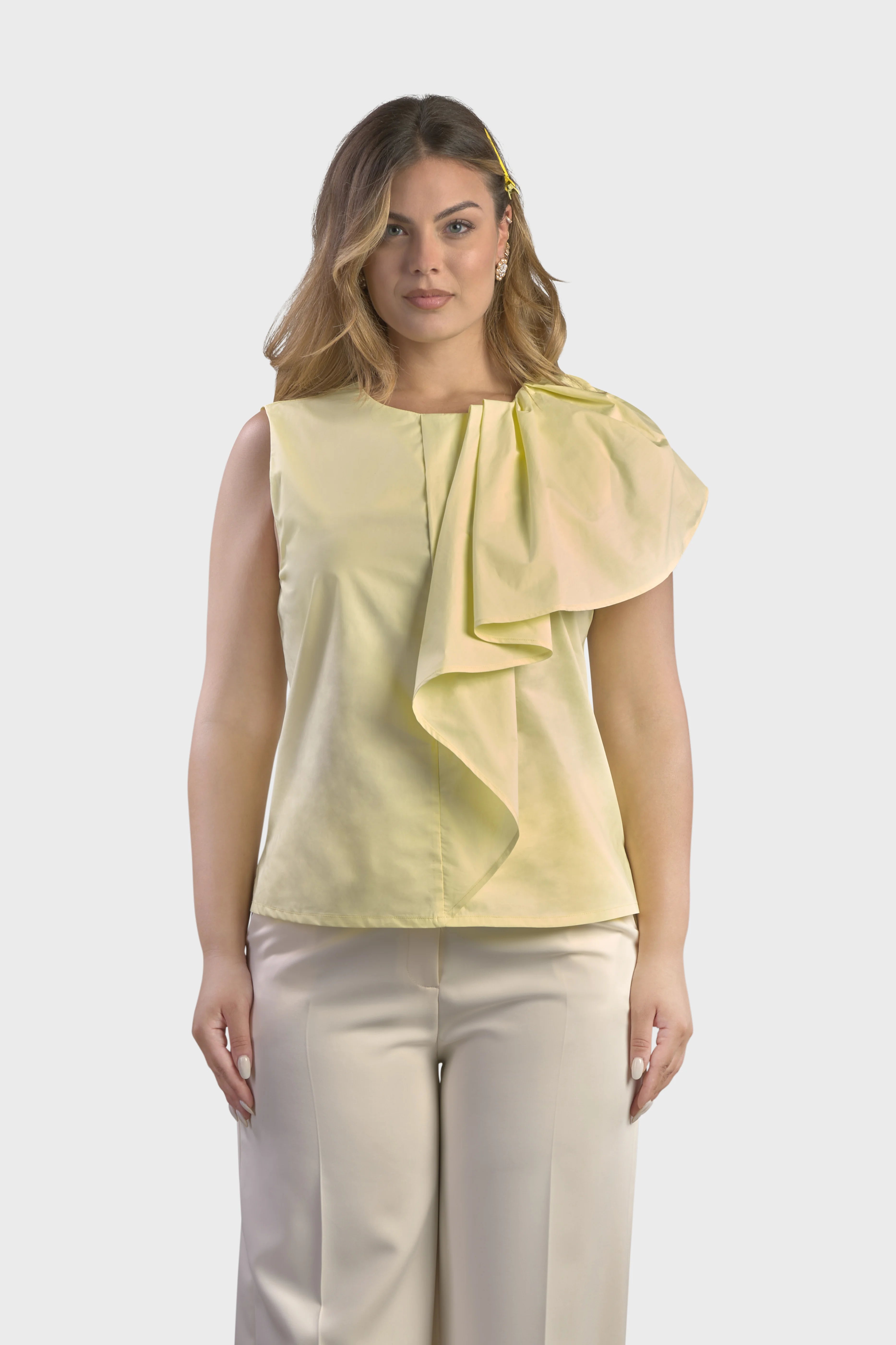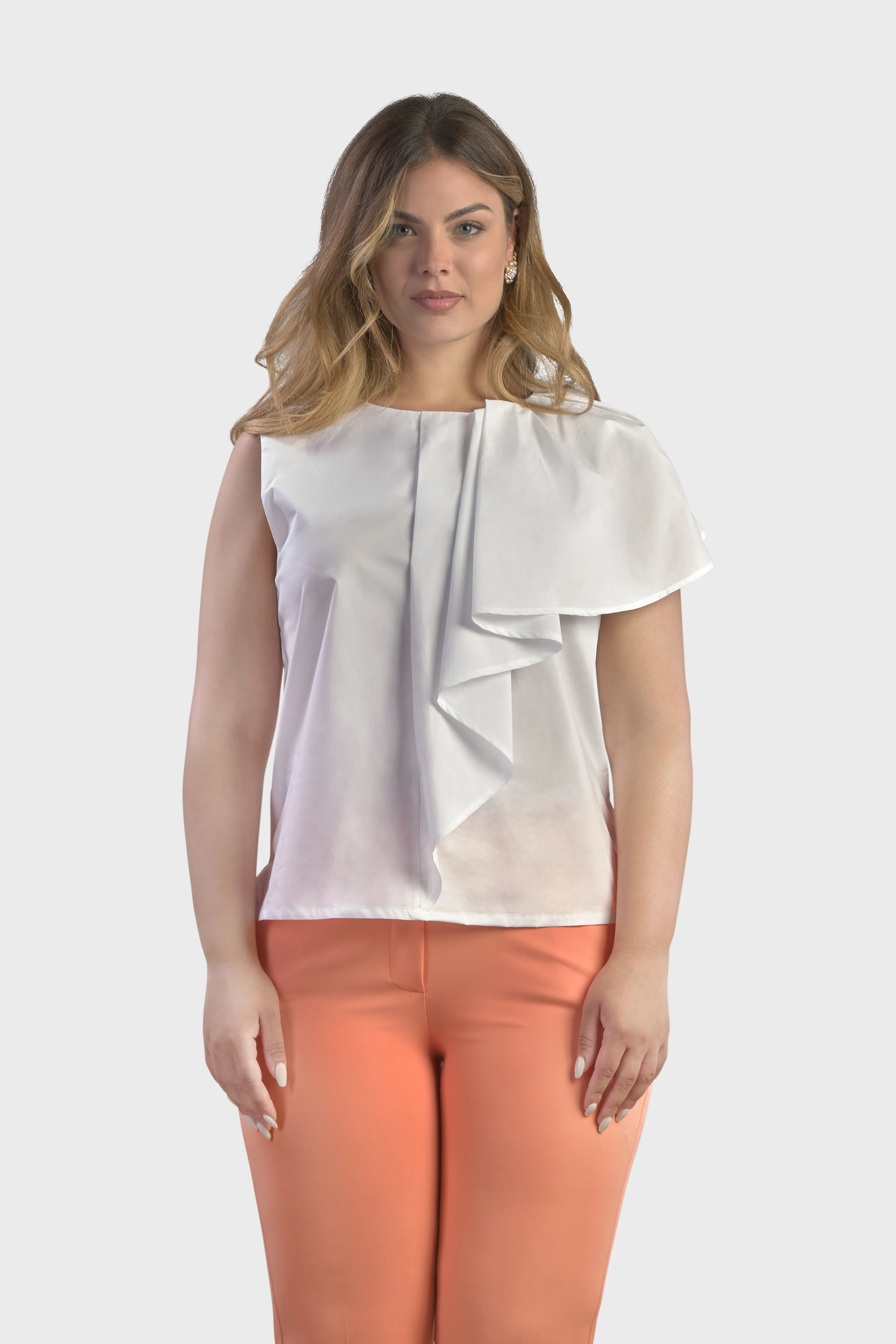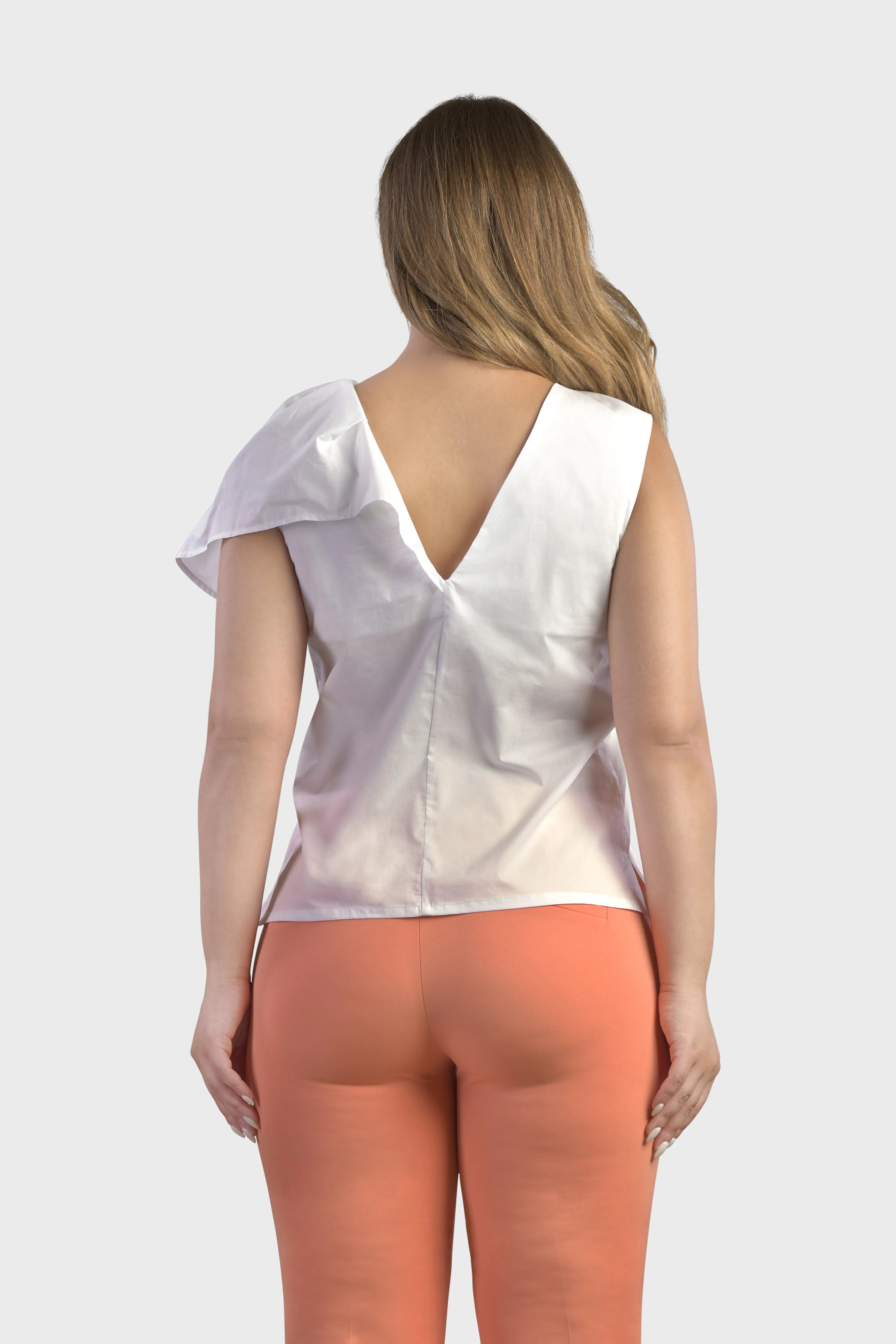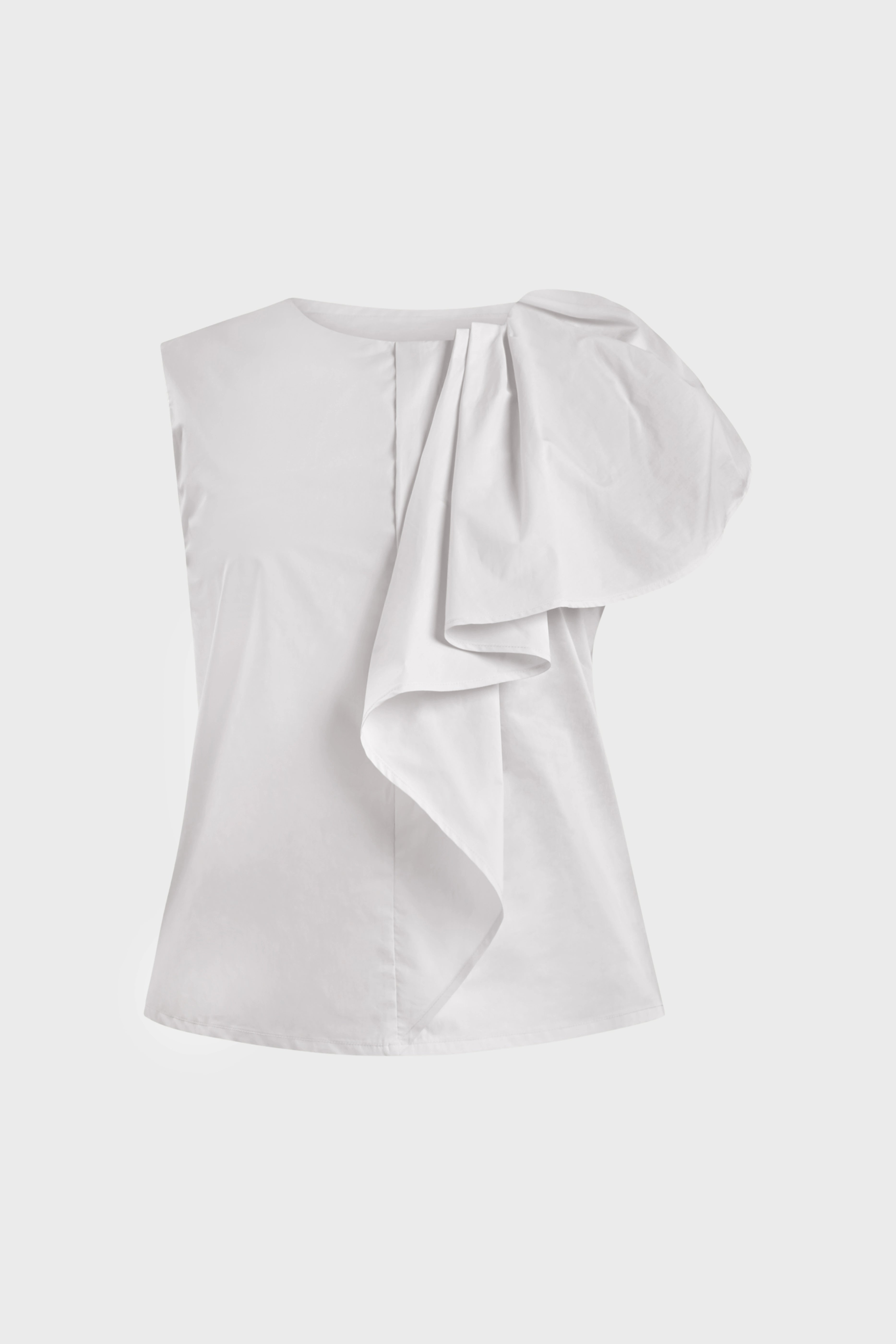 Le linee di questo top smanicato delineano una silhouette dal taglio morbido. Realizzato in popeline di cotone, tessuto fresco e leggero. È caratterizzato dall’ampio volant sulla spalla in grado di creare uno splendido effetto geometrico rendendo il capo unico e ricercato. Il modello presenta uno scollo girocollo sul davanti che scende a V sul retro. A completare il top è il fondo con spacchetti sul fianco. Ideale da indossare per un pranzo domenicale abbinato alla gonna della collezione per un look spensierato e alla moda.