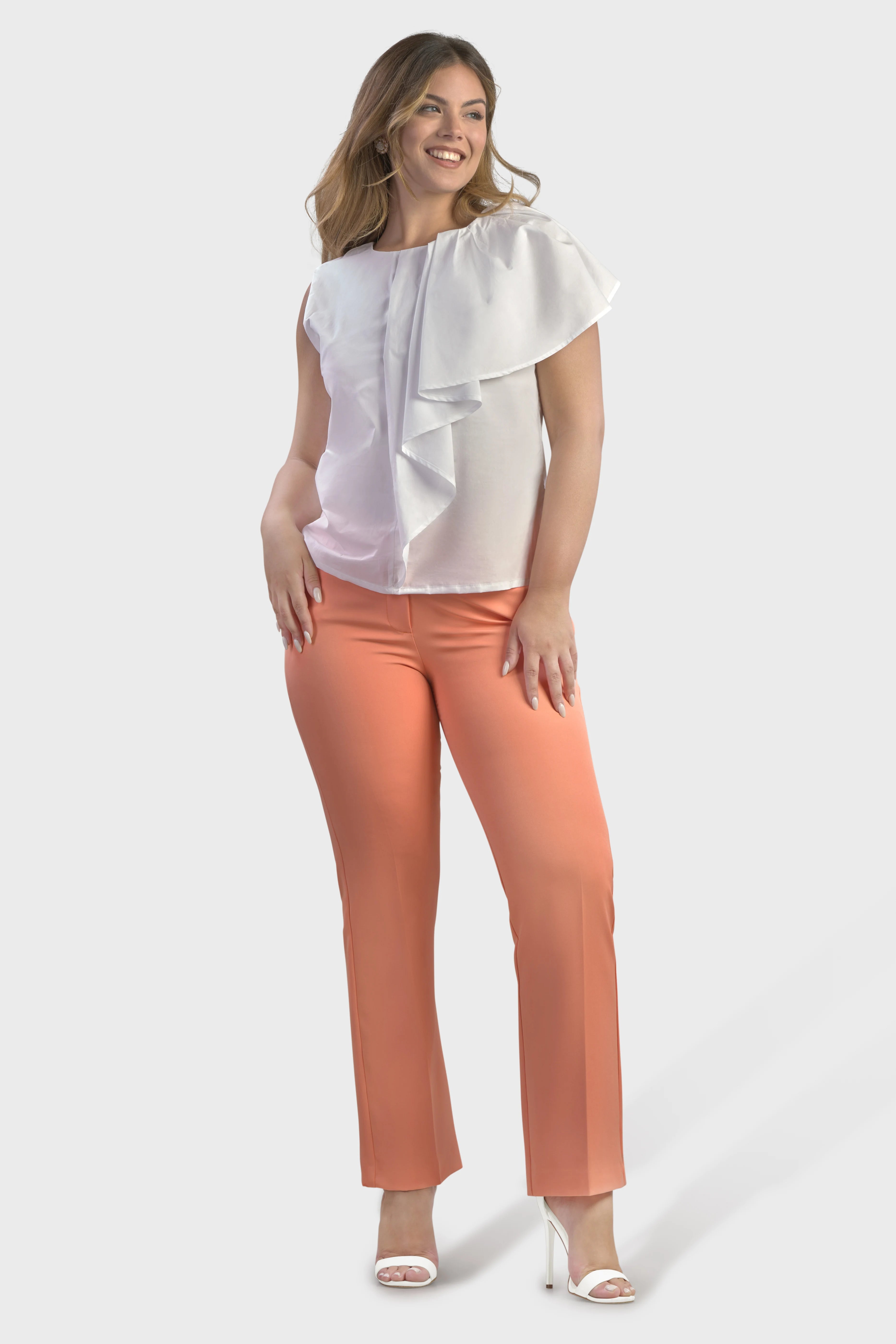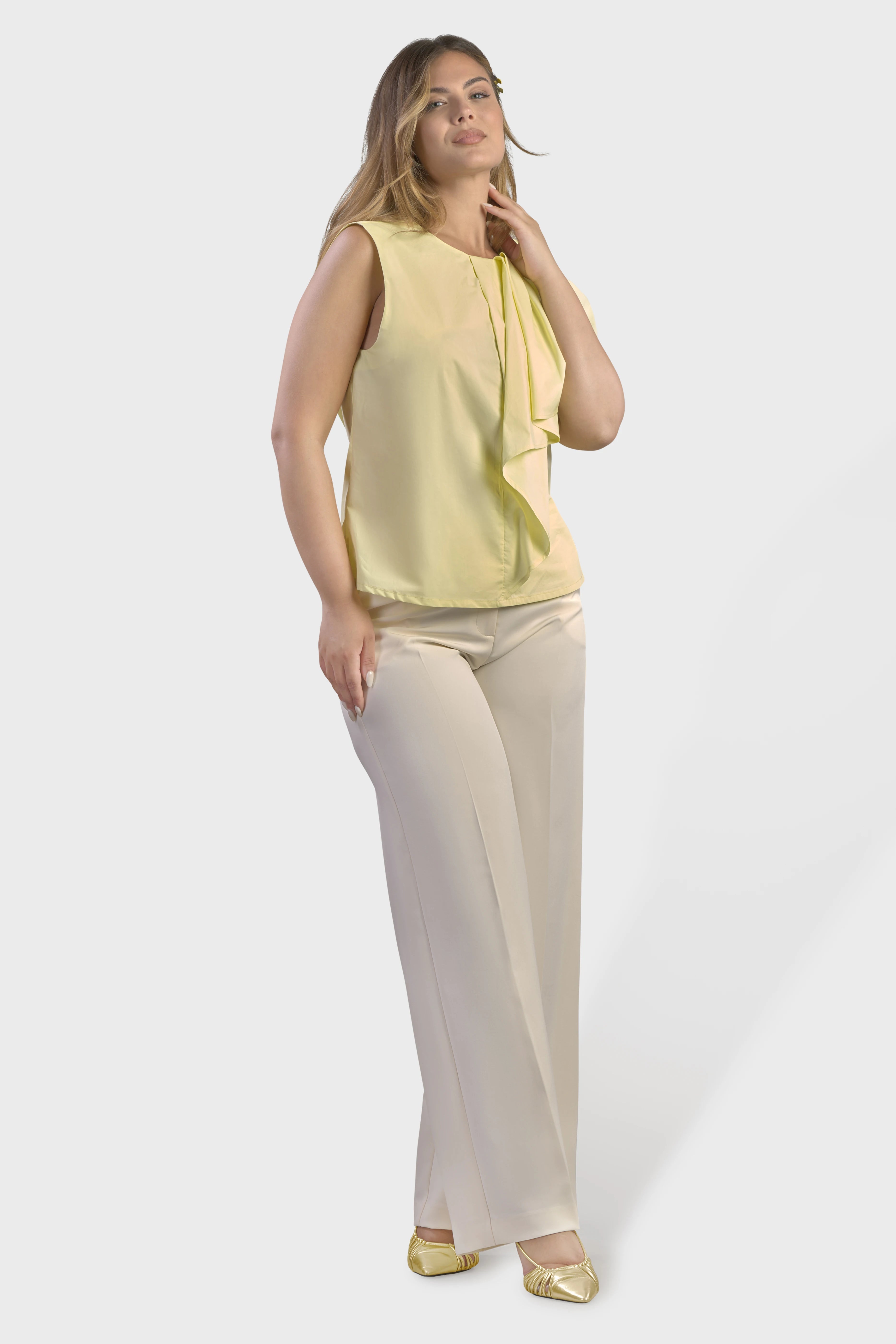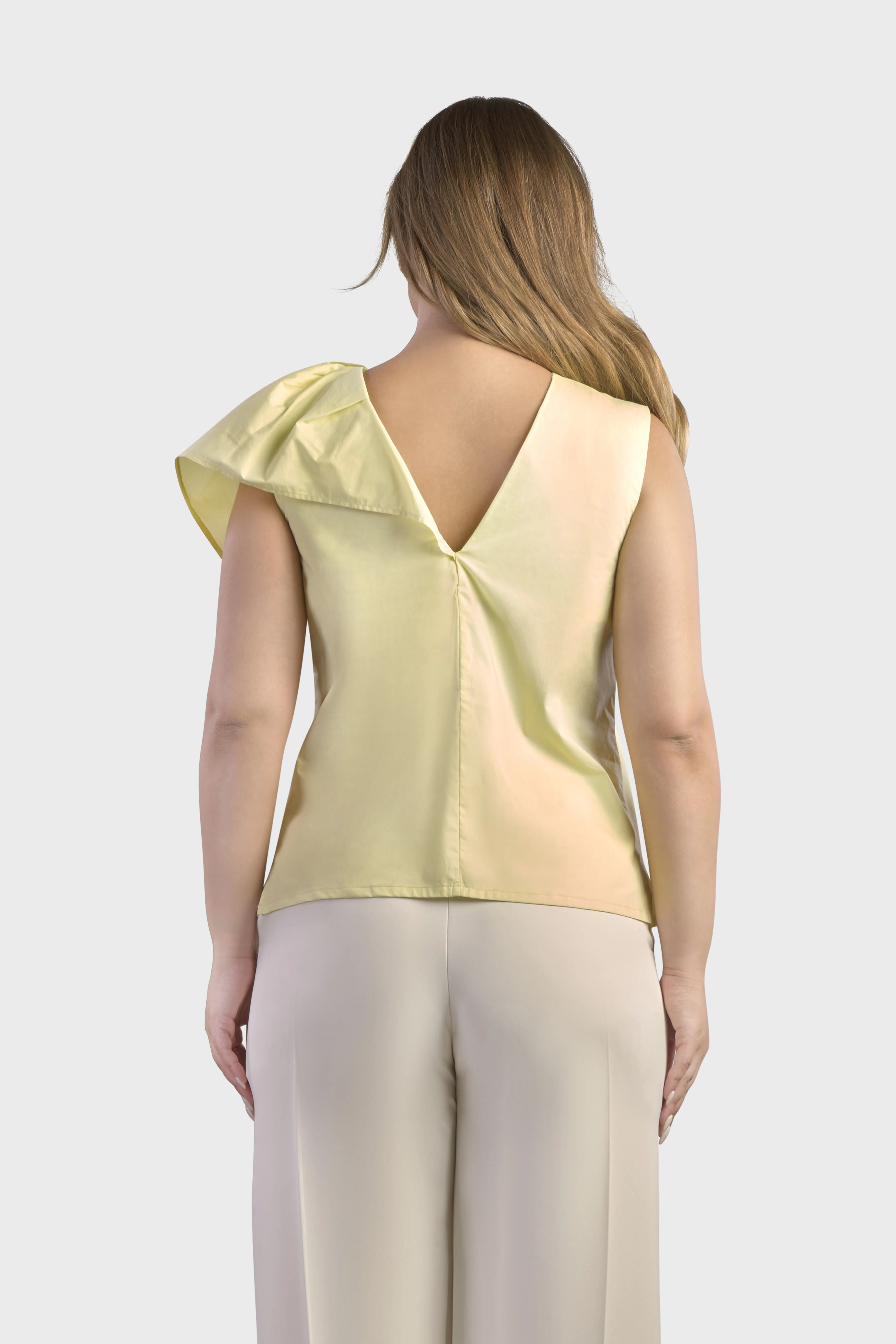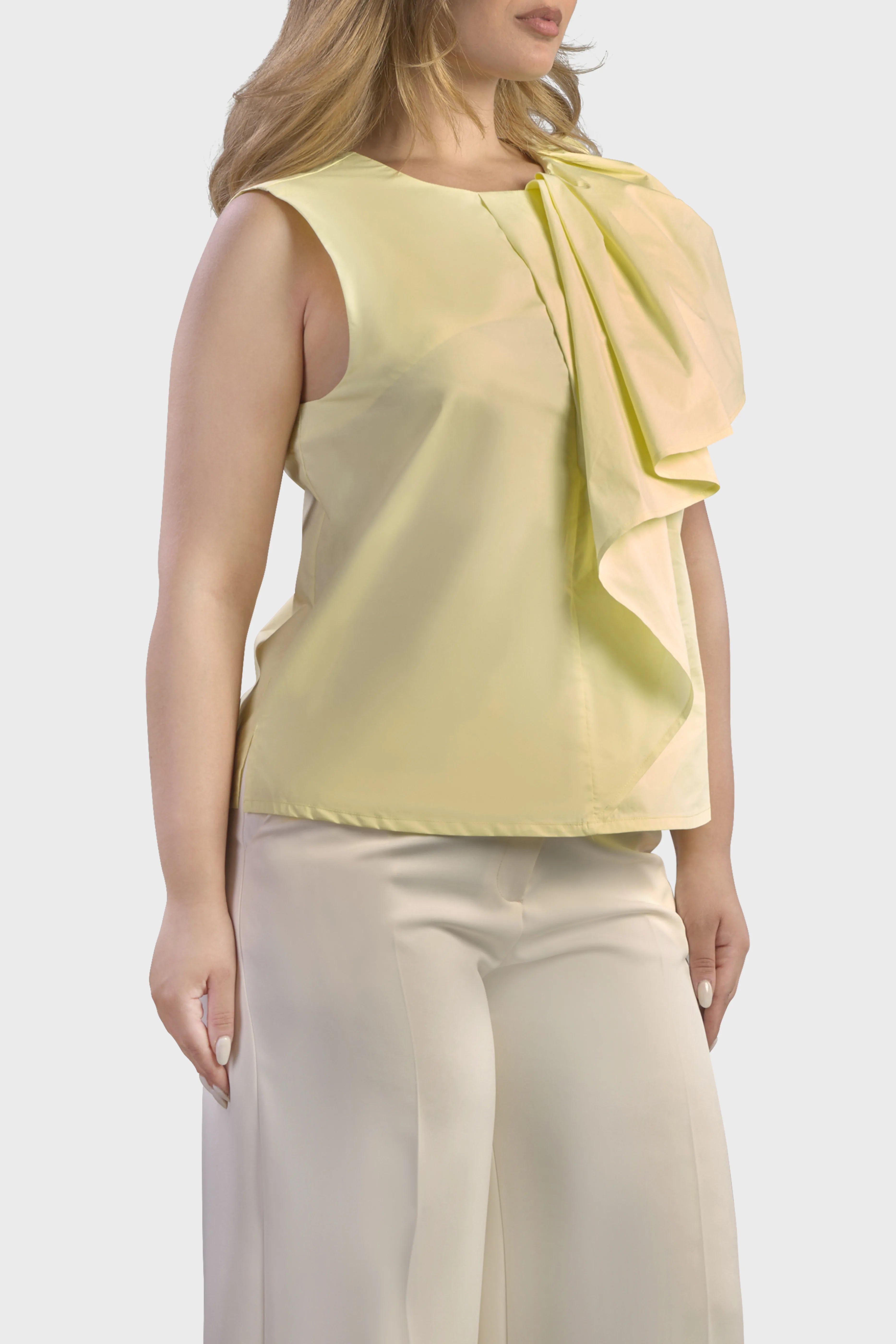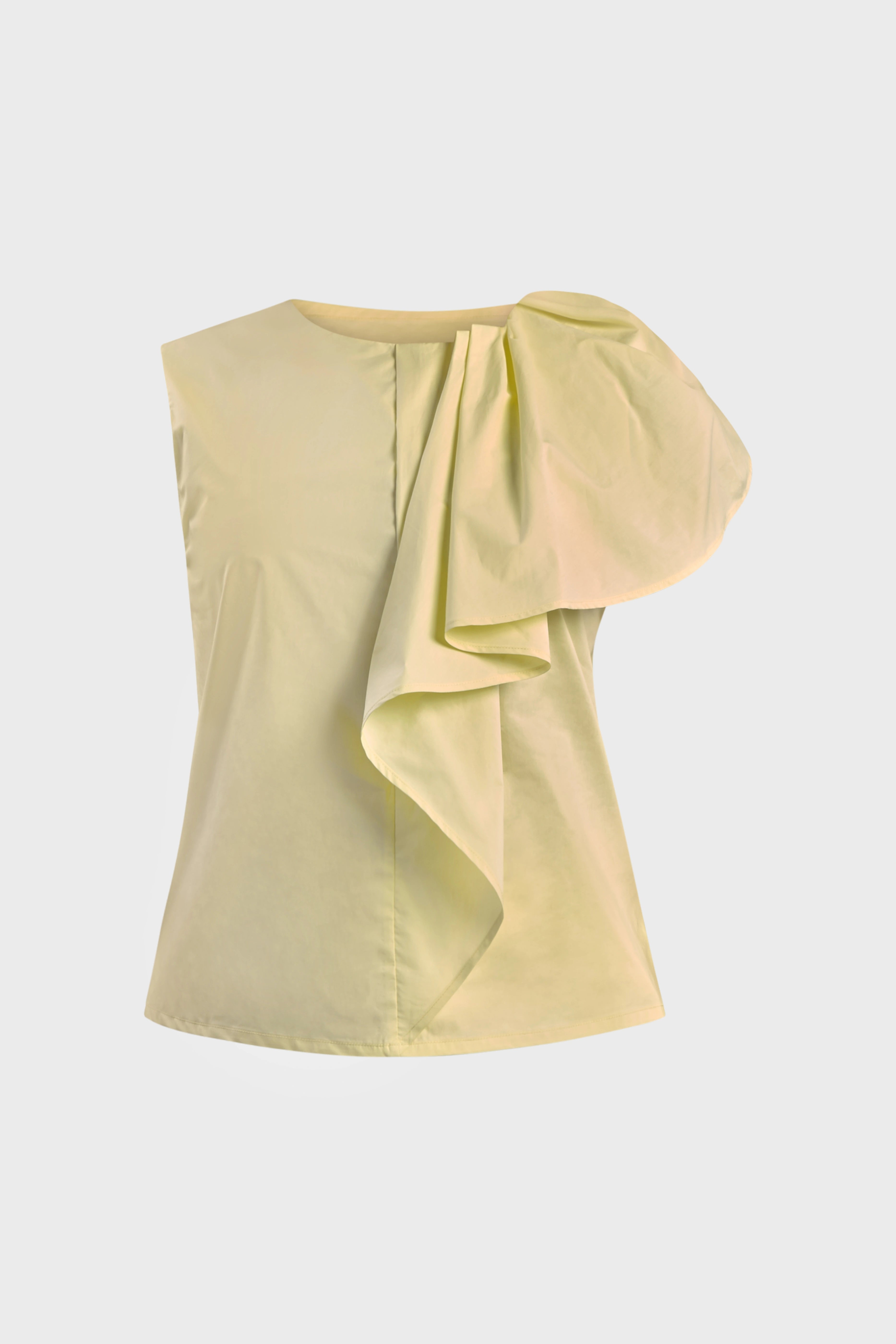Le linee di questo top smanicato delineano una silhouette dal taglio morbido. Realizzato in popeline di cotone, tessuto fresco e leggero. È caratterizzato dall’ampio volant sulla spalla in grado di creare uno splendido effetto geometrico rendendo il capo unico e ricercato. Il modello presenta uno scollo girocollo sul davanti che scende a V sul retro. A completare il top è il fondo con spacchetti sul fianco. Ideale da indossare per un pranzo domenicale abbinato alla gonna della collezione per un look spensierato e alla moda.