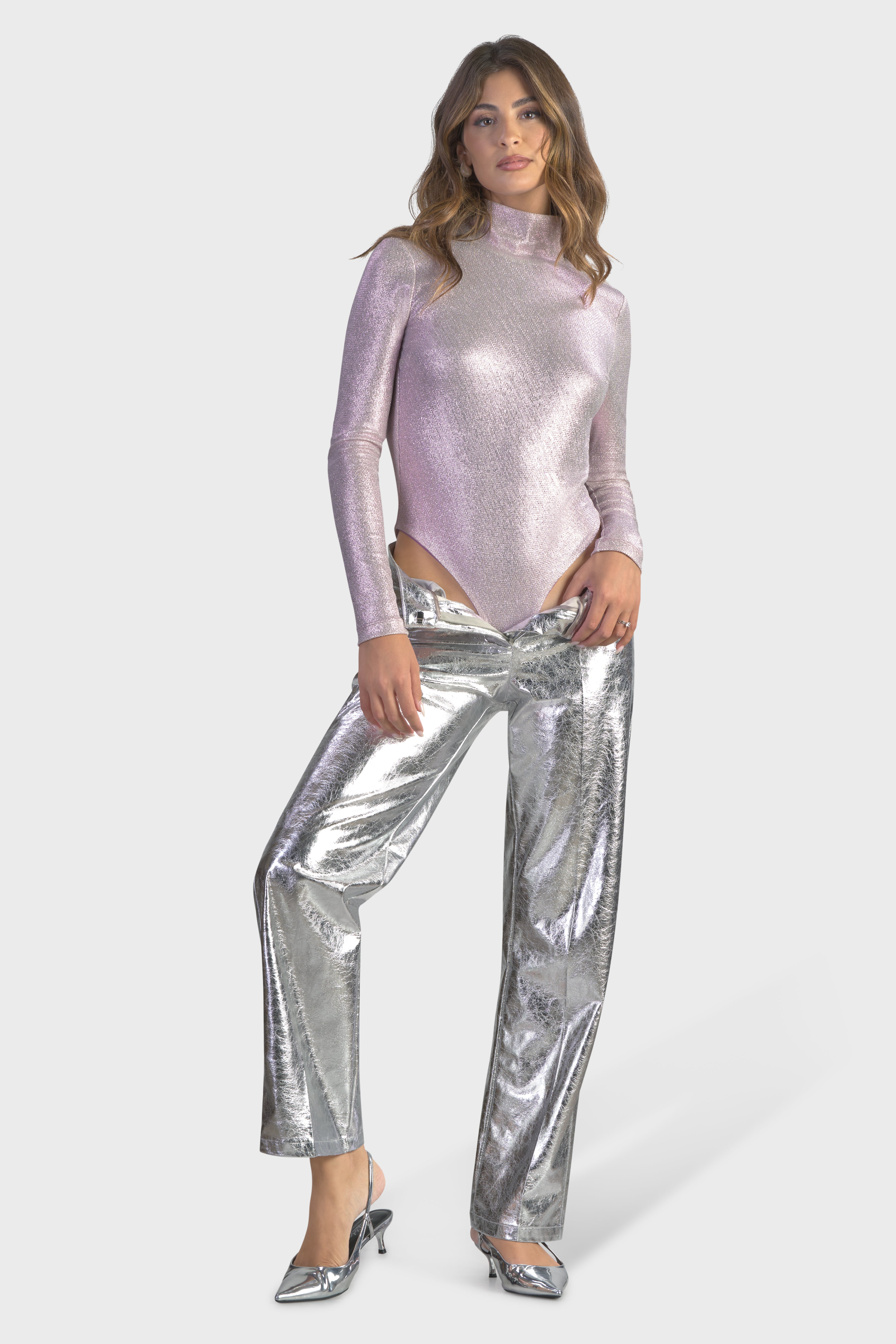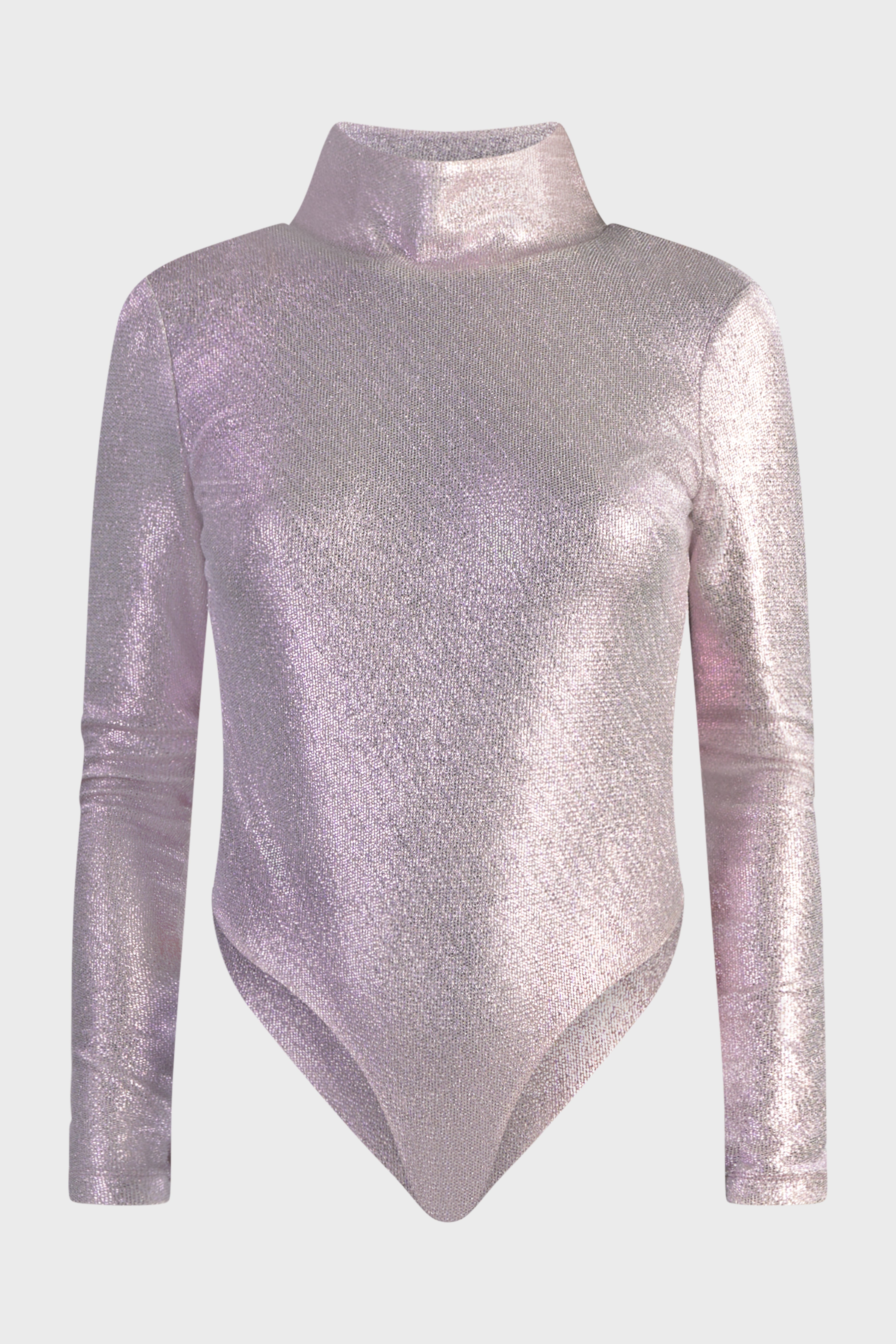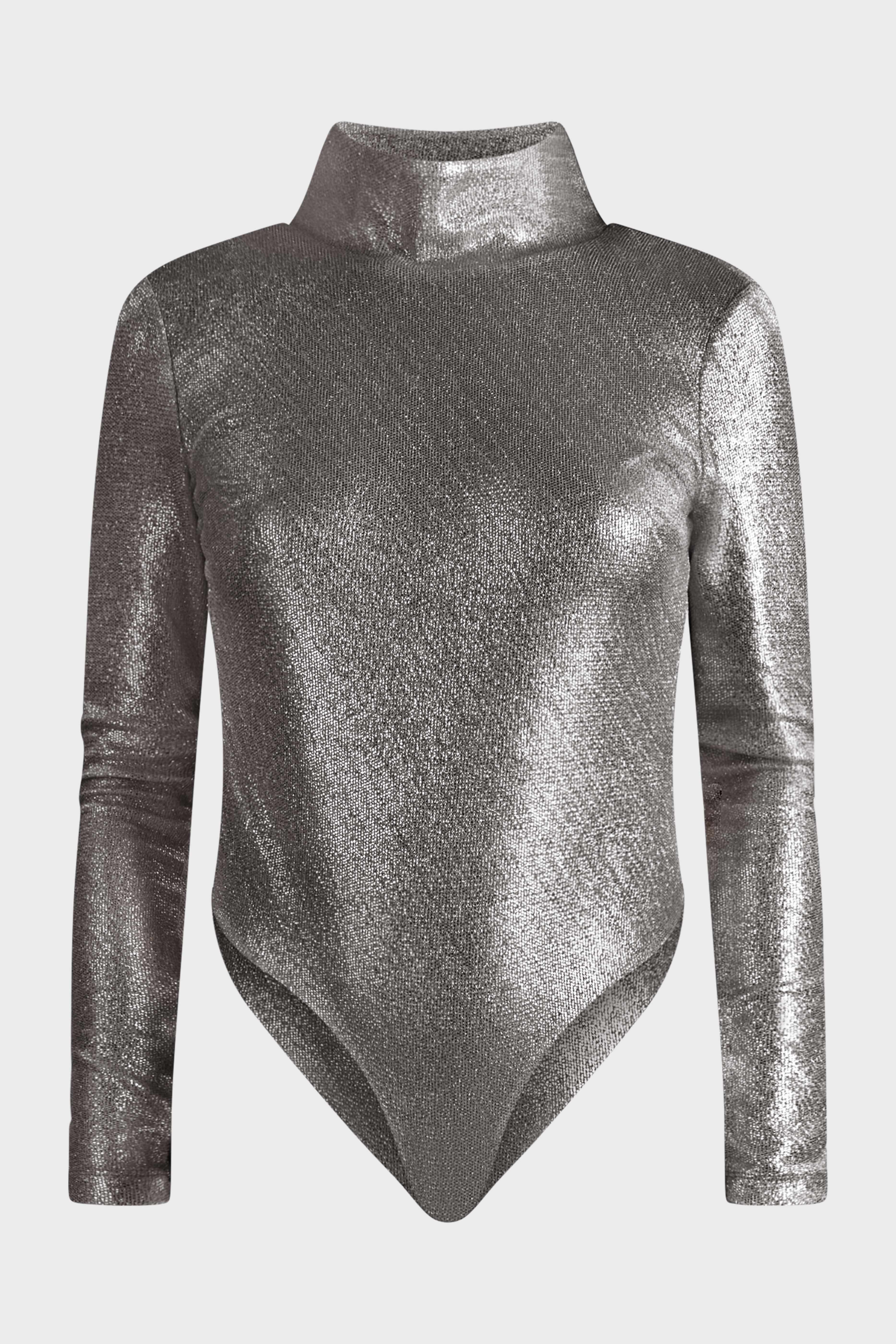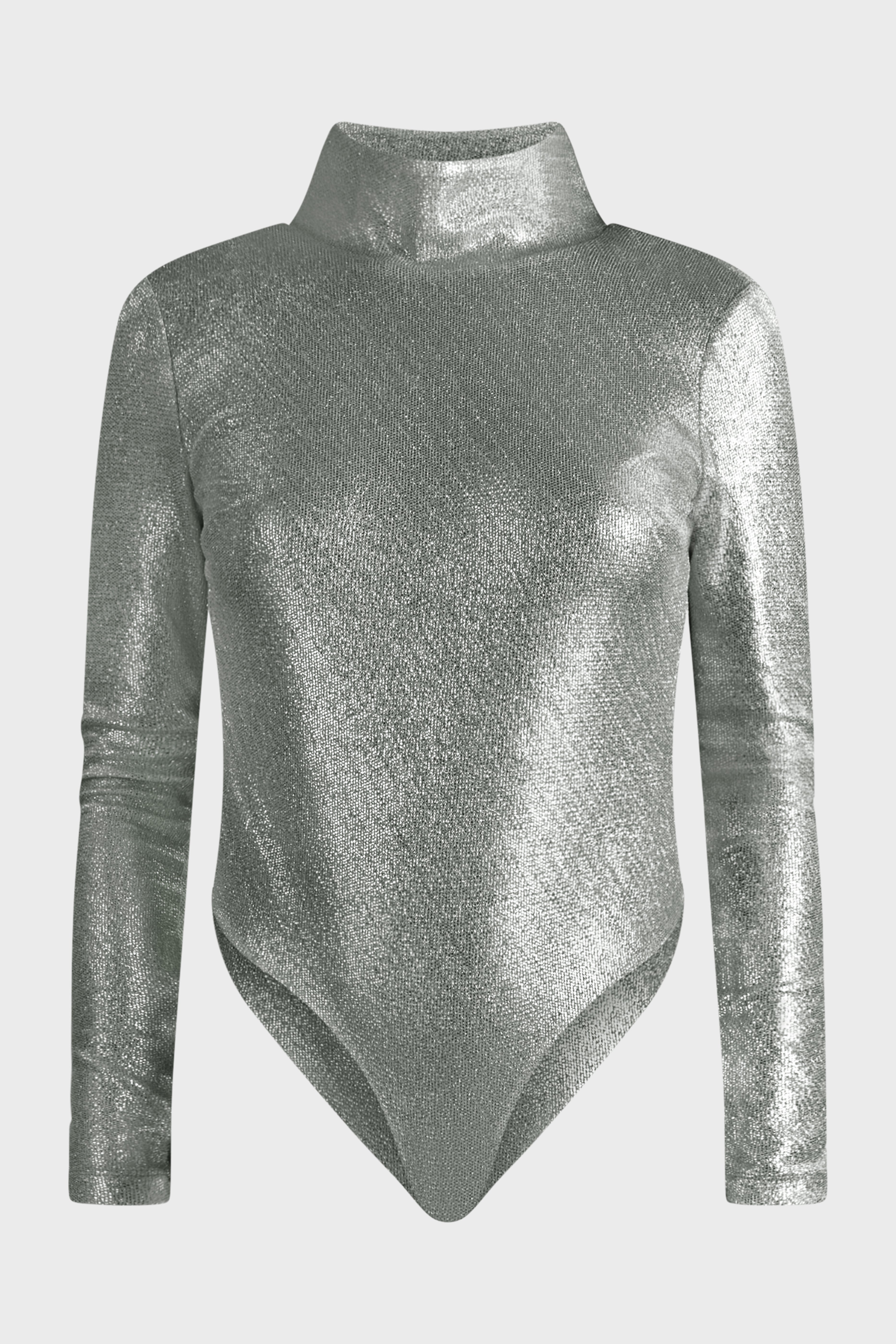 Questo body a maniche lunghe è un must have per chi desidera un look sensuale e sofisticato. Realizzato in maglia elasticizzata, tessuto in jersey impreziosito dall’effetto scintillante che cattura la luce regalando al capo un’atmosfera glamour. Il colletto alto crea un elemento di grazia dettagliato dall’abbottonatura sul retro con bottoni rivestiti nello stesso tessuto. A caratterizzare questo body è lo scollo ampio sul retro per poter attirare l’attenzione ovunque si vada. Infine ad evidenziare la cura nelle rifiniture è la fodera in Jersey tono su tono. La vestibilità aderente completa il capo, ideale da indossare in vista di un occasione speciale o una serata in cui si vuole dare un tocco di brillantezza.