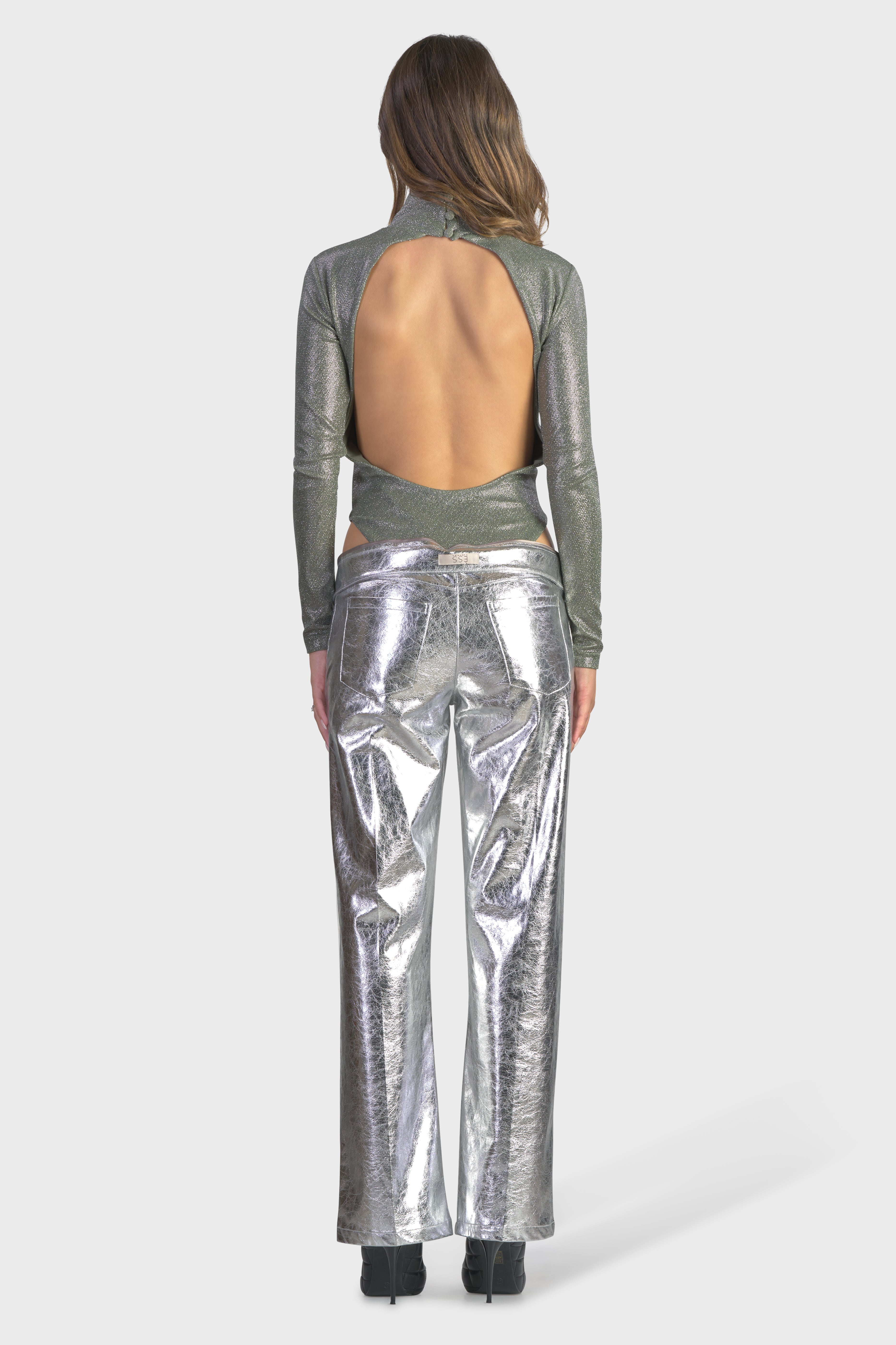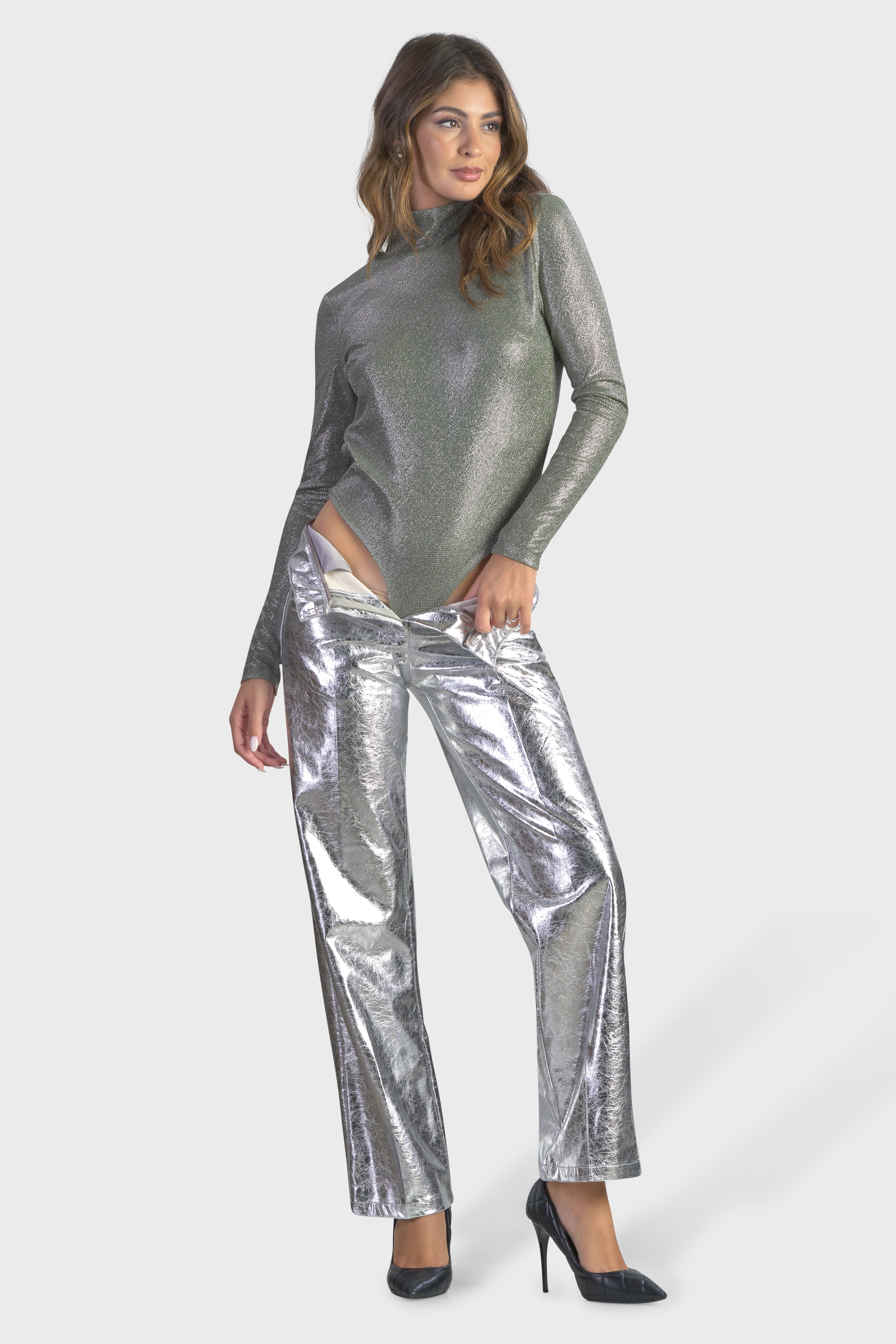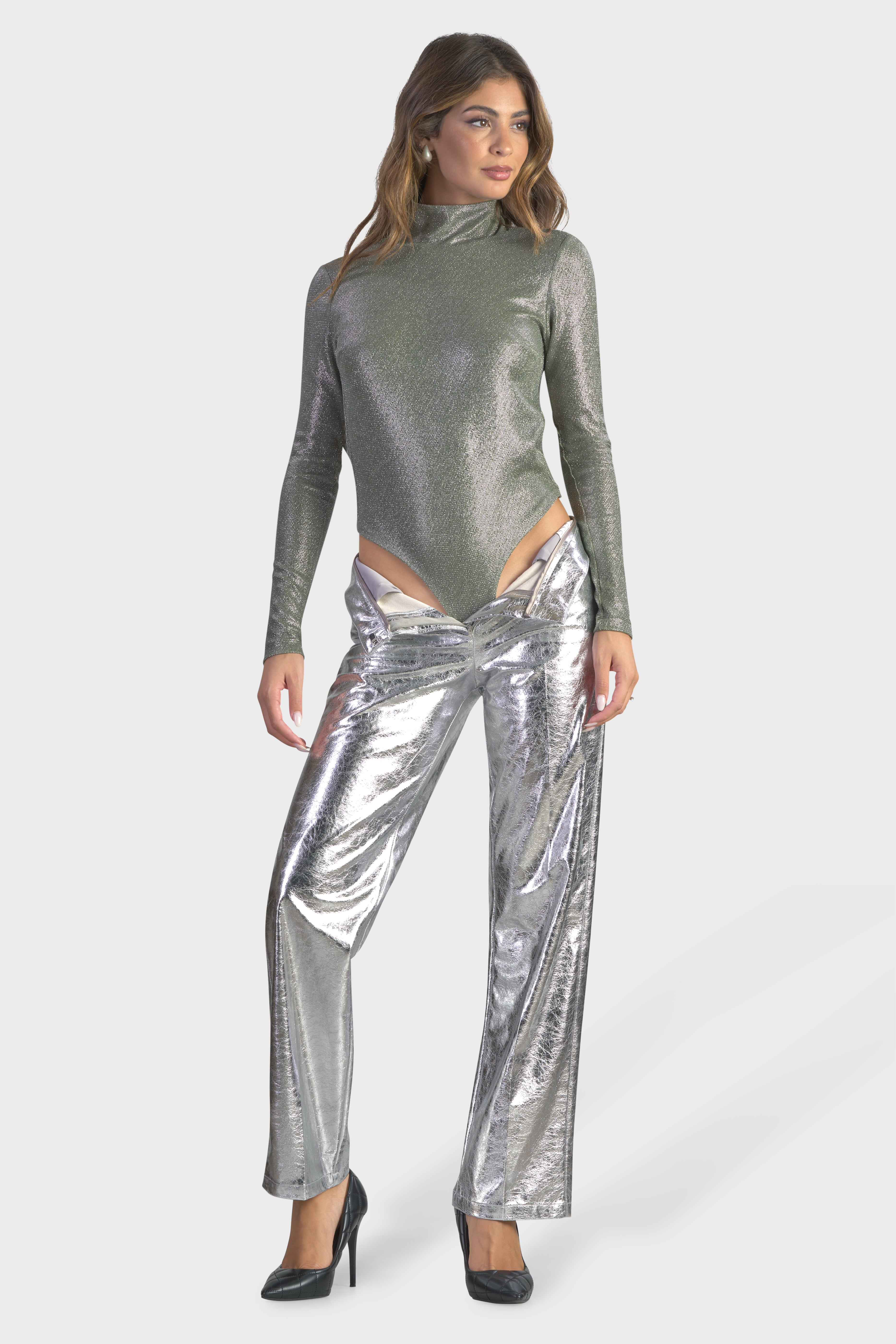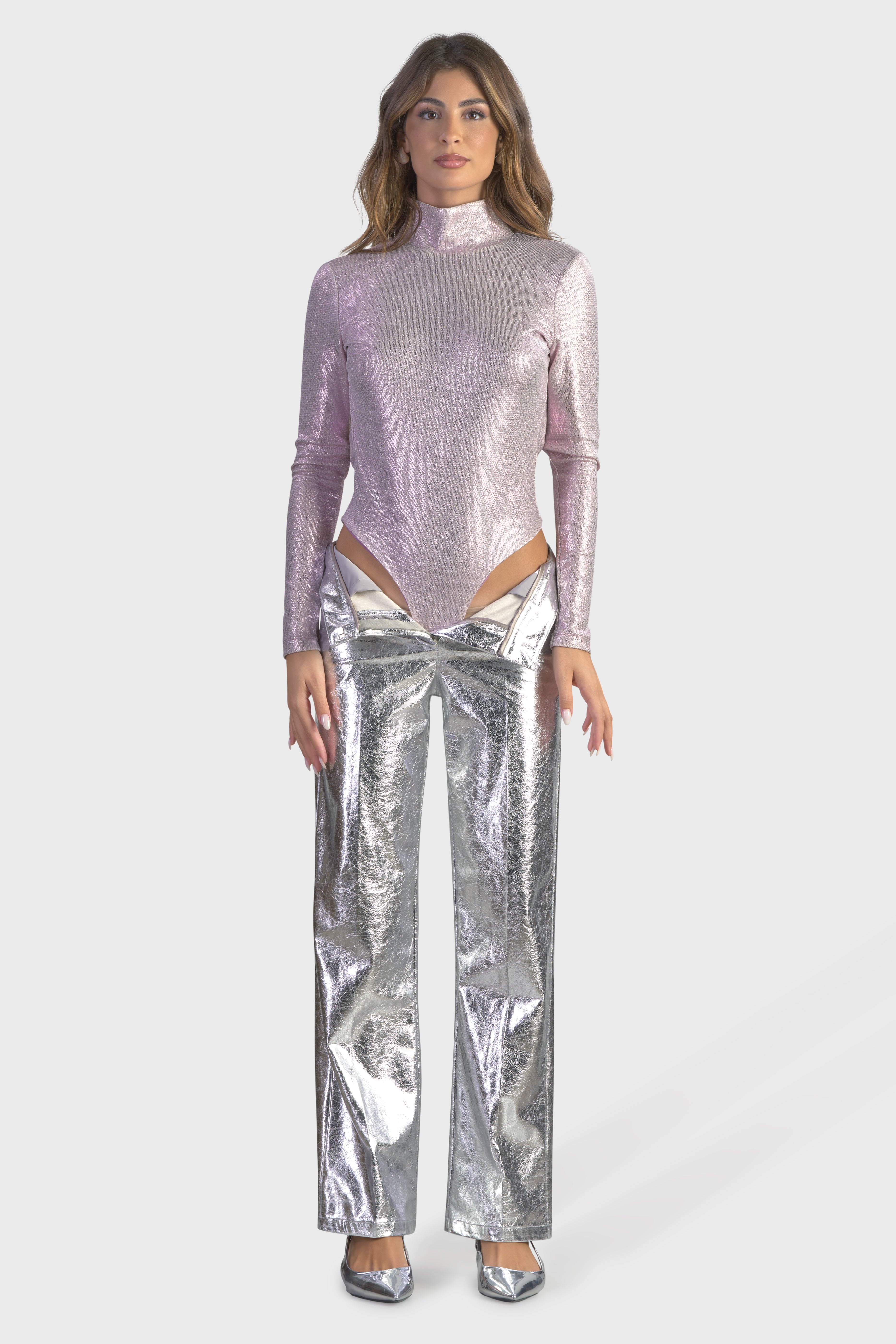Questo body a maniche lunghe è un must have per chi desidera un look sensuale e sofisticato. Realizzato in maglia elasticizzata, tessuto in jersey impreziosito dall’effetto scintillante che cattura la luce regalando al capo un’atmosfera glamour. Il colletto alto crea un elemento di grazia dettagliato dall’abbottonatura sul retro con bottoni rivestiti nello stesso tessuto. A caratterizzare questo body è lo scollo ampio sul retro per poter attirare l’attenzione ovunque si vada. Infine ad evidenziare la cura nelle rifiniture è la fodera in Jersey tono su tono. La vestibilità aderente completa il capo, ideale da indossare in vista di un occasione speciale o una serata in cui si vuole dare un tocco di brillantezza.