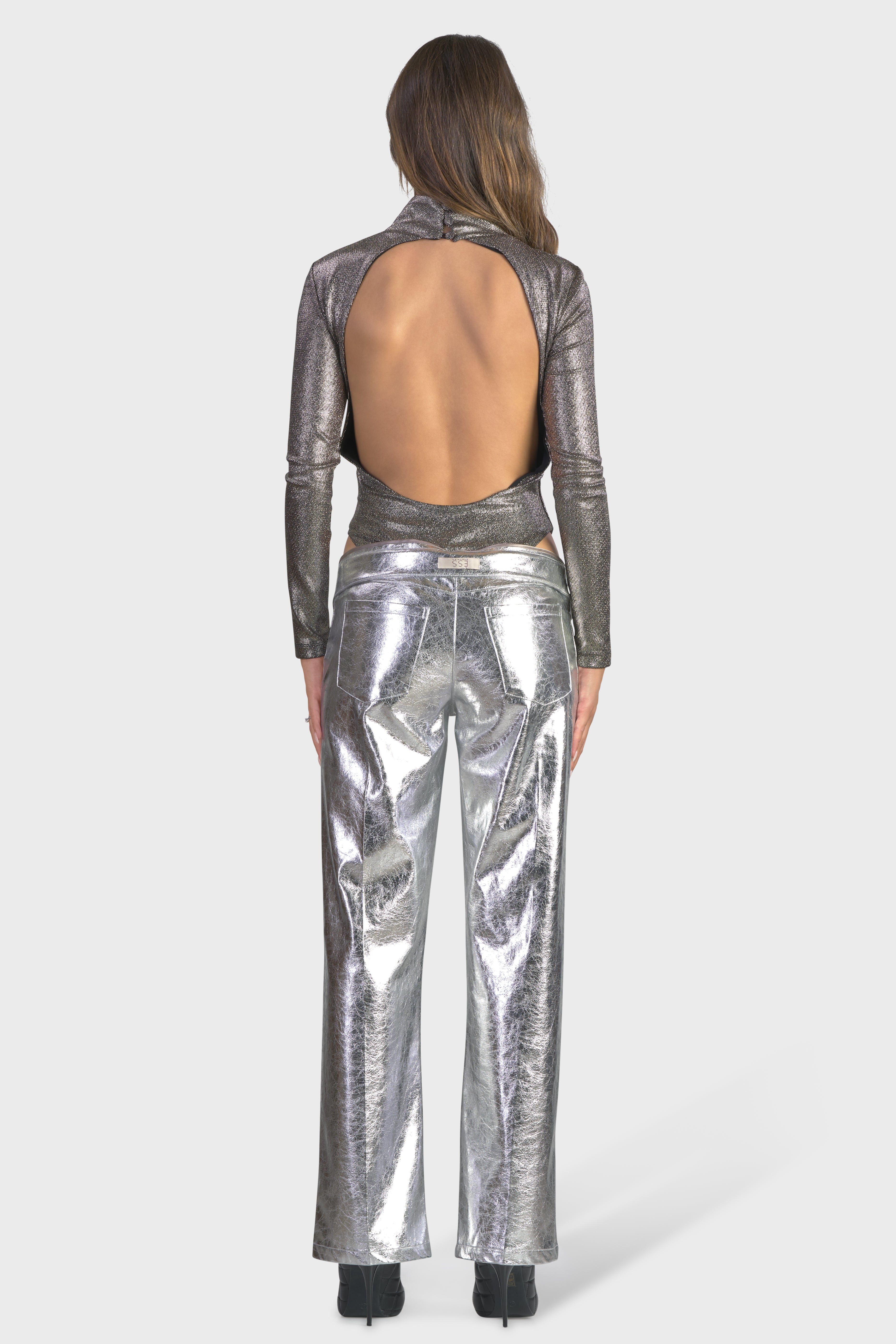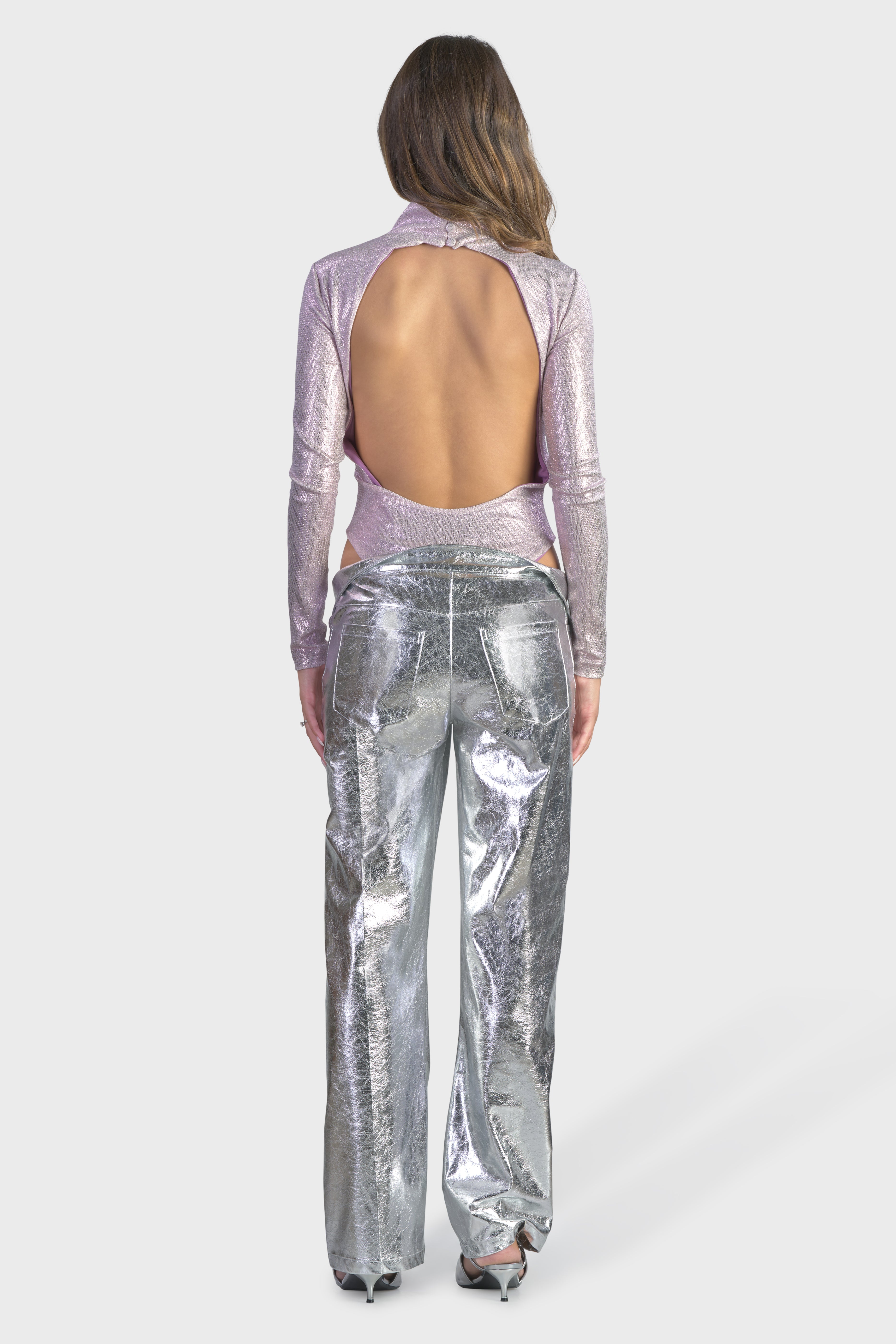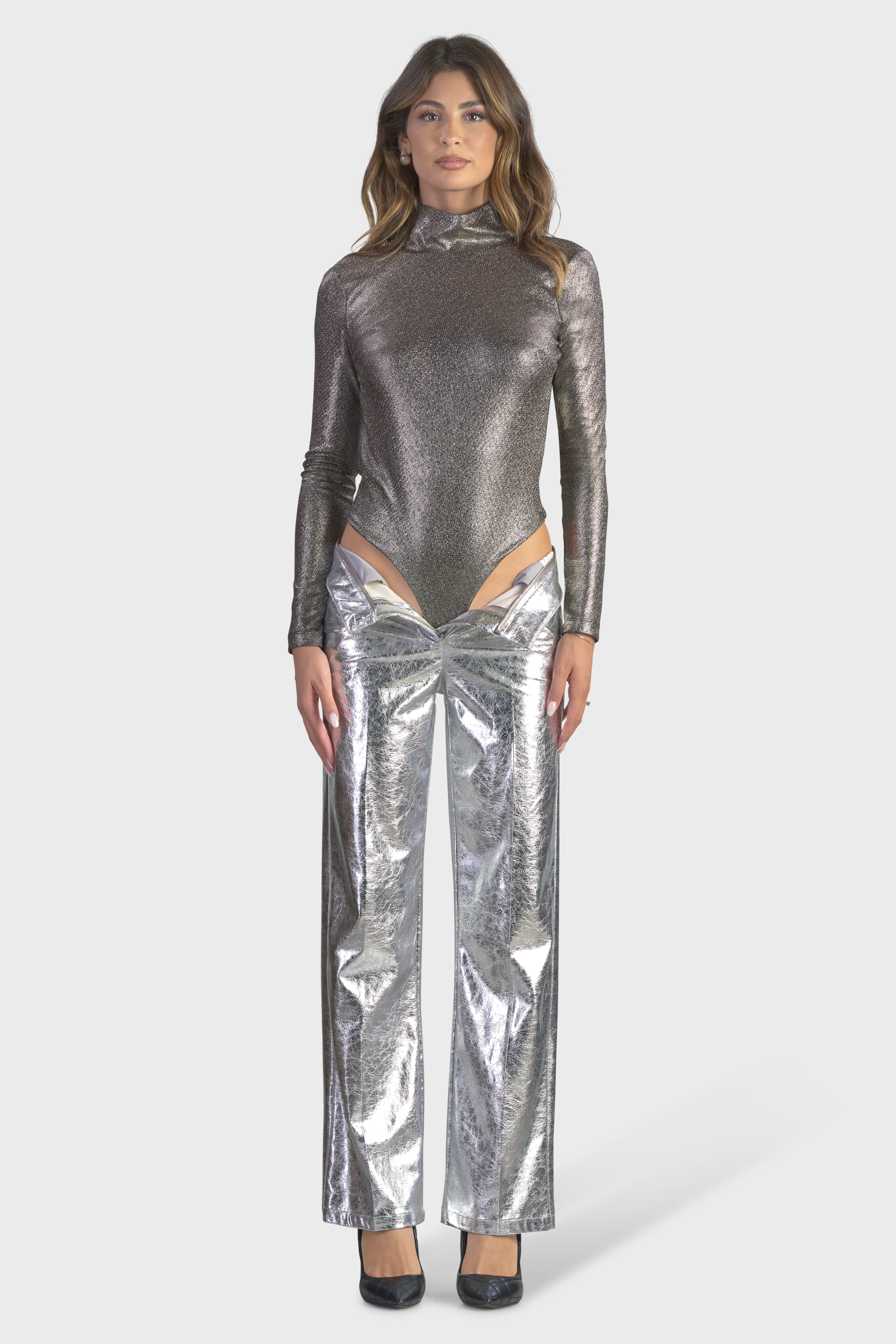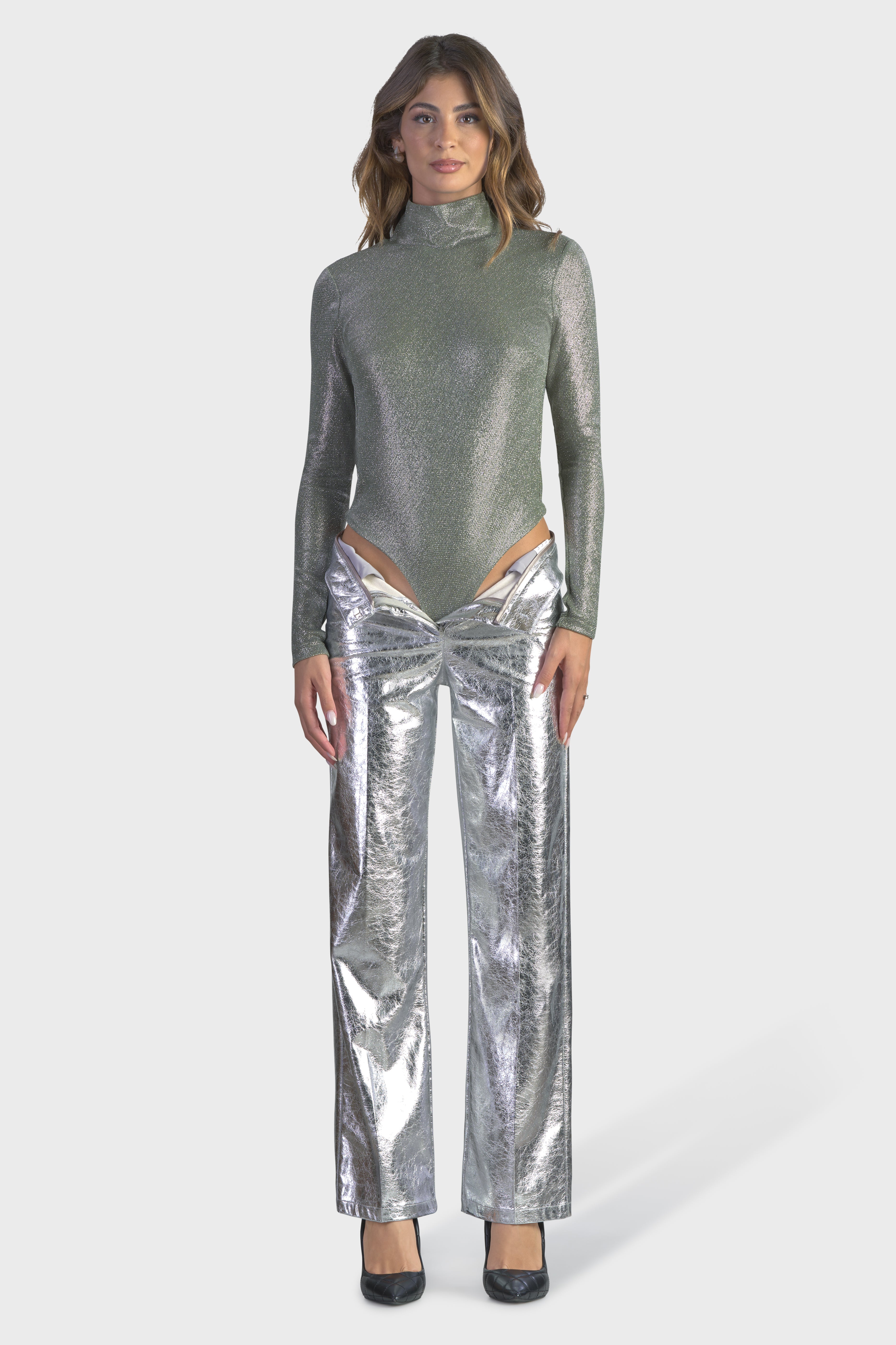 Questo body a maniche lunghe è un must have per chi desidera un look sensuale e sofisticato. Realizzato in maglia elasticizzata, tessuto in jersey impreziosito dall’effetto scintillante che cattura la luce regalando al capo un’atmosfera glamour. Il colletto alto crea un elemento di grazia dettagliato dall’abbottonatura sul retro con bottoni rivestiti nello stesso tessuto. A caratterizzare questo body è lo scollo ampio sul retro per poter attirare l’attenzione ovunque si vada. Infine ad evidenziare la cura nelle rifiniture è la fodera in Jersey tono su tono. La vestibilità aderente completa il capo, ideale da indossare in vista di un occasione speciale o una serata in cui si vuole dare un tocco di brillantezza.