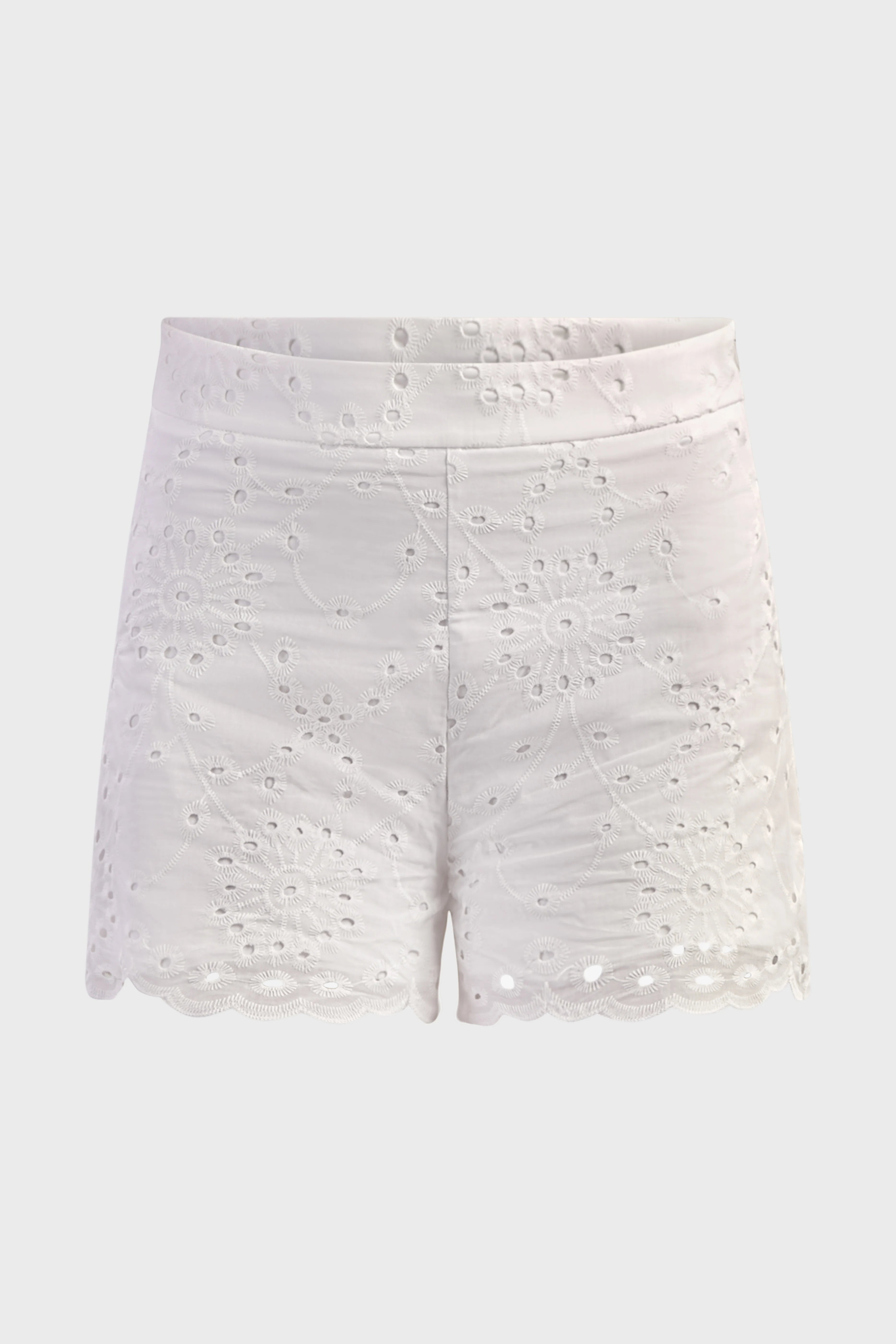 Le linee a campana di questi raffinati shorts si distinguono grazie allo stile romantico. Realizzato in pizzo sangallo, tessuto fresco dal design traforato caratterizzato da ricami floreali vuoti e pieni in rilievo, conferendo,così una particolare eleganza al capo. Il modello è caratterizzato dal cinturino sottile che evidenzia il punto vita. A completare il capo è la fodera interna e la cerniera nascosta sul fianco. Perfetto per occasioni speciali o per aggiungere un tocco di classe al tuo guardaroba quotidiano insieme al top in coordinato della collezione.