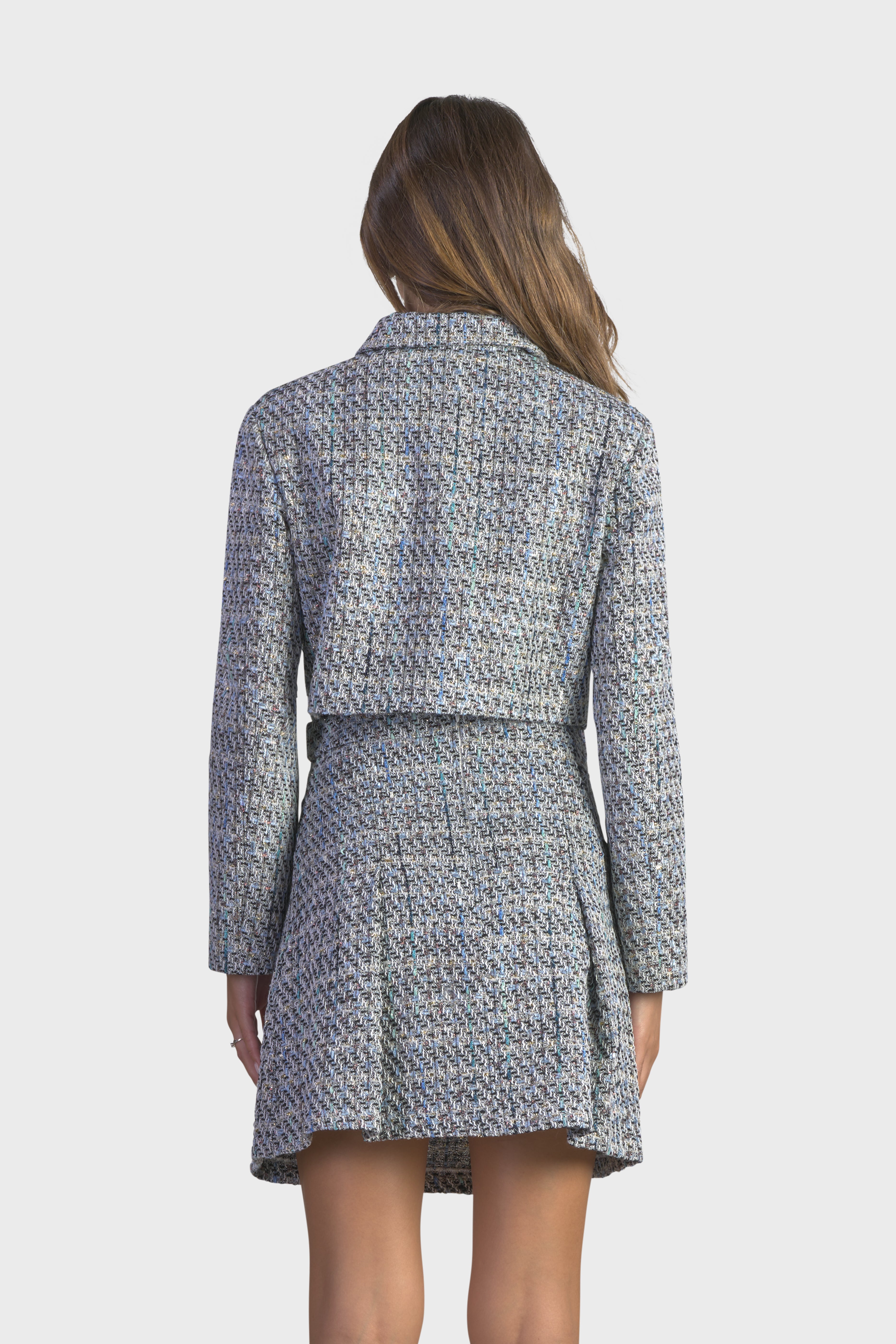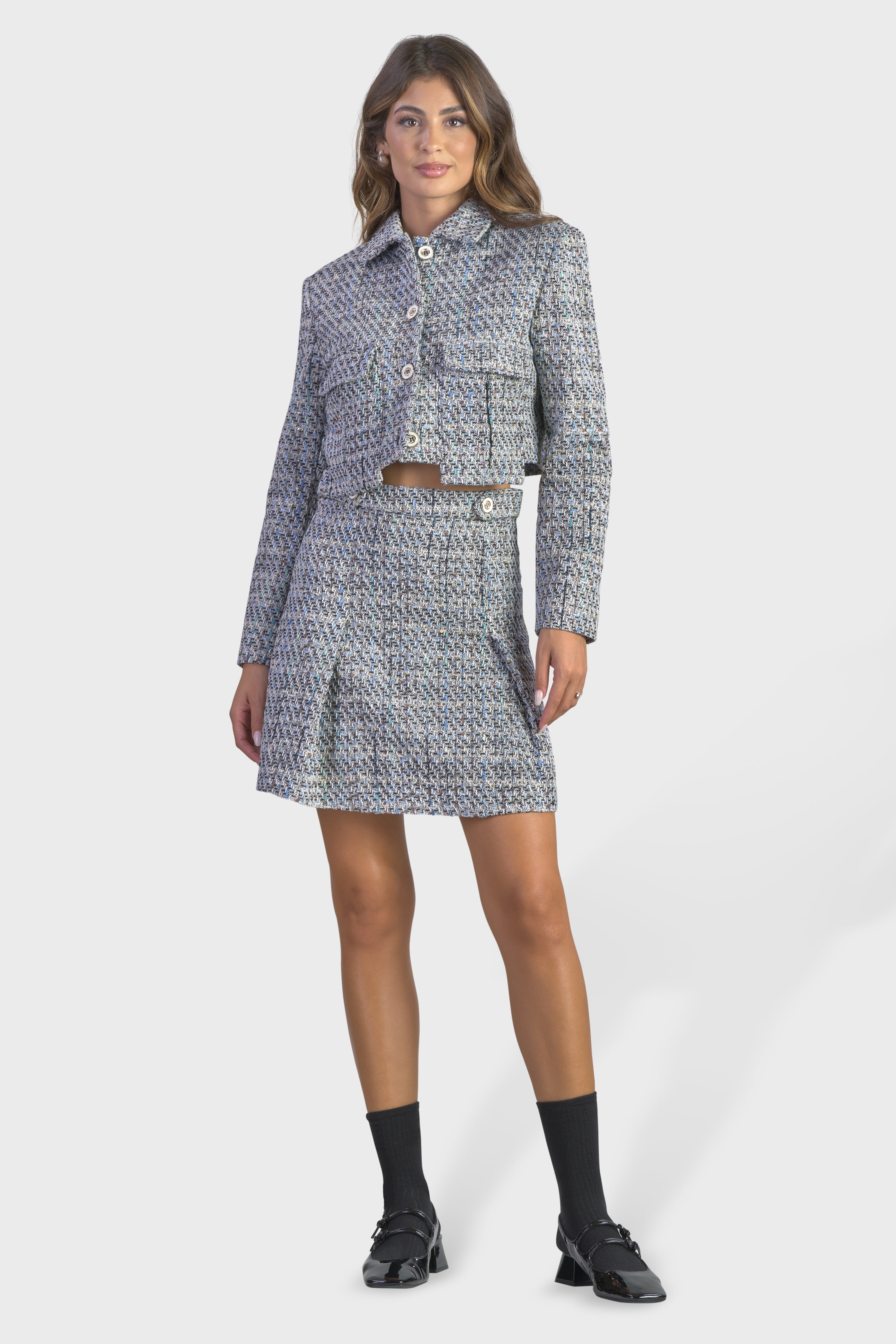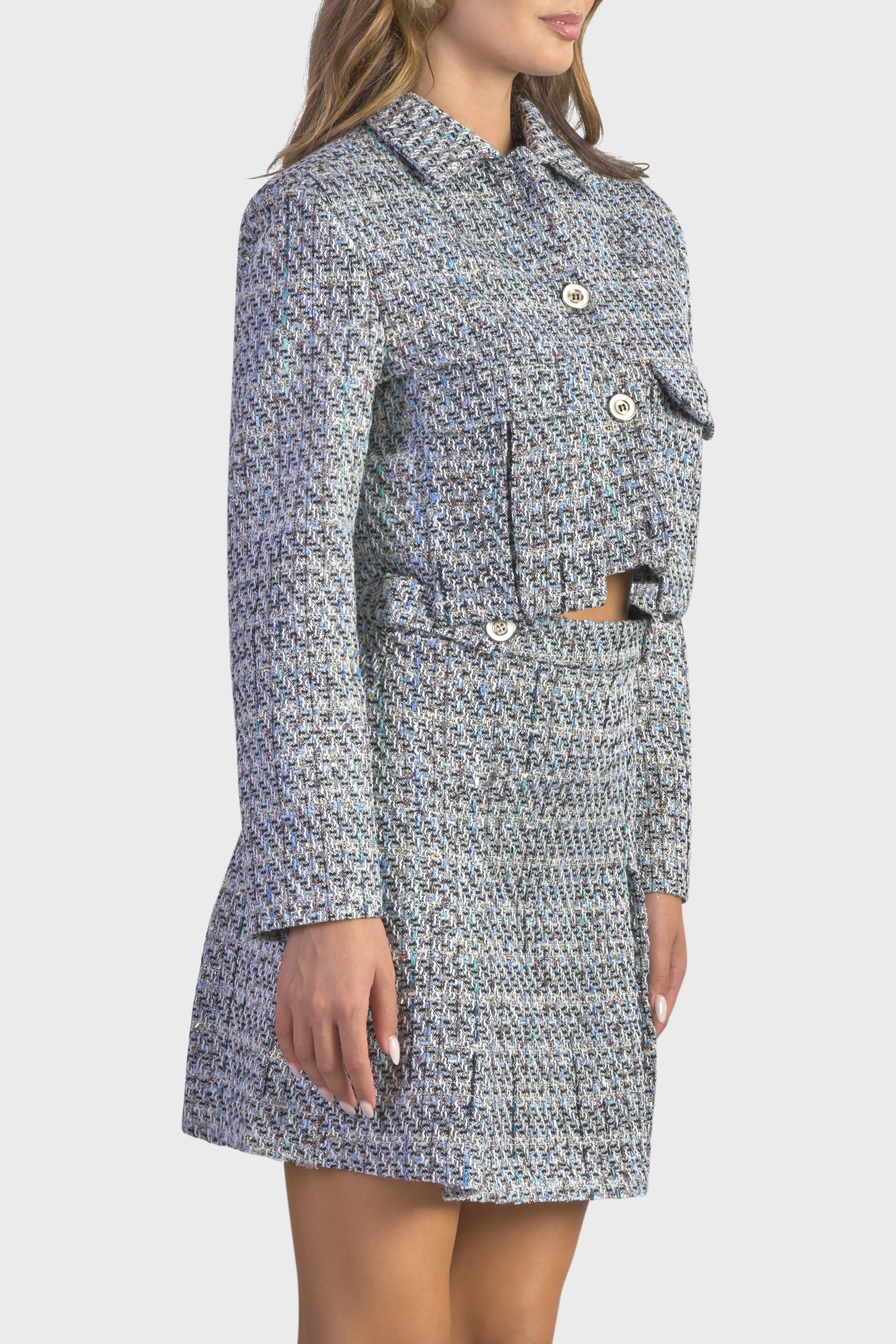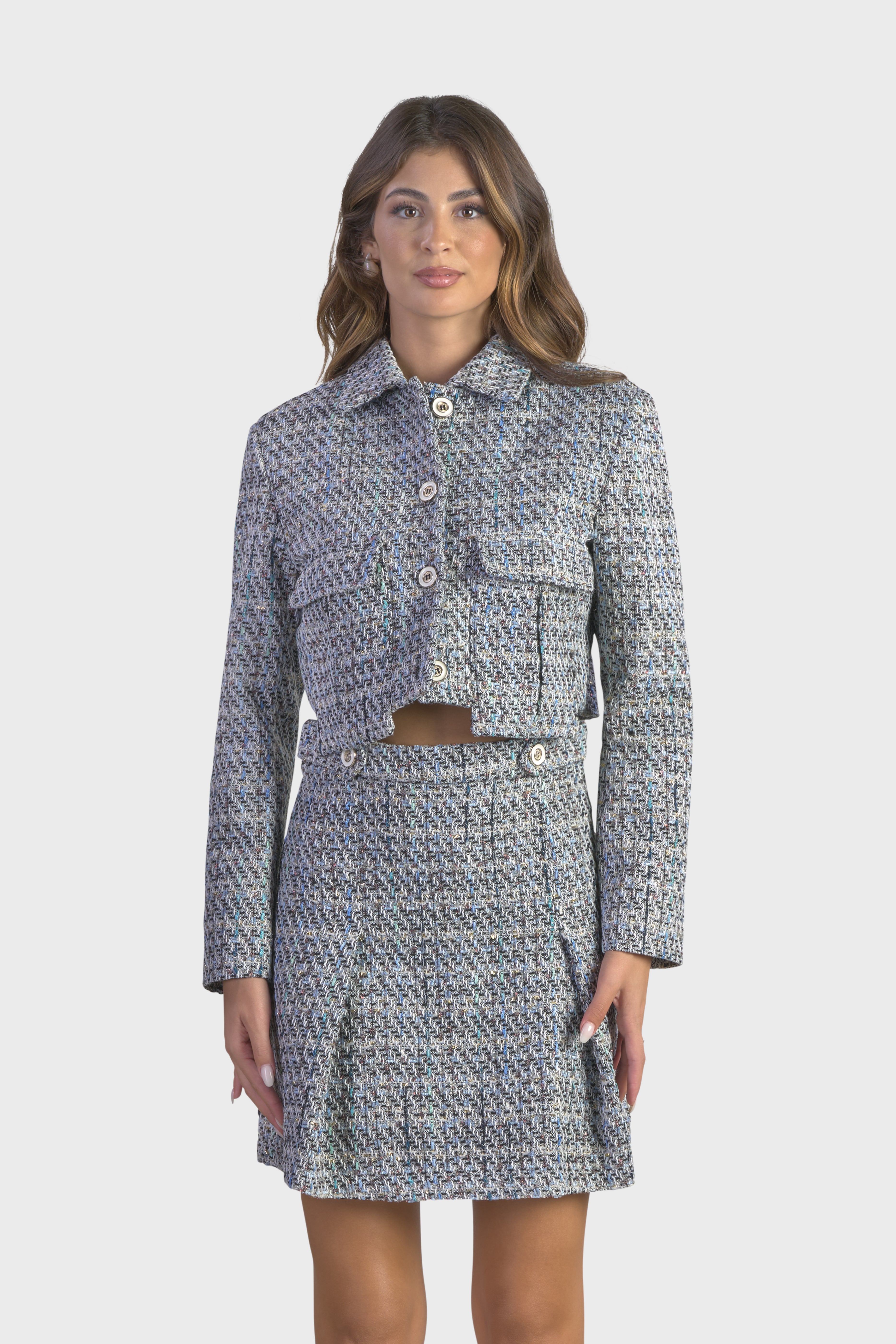 L’esclusività di questa giacca crop rappresenta ancora una volta lo stile strutturato di ÈSS. Realizzata in tweed multicolor, tessuto dall’iconica trama morbida in grado di conferire raffinatezza e originalità. Il modello dalle maniche lunghe è caratterizzato dall’abbottonatura monopetto arricchita da bottoni con ghiera e dal colletto a punta. A impreziosire il capo sono i tasconi con pattina sul davanti, mettendo in evidenza la bellezza del design. La vestibilità di questa giacca è bilanciata per assicurare comodità e aderenza al corpo. È la scelta giusta per chi cerca un capo d’abbigliamento che unisca stile e comfort, ideale da indossare per occasioni speciali, insieme alla gonna Tweed in coordinato della collezione.