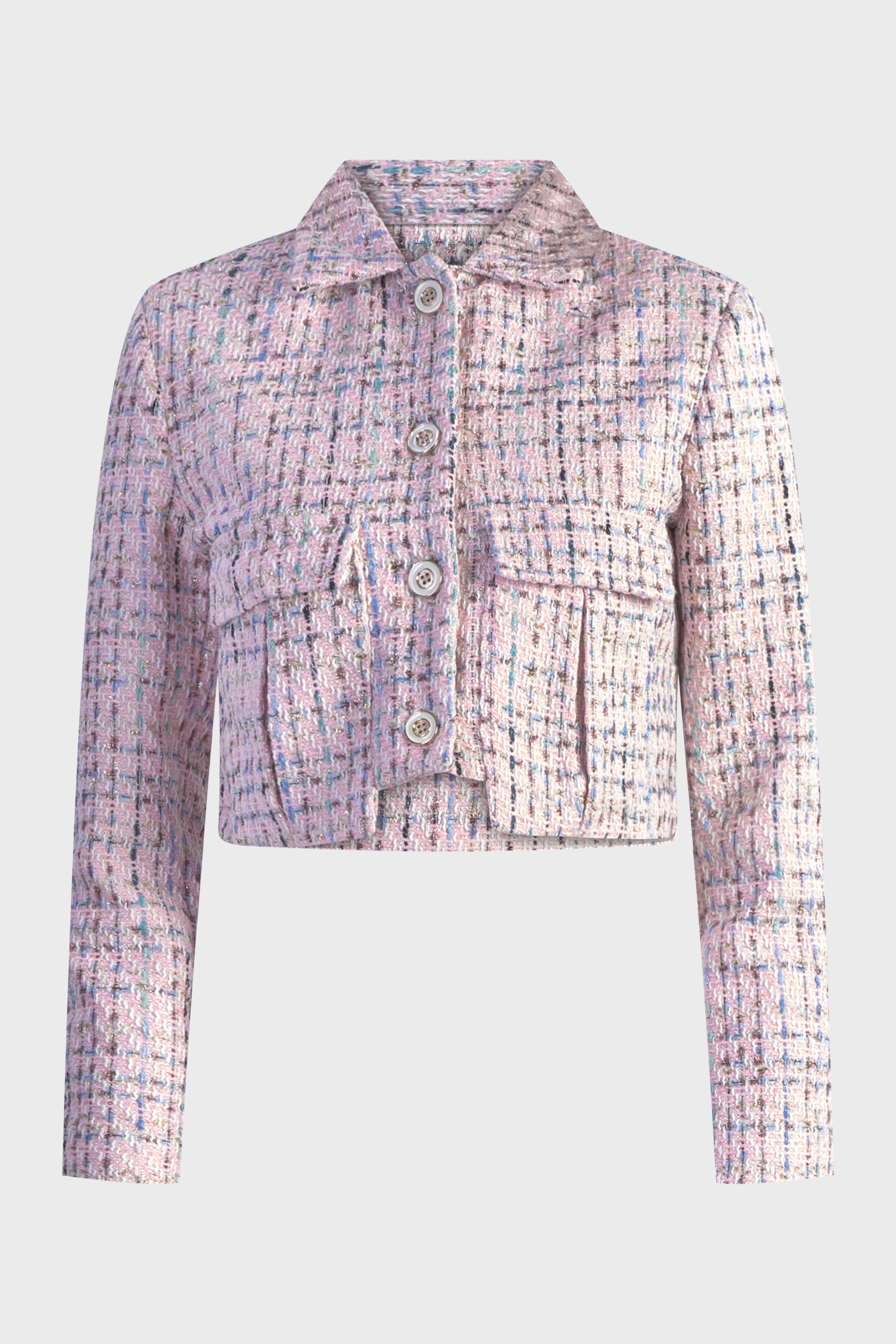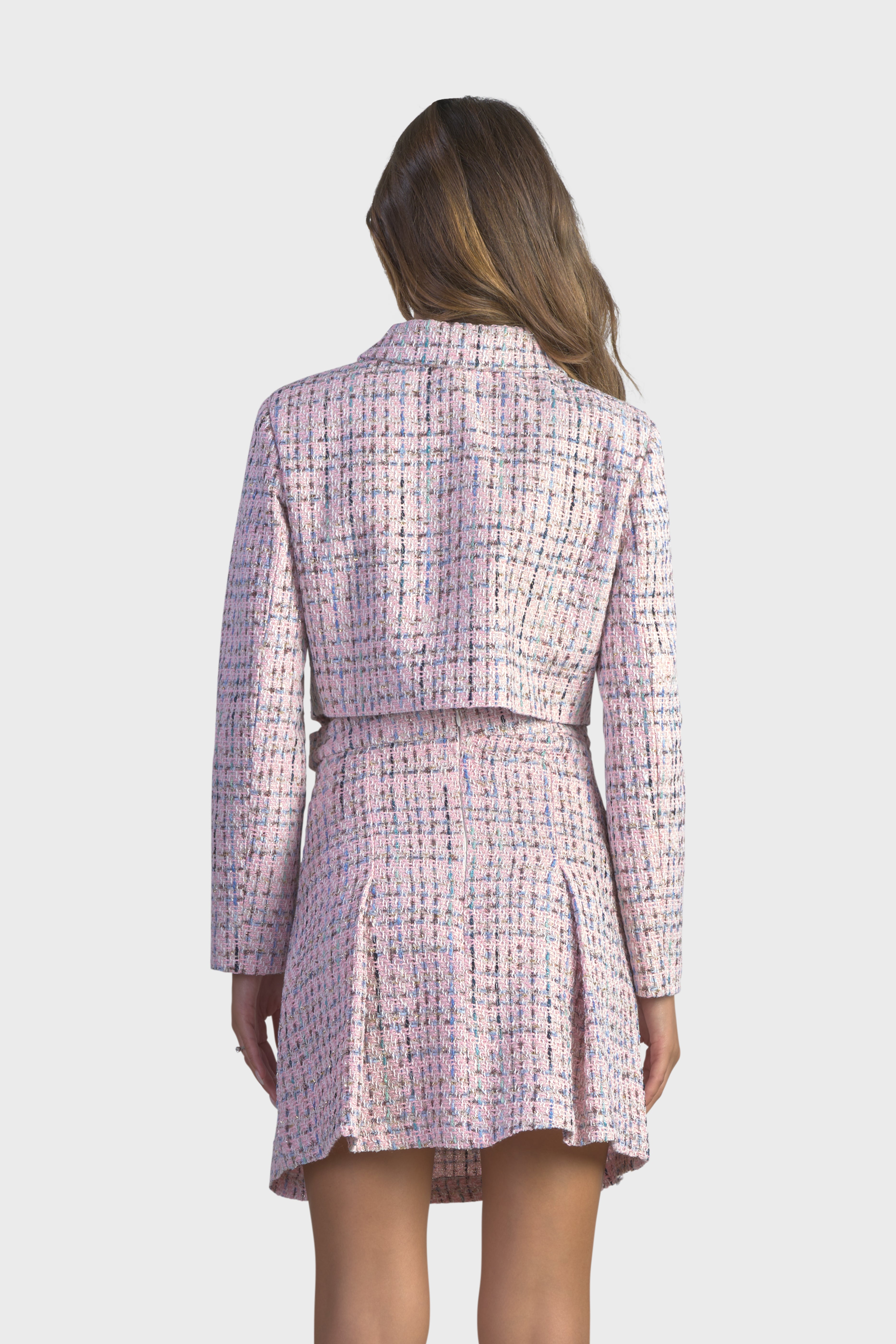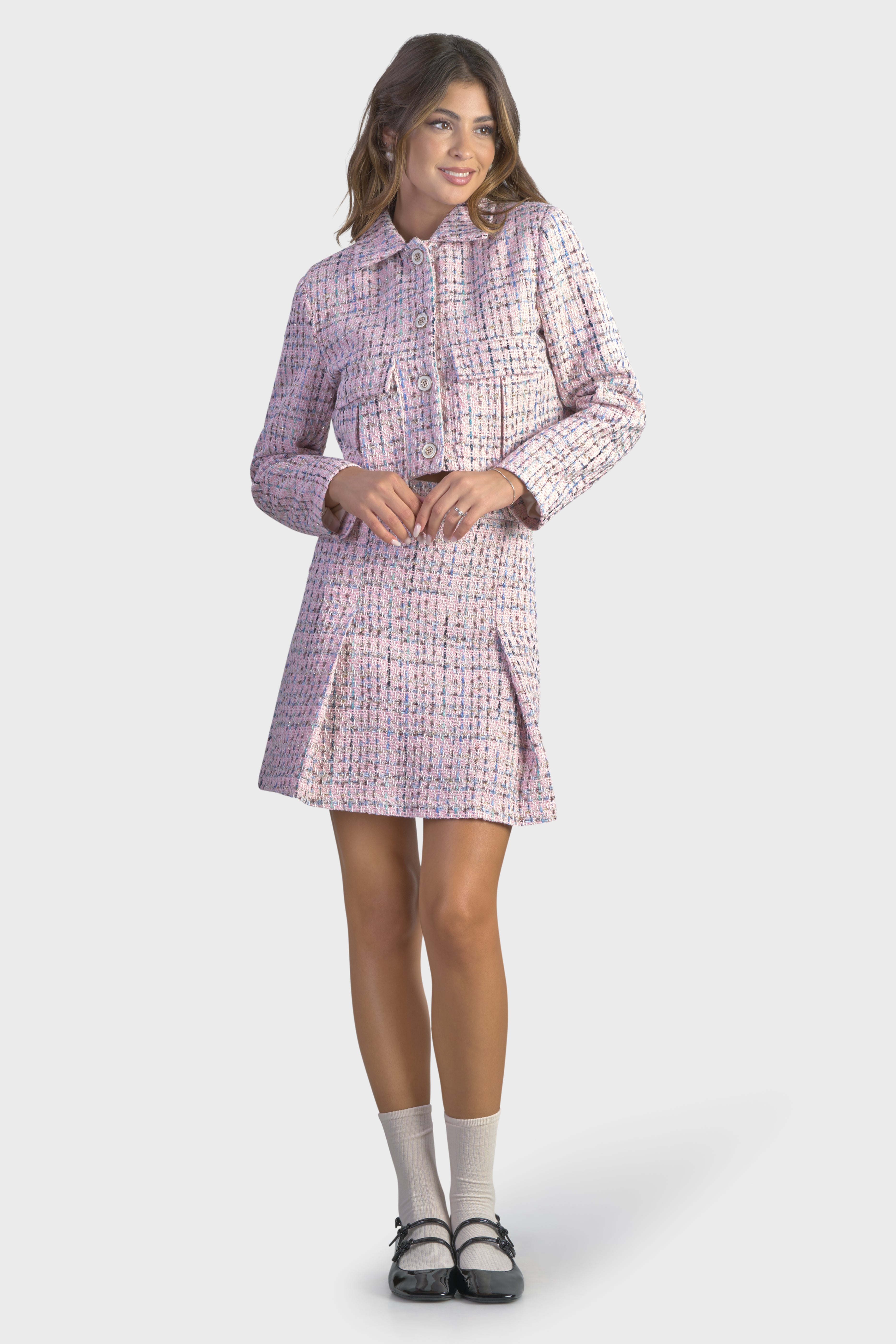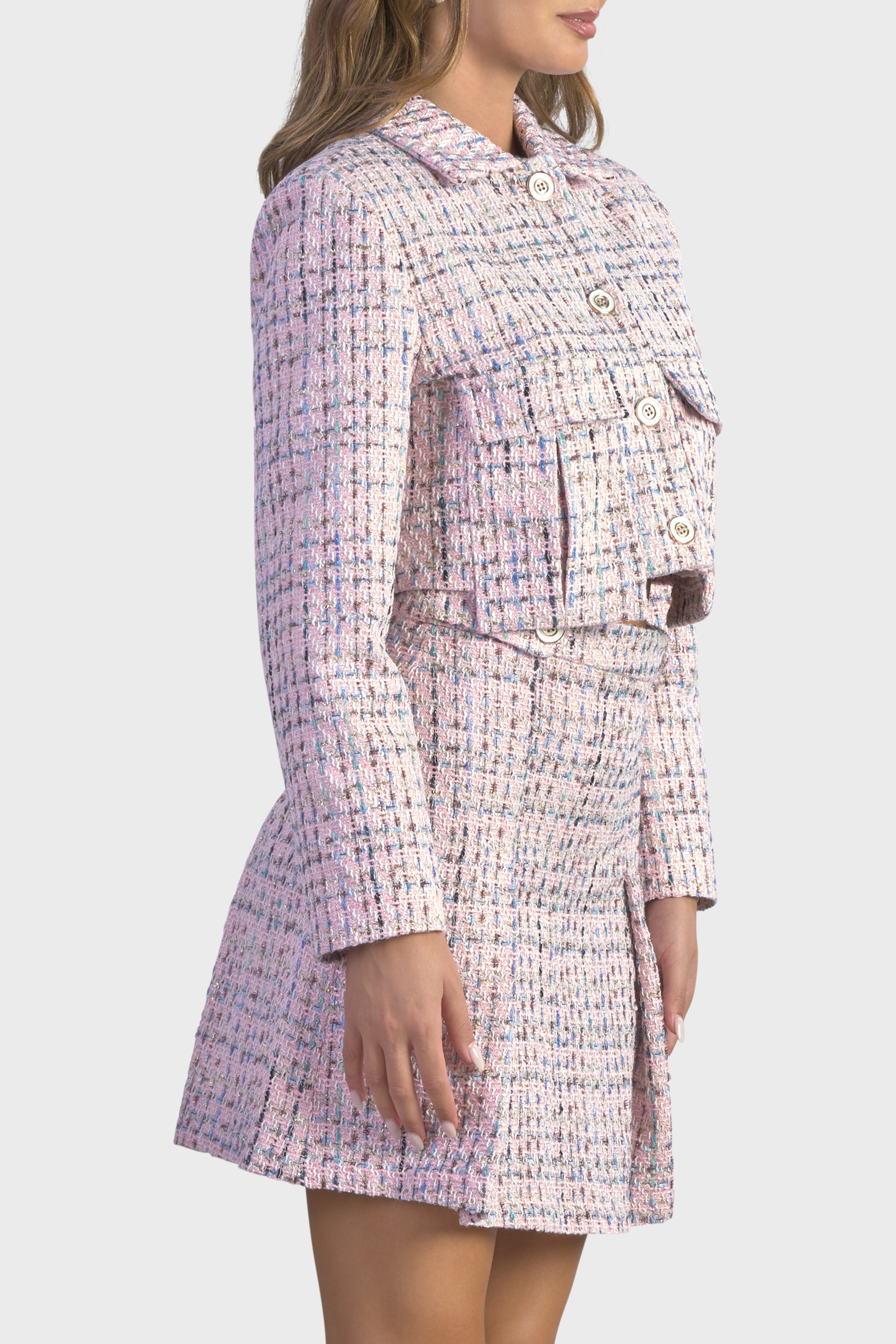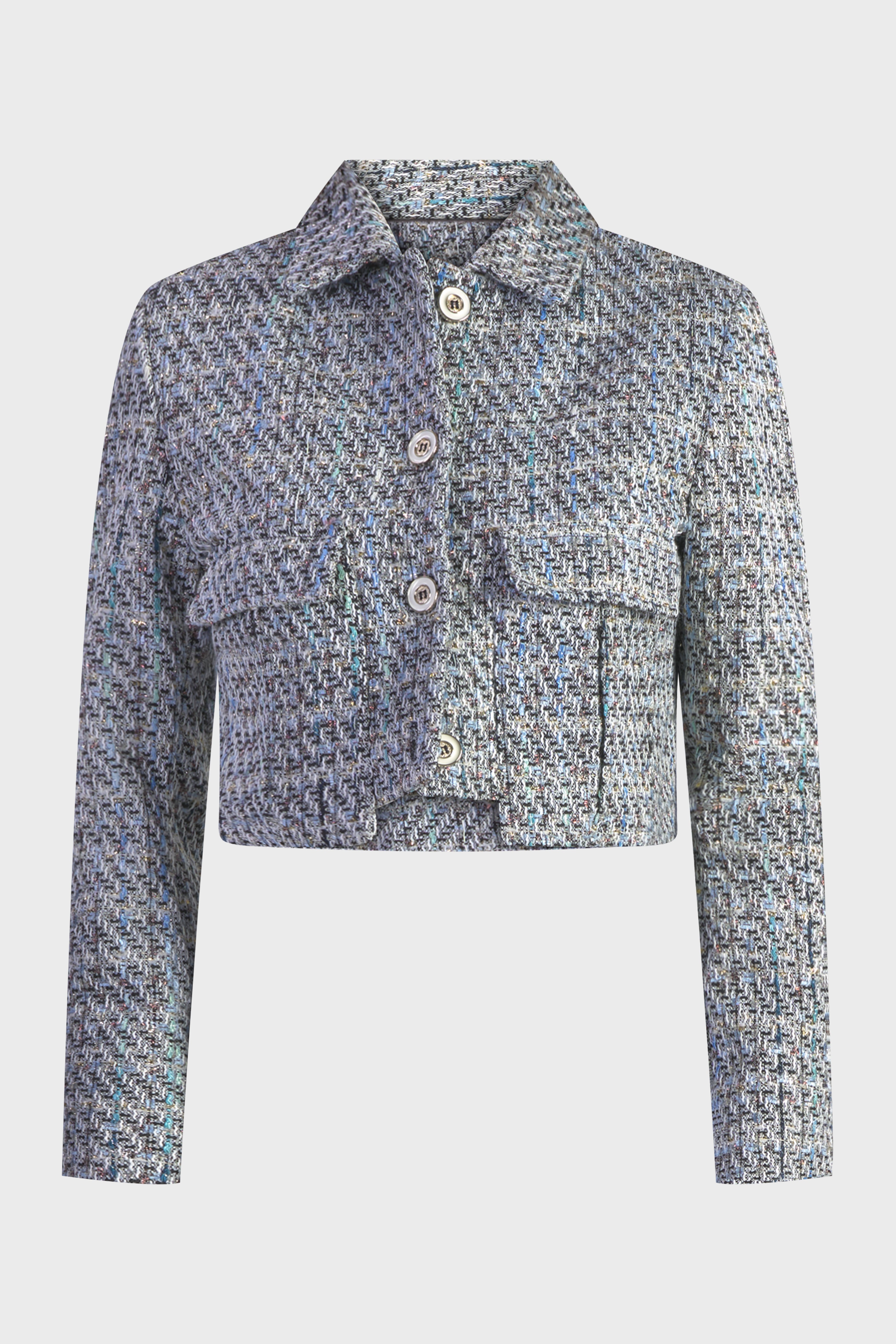 L’esclusività di questa giacca crop rappresenta ancora una volta lo stile strutturato di ÈSS. Realizzata in tweed multicolor, tessuto dall’iconica trama morbida in grado di conferire raffinatezza e originalità. Il modello dalle maniche lunghe è caratterizzato dall’abbottonatura monopetto arricchita da bottoni con ghiera e dal colletto a punta. A impreziosire il capo sono i tasconi con pattina sul davanti, mettendo in evidenza la bellezza del design. La vestibilità di questa giacca è bilanciata per assicurare comodità e aderenza al corpo. È la scelta giusta per chi cerca un capo d’abbigliamento che unisca stile e comfort, ideale da indossare per occasioni speciali, insieme alla gonna Tweed in coordinato della collezione.