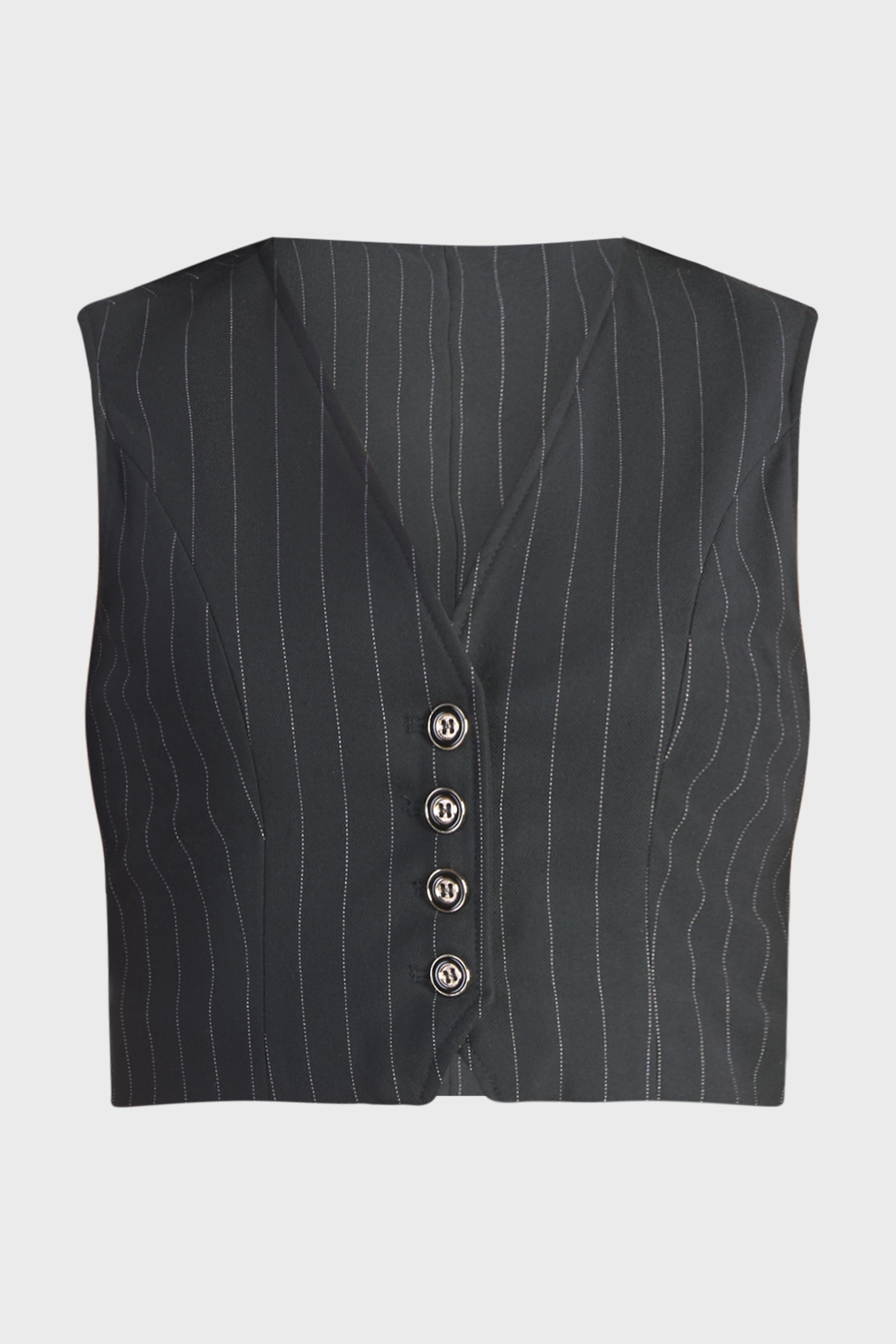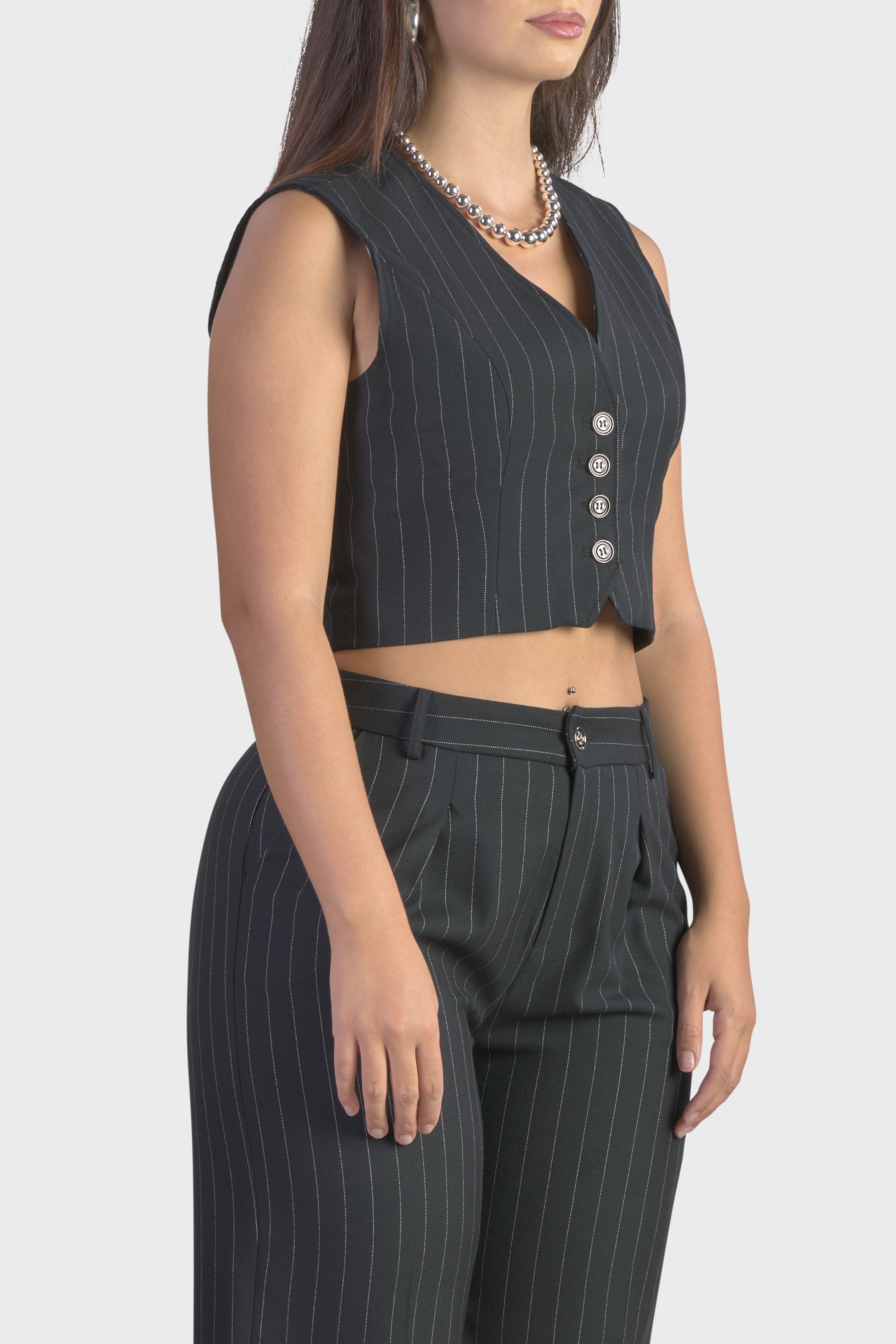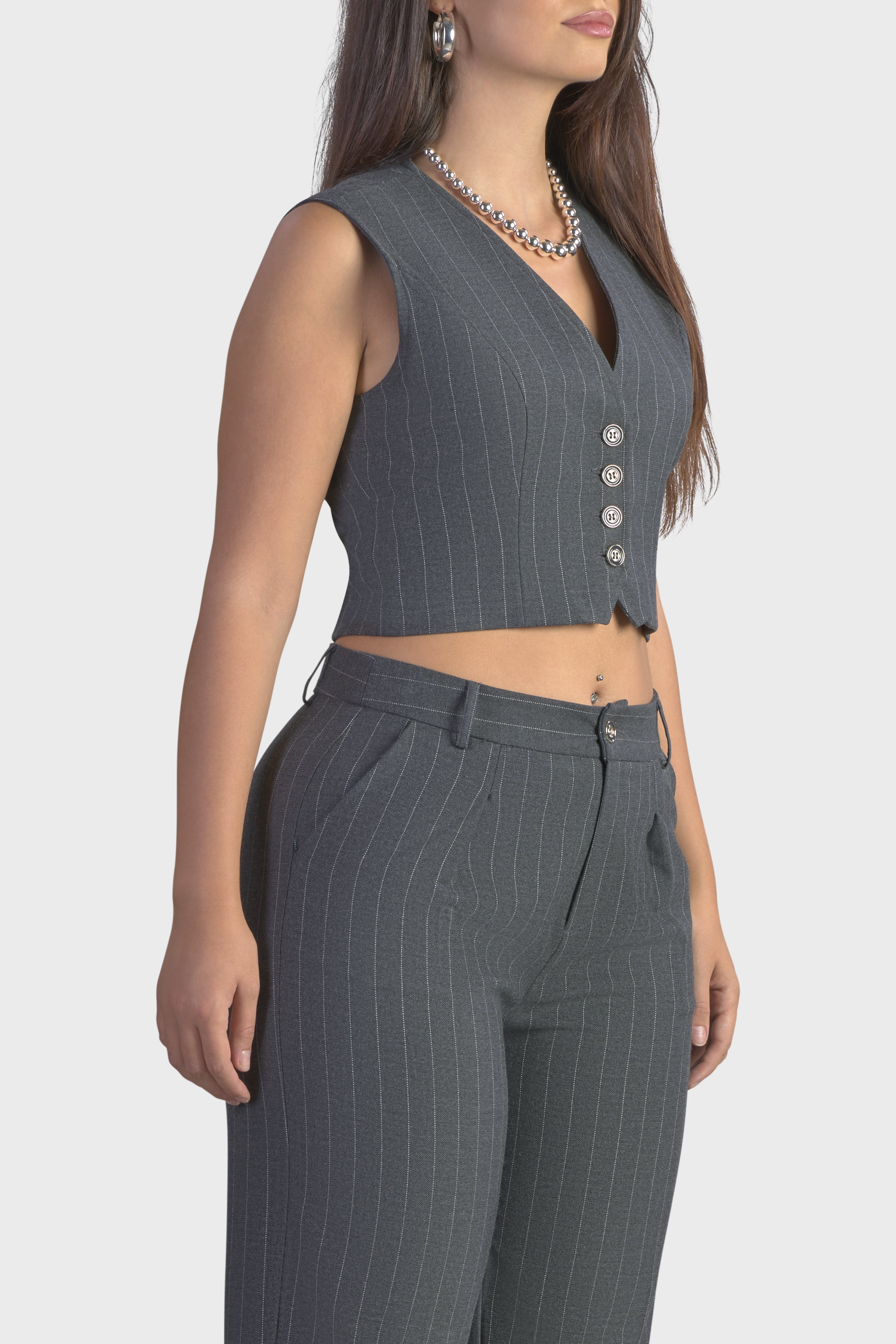 Il gilet sofisticato senza maniche dall’ importante abbottonatura monopetto, è in grado di garantire una vestibilità avvitata che abbraccia il corpo delicatamente, mentre la lunghezza alla vita dona equilibrio al design. Realizzato in mano lana, tessuto morbido e lucente grazie al suo effetto gessato. Il modello è caratterizzato dall’ampio scollo a V, ma ad impreziosire il capo sono i bottoni con ghiera tono su tono. Ideale da indossare come sotto giacca insieme al blazer in coordinato della collezione, o come protagonista di un look più casual unendo così stile e comfort in un connubio di eleganza senza sforzo.