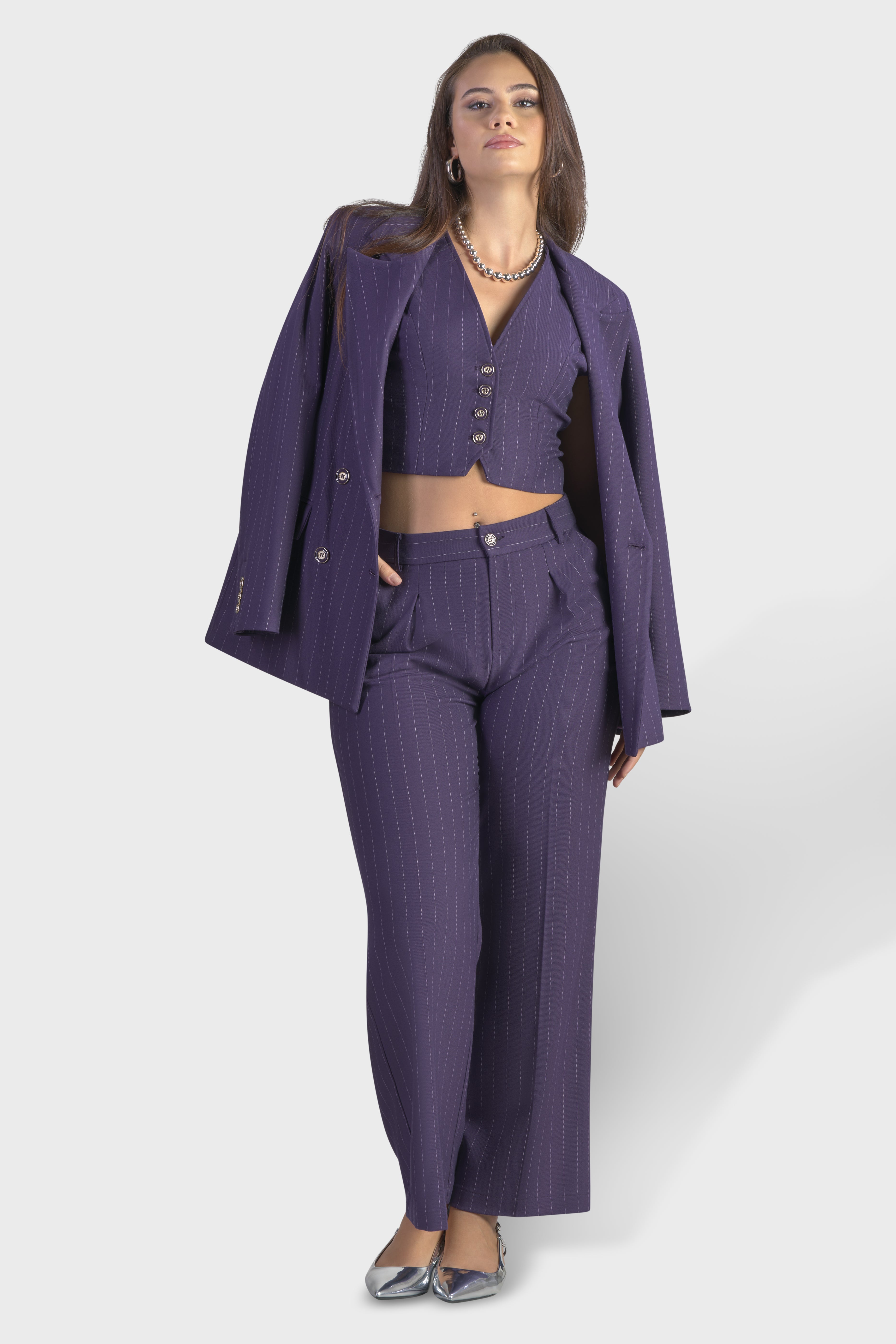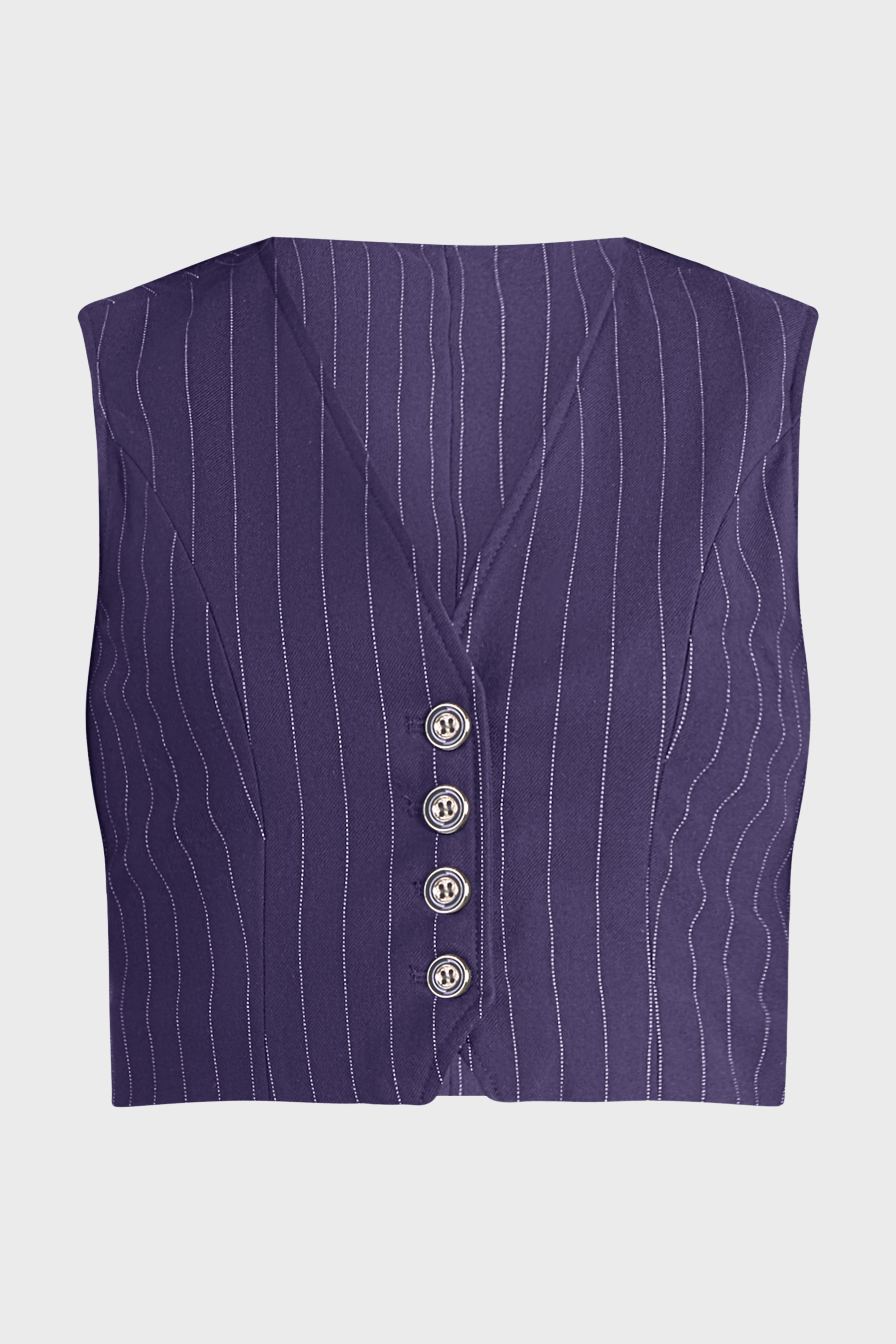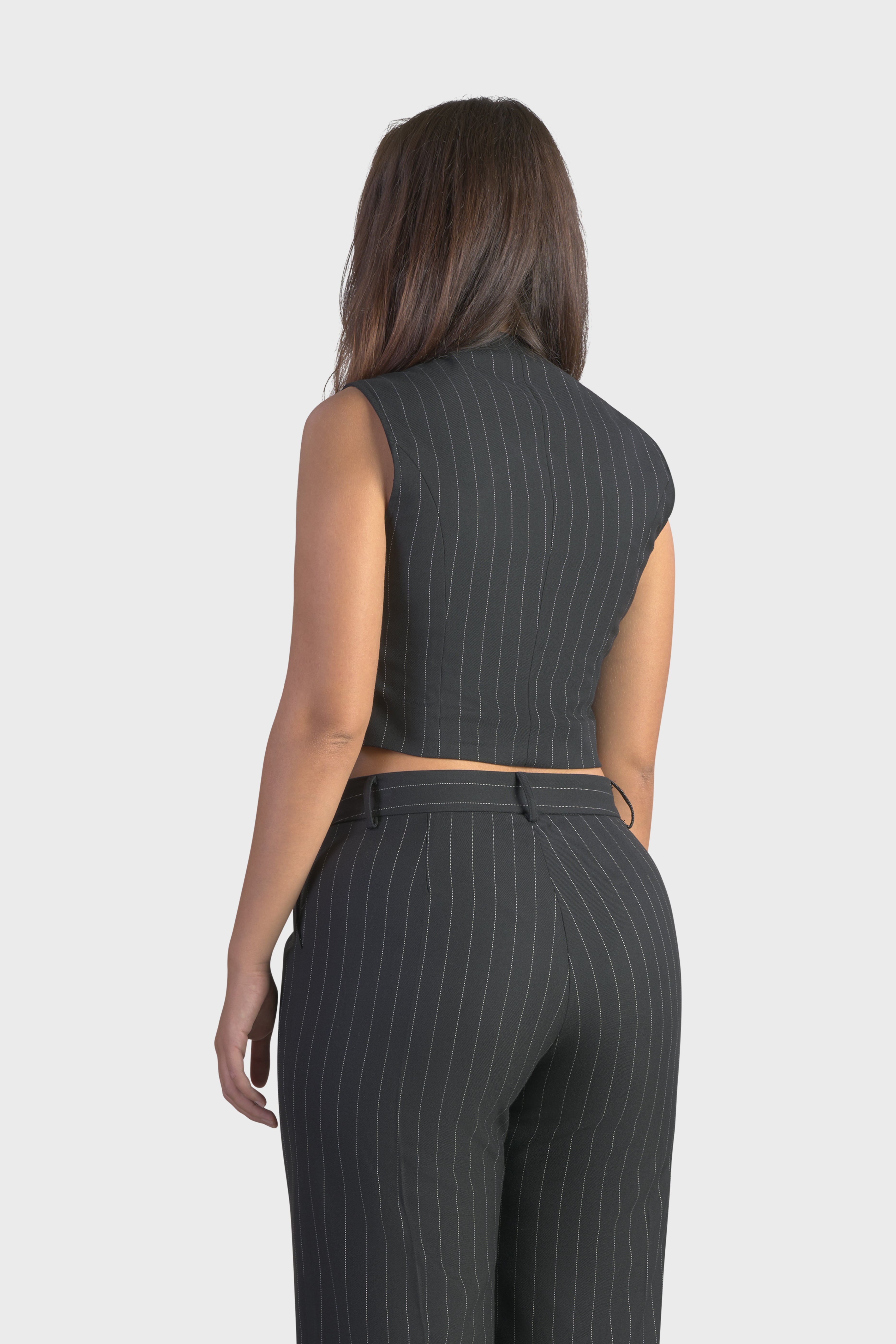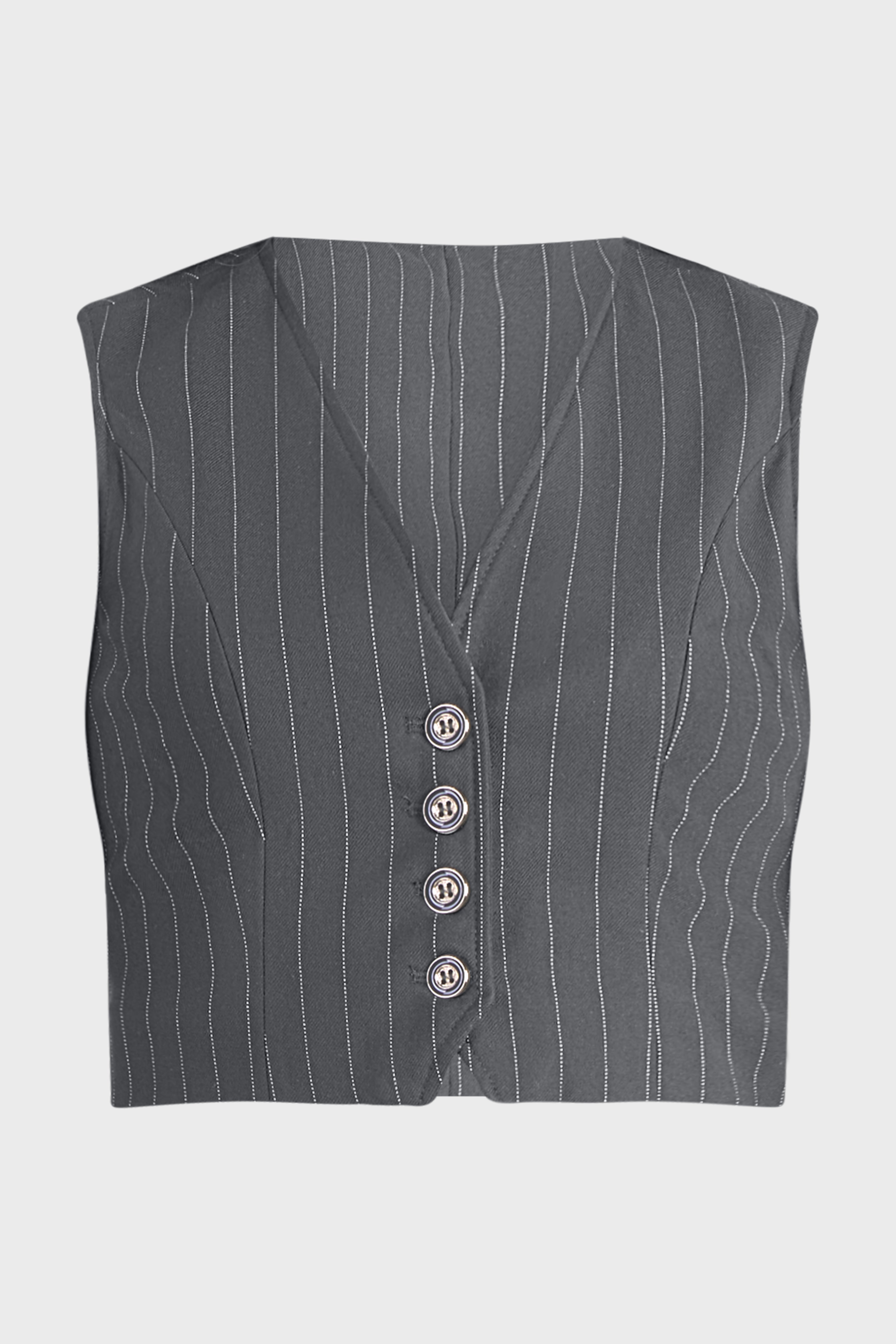 Il gilet sofisticato senza maniche dall’ importante abbottonatura monopetto, è in grado di garantire una vestibilità avvitata che abbraccia il corpo delicatamente, mentre la lunghezza alla vita dona equilibrio al design. Realizzato in mano lana, tessuto morbido e lucente grazie al suo effetto gessato. Il modello è caratterizzato dall’ampio scollo a V, ma ad impreziosire il capo sono i bottoni con ghiera tono su tono. Ideale da indossare come sotto giacca insieme al blazer in coordinato della collezione, o come protagonista di un look più casual unendo così stile e comfort in un connubio di eleganza senza sforzo.