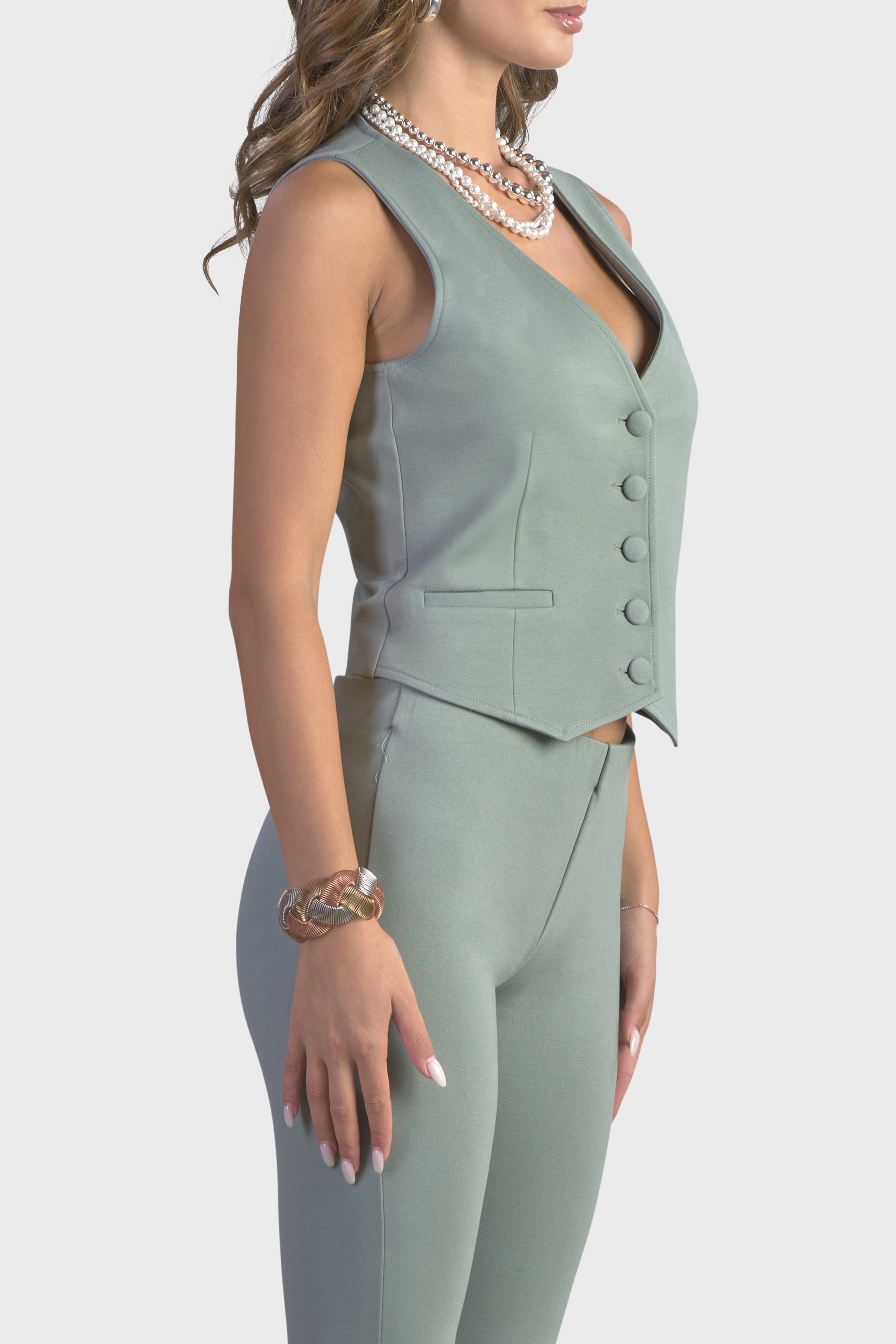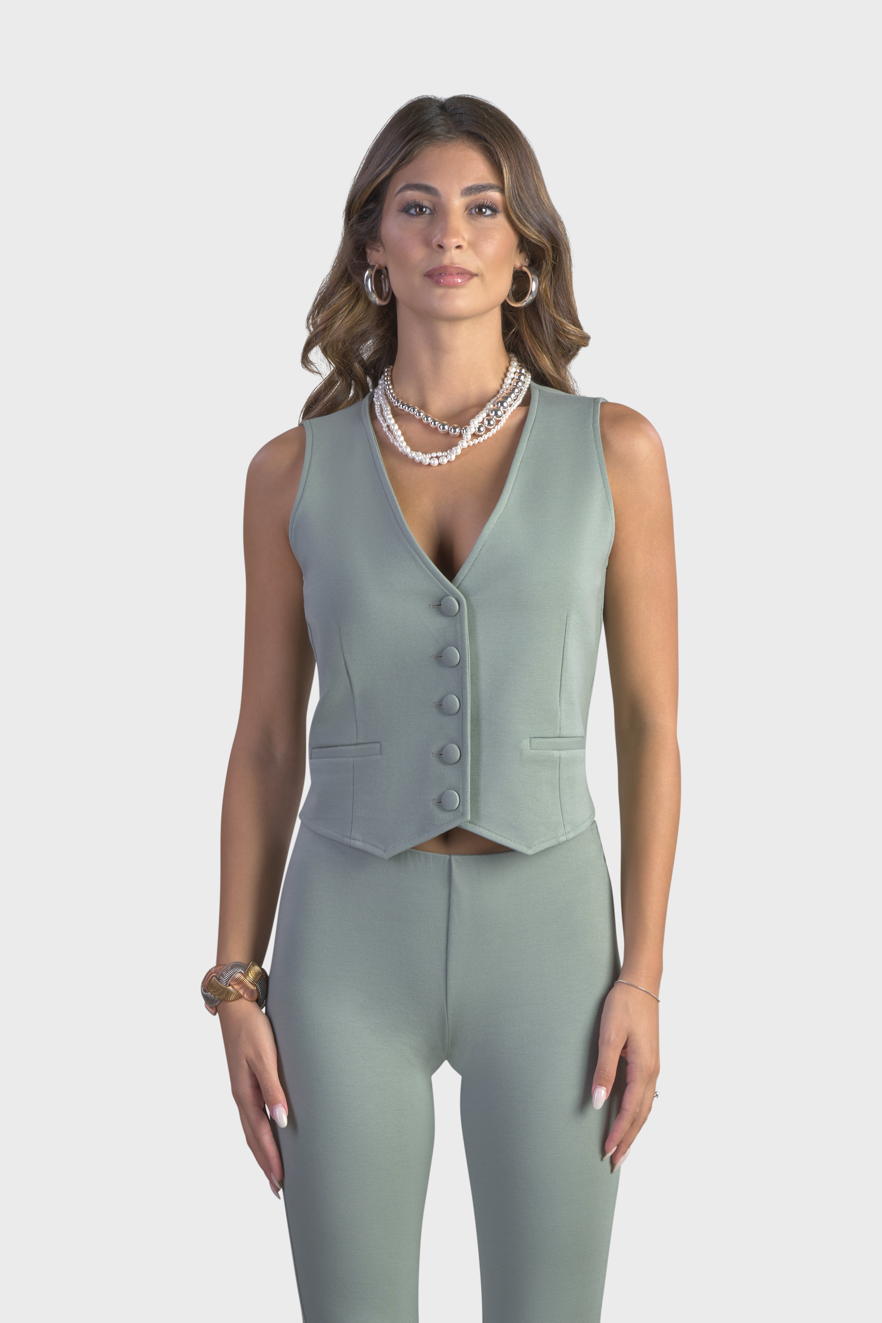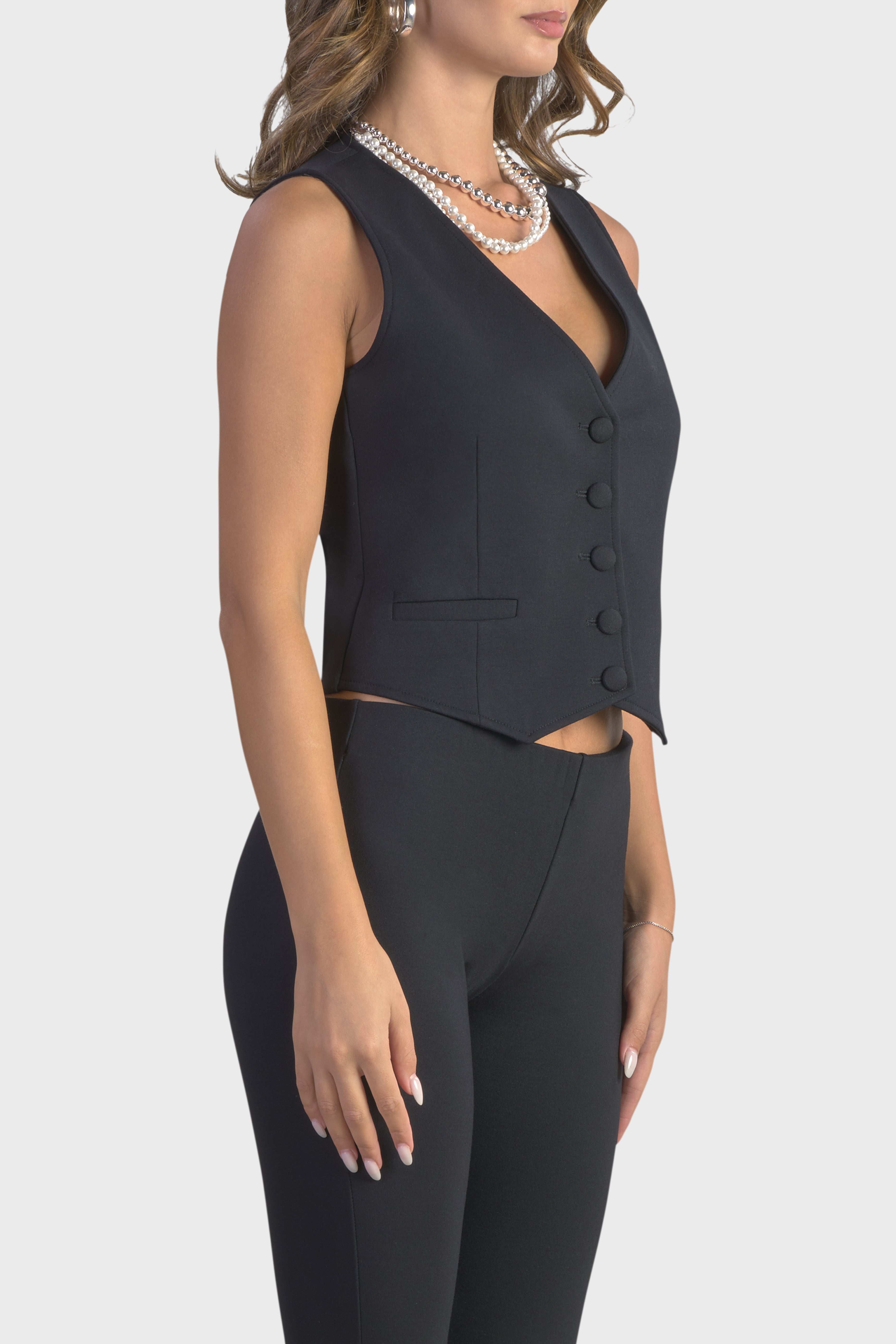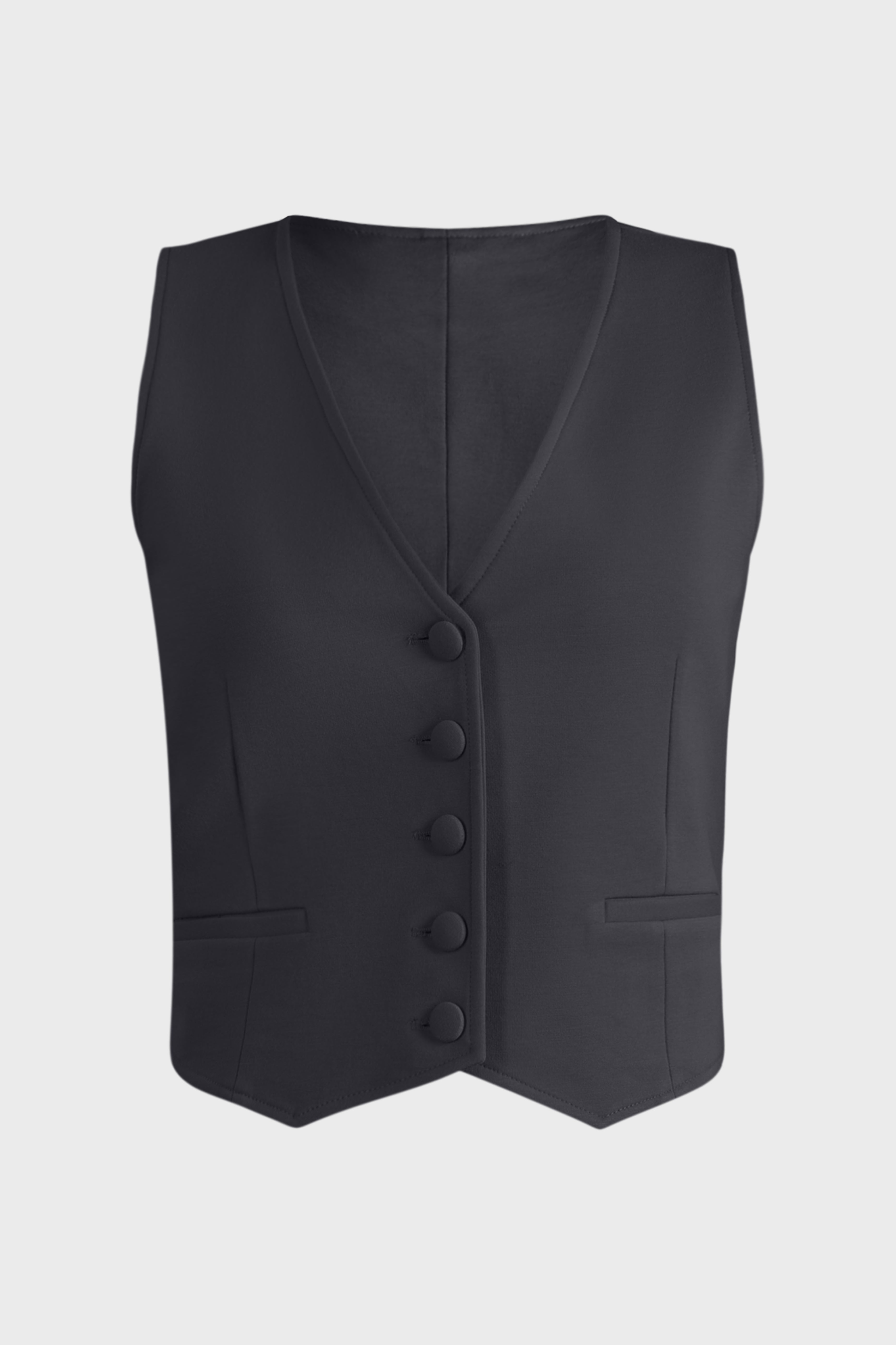 La linea avvitata di questo gilet monopetto è un esempio di eleganza minimalista. Realizzato in punto milano, tessuto elastico, dalla mano corposa, comodo e resistente. Il modello è caratterizzato dai bottoni tono su tono e le due tasche a filo sul davanti. Ideale da indossare in ufficio o per una passeggiata, facilmente abbinabile al pantalone Dafne in coordinato della collezione, offrendo un mix di stile e praticità.