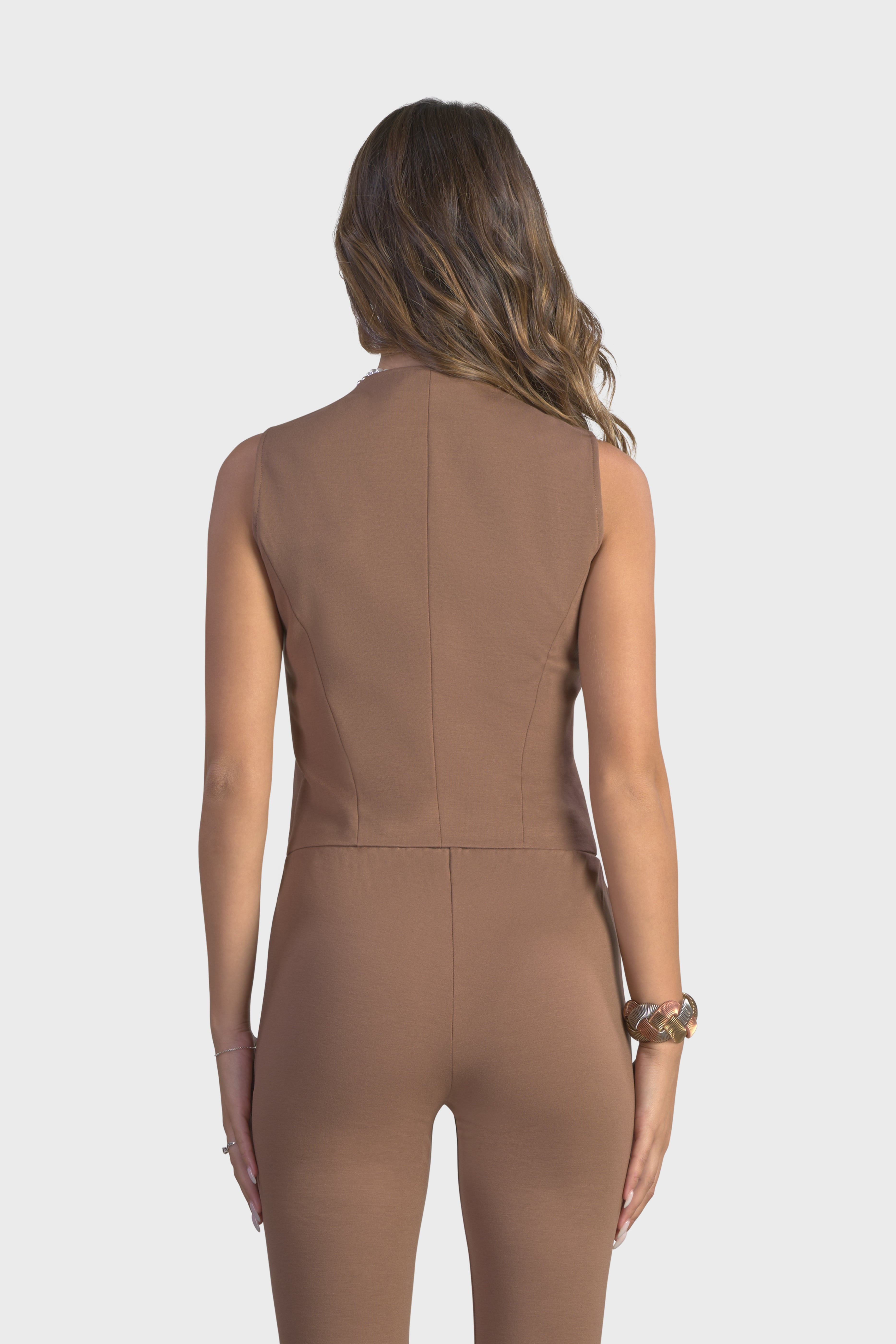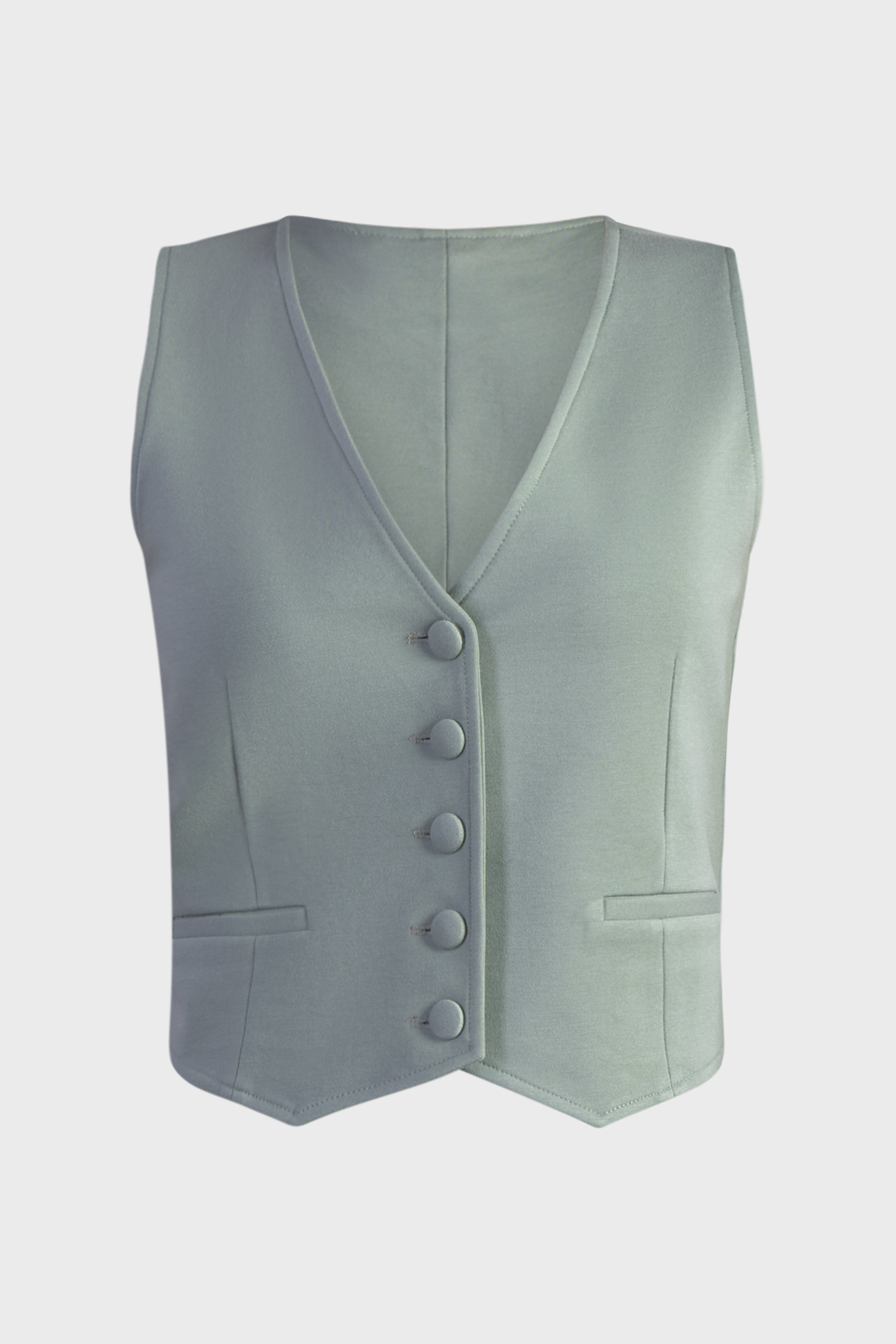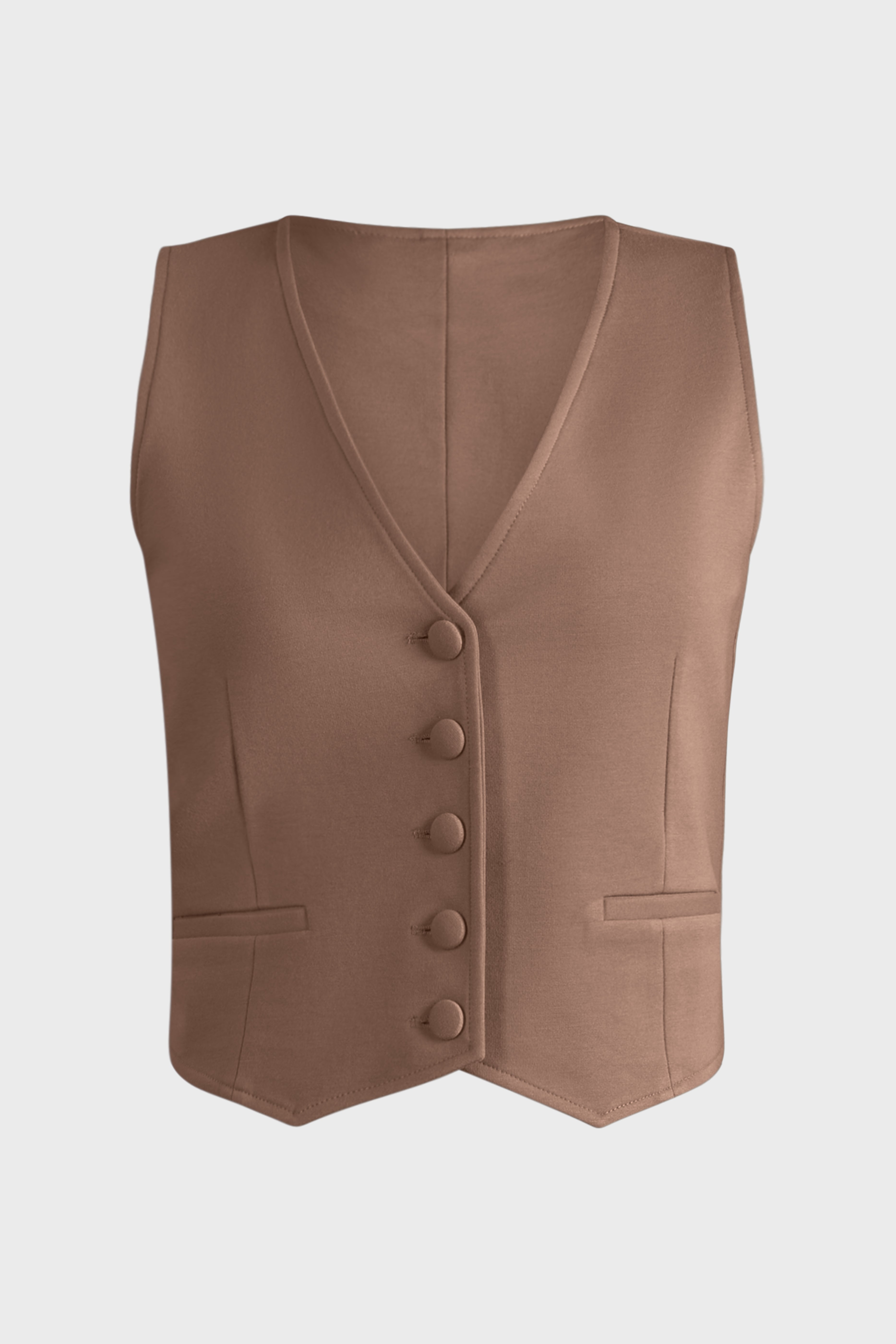 La linea avvitata di questo gilet monopetto è un esempio di eleganza minimalista. Realizzato in punto milano, tessuto elastico, dalla mano corposa, comodo e resistente. Il modello è caratterizzato dai bottoni tono su tono e le due tasche a filo sul davanti. Ideale da indossare in ufficio o per una passeggiata, facilmente abbinabile al pantalone Dafne in coordinato della collezione, offrendo un mix di stile e praticità.