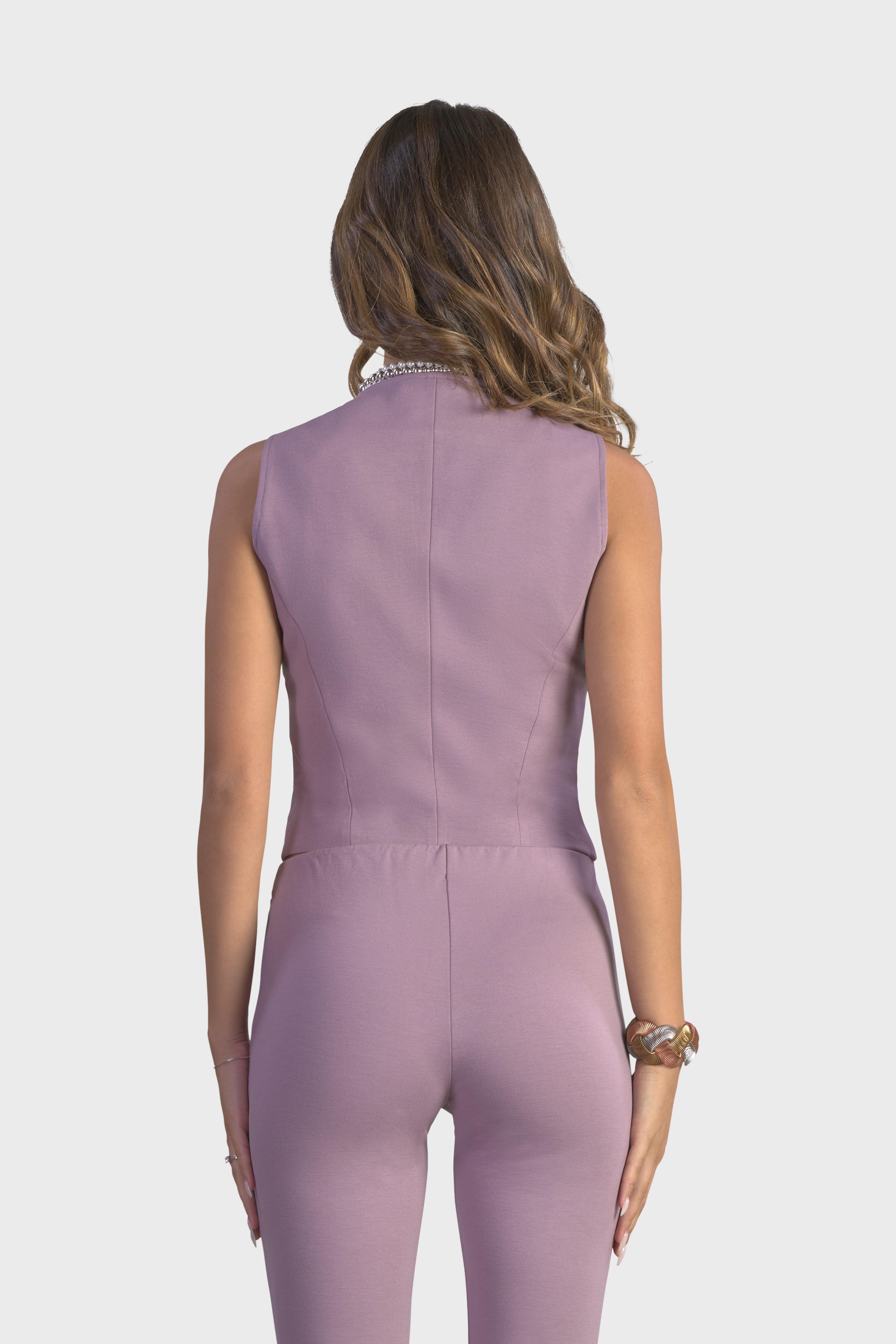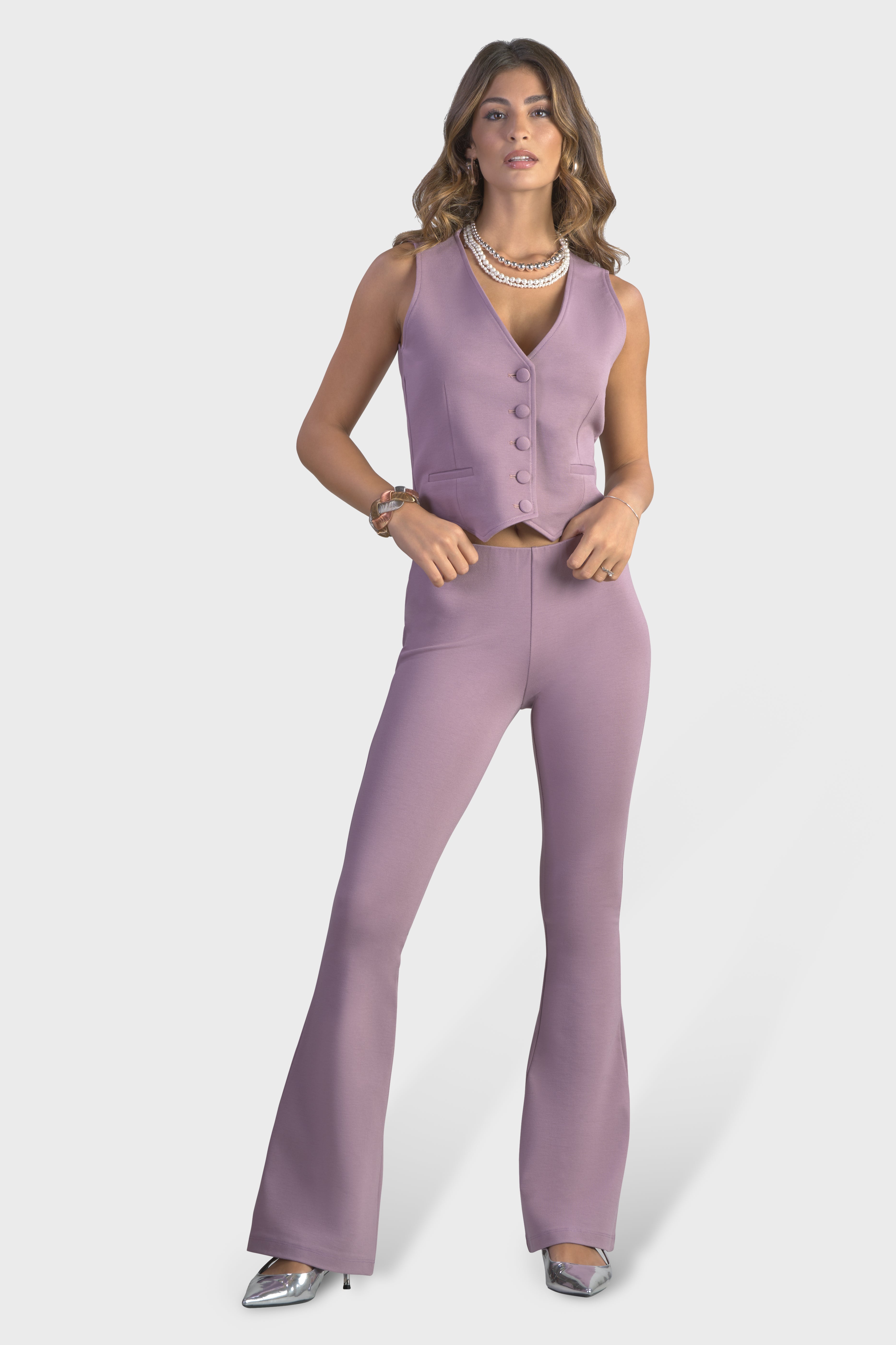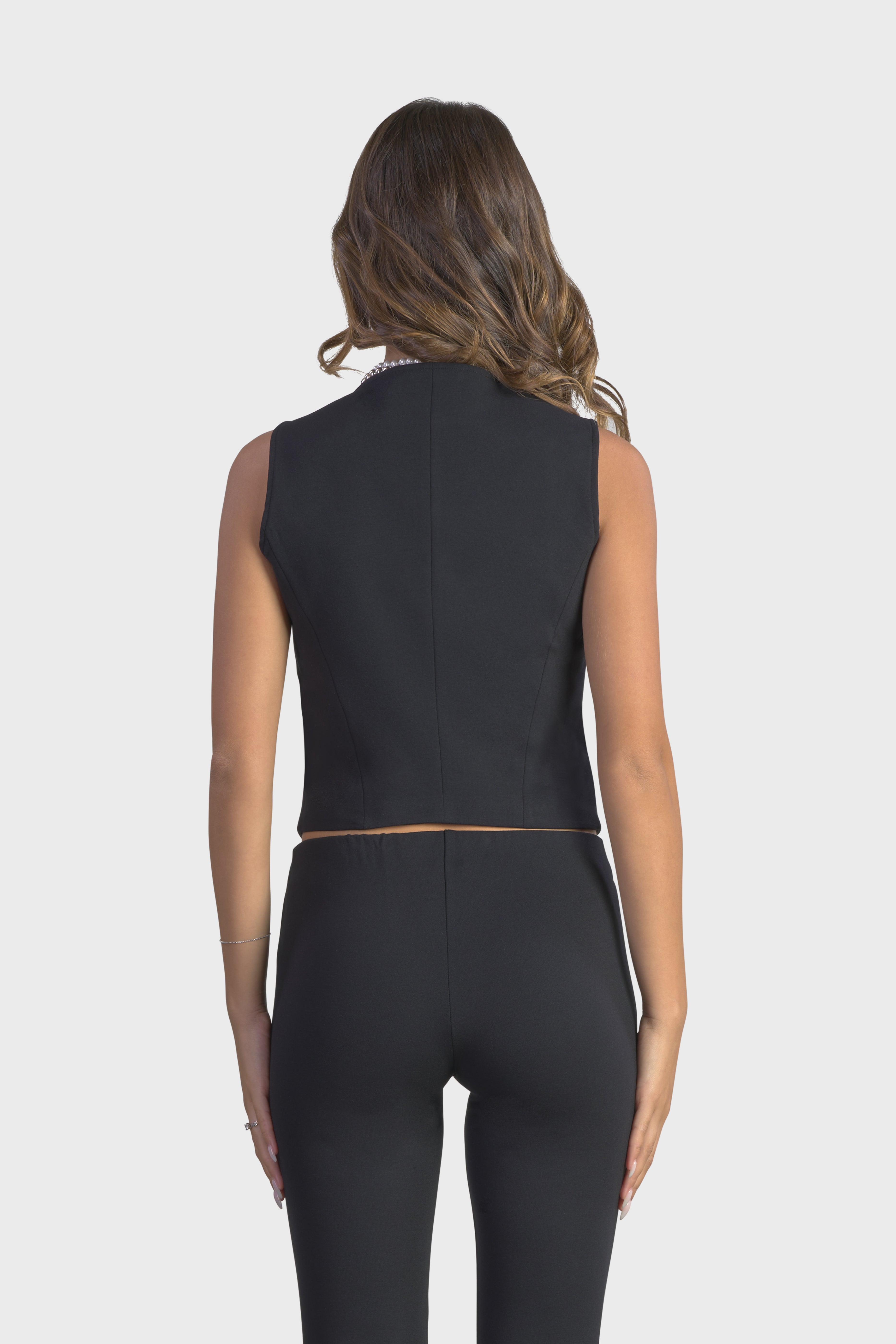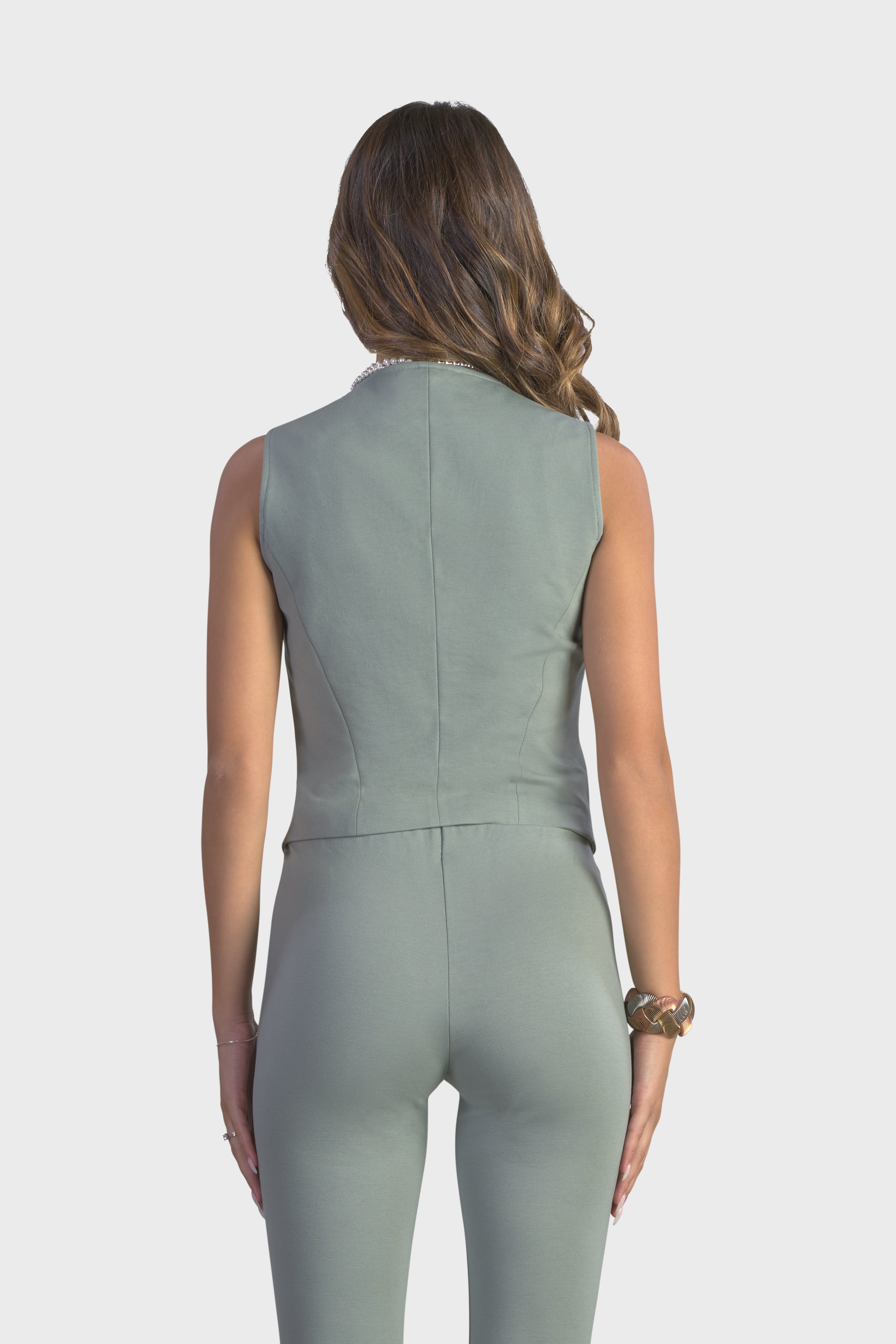 La linea avvitata di questo gilet monopetto è un esempio di eleganza minimalista. Realizzato in punto milano, tessuto elastico, dalla mano corposa, comodo e resistente. Il modello è caratterizzato dai bottoni tono su tono e le due tasche a filo sul davanti. Ideale da indossare in ufficio o per una passeggiata, facilmente abbinabile al pantalone Dafne in coordinato della collezione, offrendo un mix di stile e praticità.