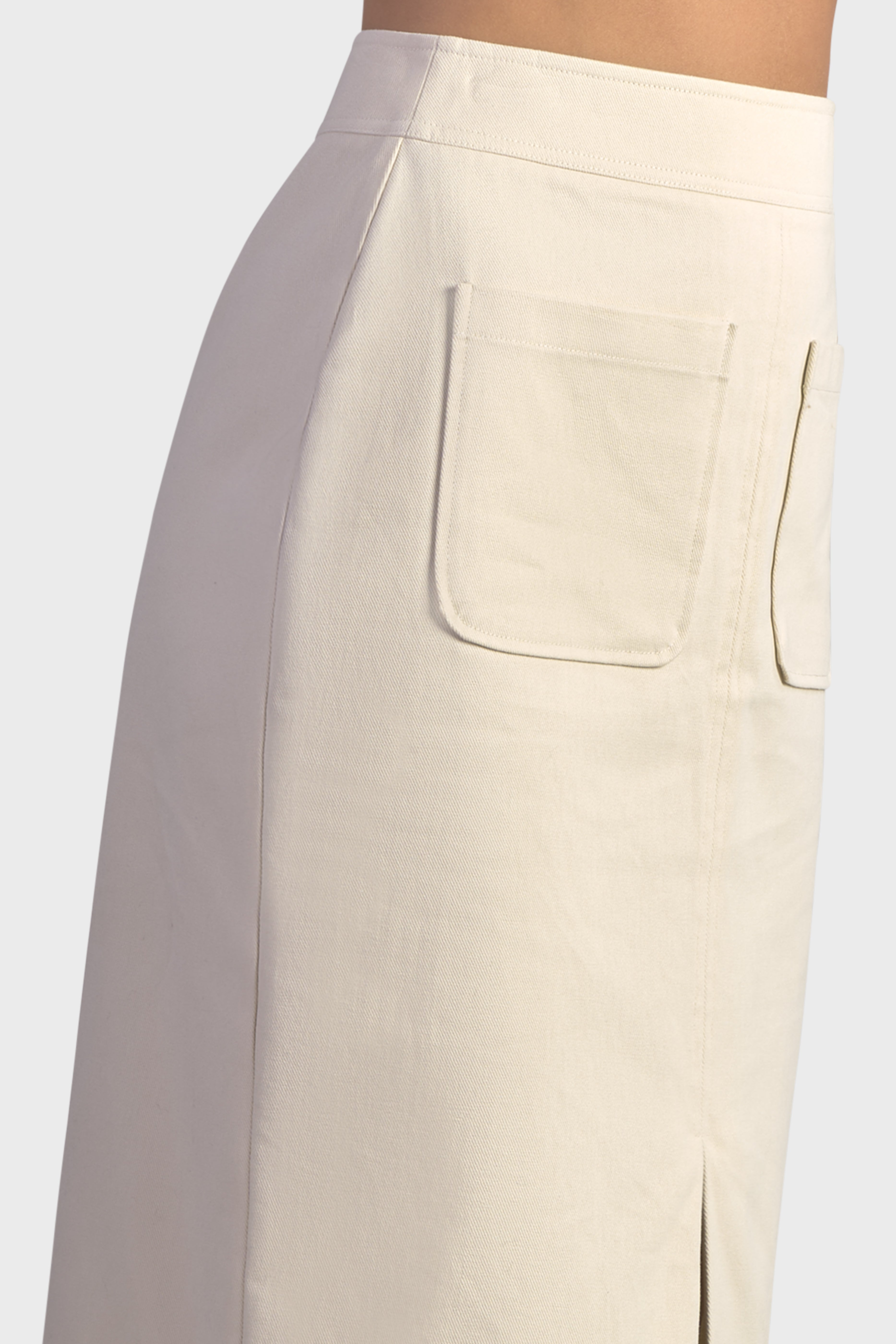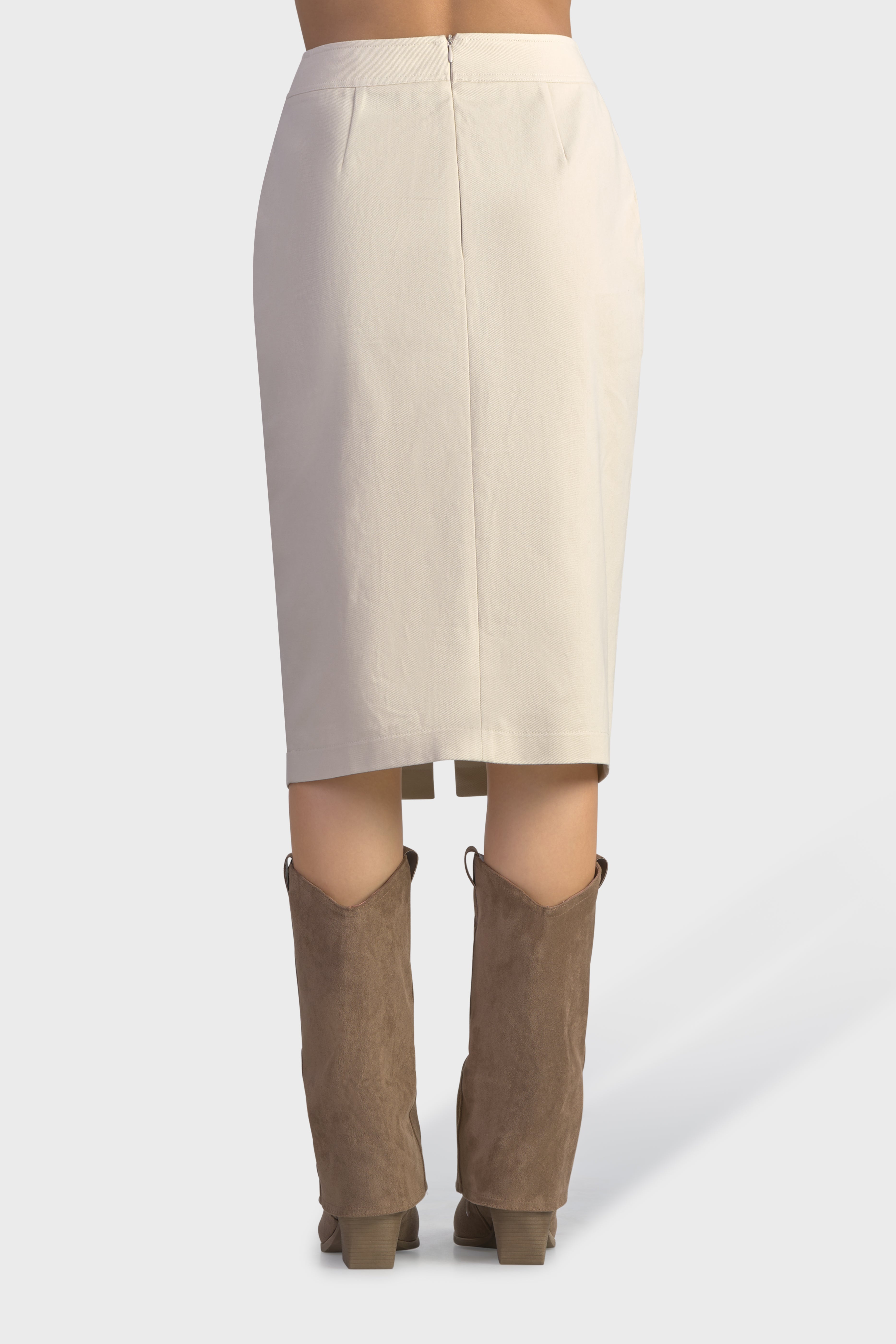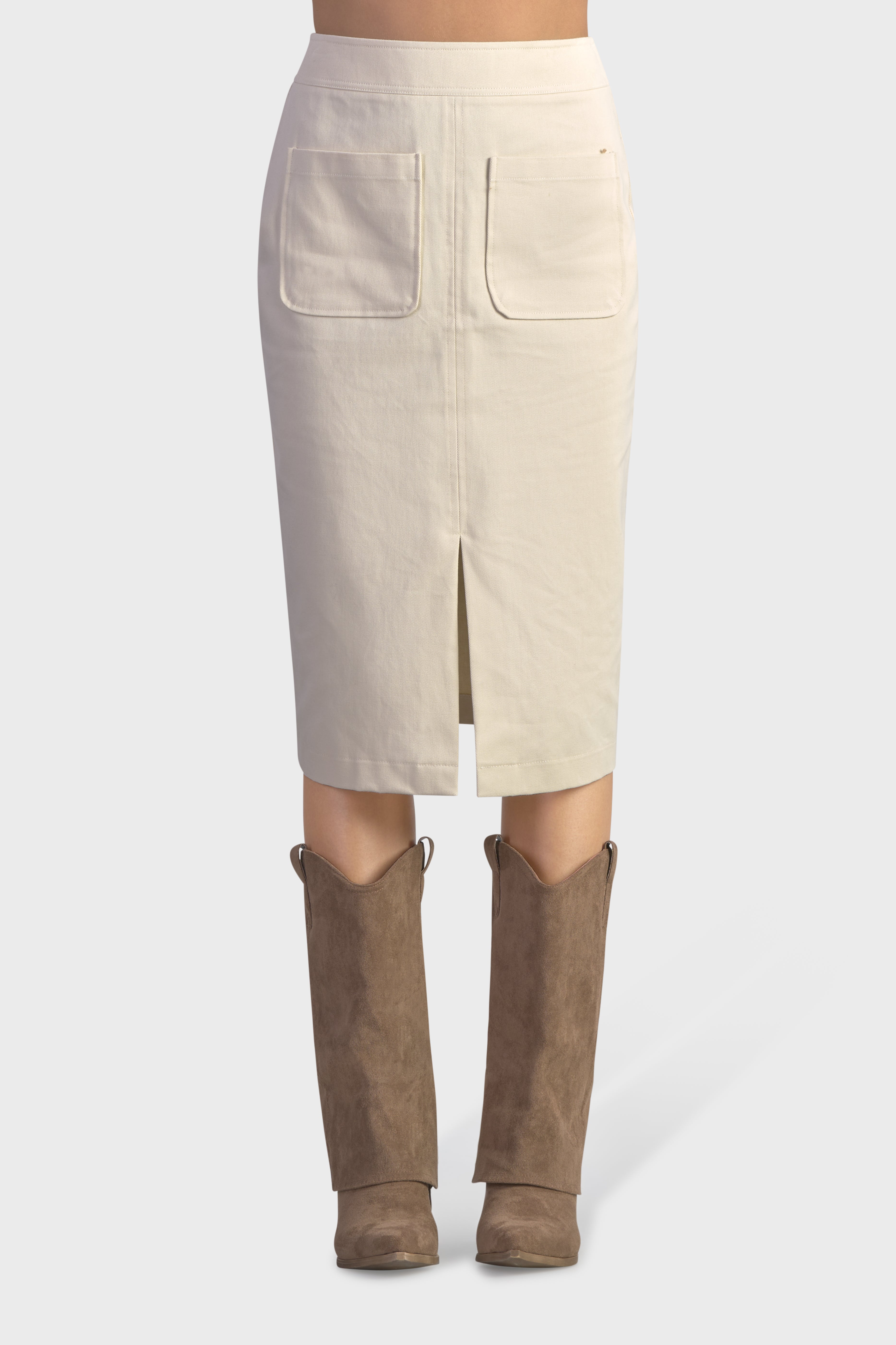 Questa gonna a vita alta dalla vestibilità fasciante è un capolavoro di sofisticazione urbana. Realizzati in twill di cotone, tessuto resistente, dalla trama diagonale che conferisce un aspetto e una sensazione unica. Lo spacco delicato sul davanti, sottolinea l’estetica raffinata, mentre le tasche a toppa donano un tocco contemporaneo. Ad evidenziare la cura nei dettagli sono le impunture tono su tono. Infine, il modello è completato dalla chiusura con cerniera nascosta sul centro dietro, per una maggiore rifinitura. Ideale da indossare in città per dare vita ad un look metropolitano o di sera abbinata ad un paio di stivali.