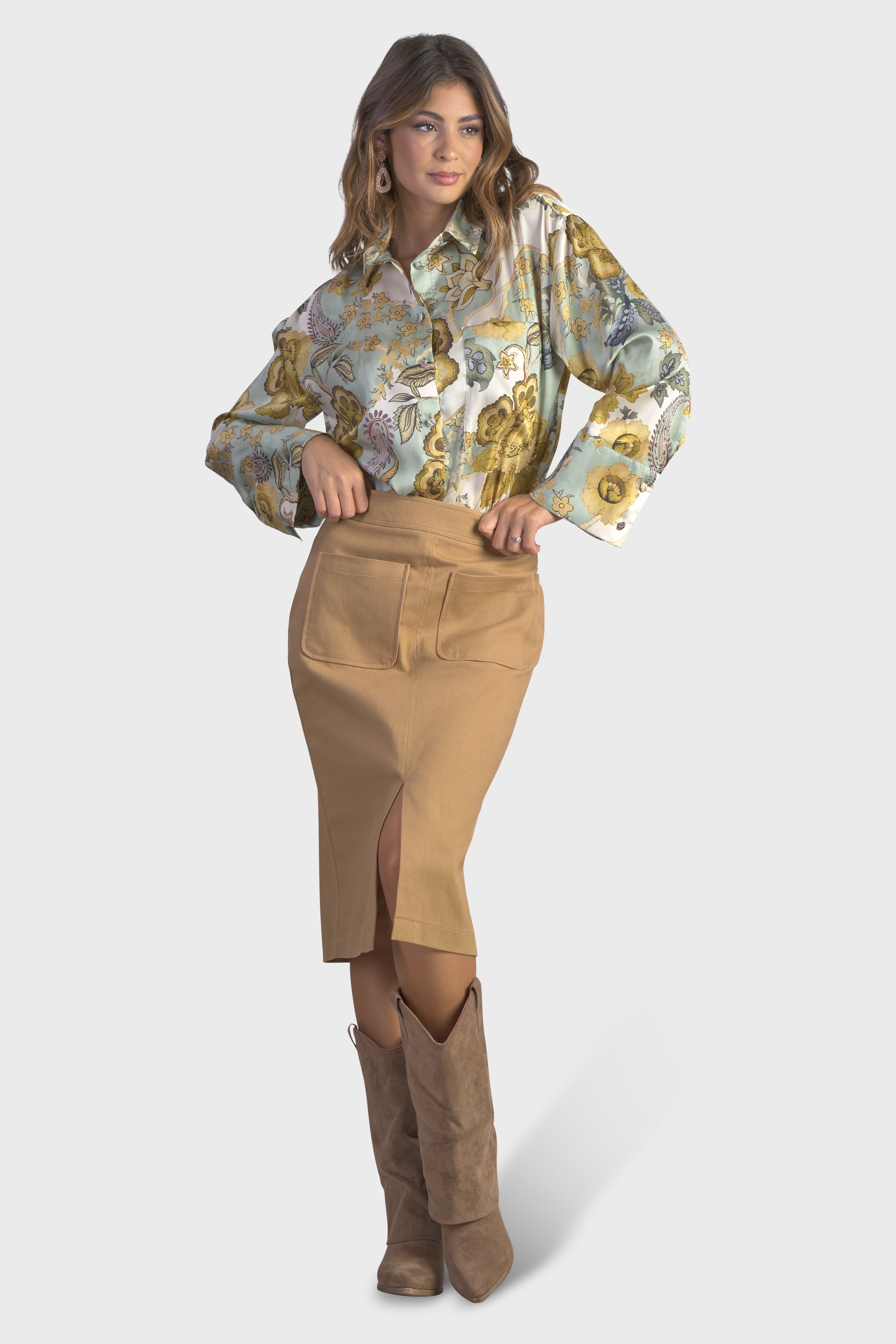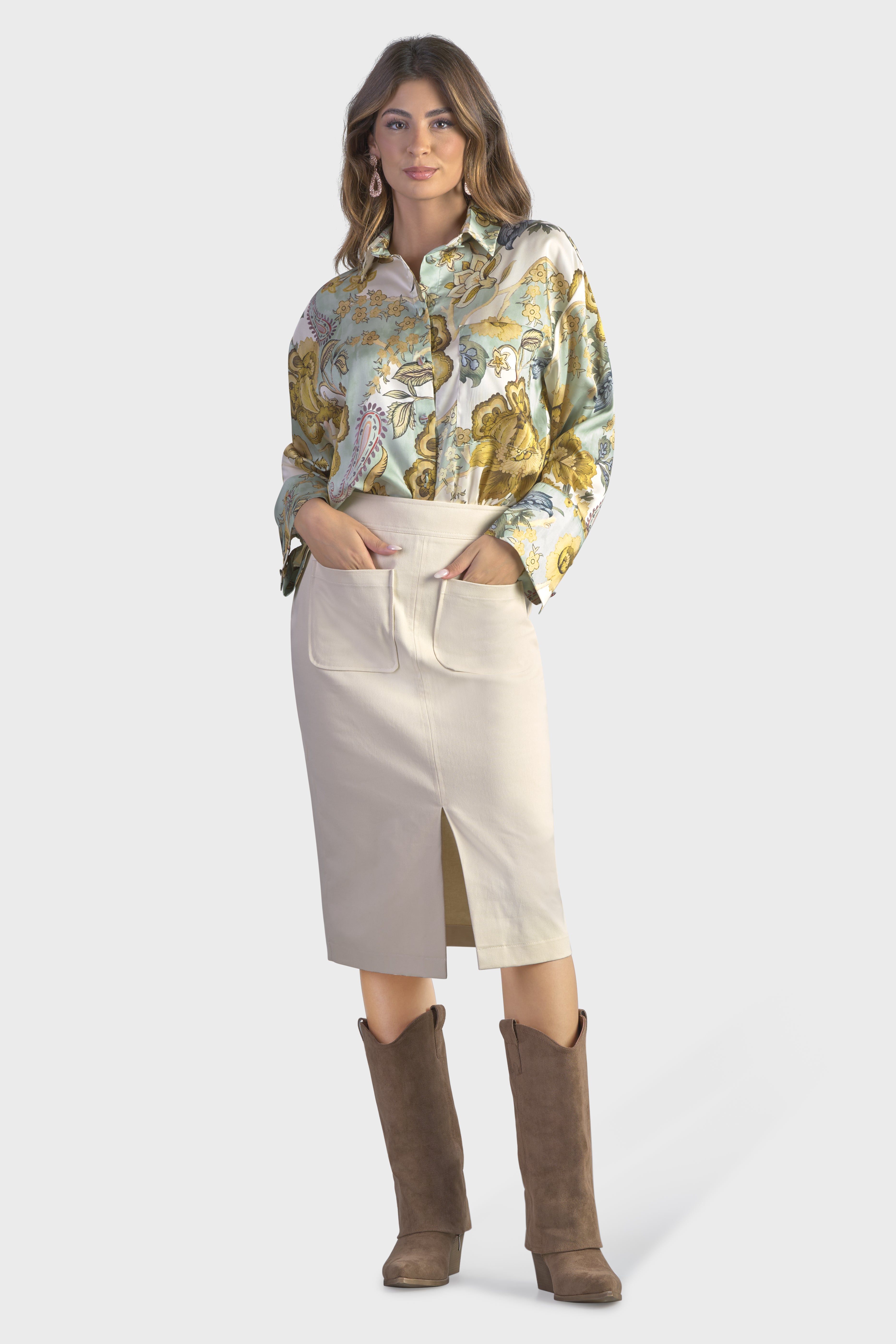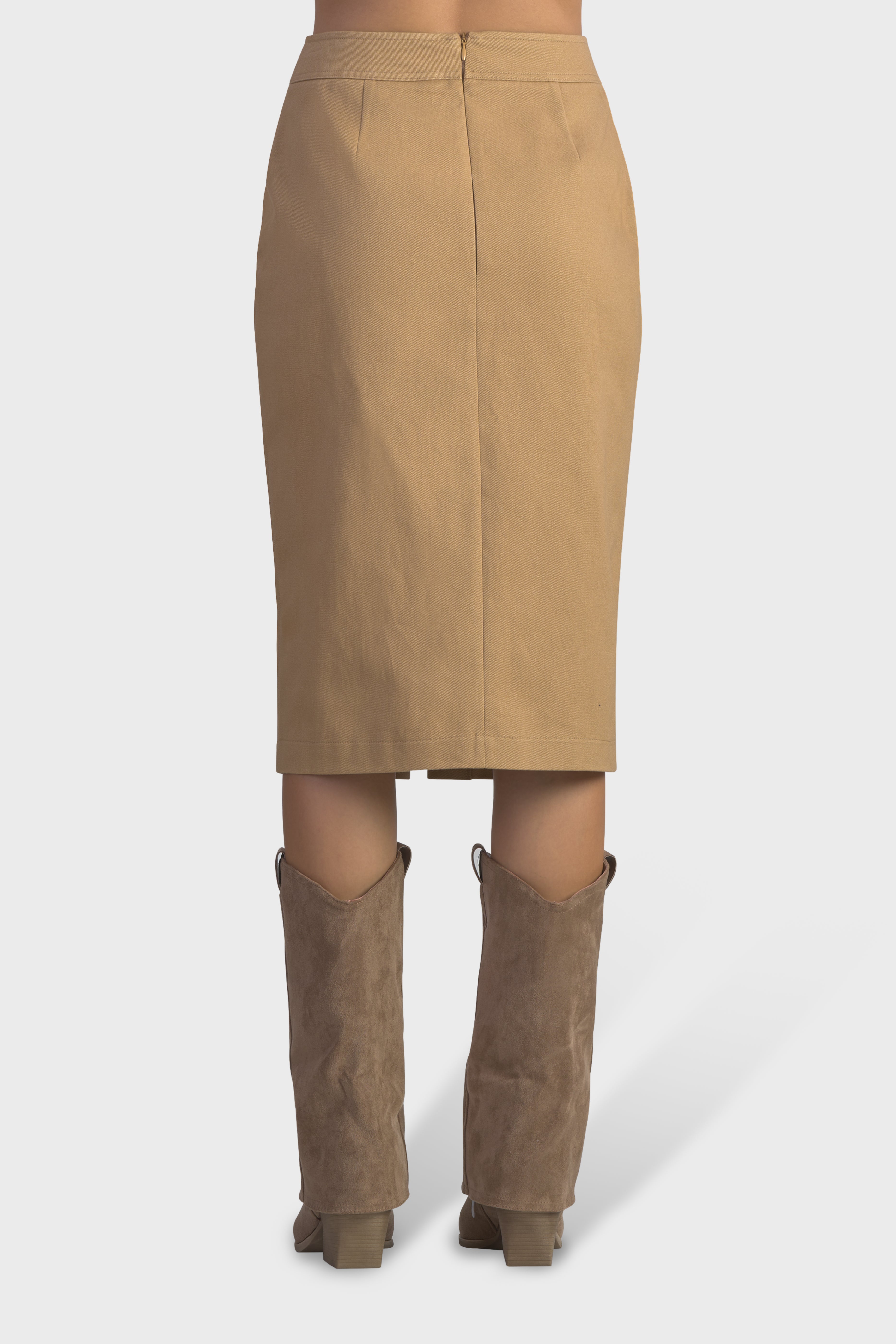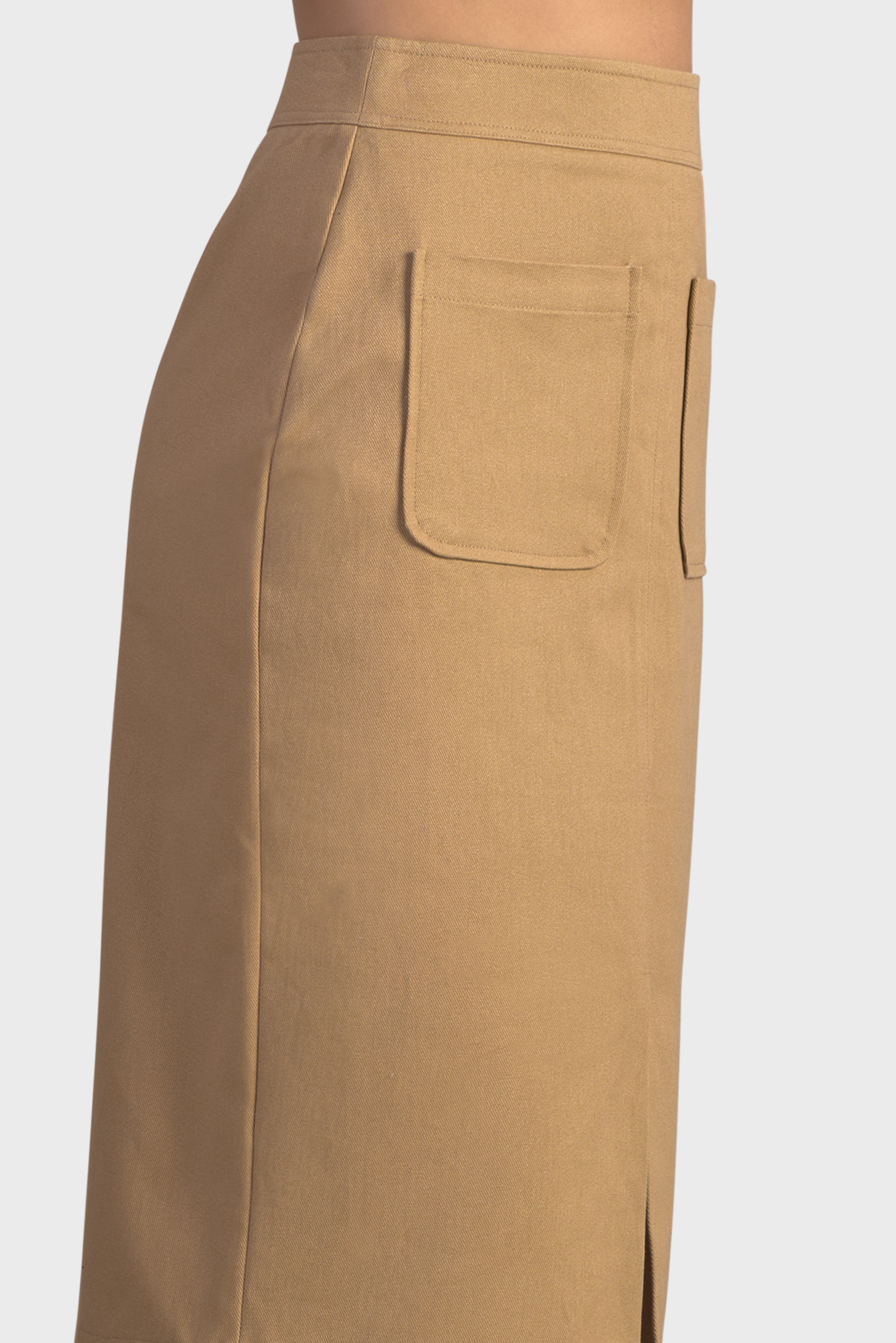 Questa gonna a vita alta dalla vestibilità fasciante è un capolavoro di sofisticazione urbana. Realizzati in twill di cotone, tessuto resistente, dalla trama diagonale che conferisce un aspetto e una sensazione unica. Lo spacco delicato sul davanti, sottolinea l’estetica raffinata, mentre le tasche a toppa donano un tocco contemporaneo. Ad evidenziare la cura nei dettagli sono le impunture tono su tono. Infine, il modello è completato dalla chiusura con cerniera nascosta sul centro dietro, per una maggiore rifinitura. Ideale da indossare in città per dare vita ad un look metropolitano o di sera abbinata ad un paio di stivali.