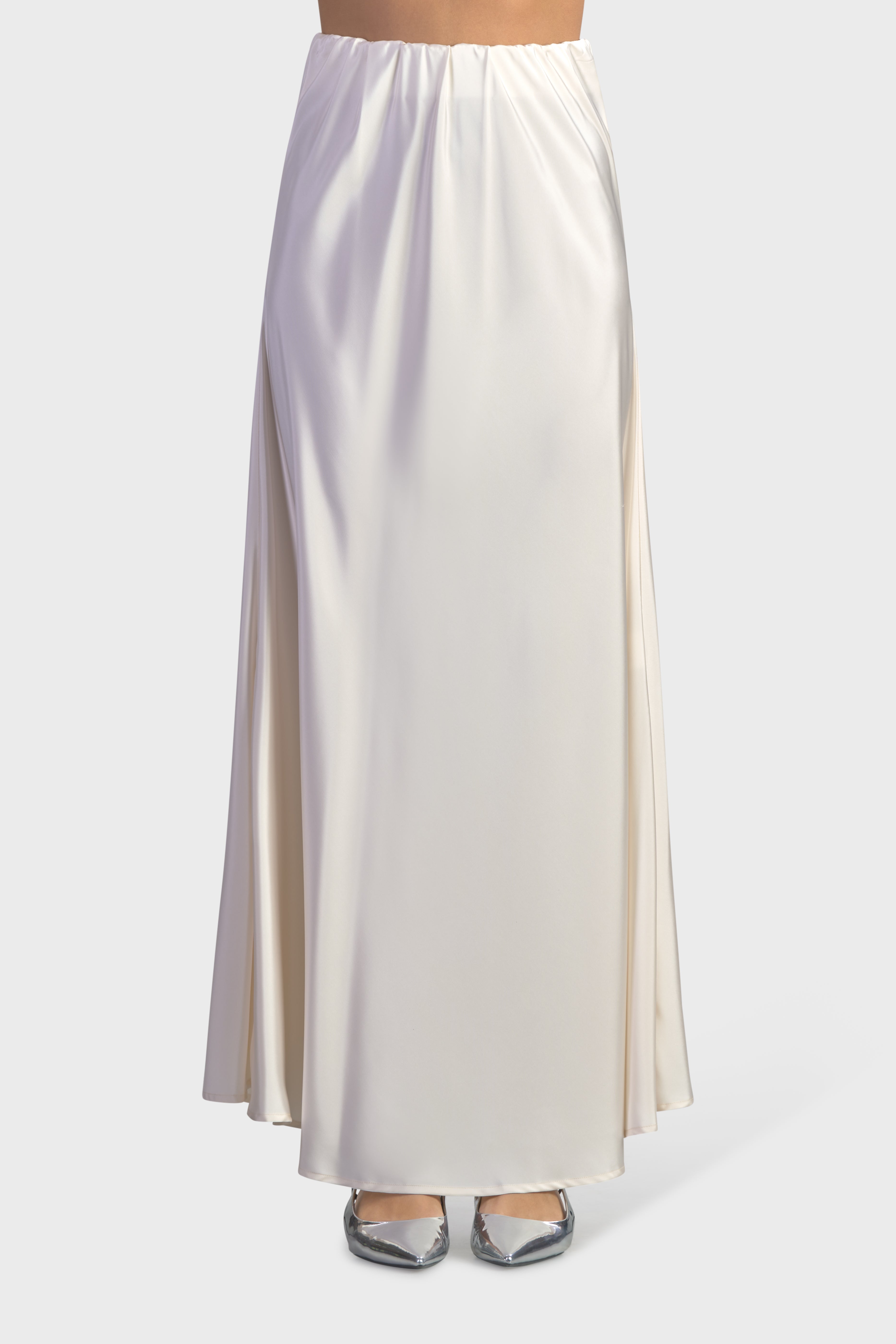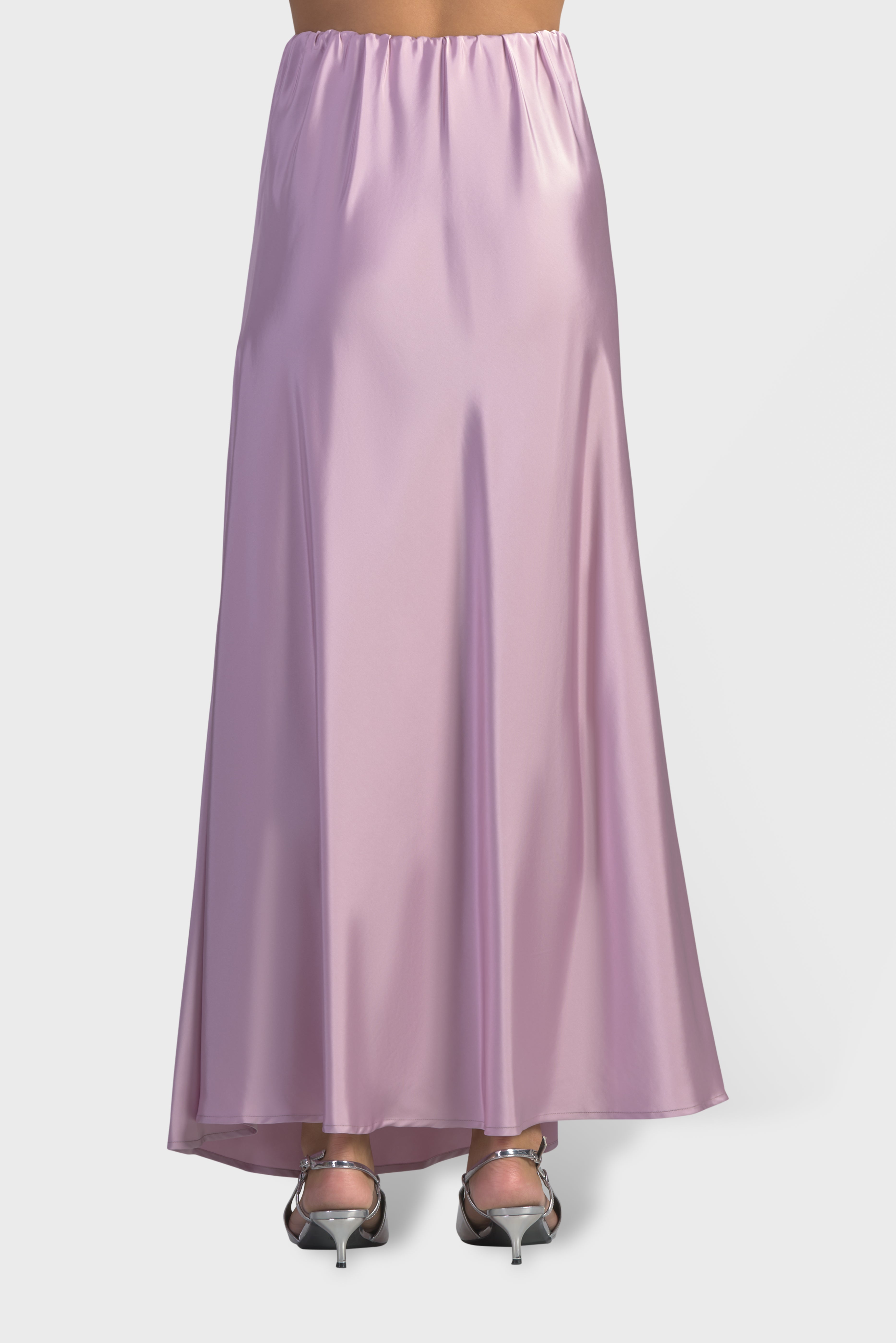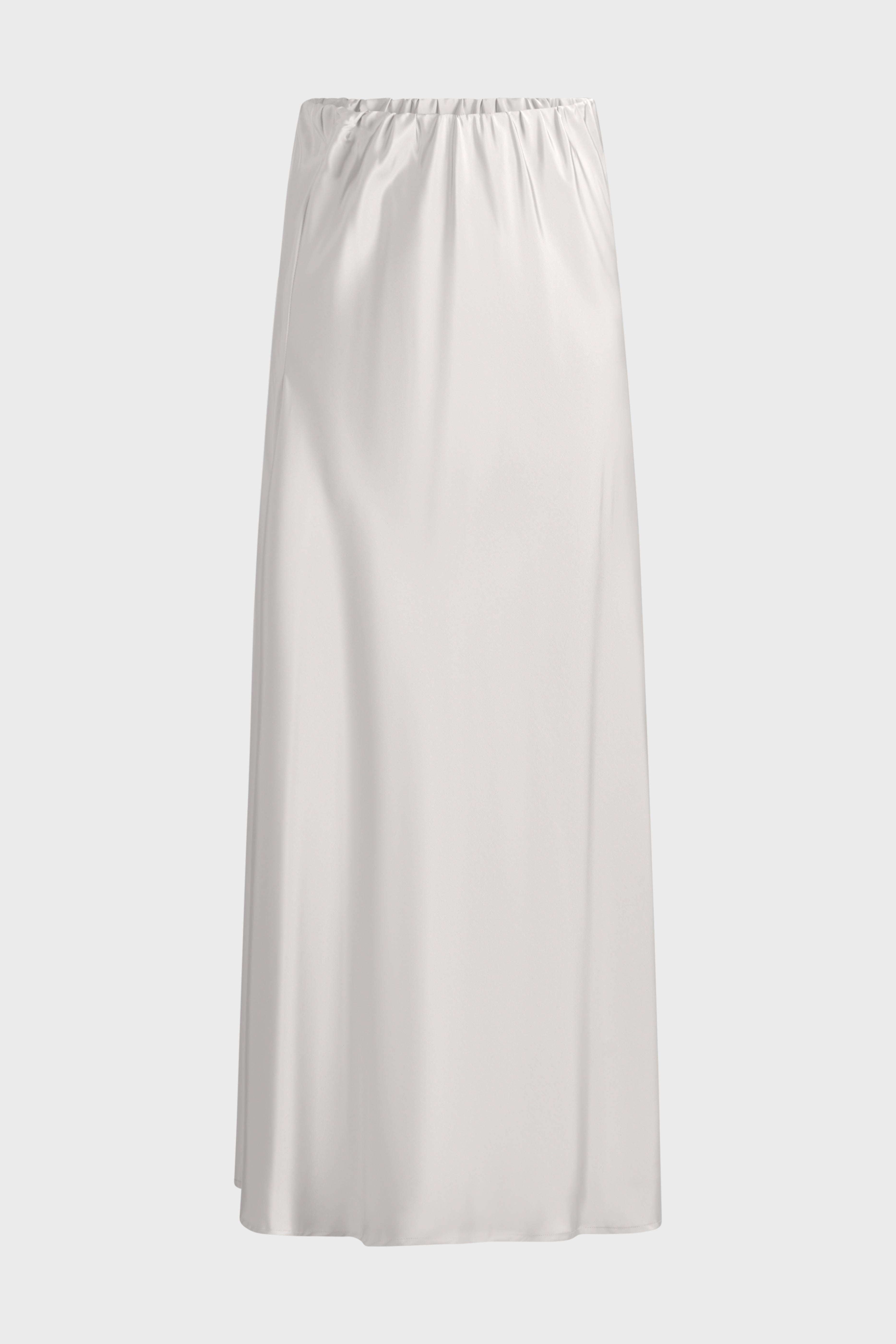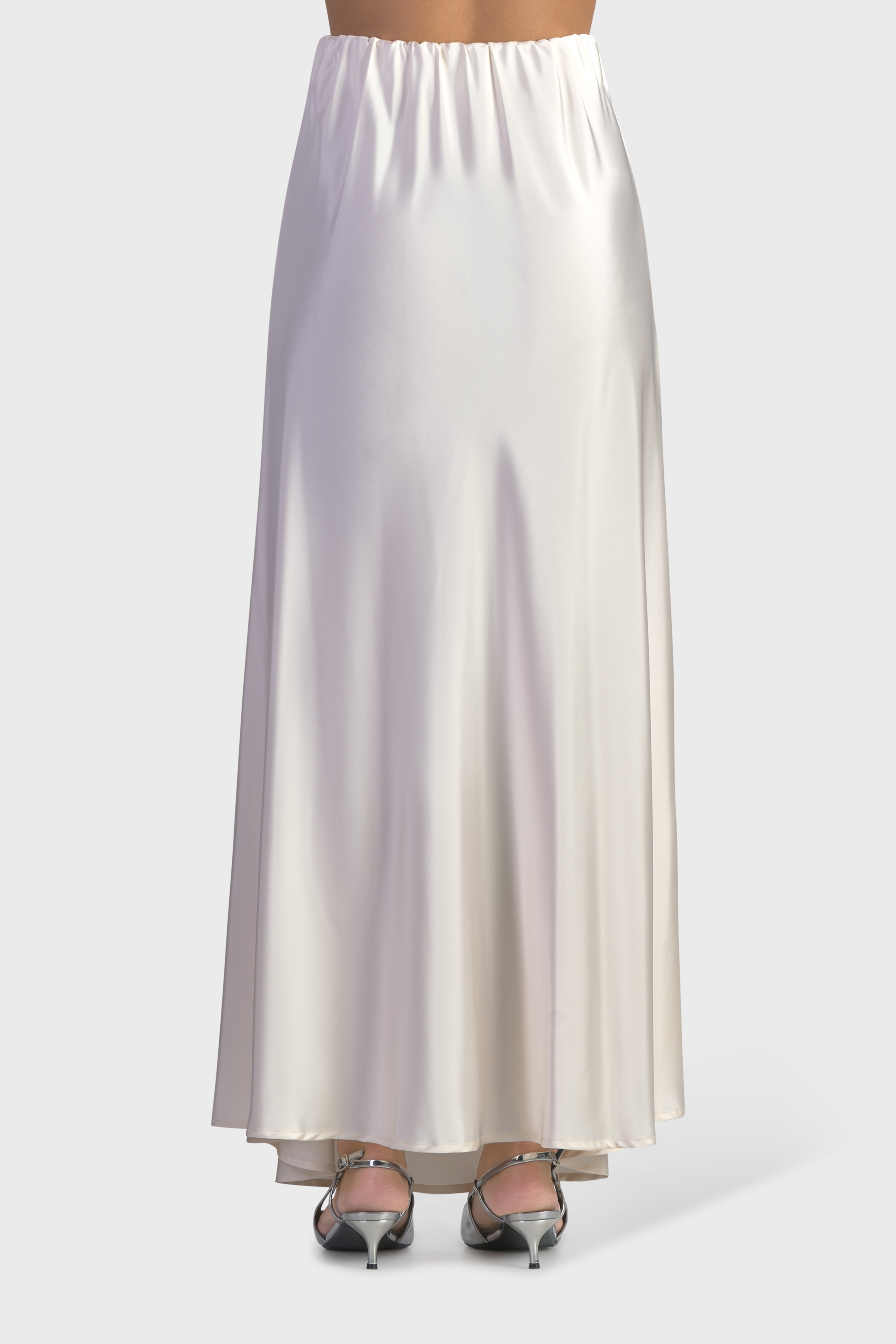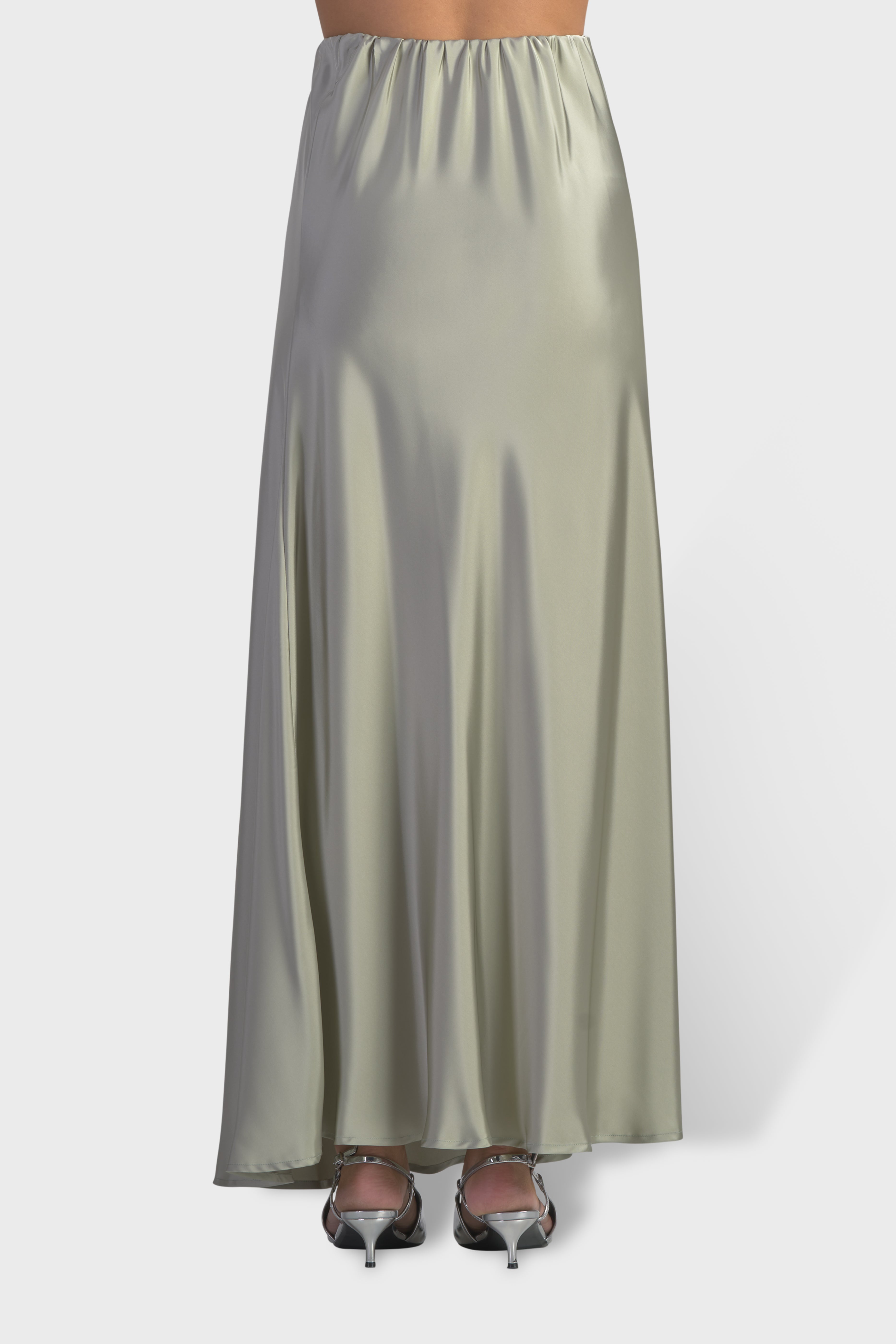 Questa gonna dalle linee fluide è leggermente svasata e ondulante al fondo. Realizzata in uno scivoloso e lucente raso, liscio al tatto, tessuto che si presta a vestire in maniera impeccabile qualsiasi tipo di corpo. La silhouette semplice e sofisticata, è caratterizzata dall’elastico nascosto in vita, in grado di definire un effetto arricciato. La gonna è perfetta per essere abbinata con facilità alla camicia Iside in coordinato della collezione per un look chic e senza tempo.
