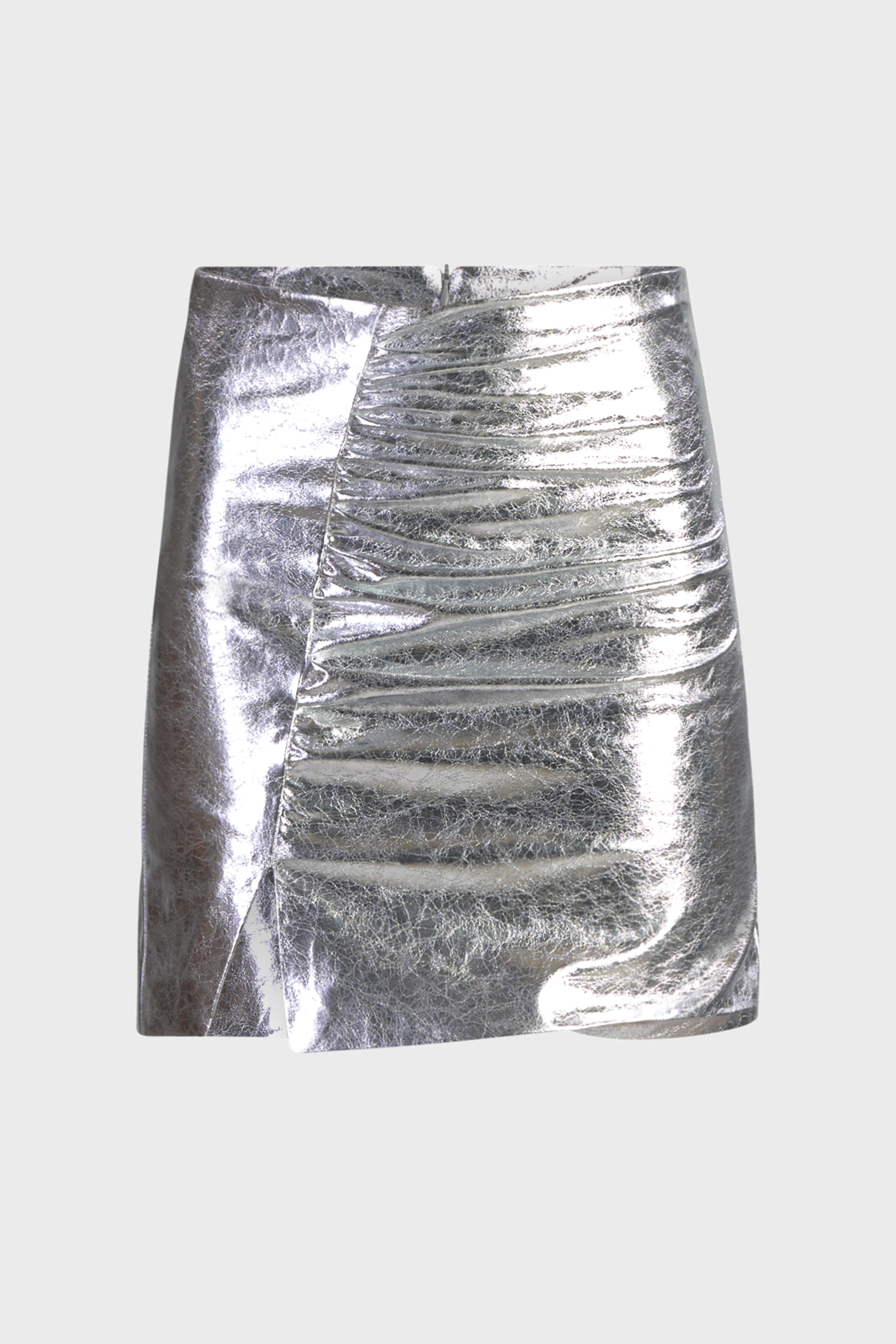 Questa gonna a vita alta dalla linea dritta incanta con la sua lucentezza. Realizzata in ecopelle, tessuto dalla finitura metallizzata. Il modello è caratterizzato dall’arriccio sul davanti che culmina in un mini spacco al fondo. Esalta la silhouette, combinando comfort e raffinatezza. Sul retro, vi è una cerniera nascosta che offre una maggiore rifinitura. E’ ideale da indossare con un body o con una camicia per un look versatile ma ricercato, capace di adattarsi a diverse occasioni con uno stile senza tempo.