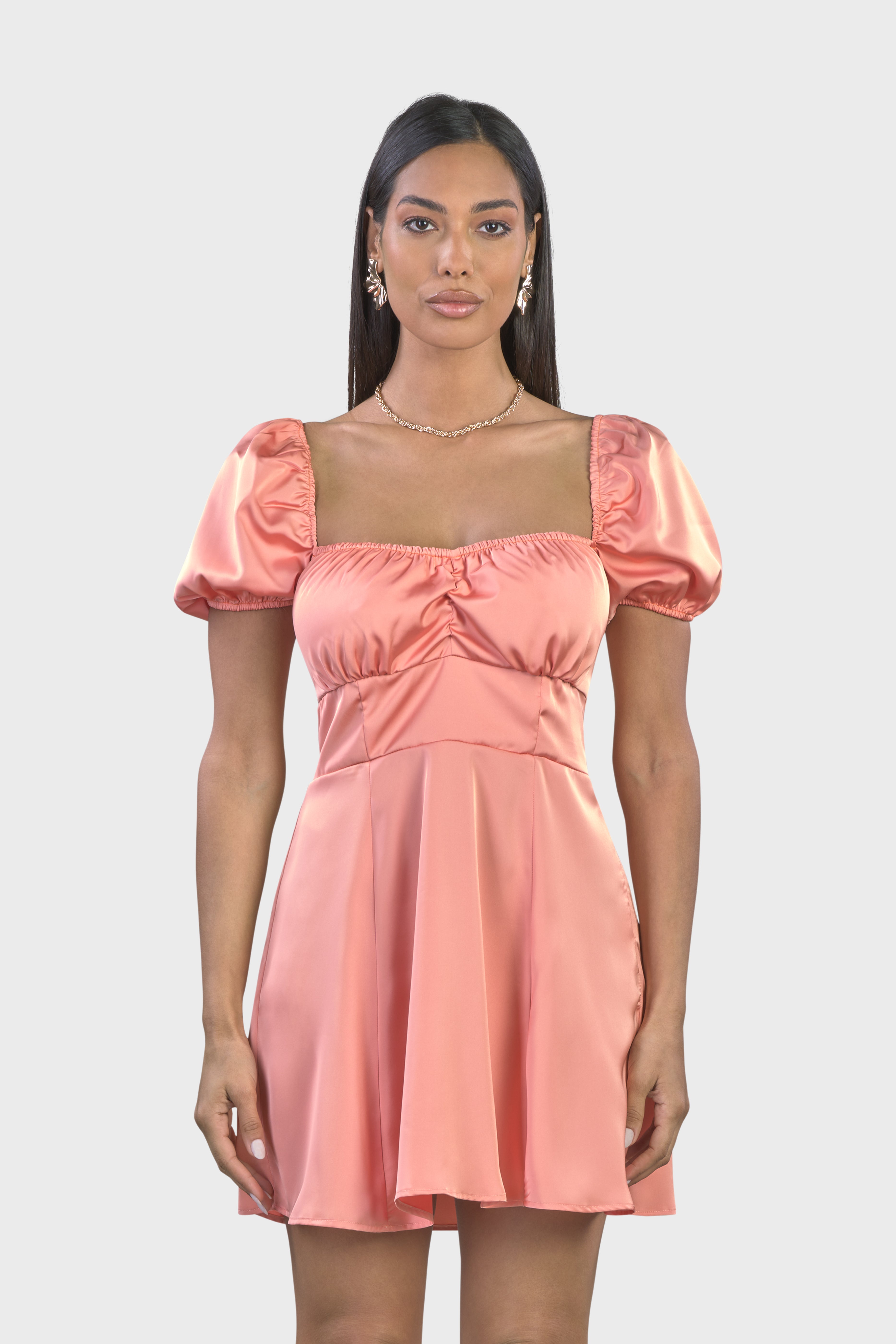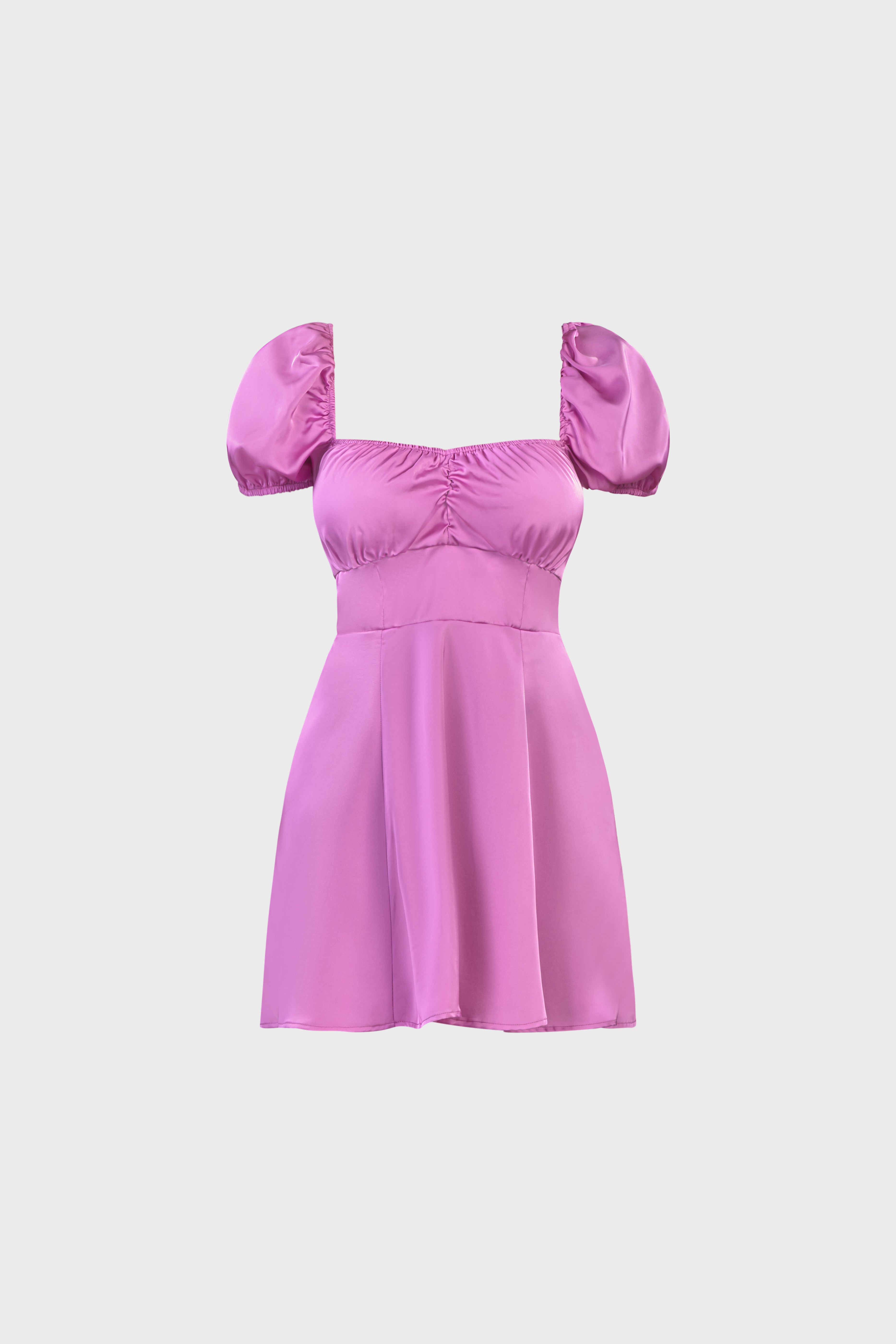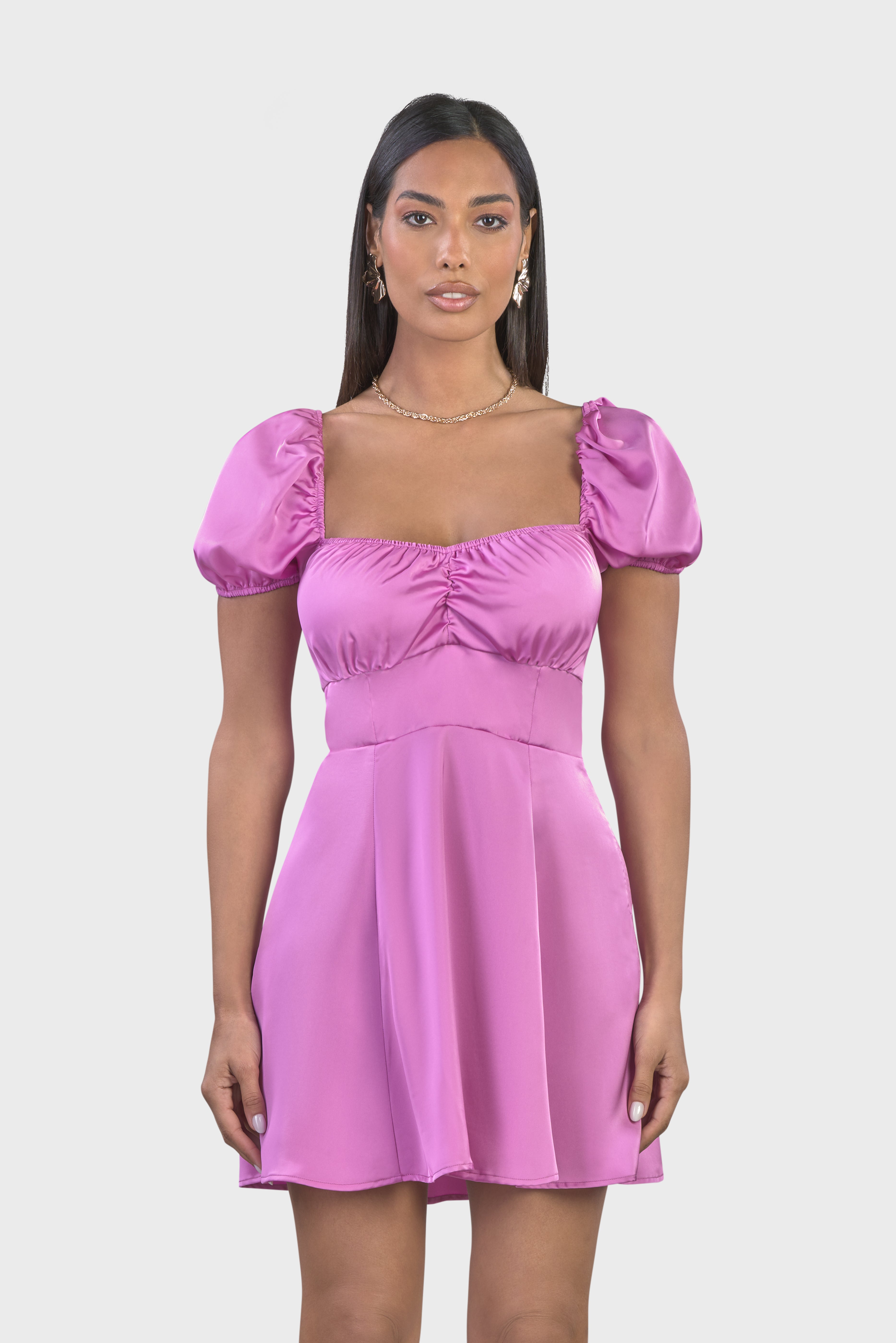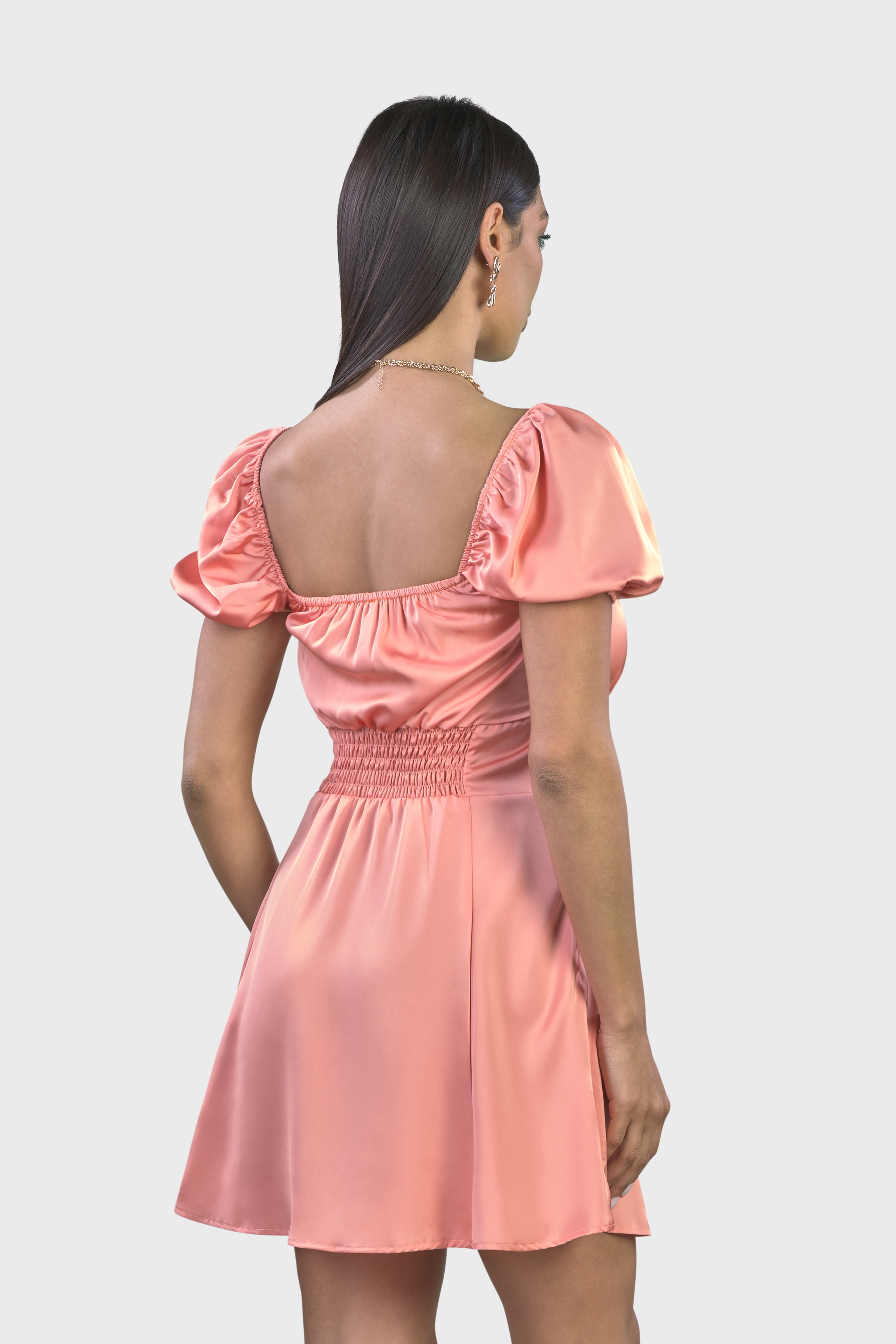 Il design di questo abito è caratterizzato dalla costruzione sartoriale che prende volume grazie alla leggerezza del tessuto scelto, per creare delle linee armoniose e femminili. E’ realizzato in un lucido e liscio tessuto di raso. Per un look fresco e di tendenza, la silhouette è dettagliata dalla manica a sbuffo e dallo scollo a cuore. A completare il modello è il taglio in grado di delineare il punto vita e il punto smock sul retro. Perfetto da indossare il sabato sera o per un occasione chic.