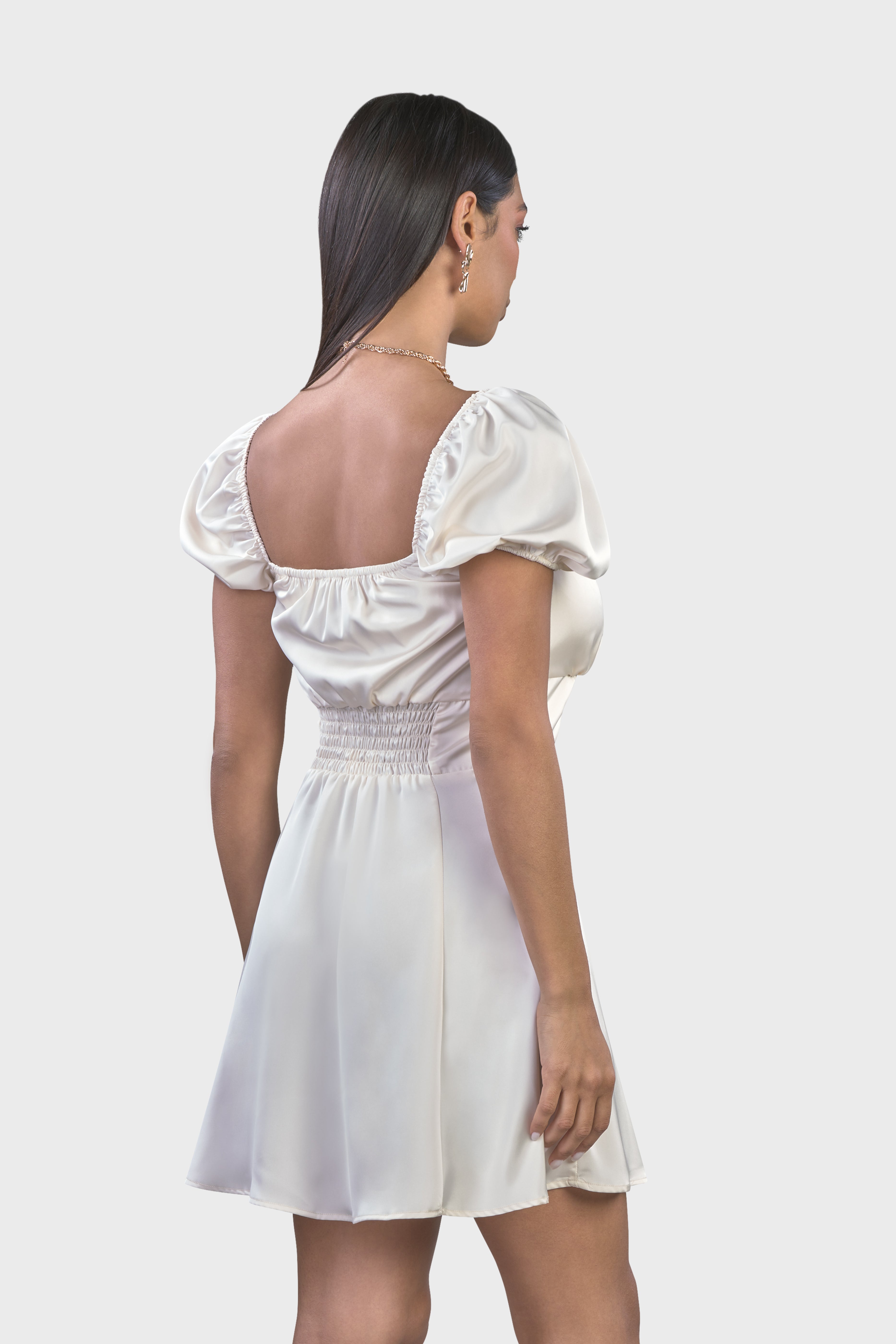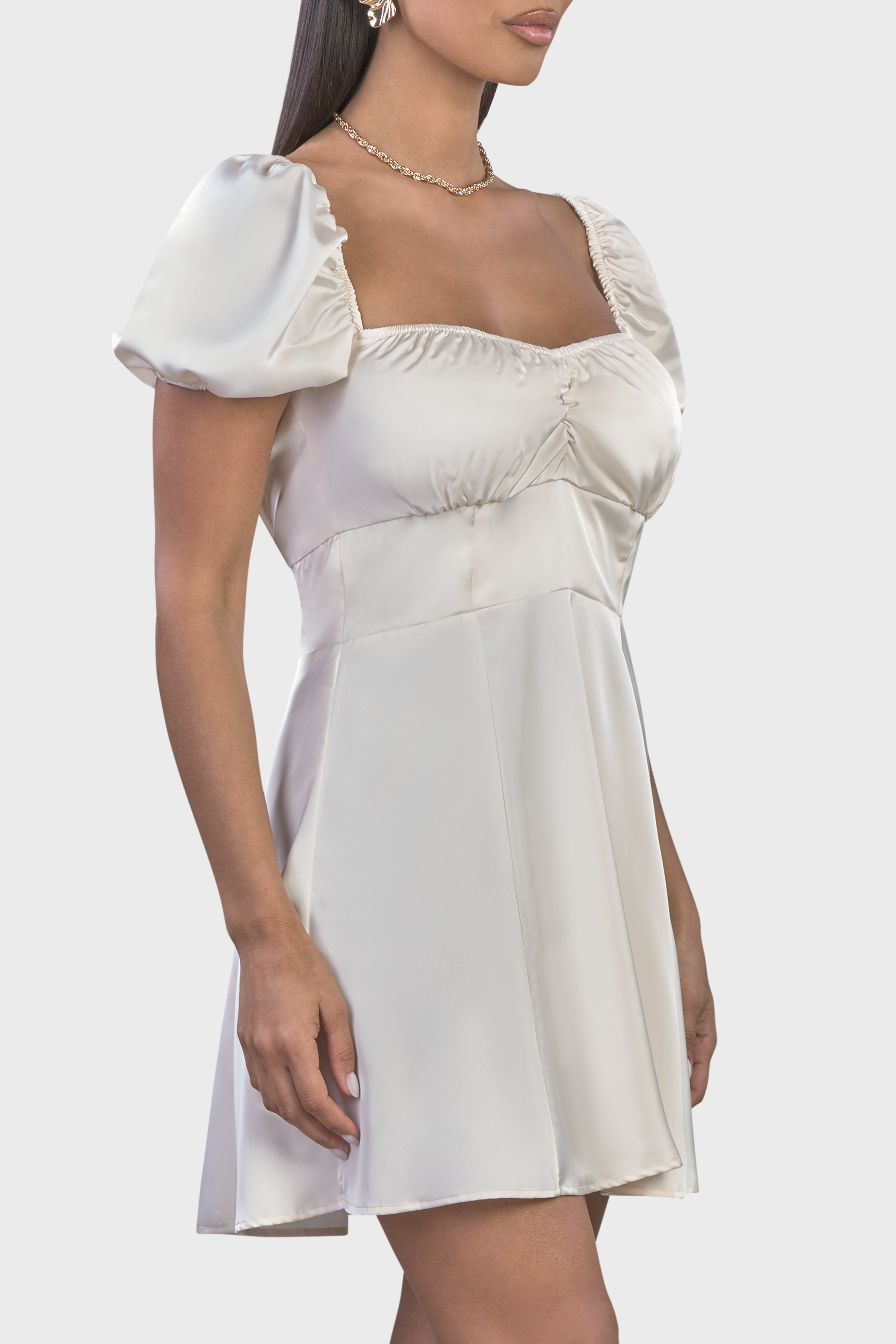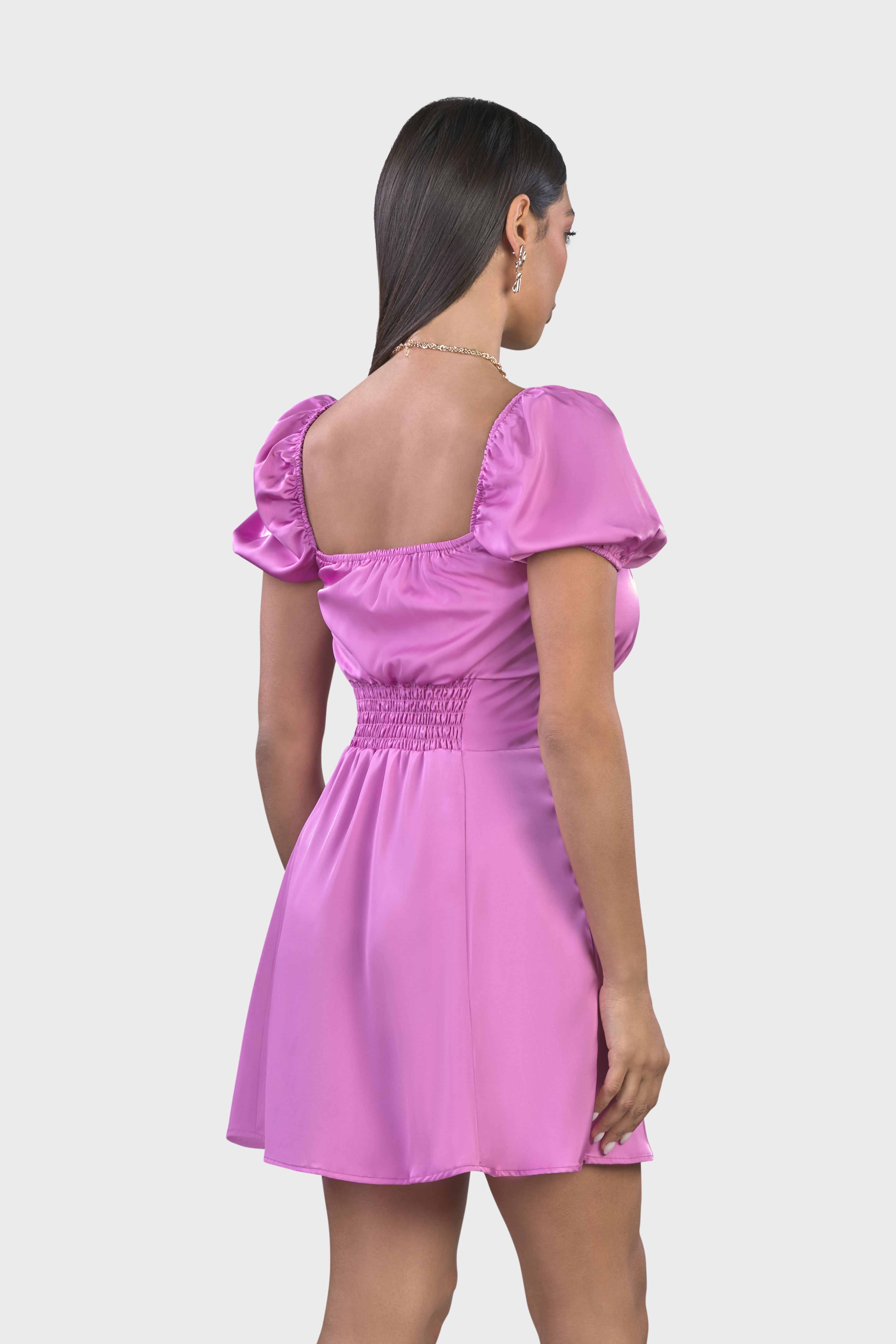 Il design di questo abito è caratterizzato dalla costruzione sartoriale che prende volume grazie alla leggerezza del tessuto scelto, per creare delle linee armoniose e femminili. E’ realizzato in un lucido e liscio tessuto di raso. Per un look fresco e di tendenza, la silhouette è dettagliata dalla manica a sbuffo e dallo scollo a cuore. A completare il modello è il taglio in grado di delineare il punto vita e il punto smock sul retro. Perfetto da indossare il sabato sera o per un occasione chic.