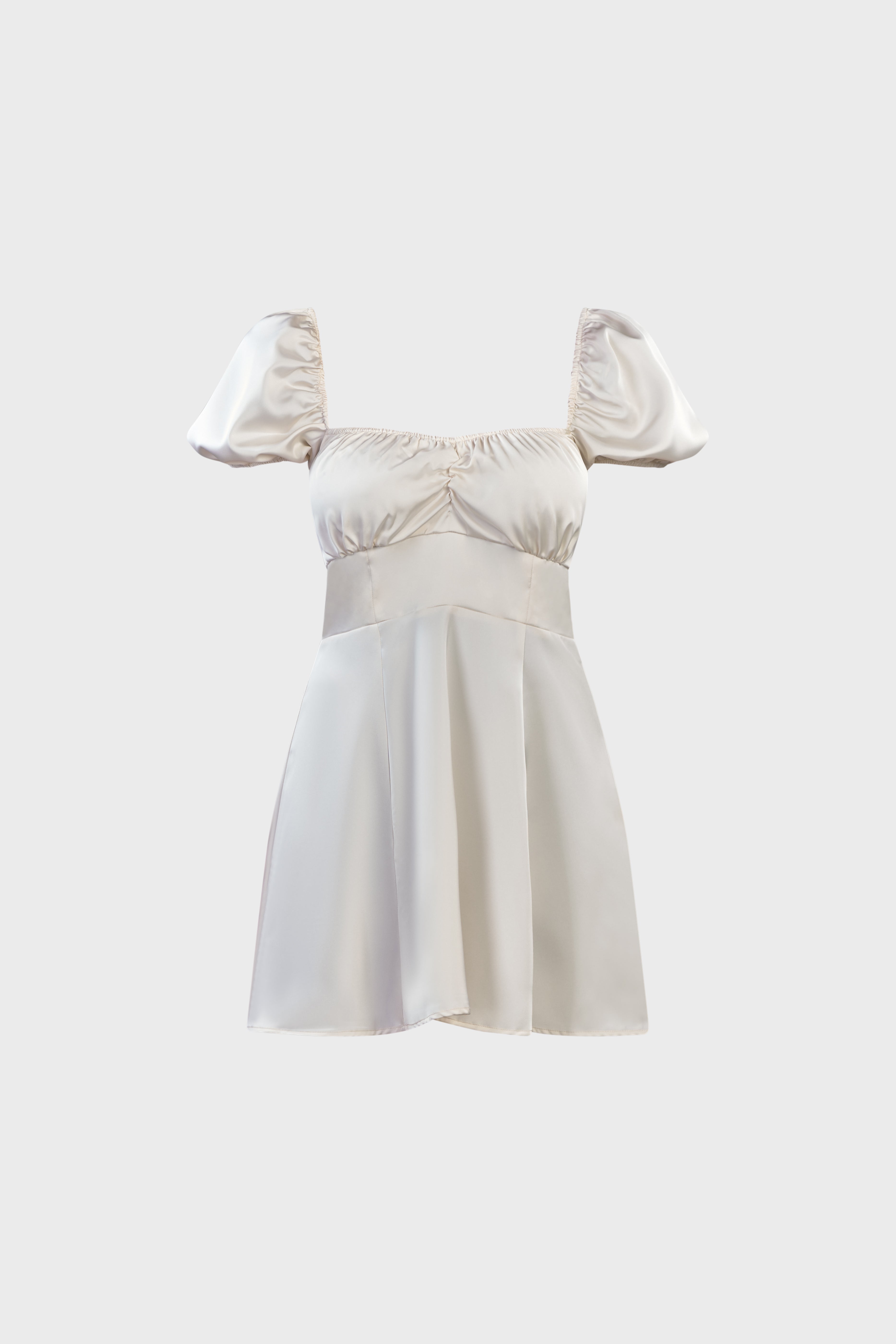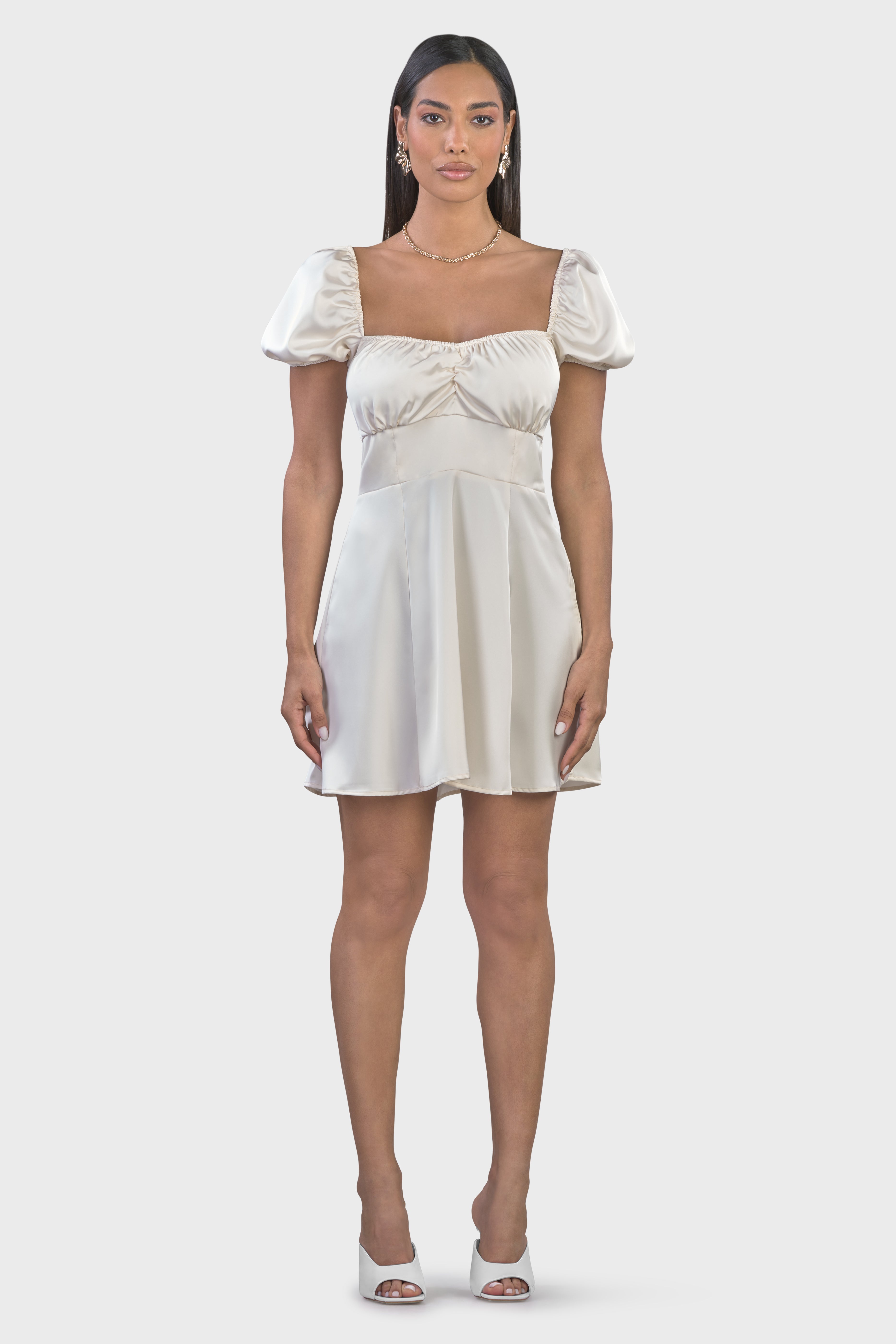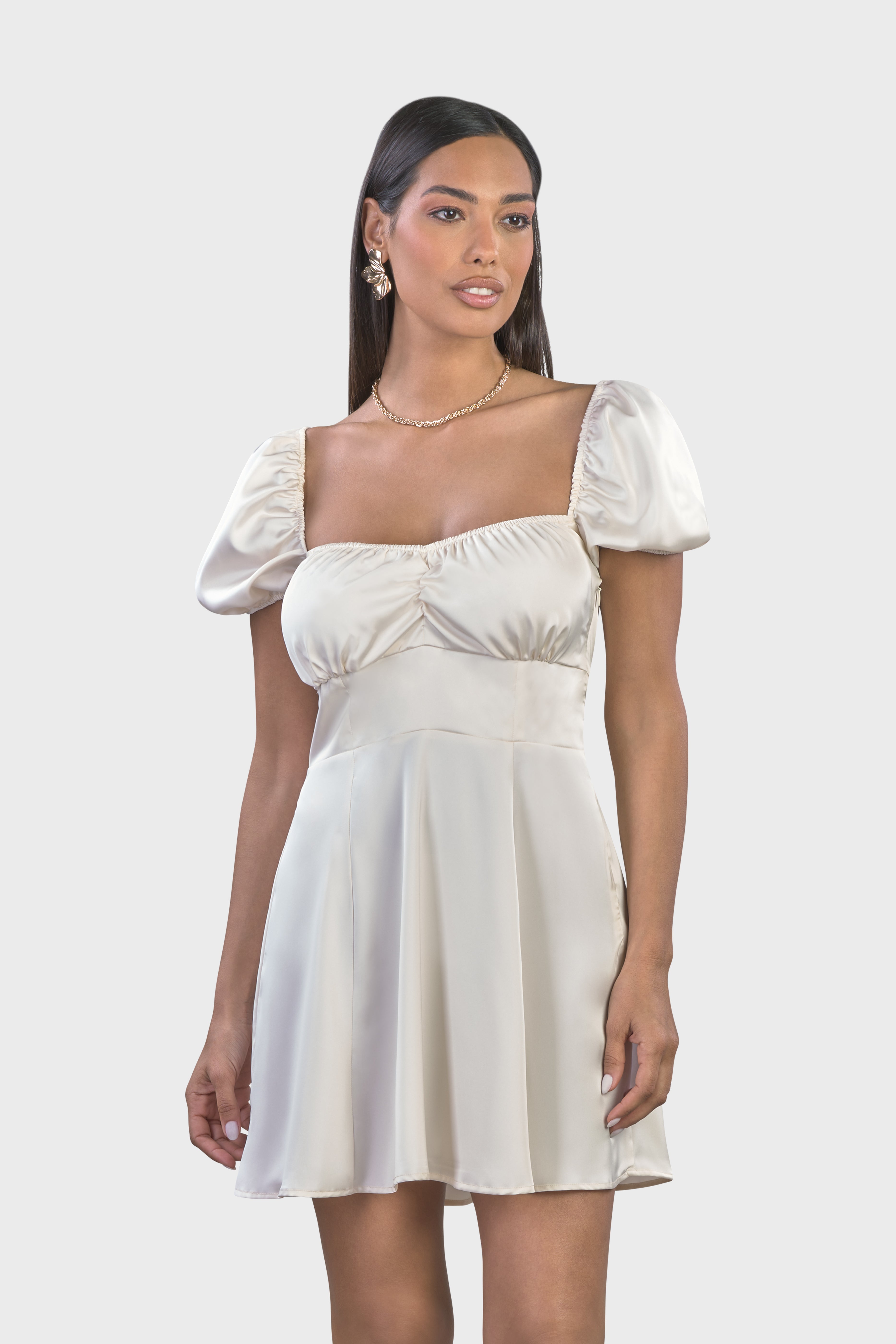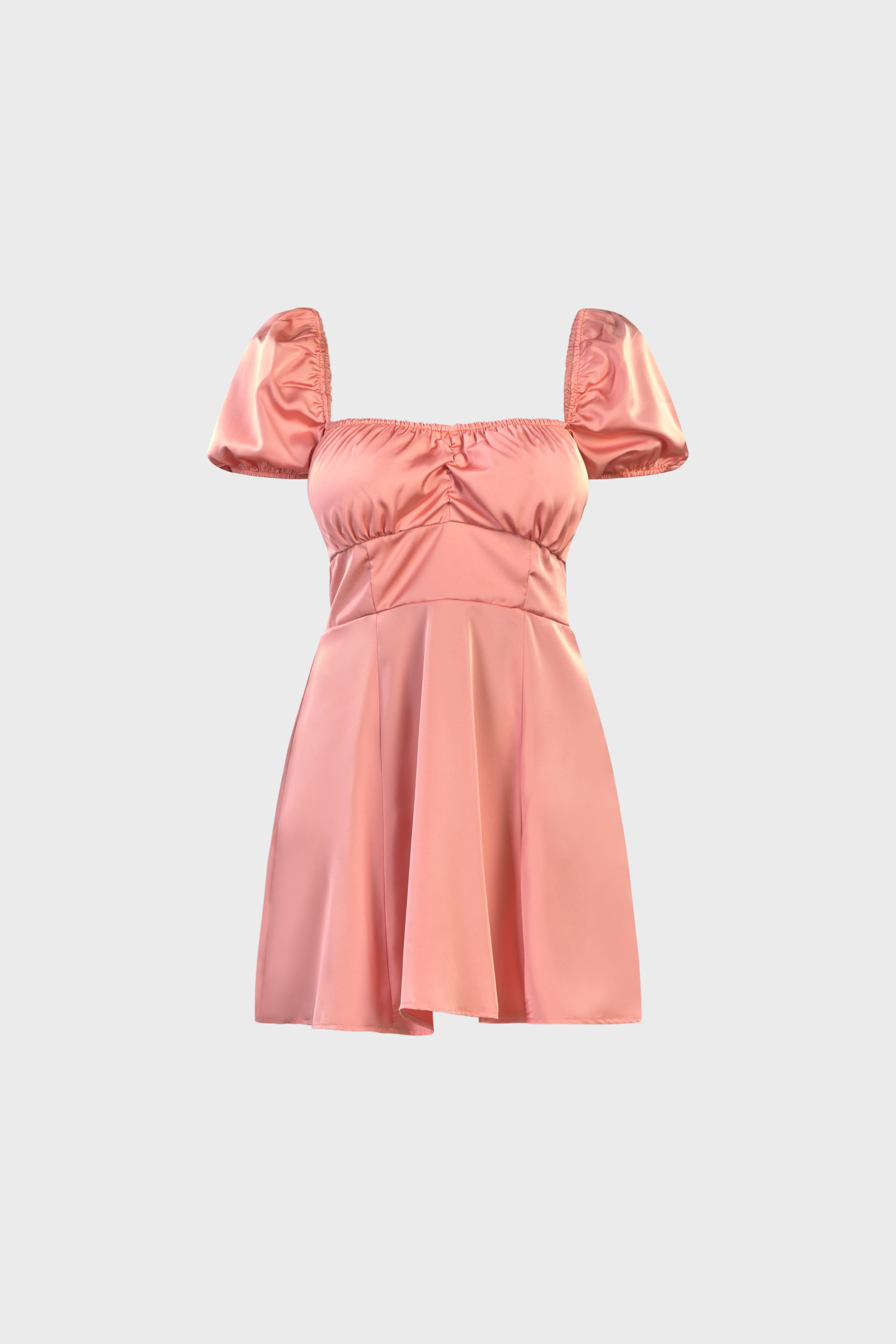 Il design di questo abito è caratterizzato dalla costruzione sartoriale che prende volume grazie alla leggerezza del tessuto scelto, per creare delle linee armoniose e femminili. E’ realizzato in un lucido e liscio tessuto di raso. Per un look fresco e di tendenza, la silhouette è dettagliata dalla manica a sbuffo e dallo scollo a cuore. A completare il modello è il taglio in grado di delineare il punto vita e il punto smock sul retro. Perfetto da indossare il sabato sera o per un occasione chic.