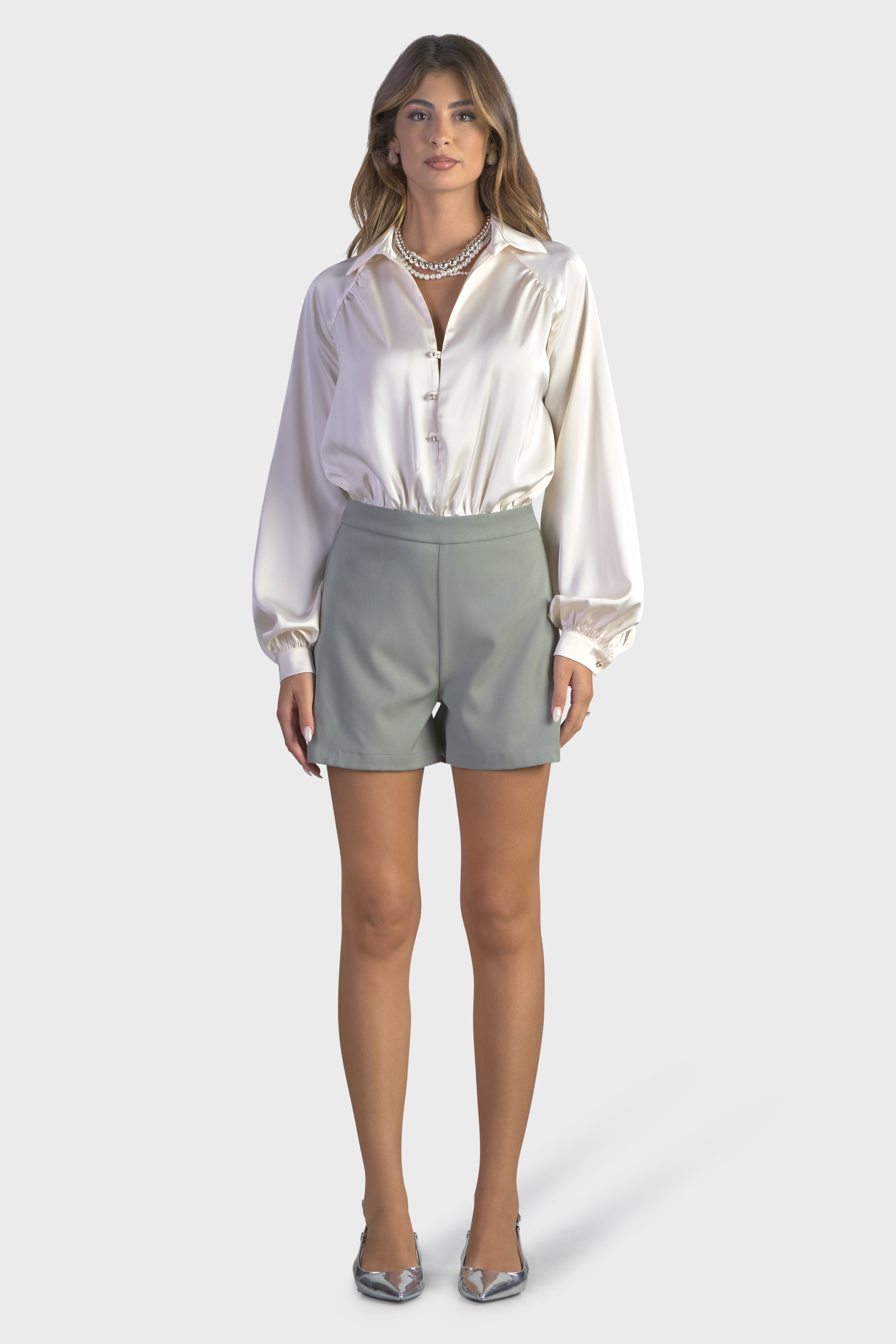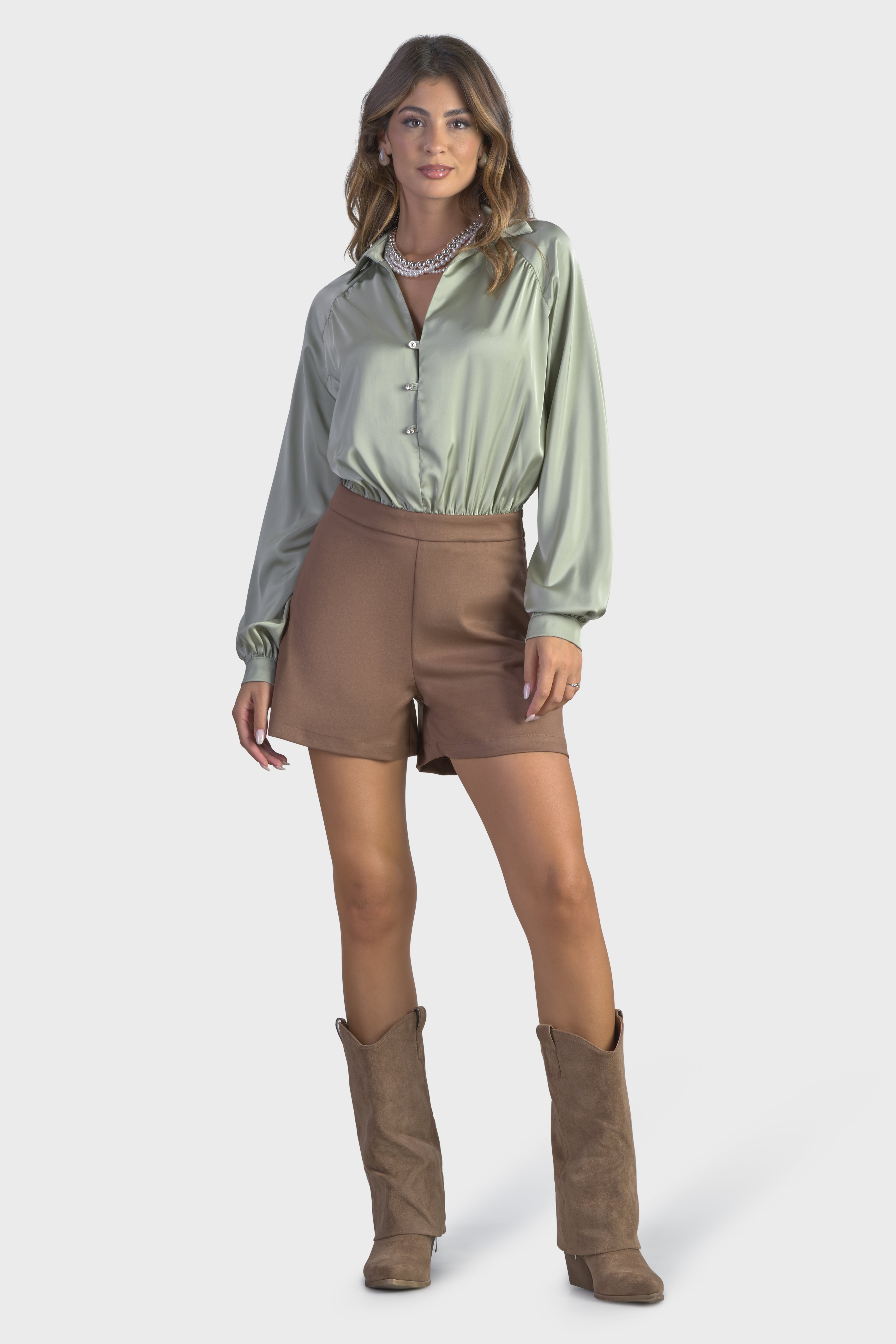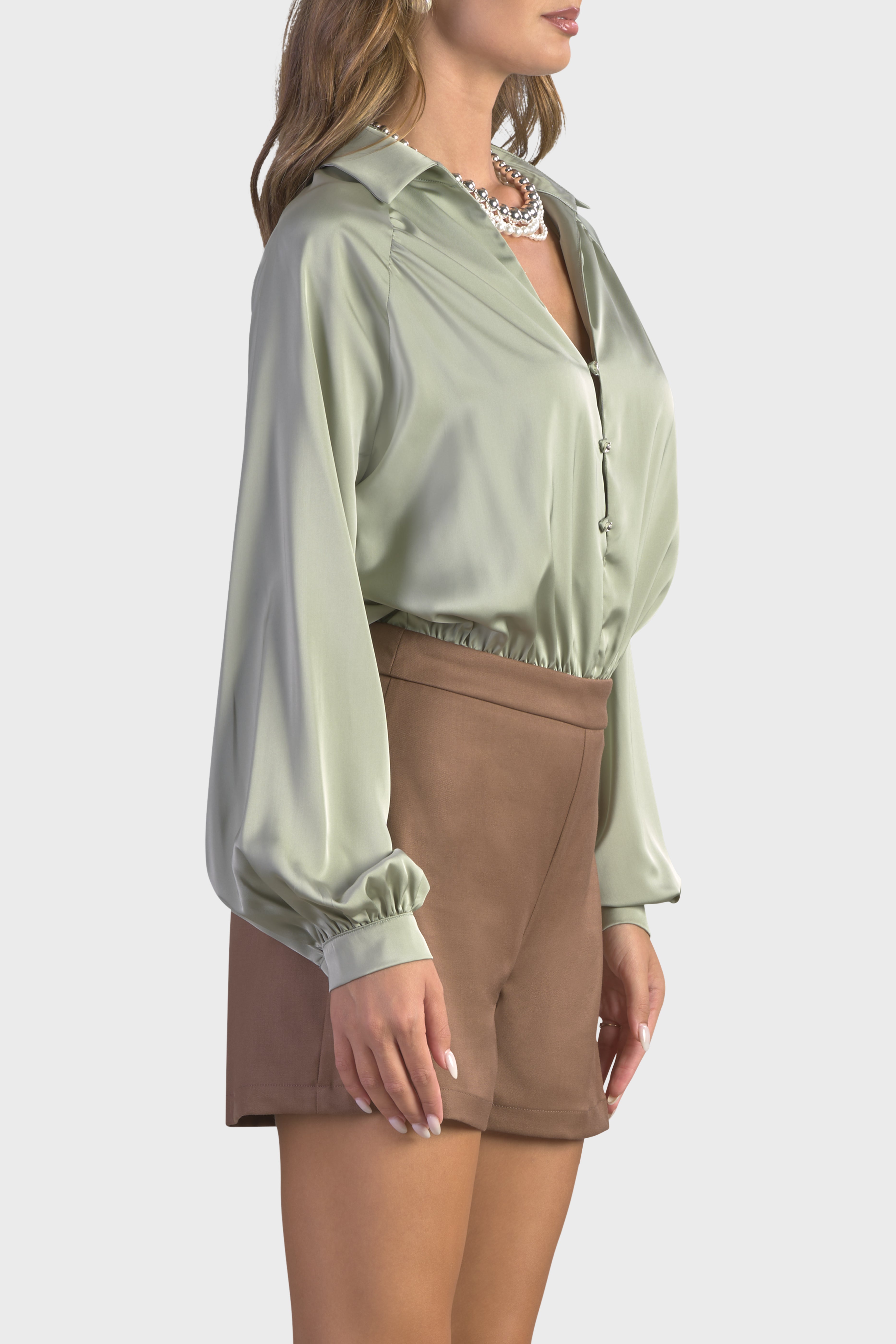 Questa tuta corta, valorizza la silhouette in maniera elegante e seducente. La combinazione di tessuti, raso, liscio al tatto e la morbida flanella, rende questo capo unico e inimitabile. La parte superiore, è caratterizzata dalle innumerevoli arricciature in vita, dando forma ad un effetto sblusato. Le maniche lunghe dal taglio raglan e il colletto a punta, arricchiscono lo splendido scollo a V, impreziosito dai bottoni gioiello. Ad aggiungere un tocco particolare sono i polsi camicia, dove si ripetono gli stessi bottoni. Il taglio in vita, evidenzia la vestibilità pensata per restare aderente al corpo. Infine, il modello presenta una chiusura con cerniera nascosta nel fianco, per una maggiore rifinitura. Perfetta da indossare per un brunch, questa tuta è il capo ideale per un look disinvolto.