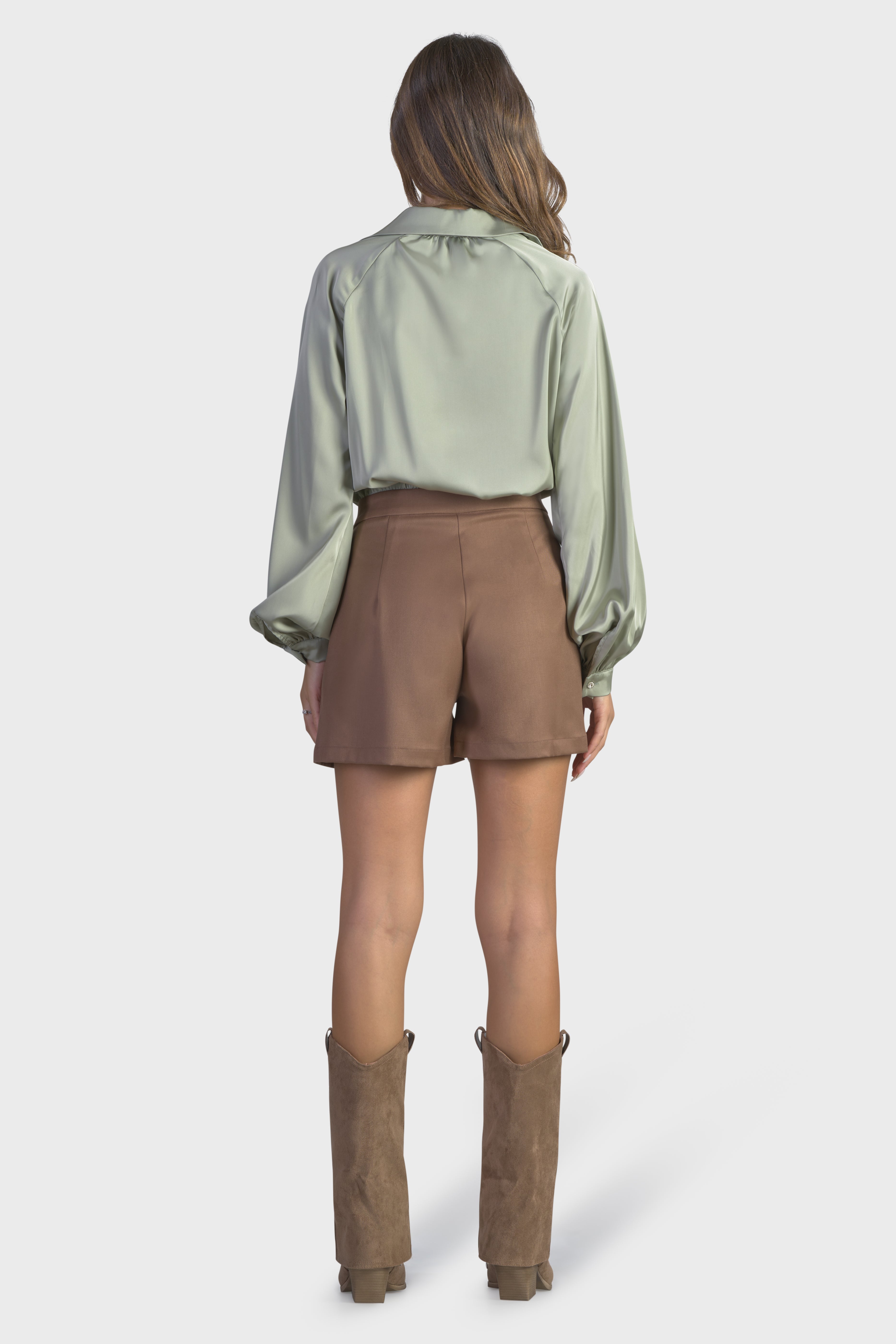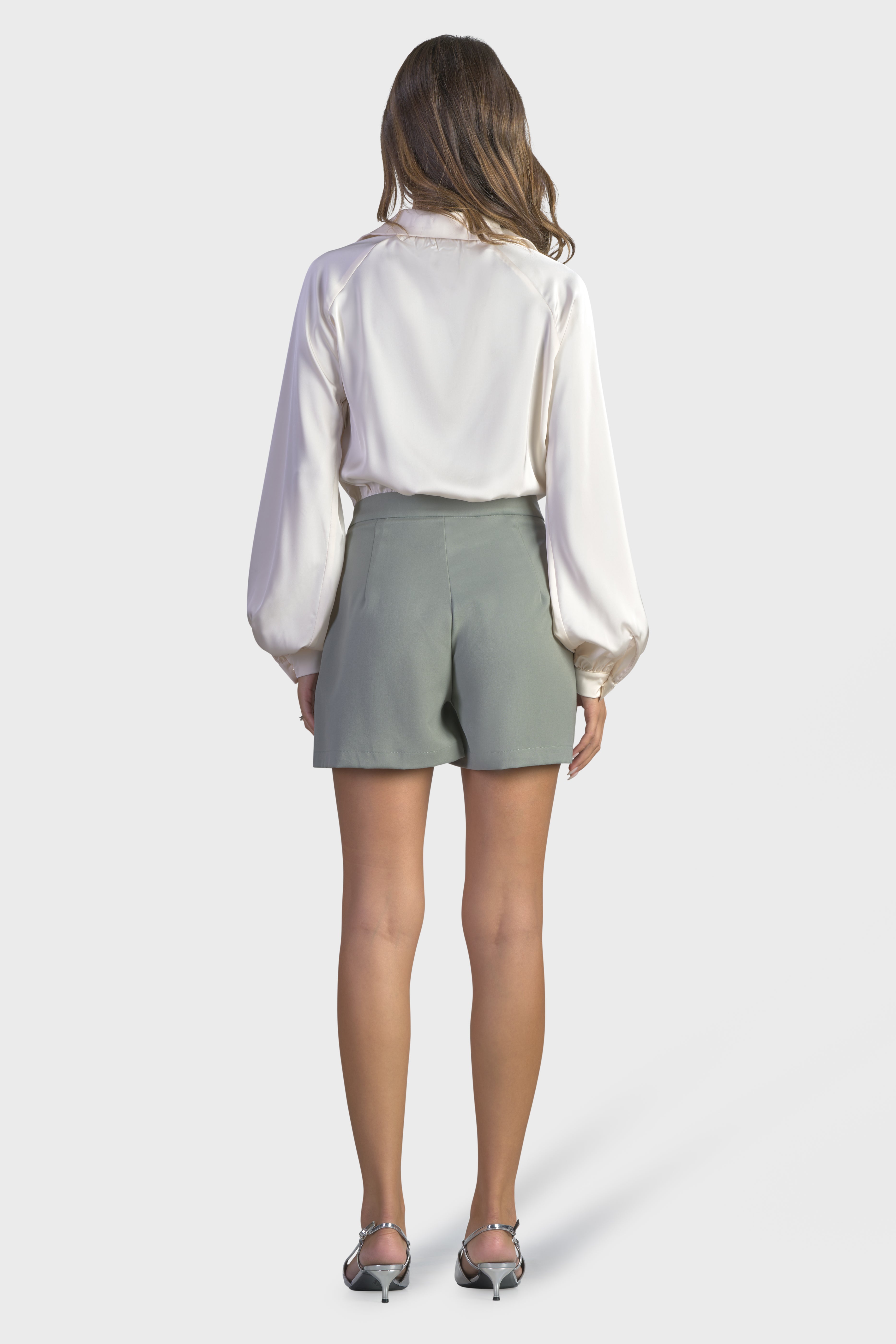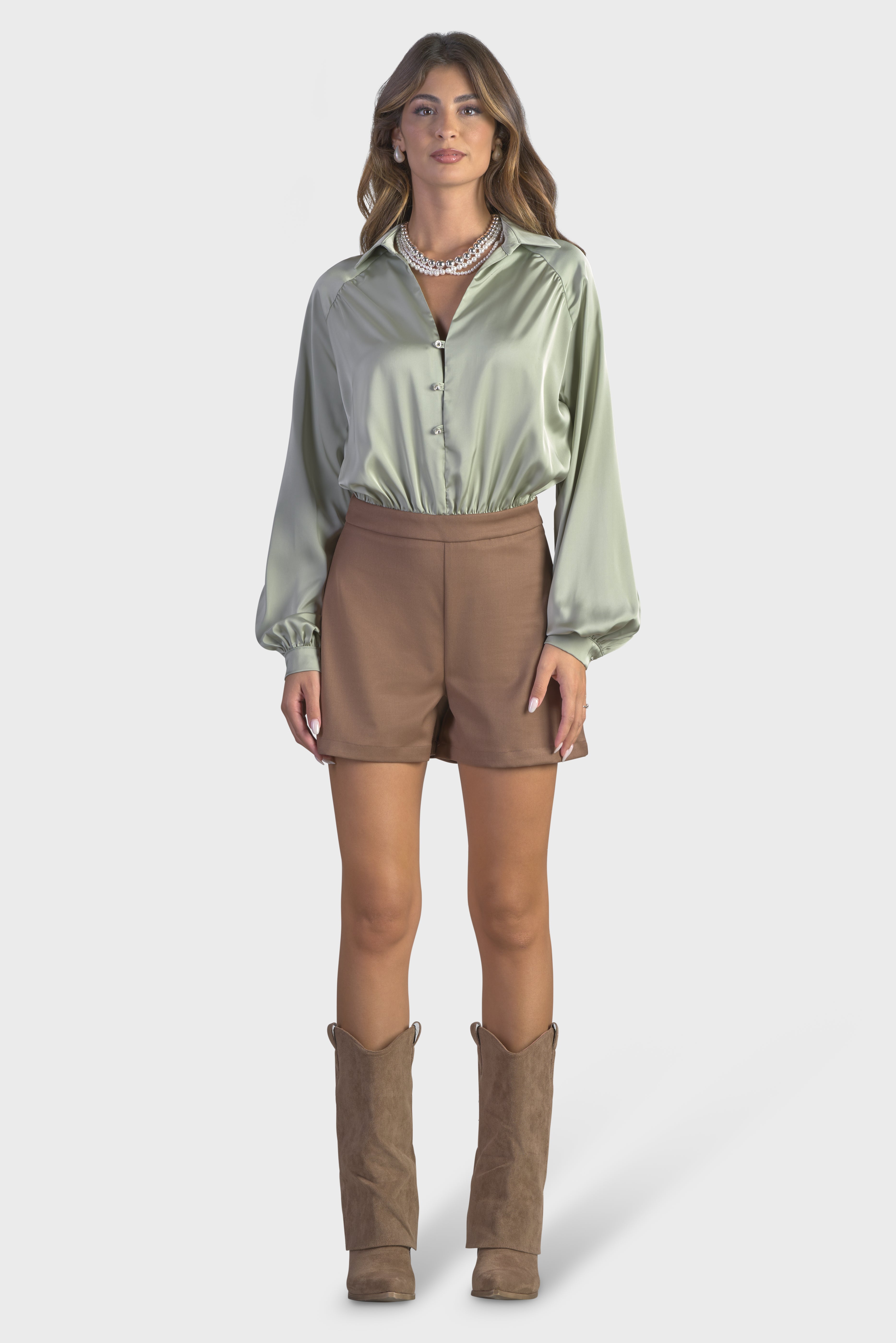 Questa tuta corta, valorizza la silhouette in maniera elegante e seducente. La combinazione di tessuti, raso, liscio al tatto e la morbida flanella, rende questo capo unico e inimitabile. La parte superiore, è caratterizzata dalle innumerevoli arricciature in vita, dando forma ad un effetto sblusato. Le maniche lunghe dal taglio raglan e il colletto a punta, arricchiscono lo splendido scollo a V, impreziosito dai bottoni gioiello. Ad aggiungere un tocco particolare sono i polsi camicia, dove si ripetono gli stessi bottoni. Il taglio in vita, evidenzia la vestibilità pensata per restare aderente al corpo. Infine, il modello presenta una chiusura con cerniera nascosta nel fianco, per una maggiore rifinitura. Perfetta da indossare per un brunch, questa tuta è il capo ideale per un look disinvolto.