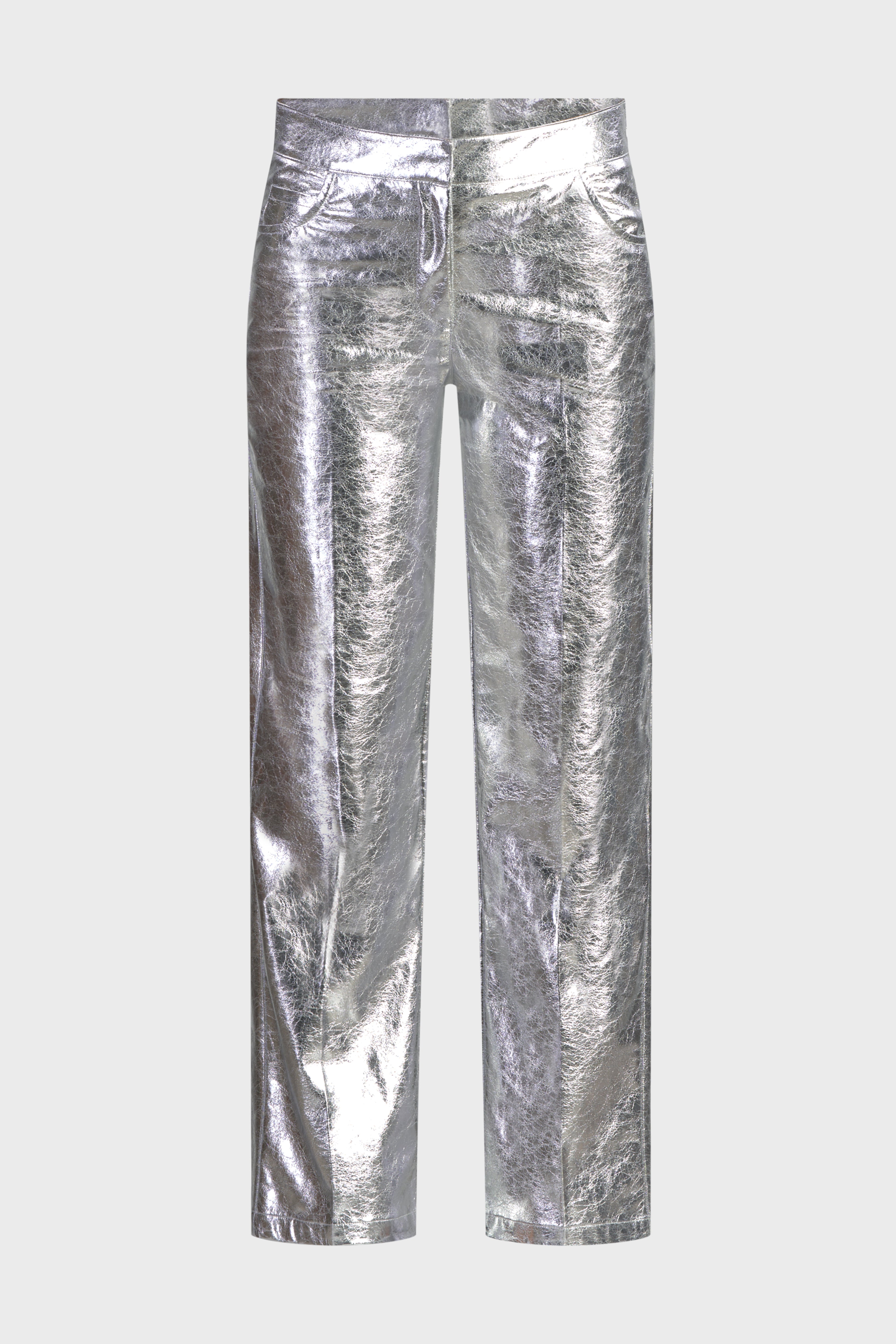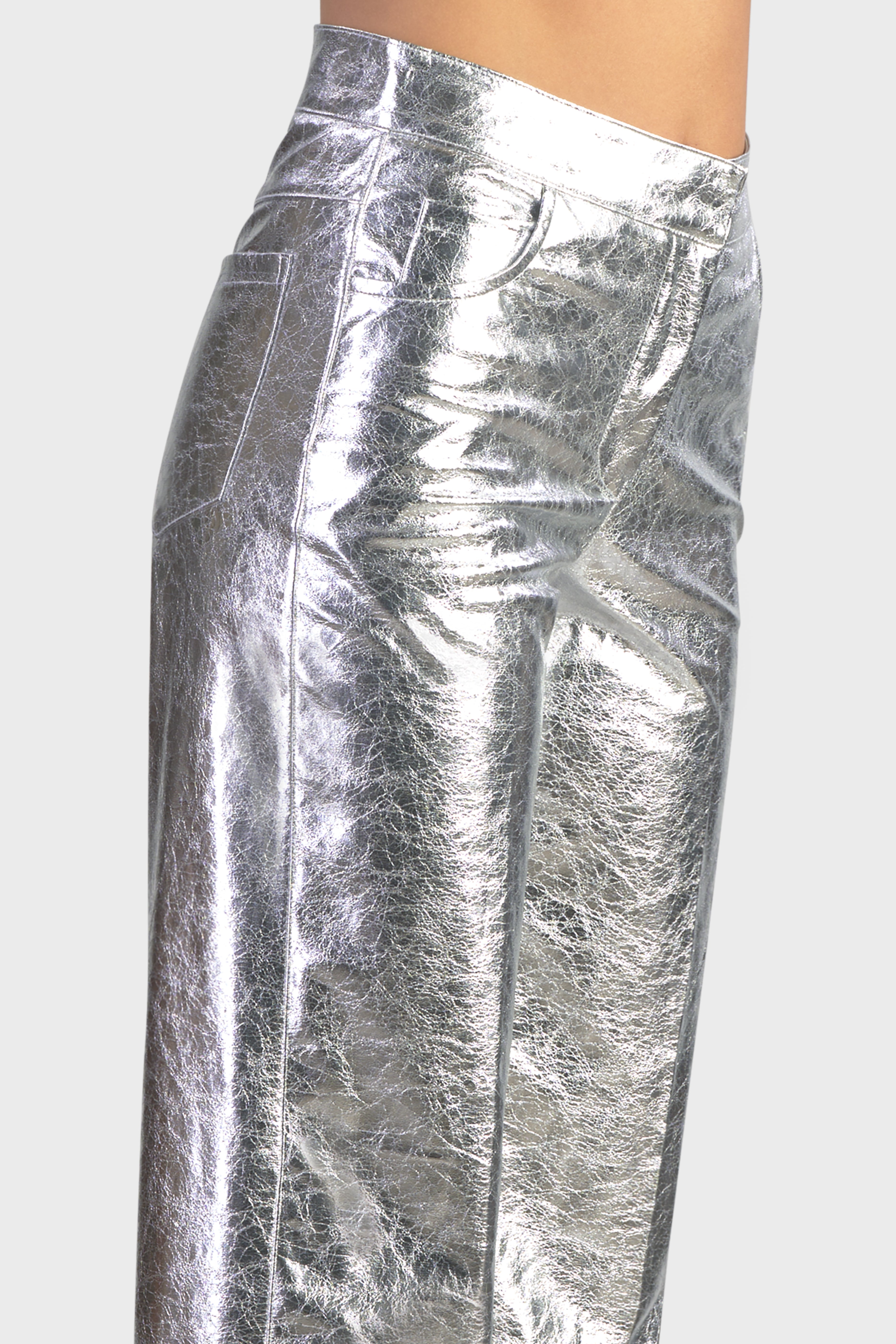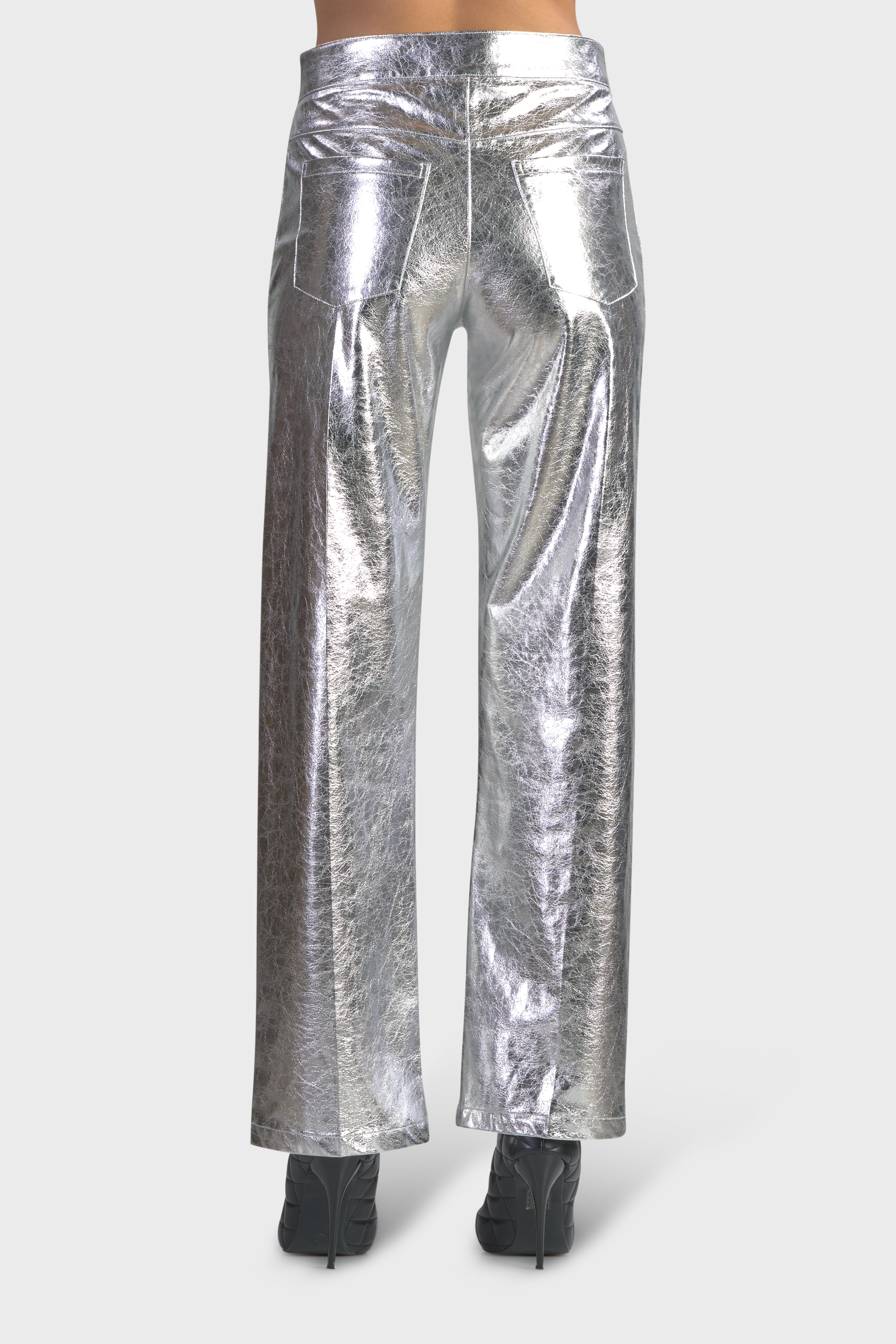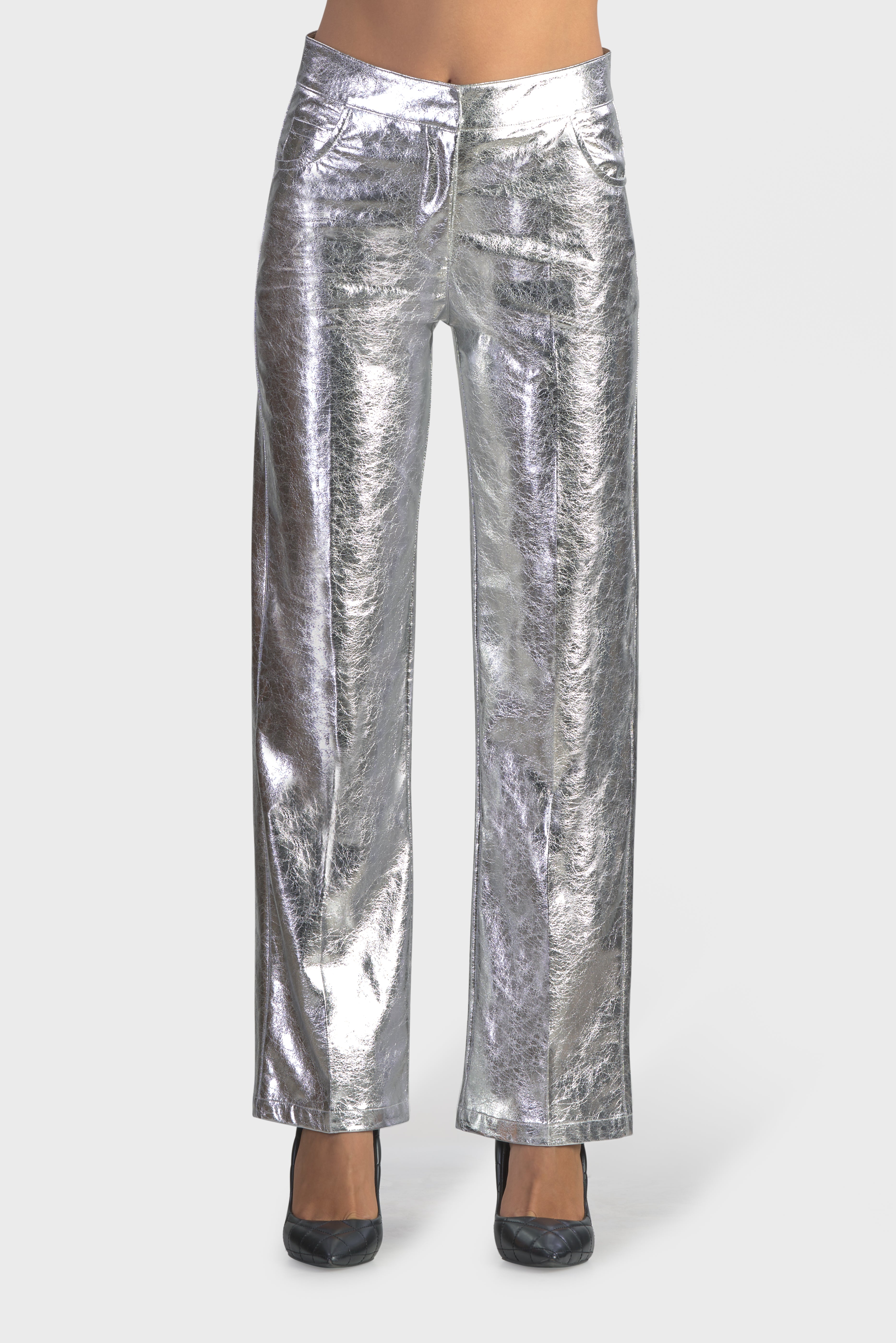 Il pantalone cinque tasche incanta per la sua lucentezza. Realizzato in ecopelle, tessuto dalla finitura metallizzata. Il design dritto rende questo modello versatile e adatto a tutte le tipologie di corpo. È caratterizzato dal bustino in vita dall’abbottonatura con gancio e cerniera nascosta. Ideale da indossare insieme ad una t-shirt per un look da giorno o di sera insieme ad un body della collezione per un look brillante e sempre di tendenza.