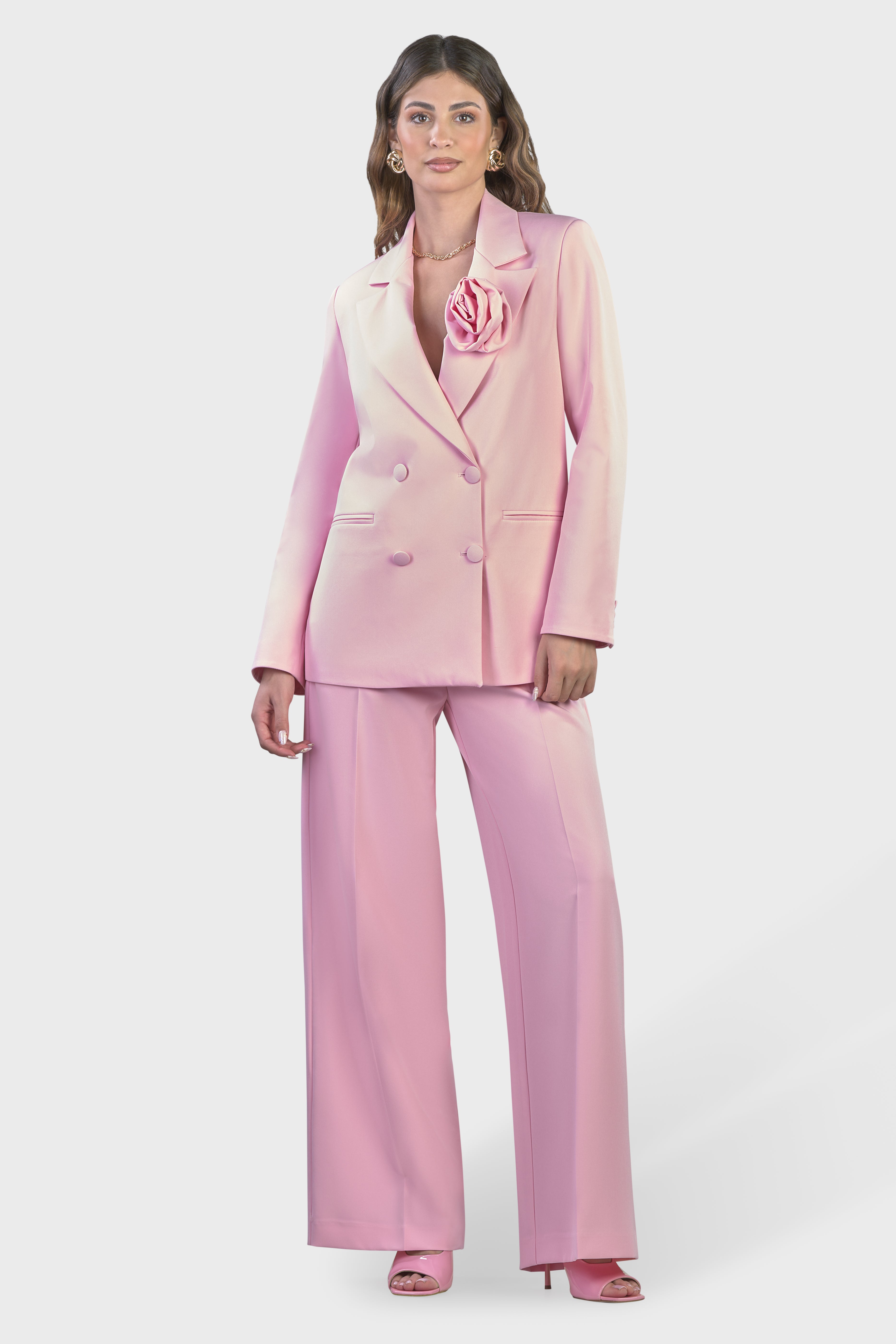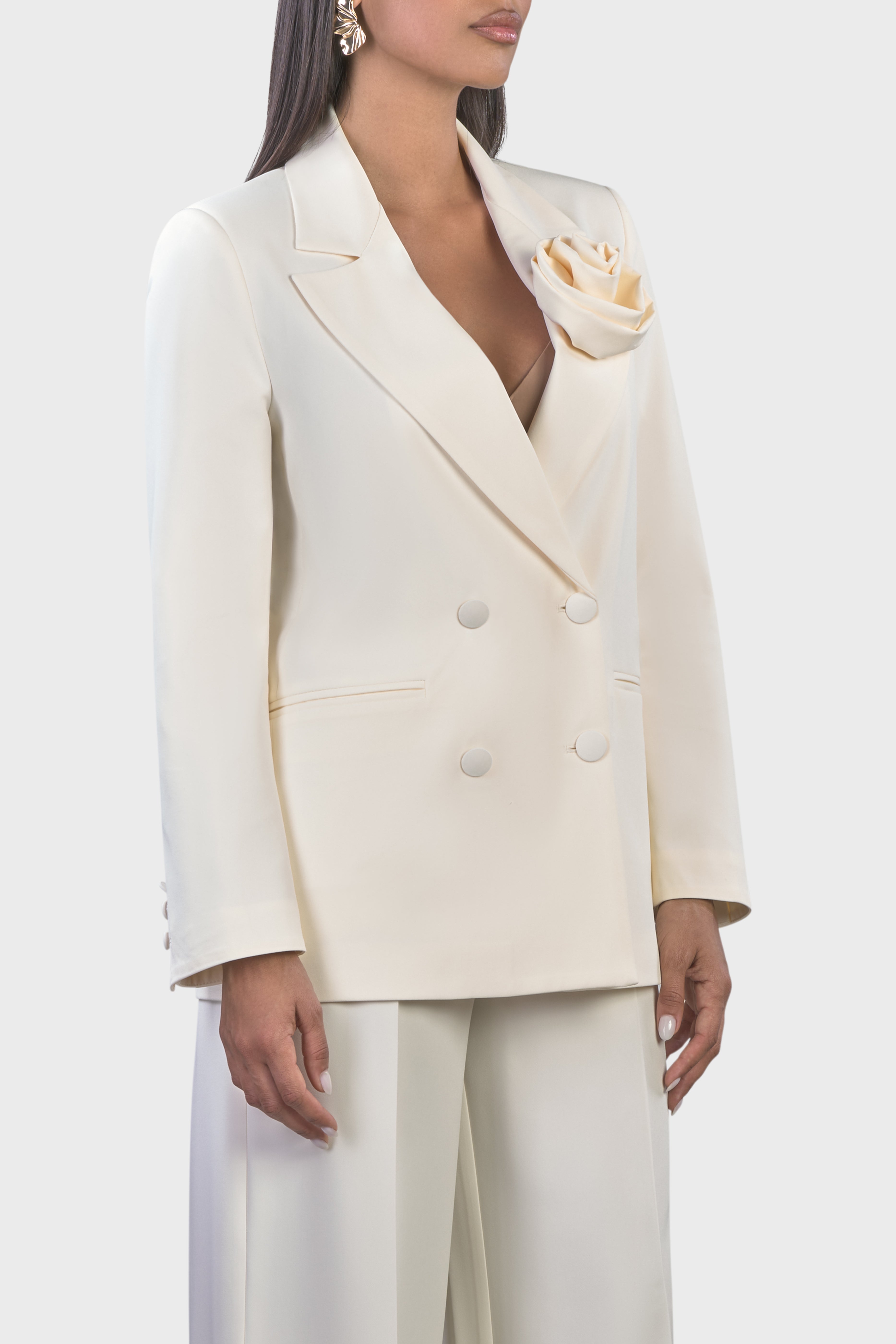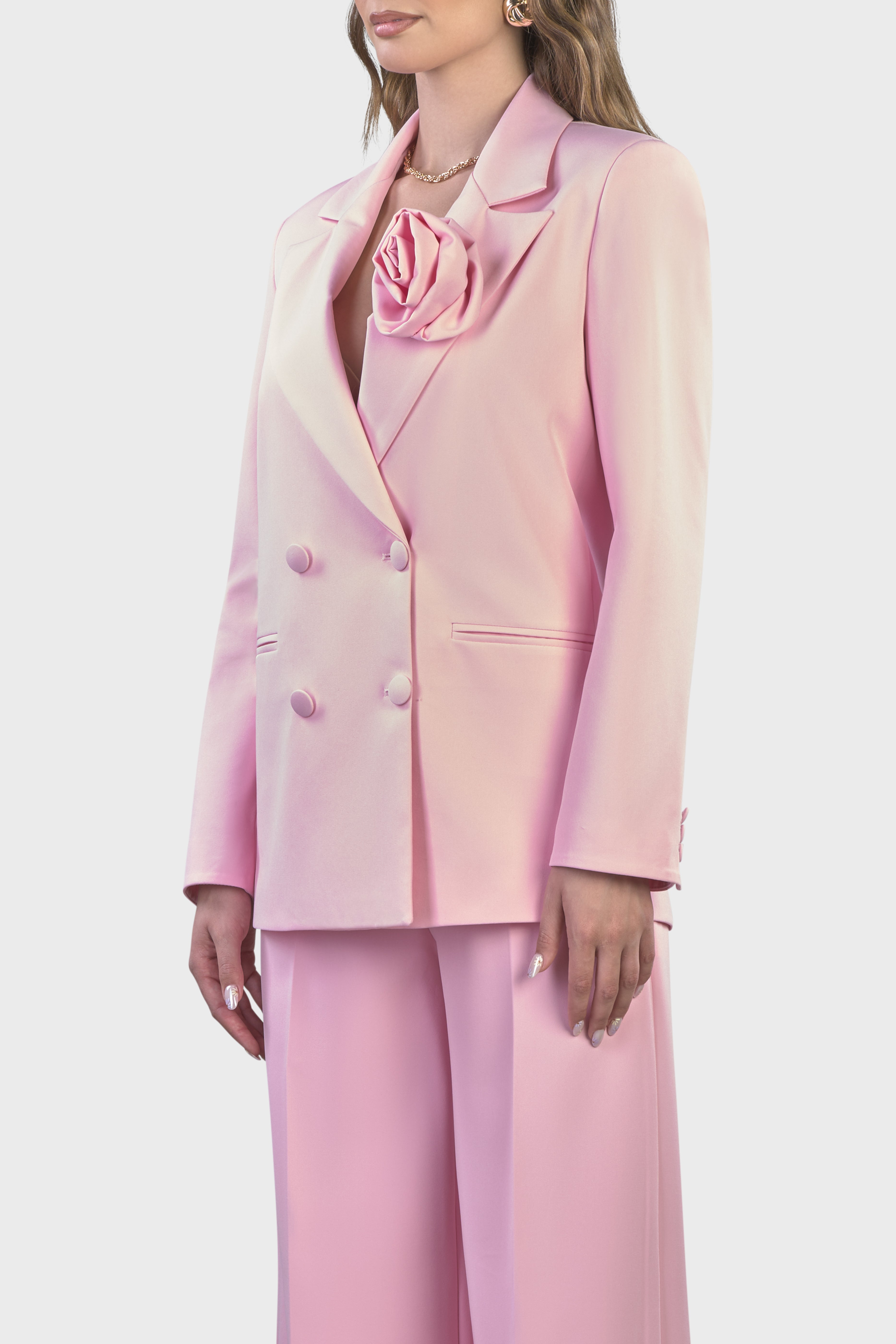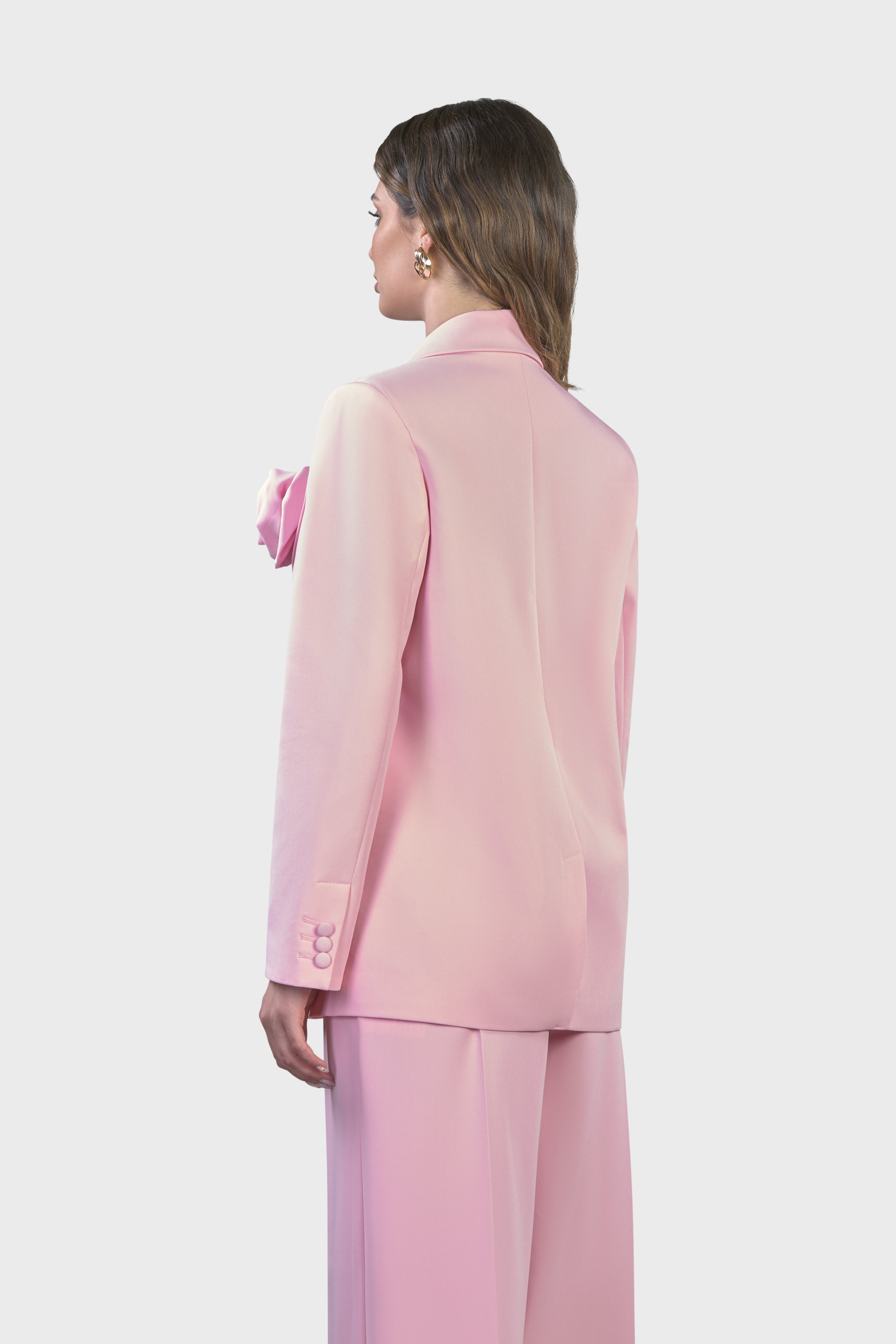 È impreziosita dal dettaglio della spilla a forma di rosa, emblema della collezione, realizzata nello stesso tessuto.