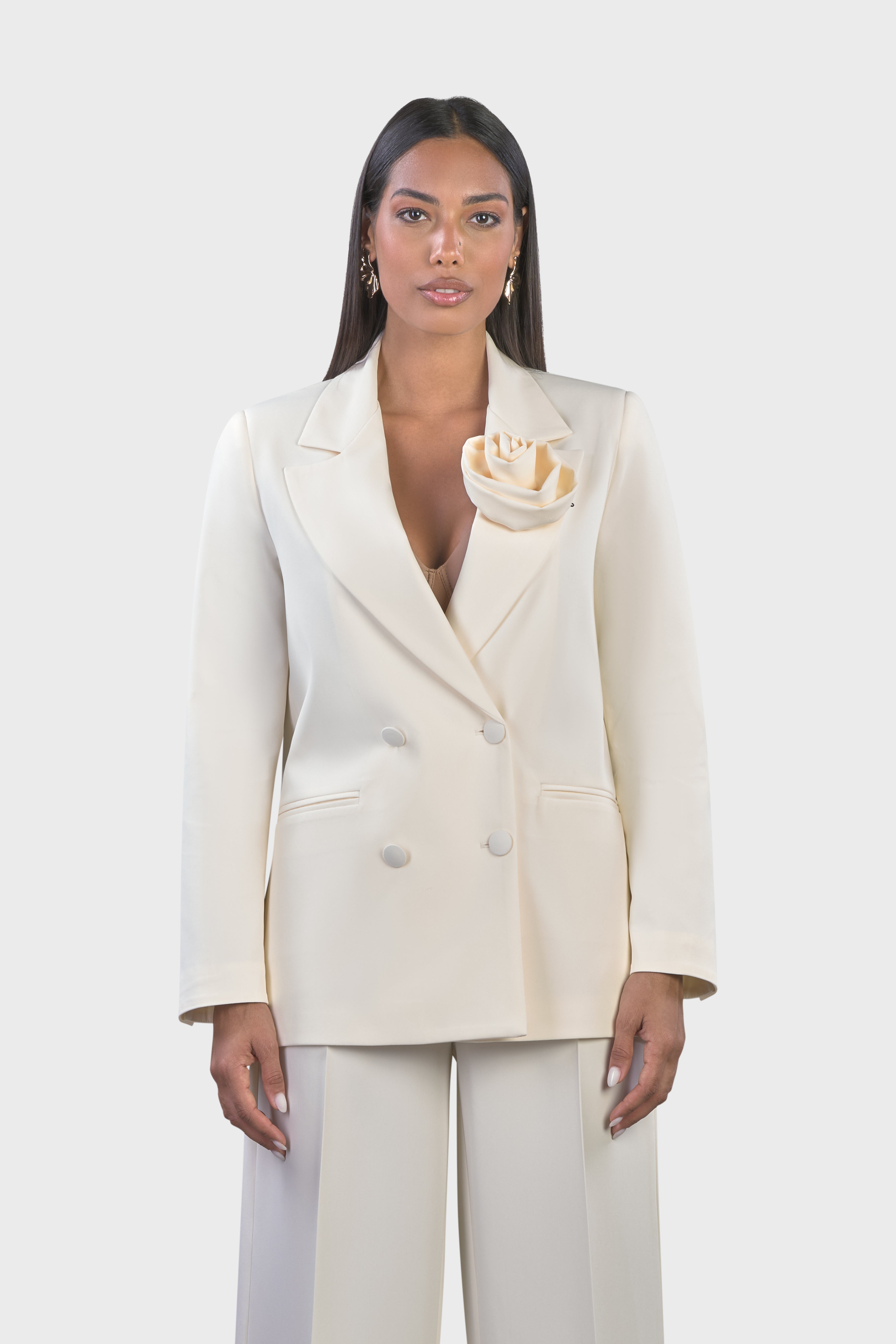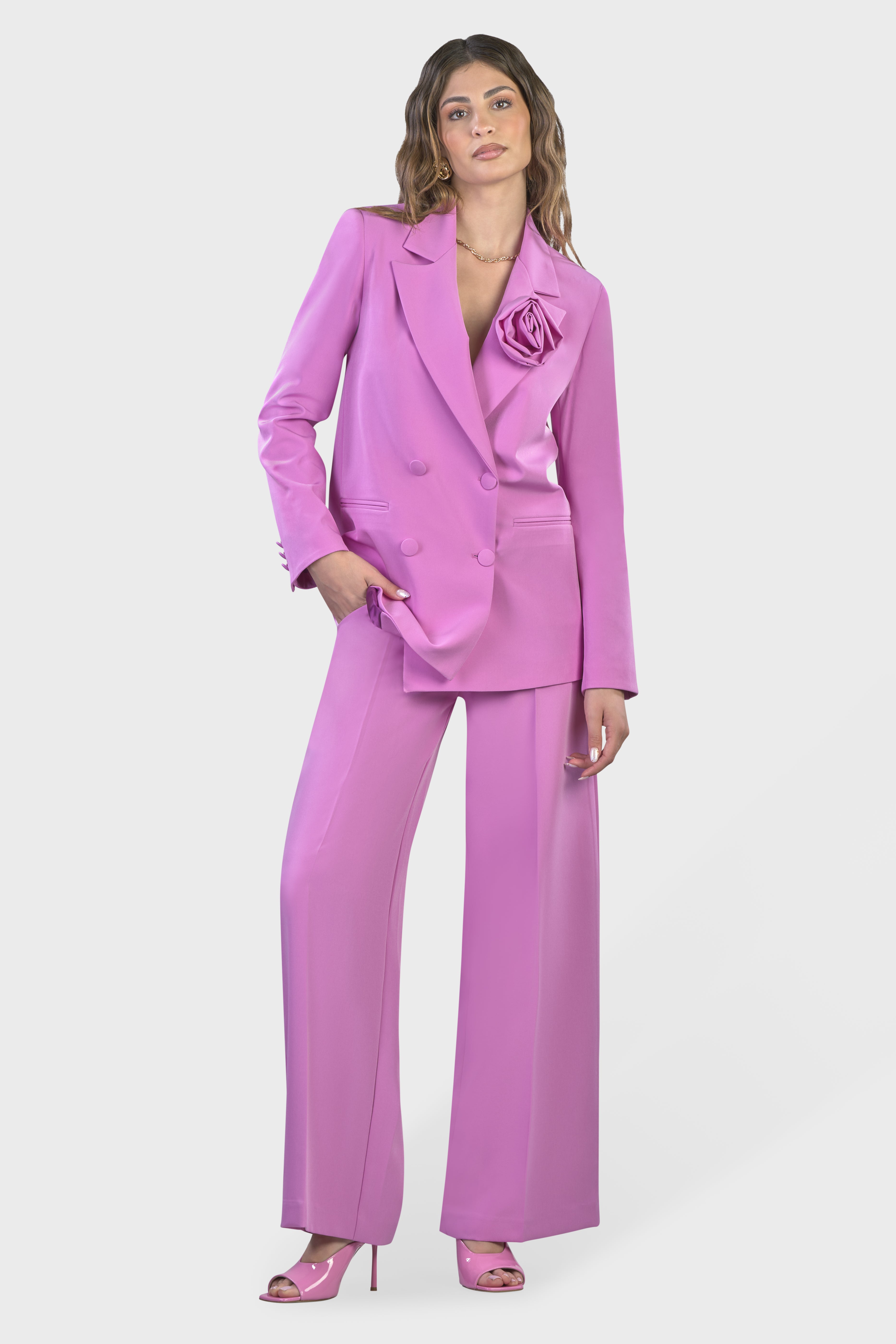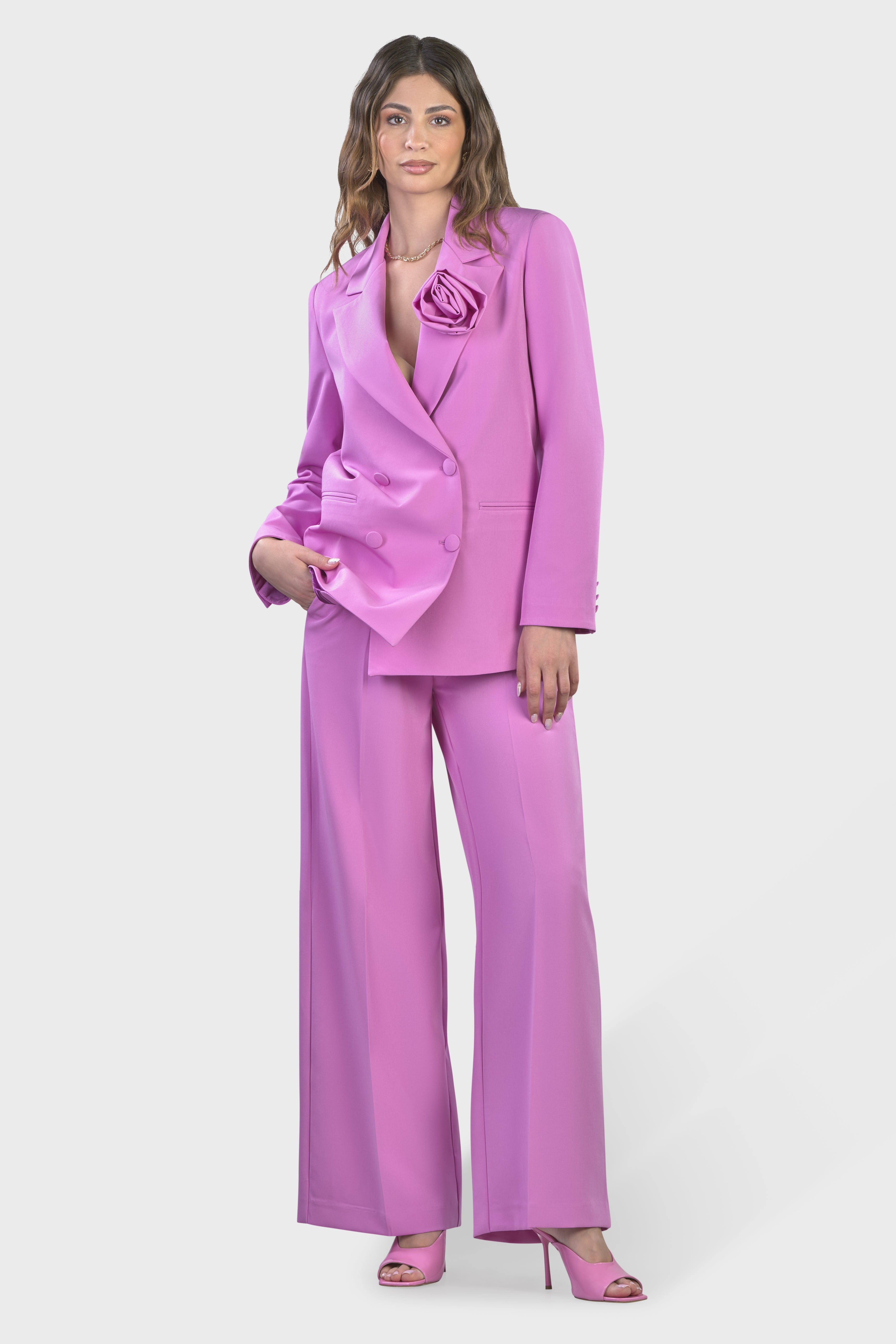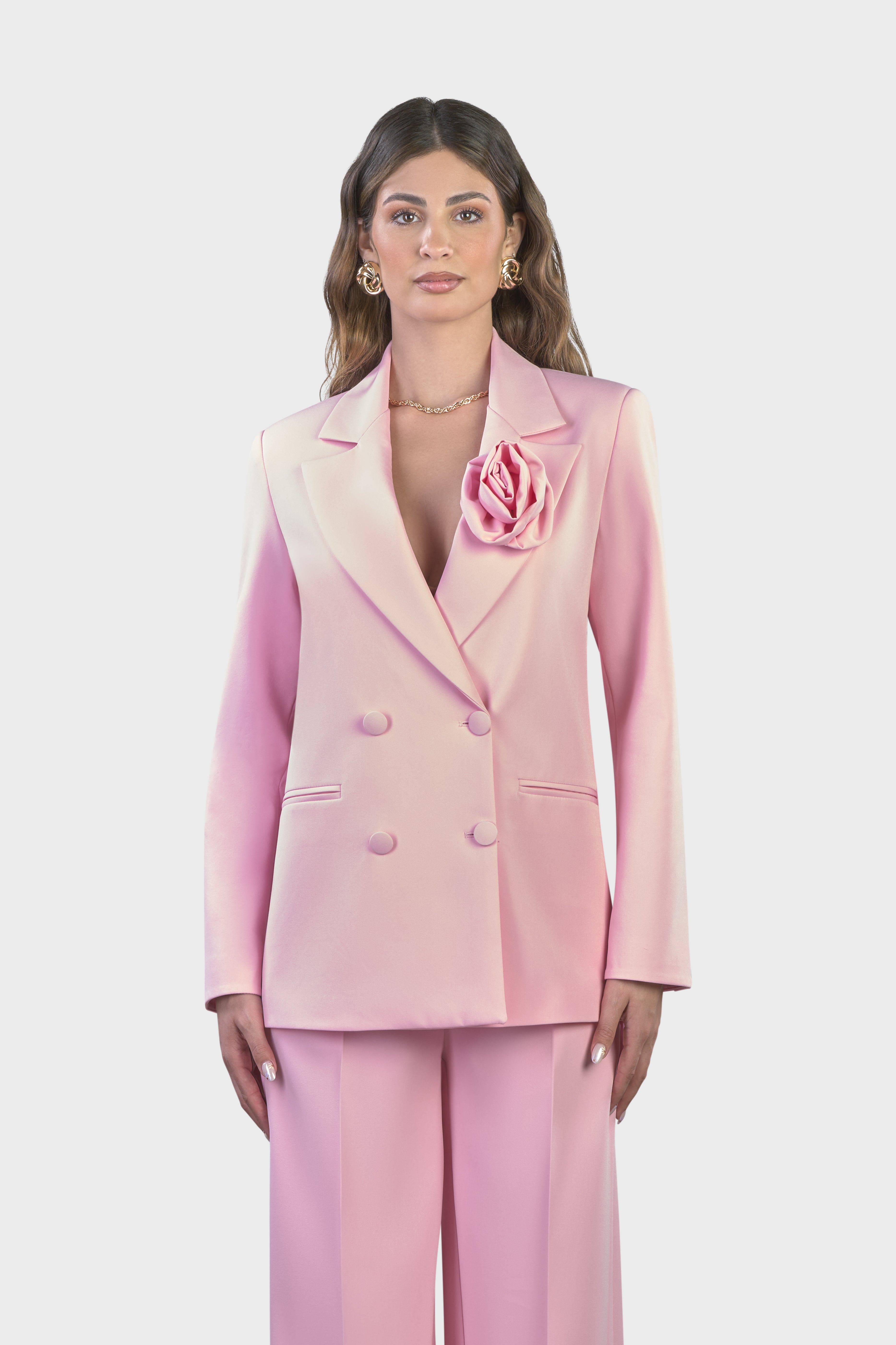È impreziosita dal dettaglio della spilla a forma di rosa, emblema della collezione, realizzata nello stesso tessuto.