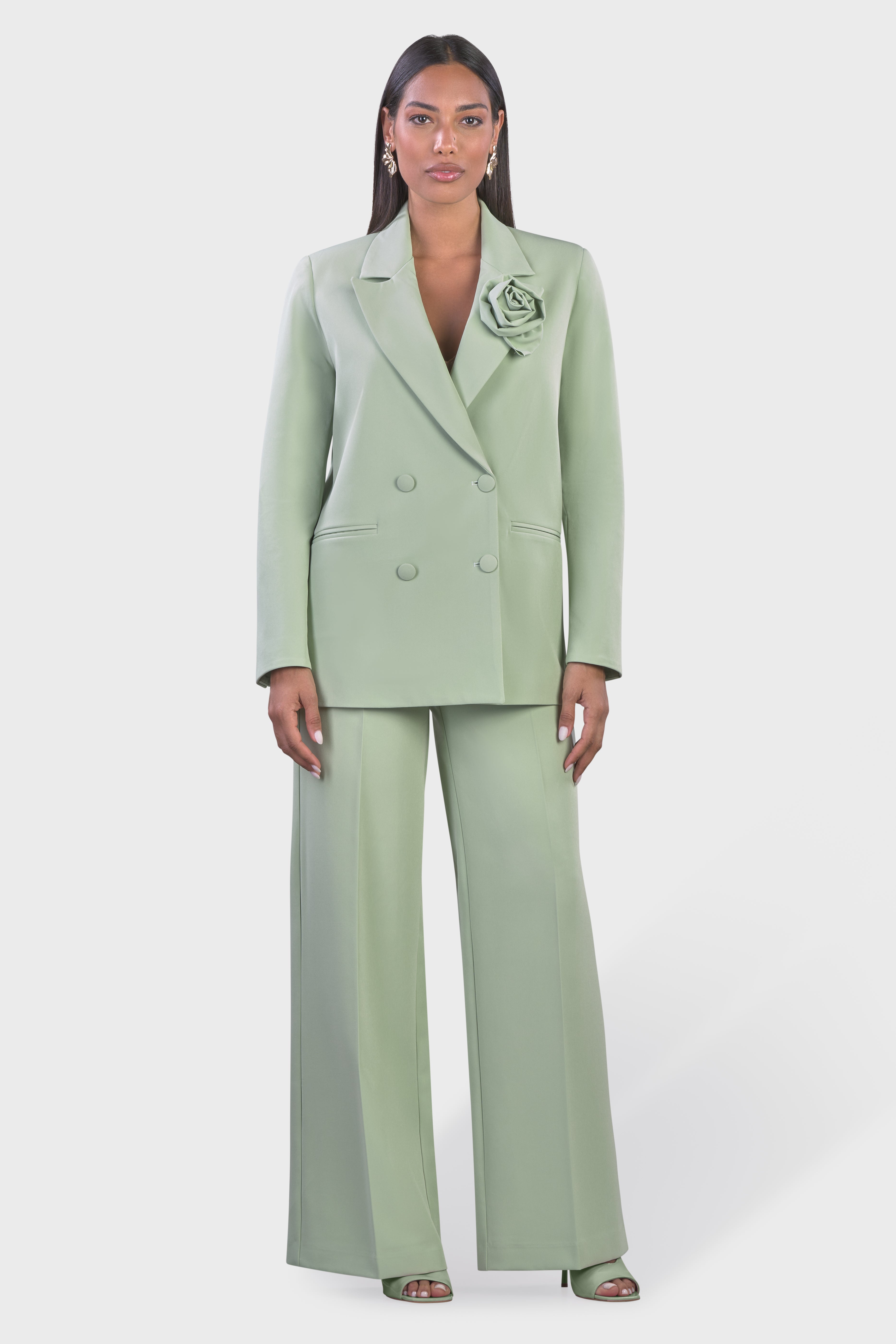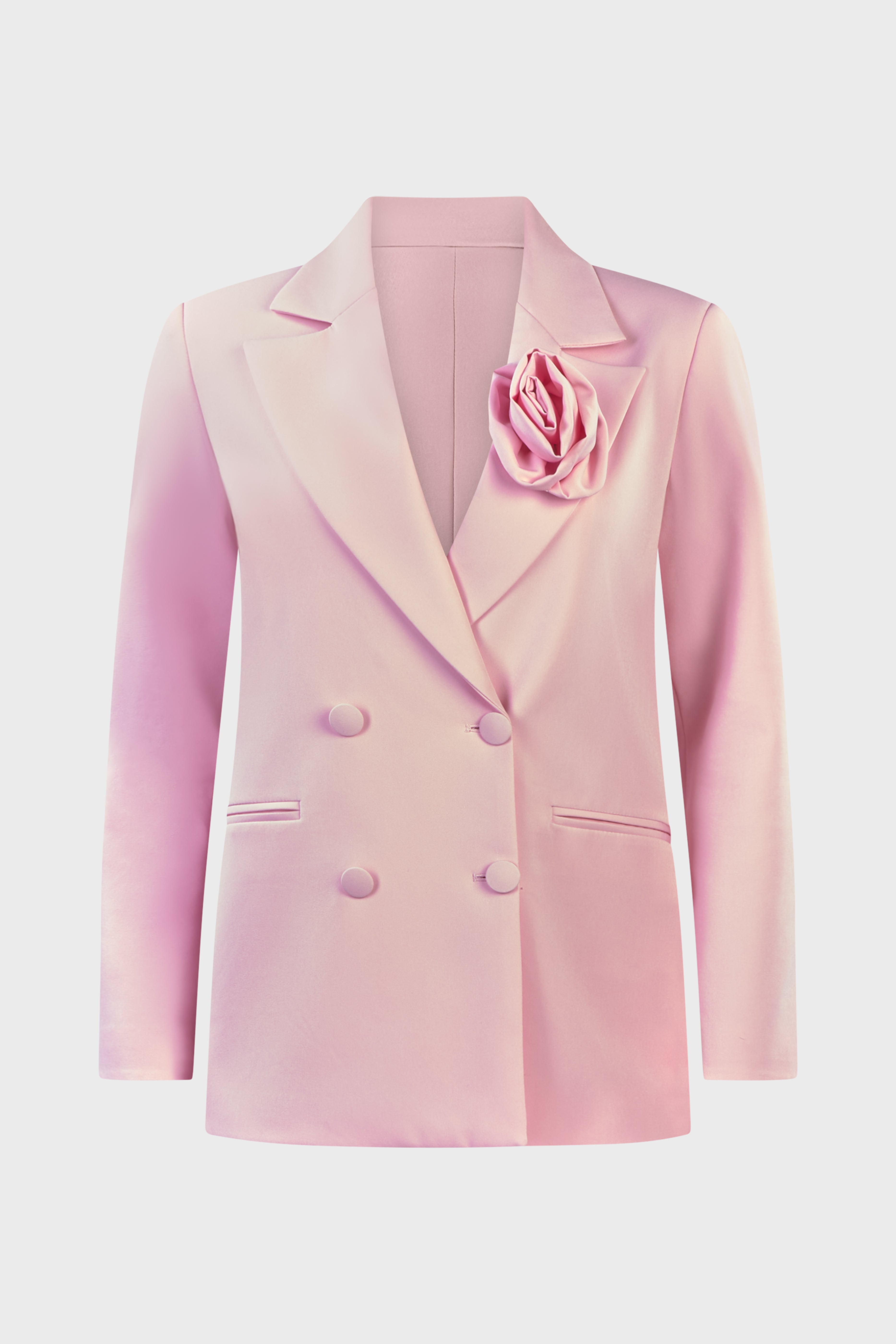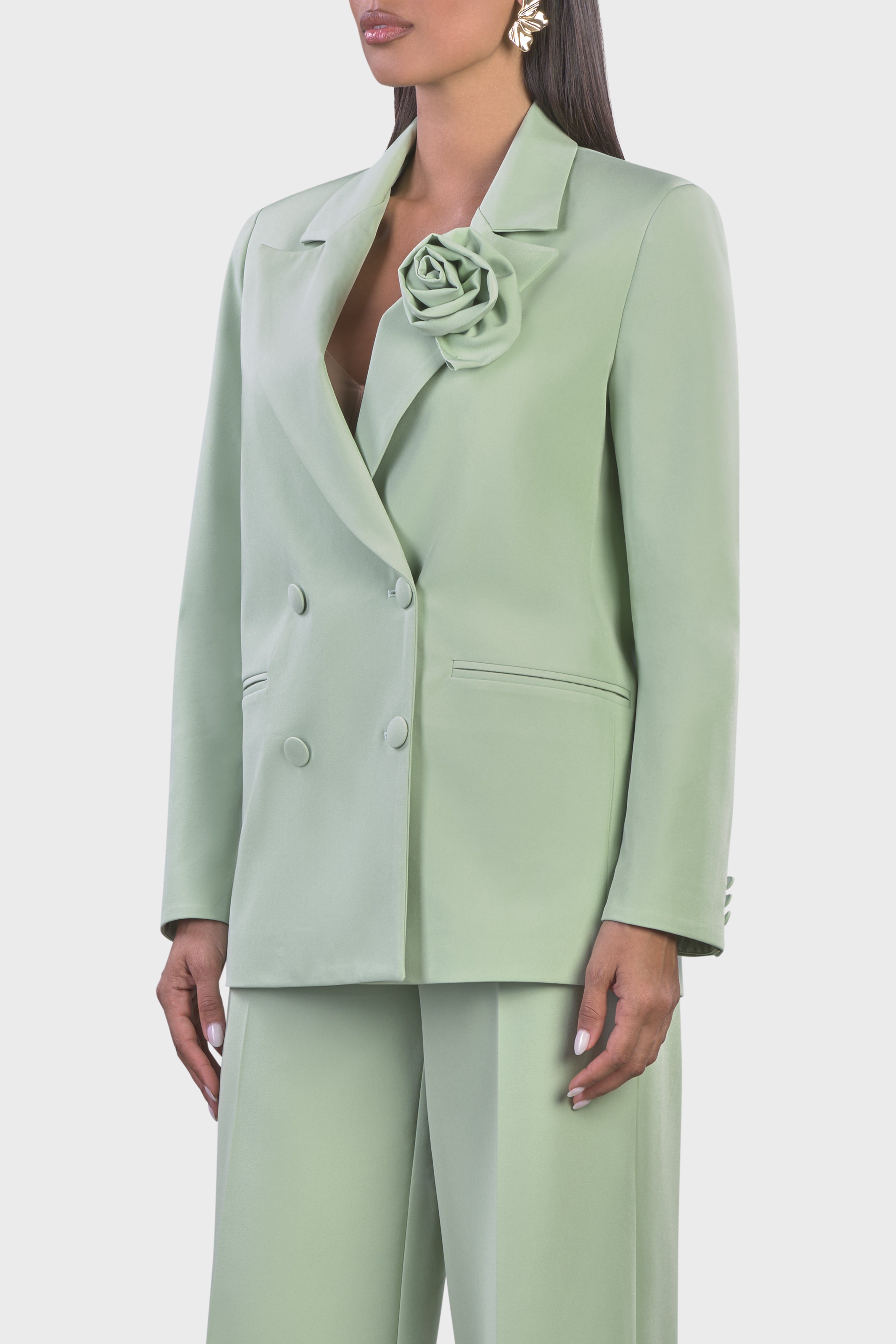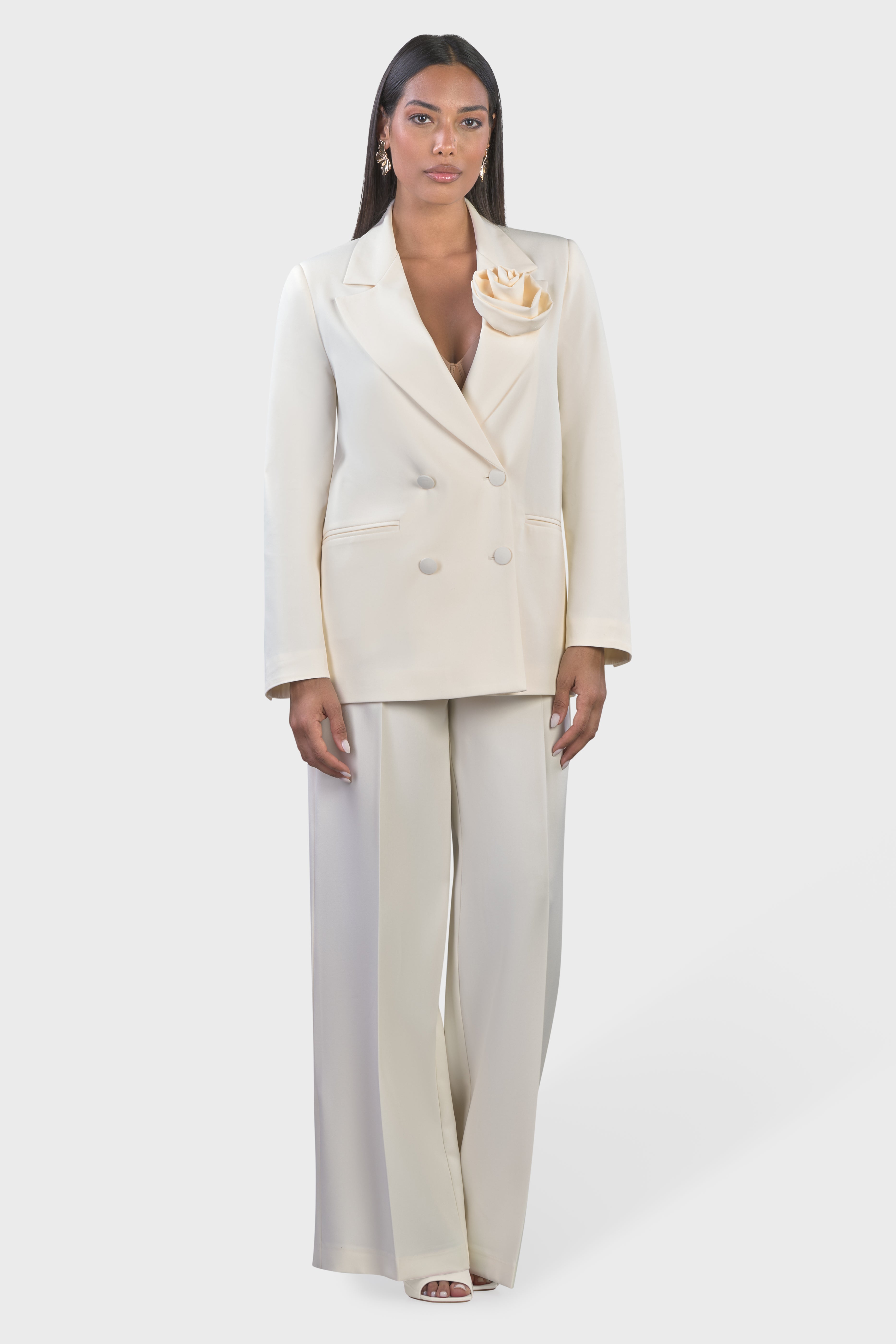 È impreziosita dal dettaglio della spilla a forma di rosa, emblema della collezione, realizzata nello stesso tessuto.