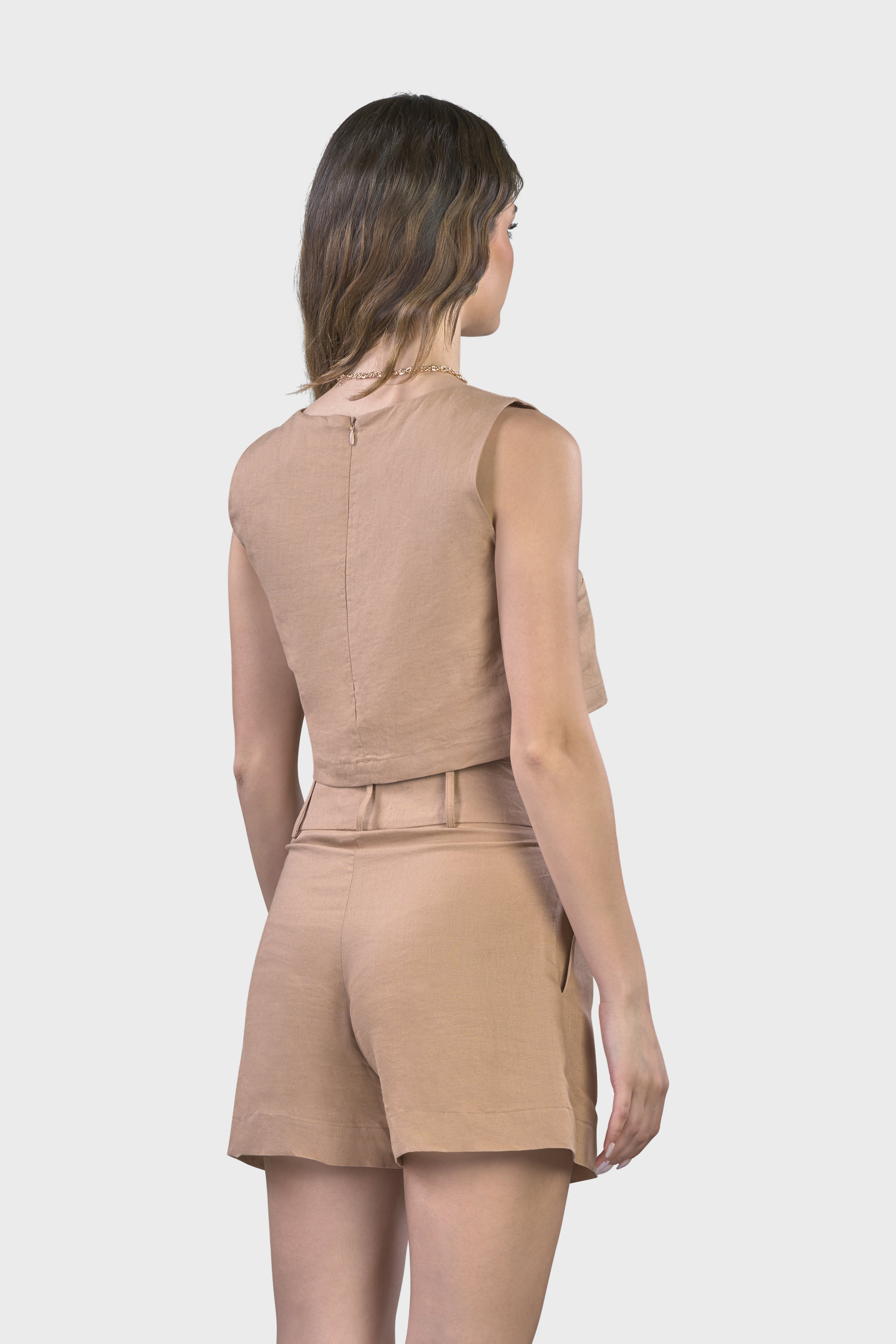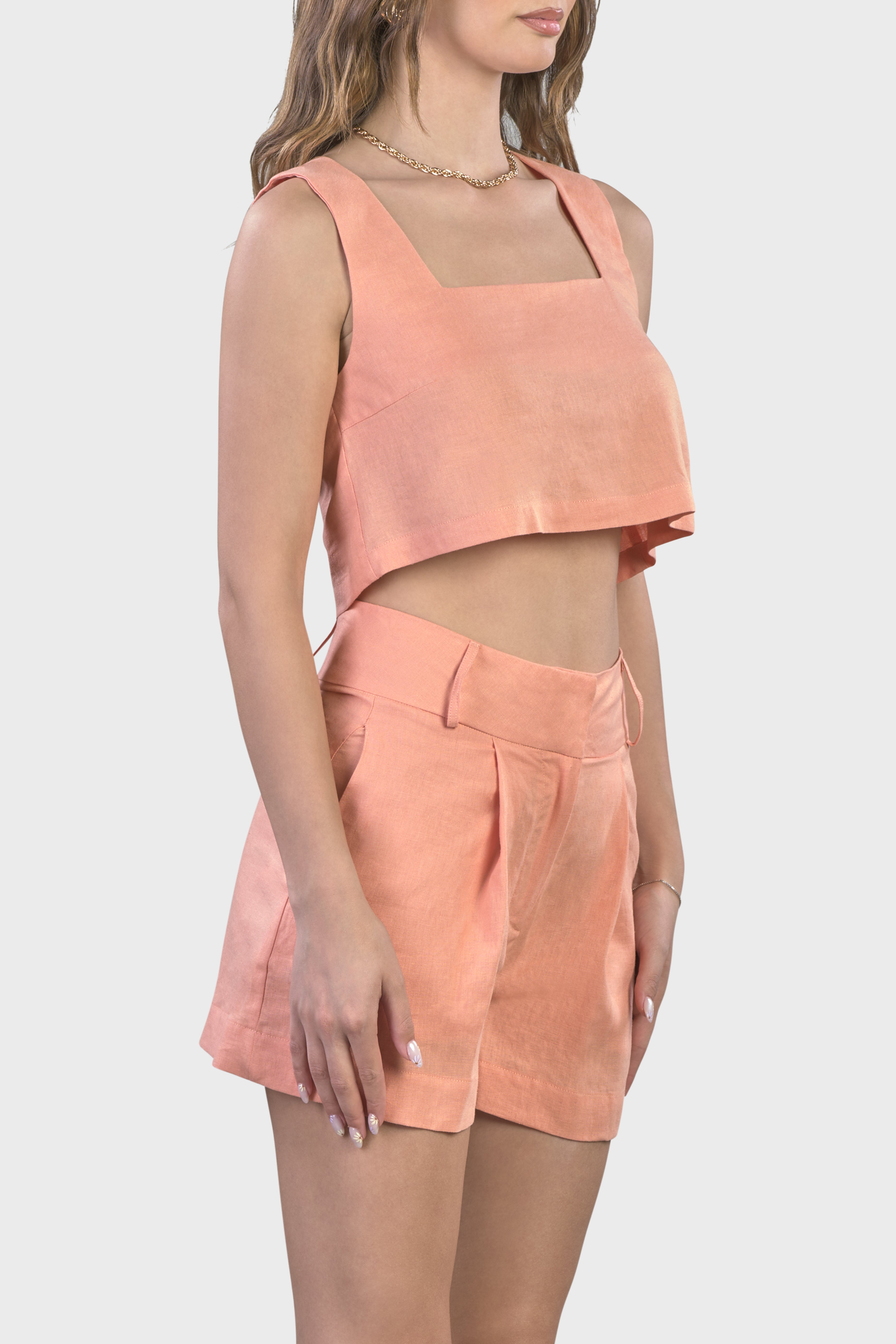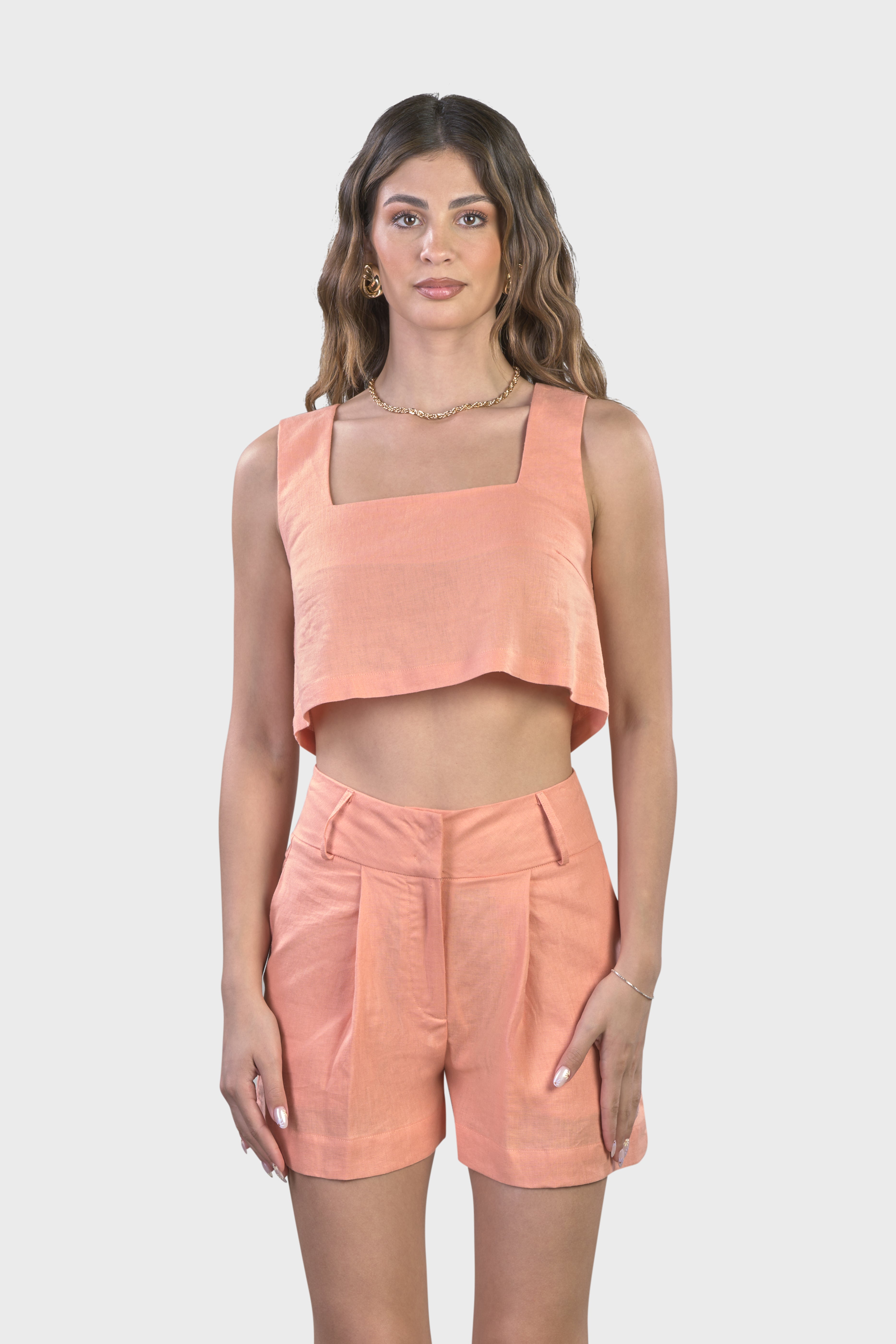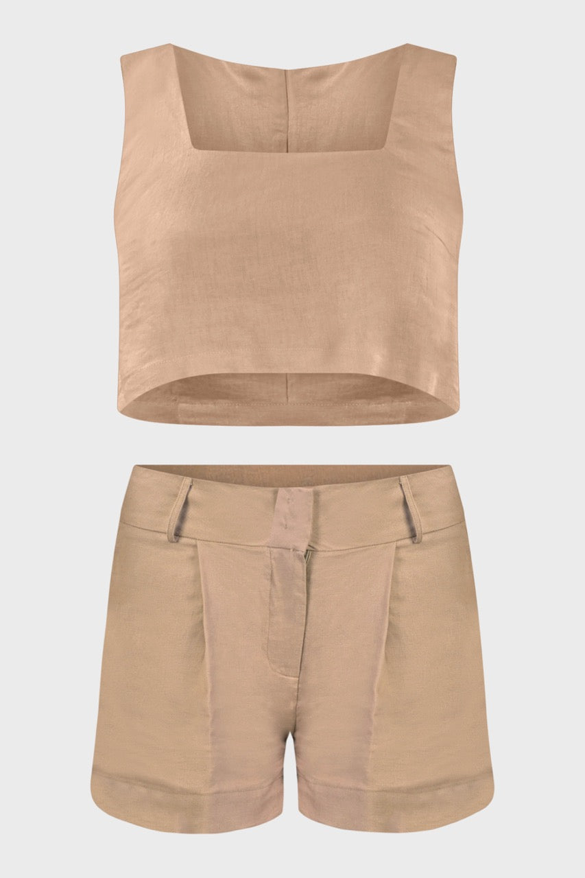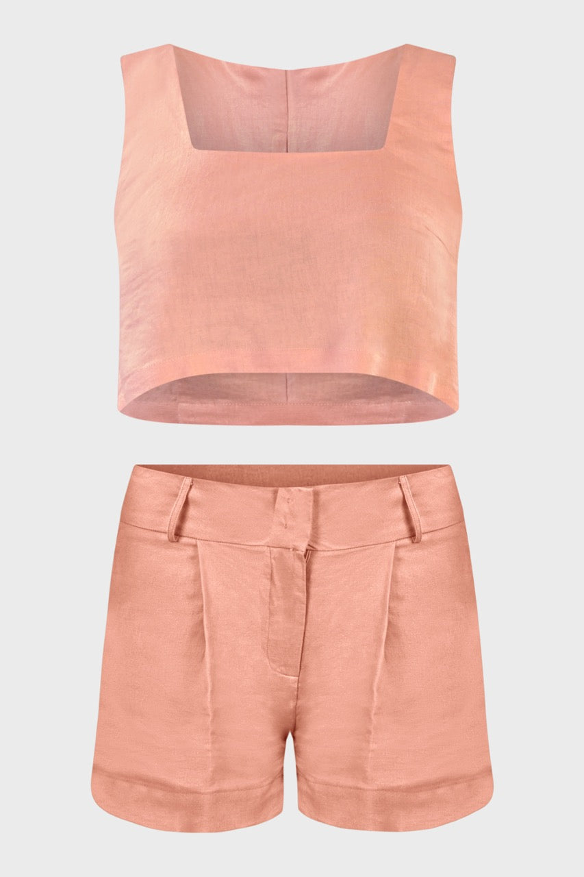 Le linee raffinate di questo coordinato ci rimandano ad uno stile sartoriale dovuto dal top senza maniche dal taglio svasato adatto a tutte le tipologie di corpo e dagli shorts vita alta,dalla vestibilità morbida e leggermente svasata.